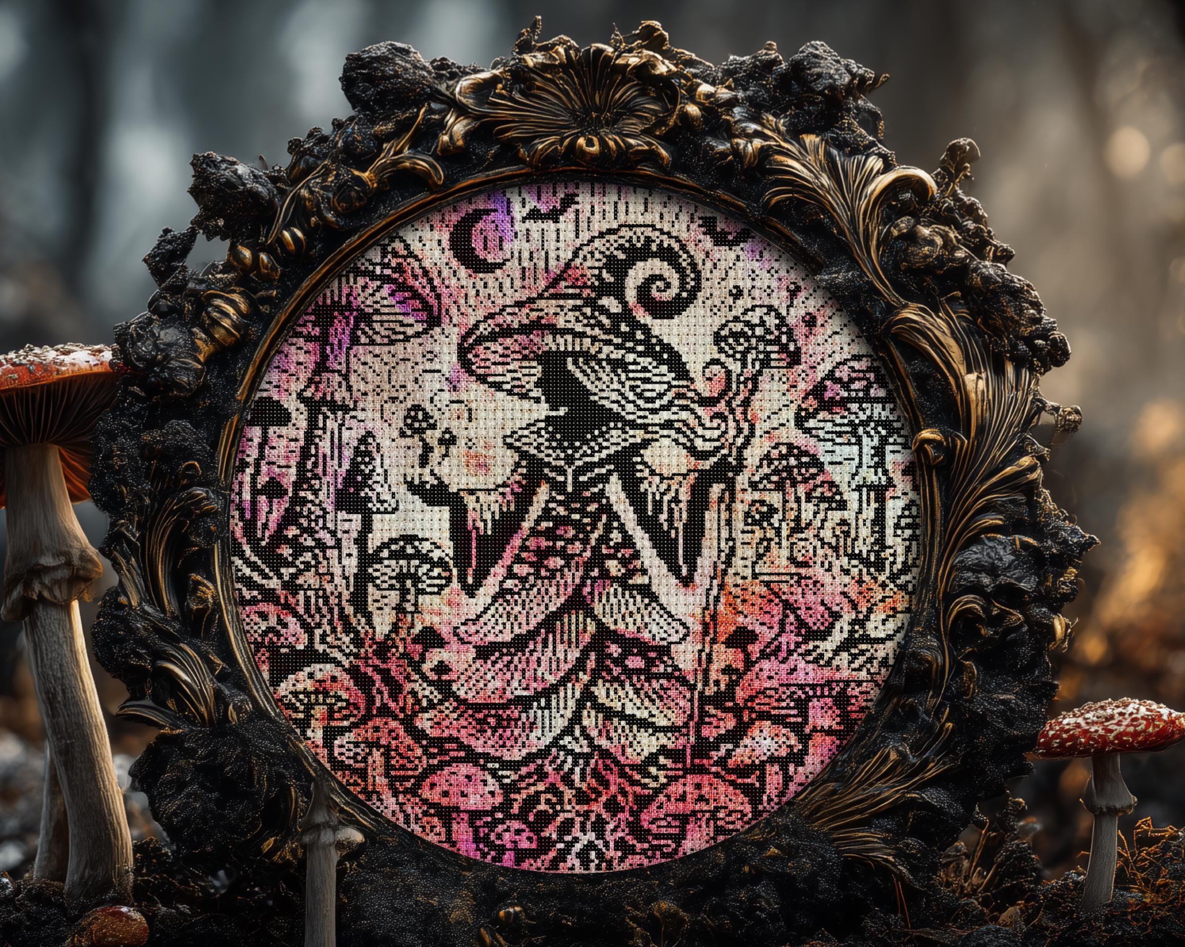 Woodcut Mycelium Witch Cross Stitch Pattern