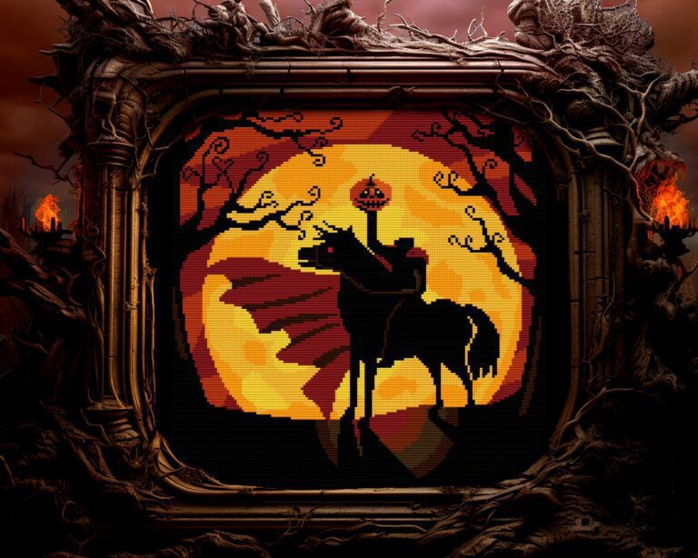 Oh, intrepid seeker of the arcane, you have delved into the abyss and unearthed the malevolent Ichabod Infernogourd. This vile entity harbors dark and ancient secrets, and you have earned the privilege of unraveling its mysteries.As a token of our gratitude for your courage, we bestow upon you the Sleepy Hollow Cross Stitch Pattern, a sinister reminder of the horrors that lurk beneath the surface of the world.