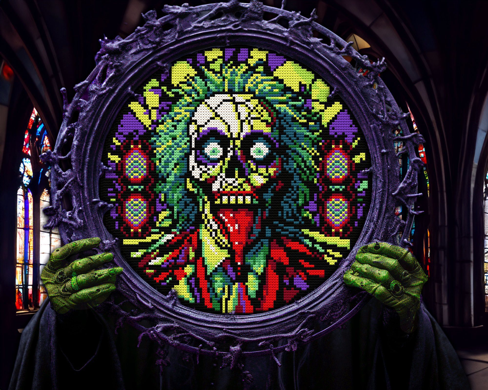 Dive into the vivid realm of gothic cross stitch with our Acidic Juicy Beetle Cross Stitch Pattern, a hypnotic ode to the iconic beetlejuice cross stitch legend. Capturing Betelgeuse in all his chaotic allure, this halloween cross stitch design offers a psychedelic twist, reminiscent of a trippy joker cross stitch experience. With his tongue audaciously out and dripping in salvia, set against a vibrant backdrop of toxic greens, fiery reds, and sun-kissed yellows, the piece screams psychedelic cross stitch fervor.