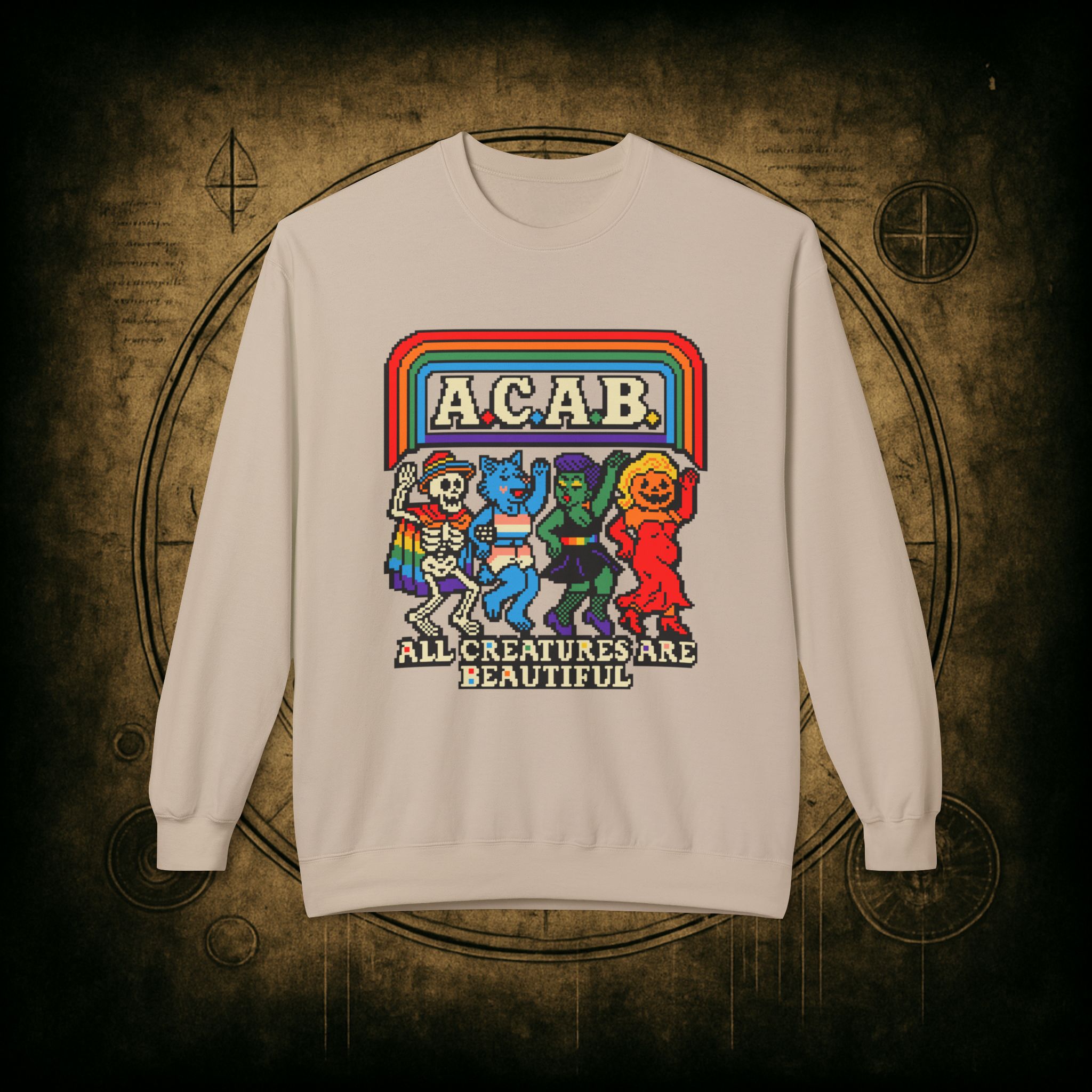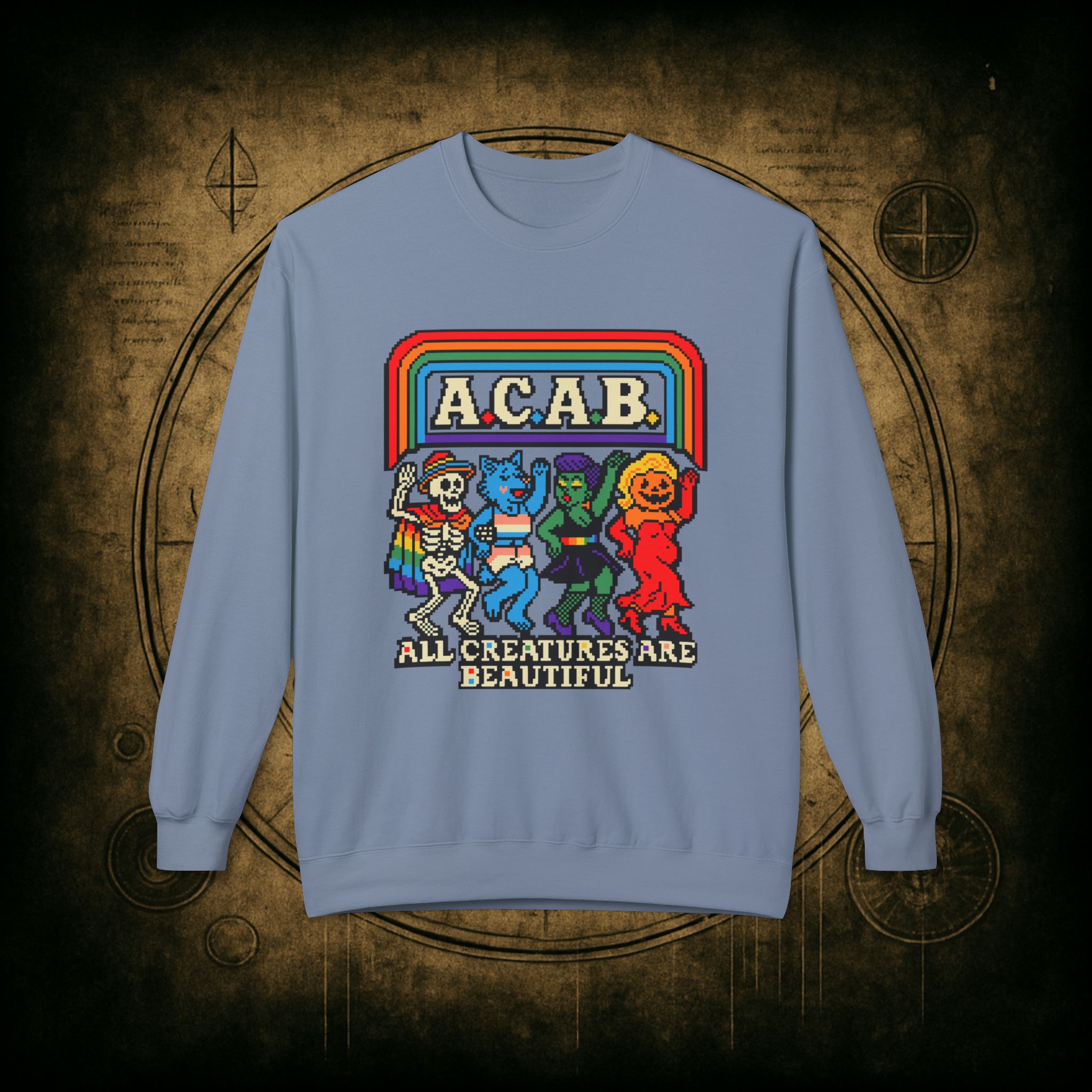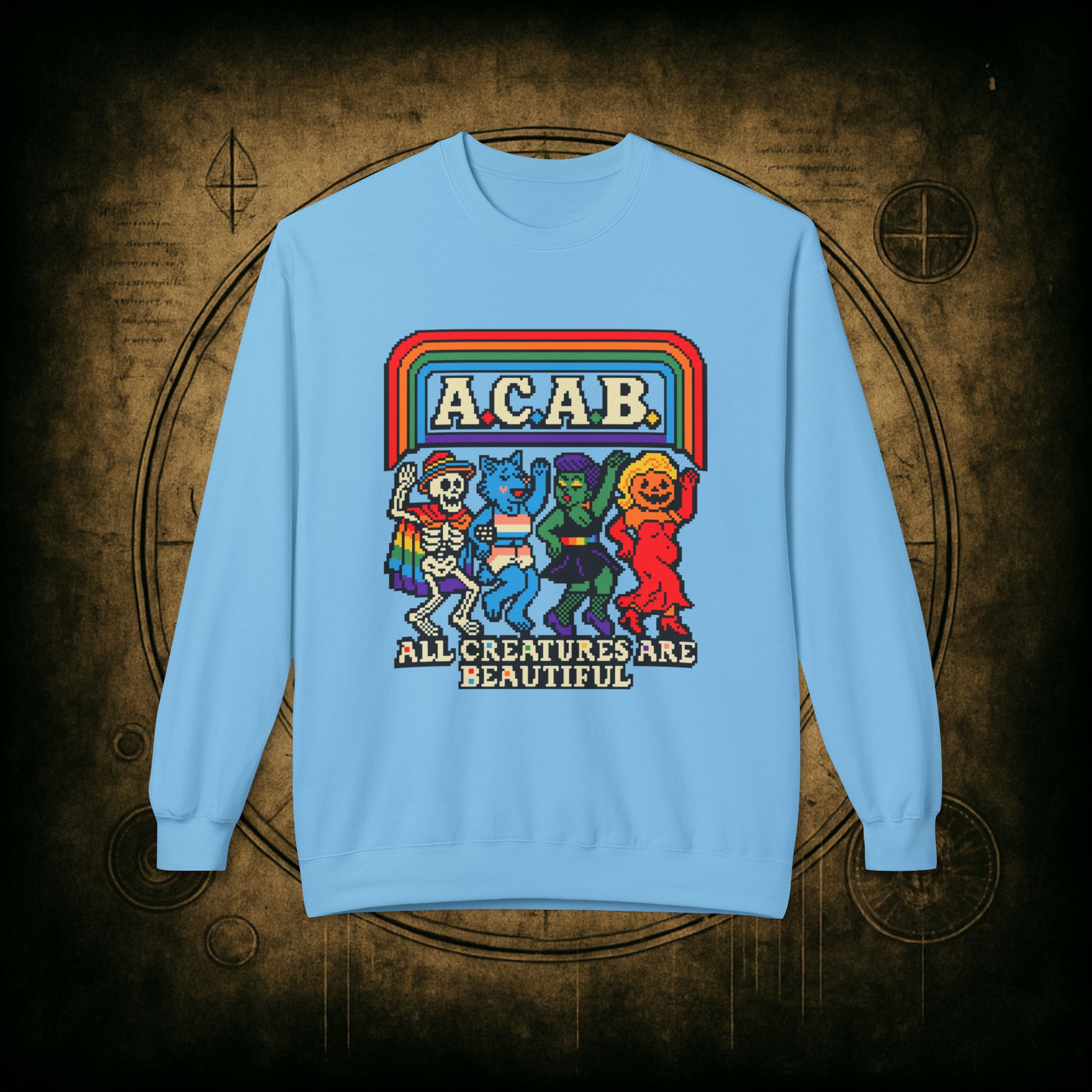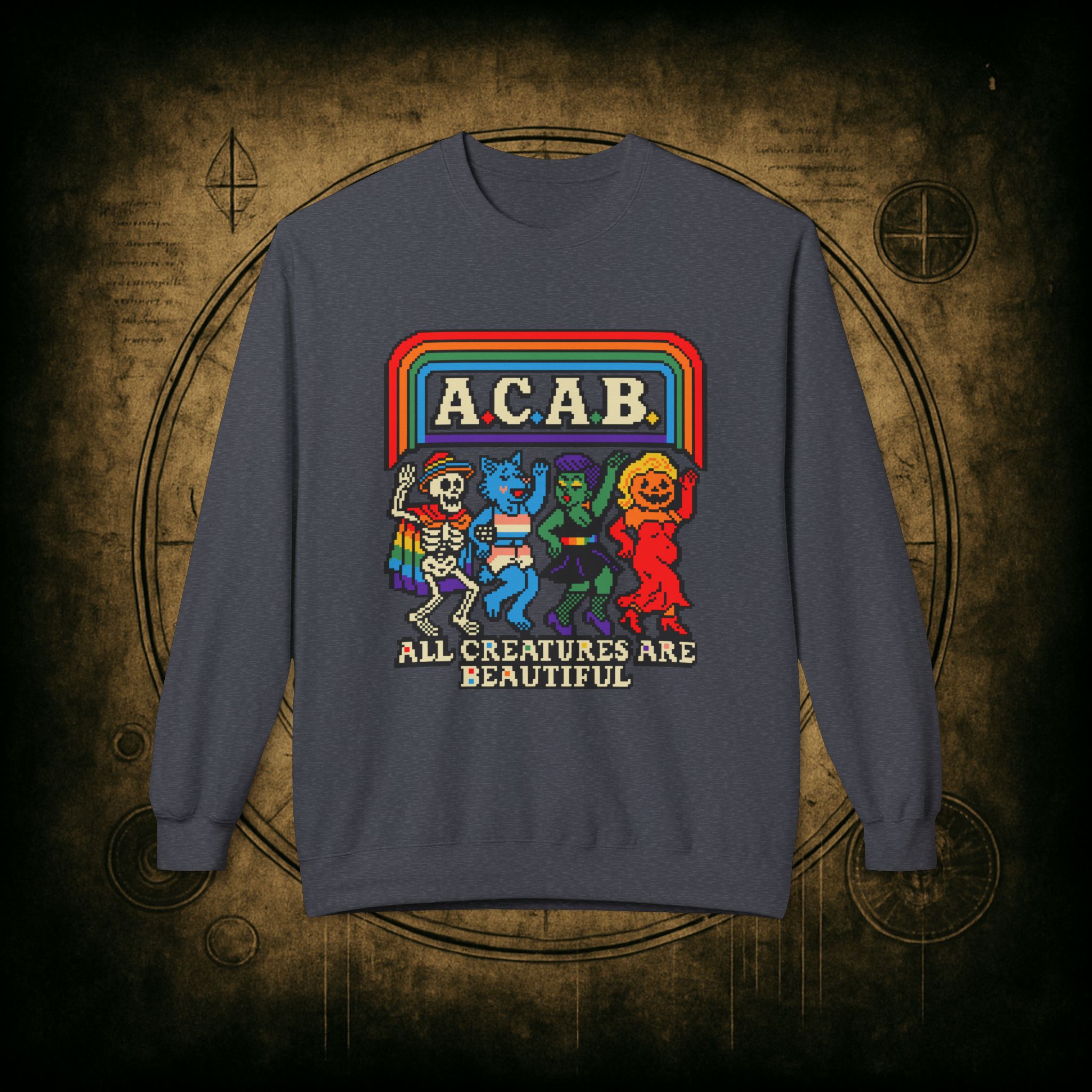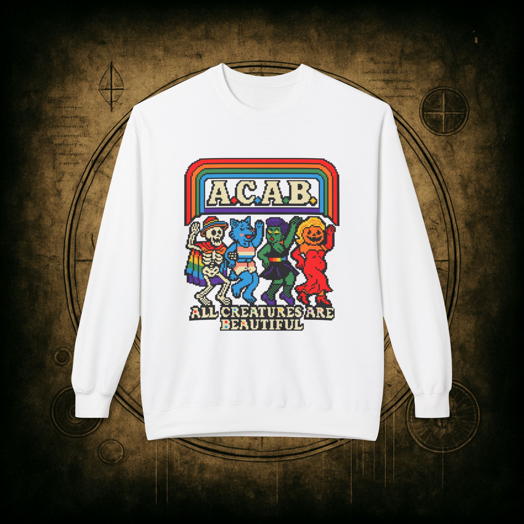 Skeletons, werewolves, goblins, and pumpkin babes, get in, we’re smashing norms and starting a dance party in the underworld. This unisex softstyle sweatshirt proudly screams A.C.A.B.: All Creatures Are Beautiful, obviously.