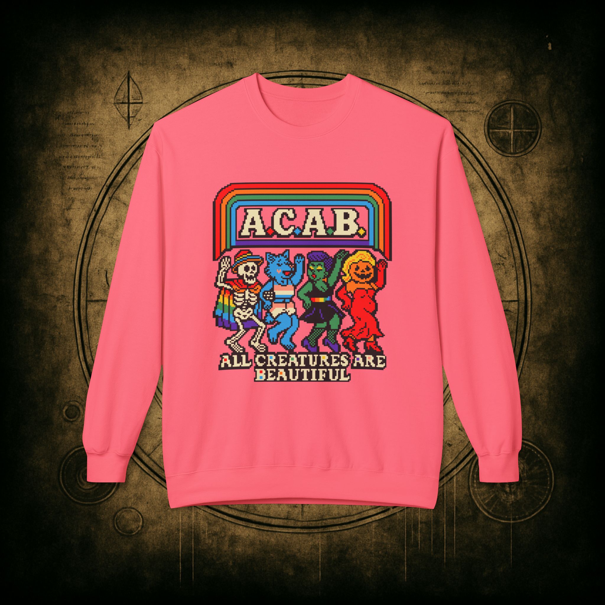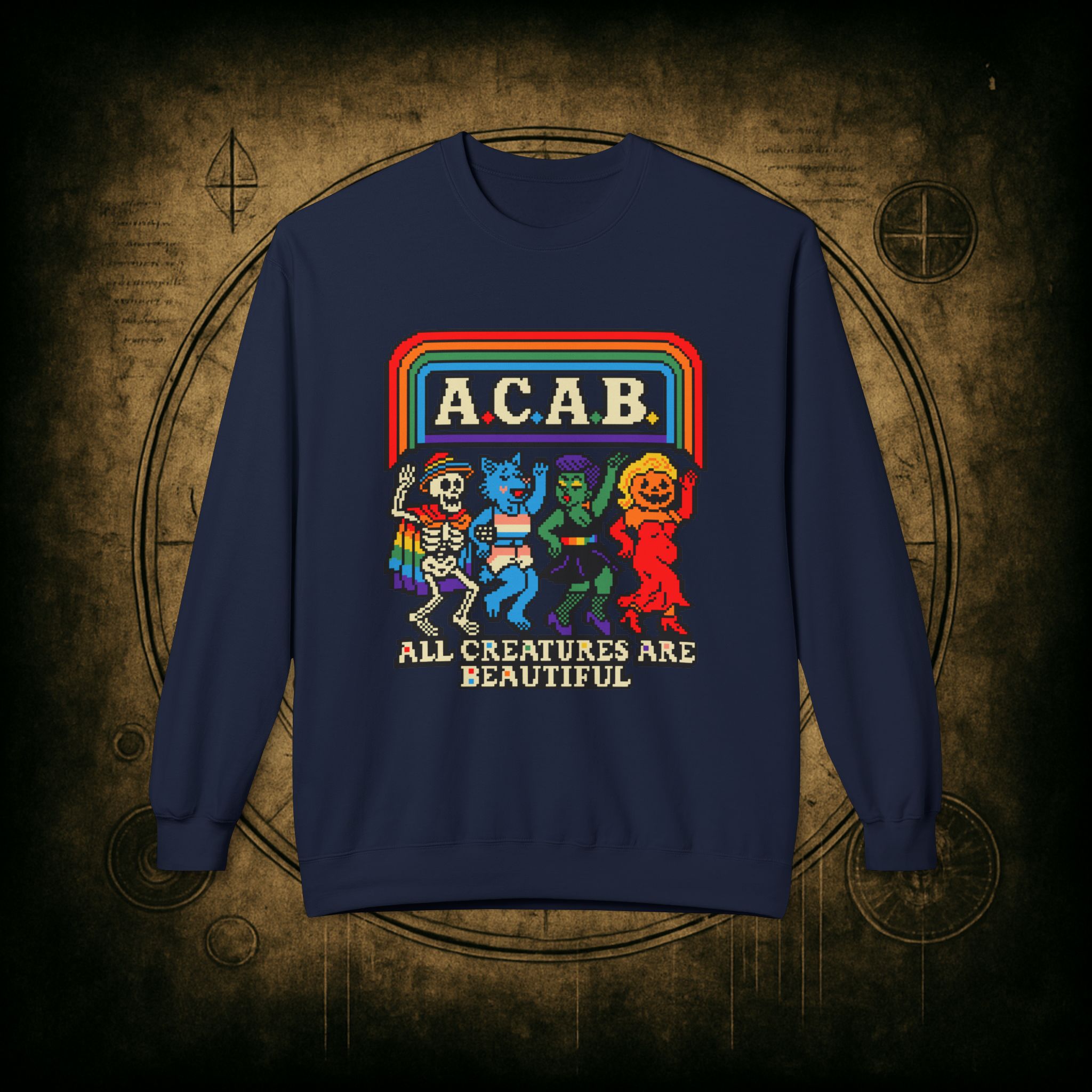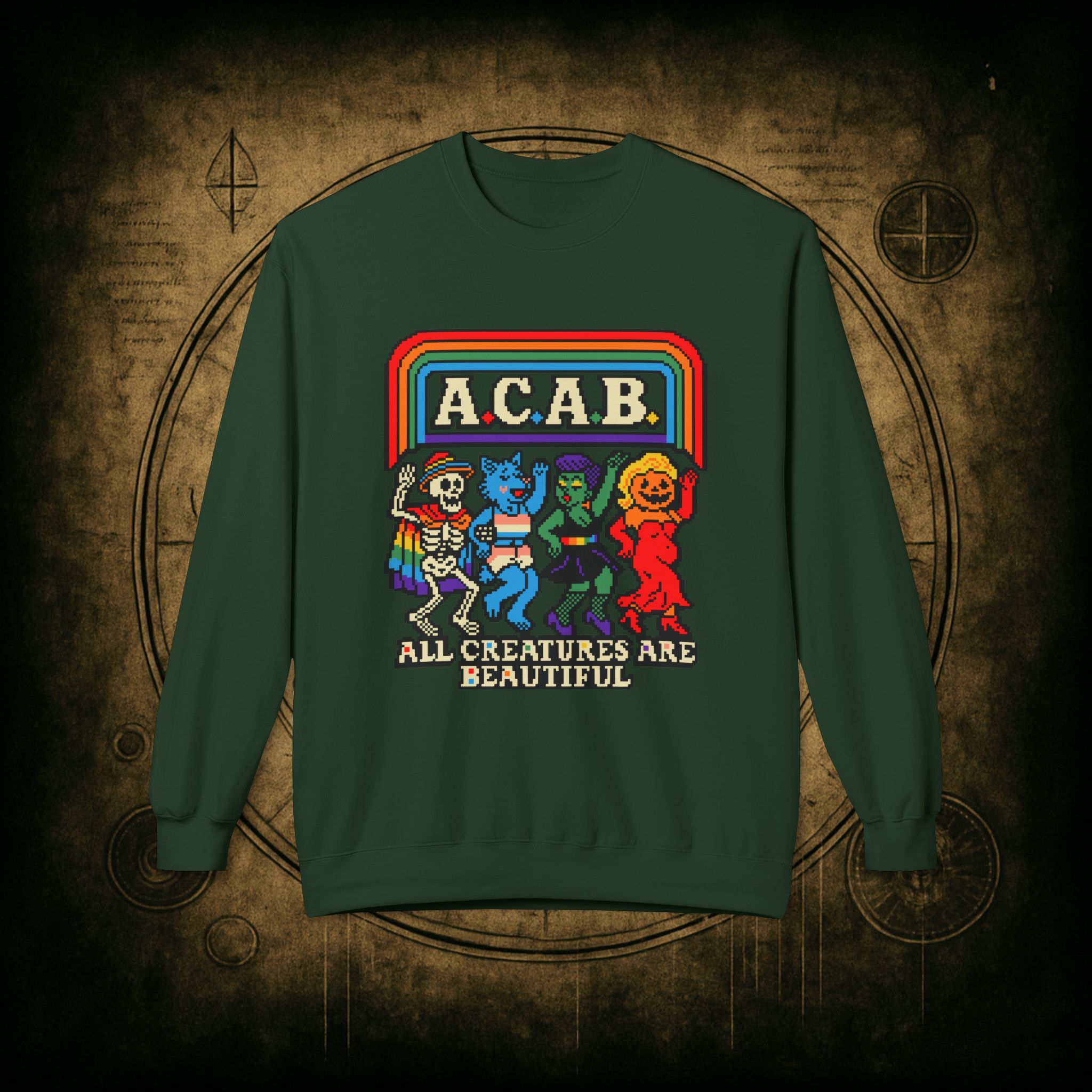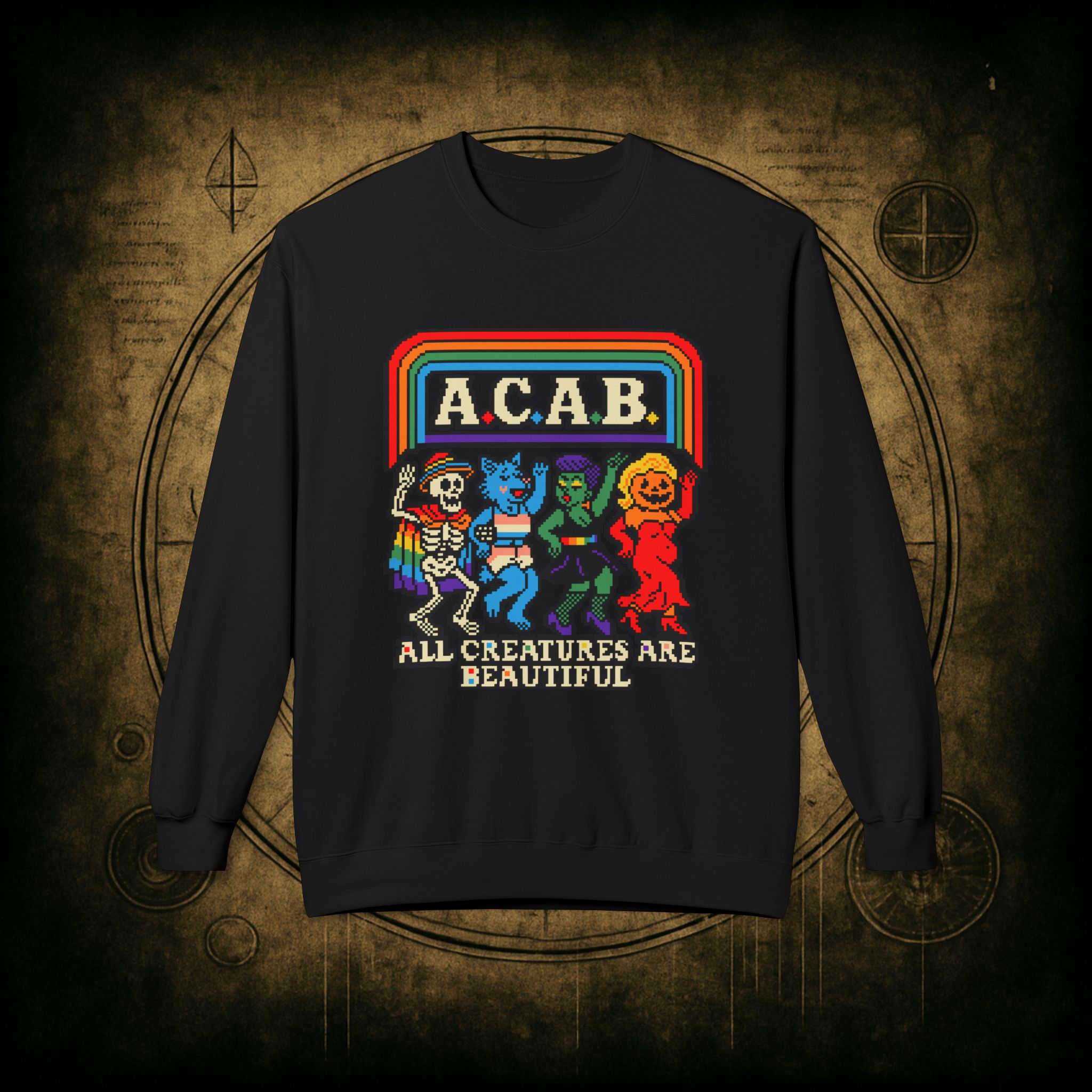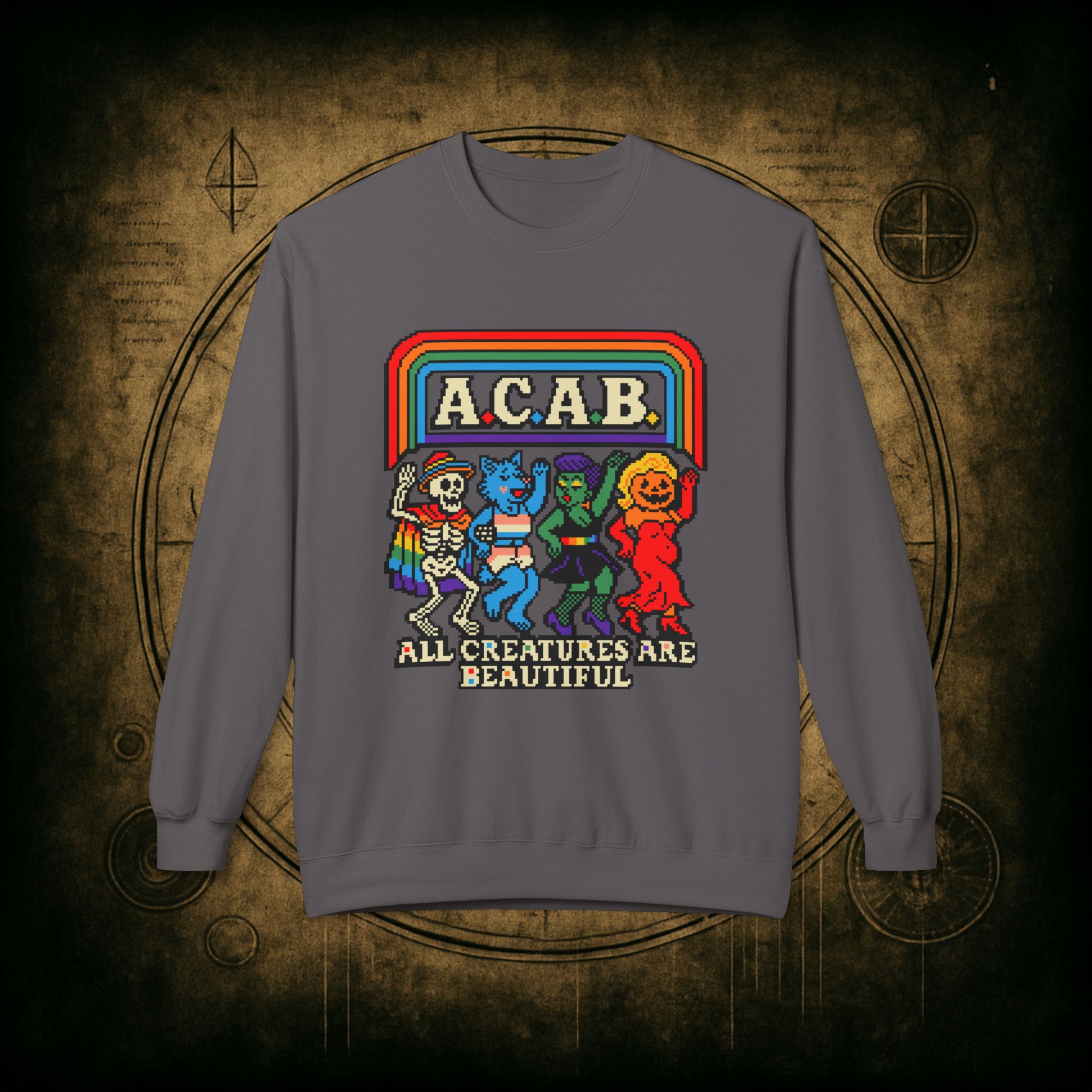 Skeletons, werewolves, goblins, and pumpkin babes, get in, we’re smashing norms and starting a dance party in the underworld. This unisex softstyle sweatshirt proudly screams A.C.A.B.: All Creatures Are Beautiful, obviously.