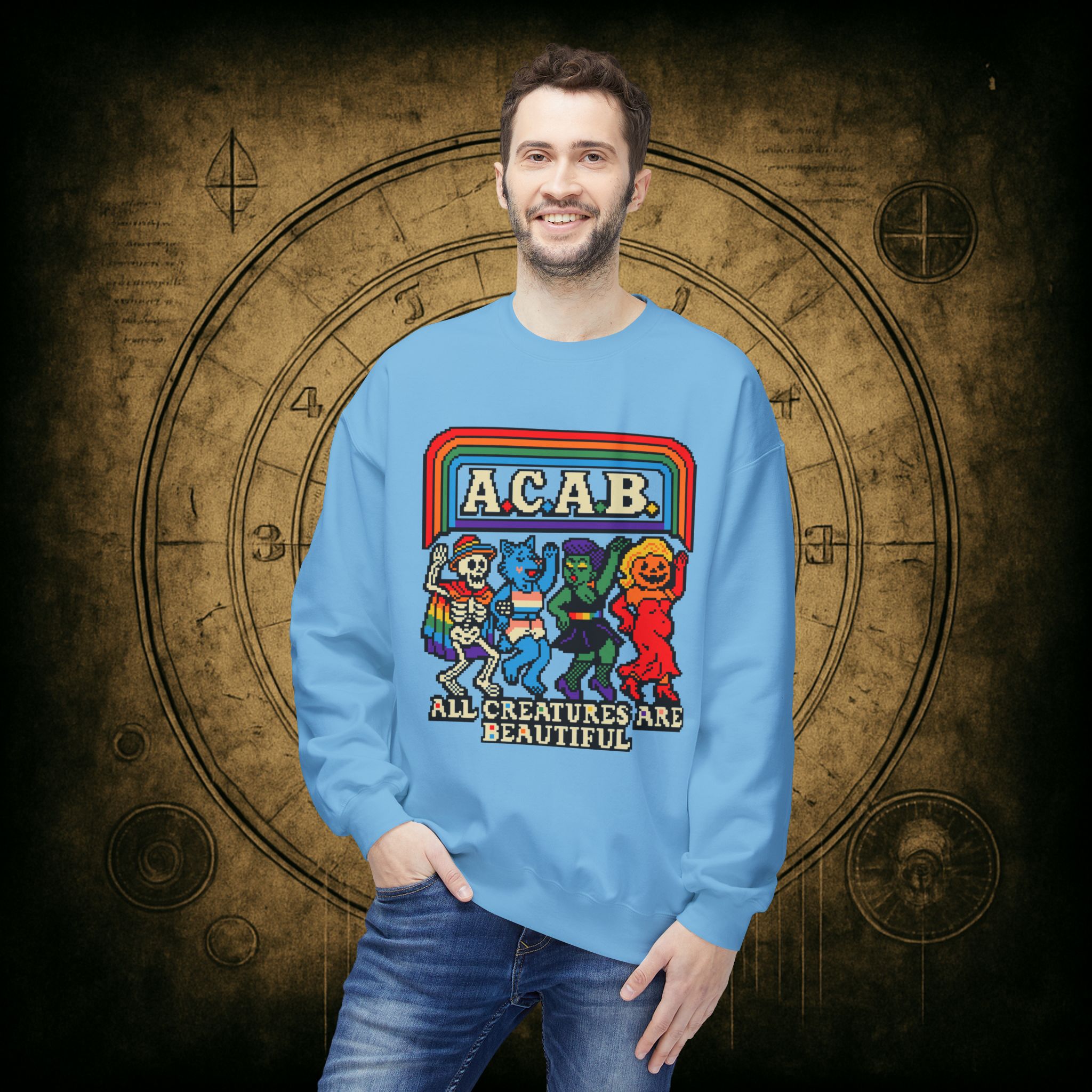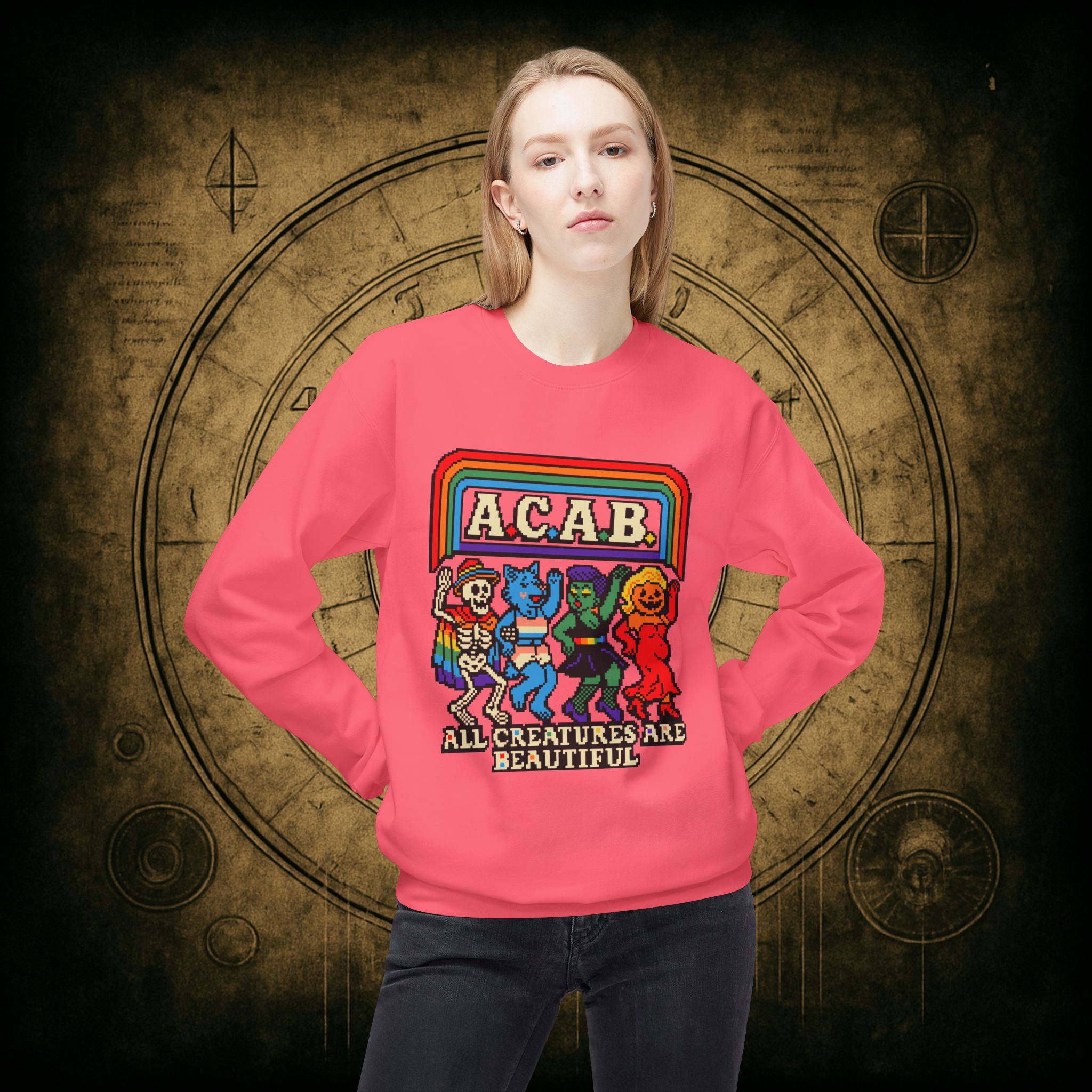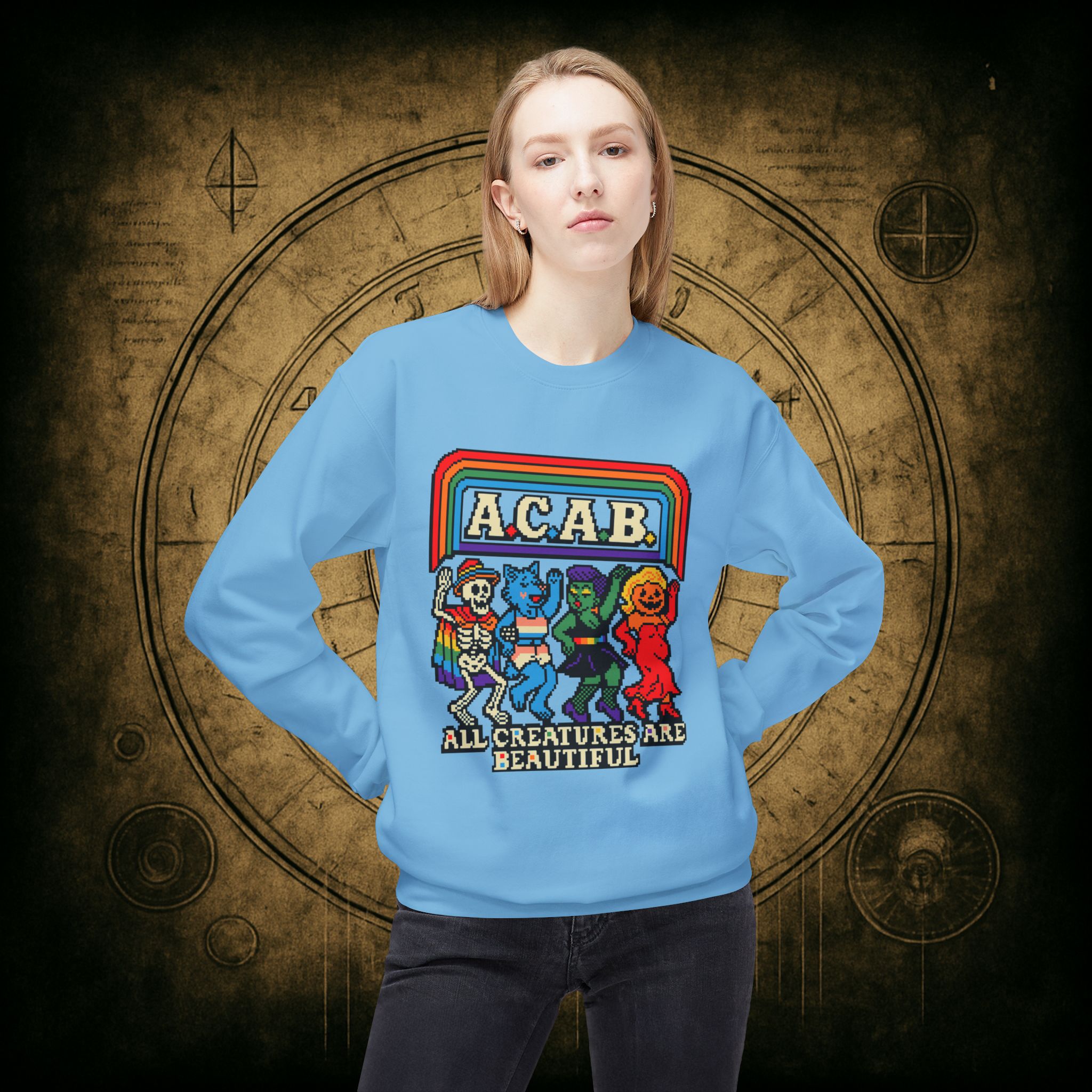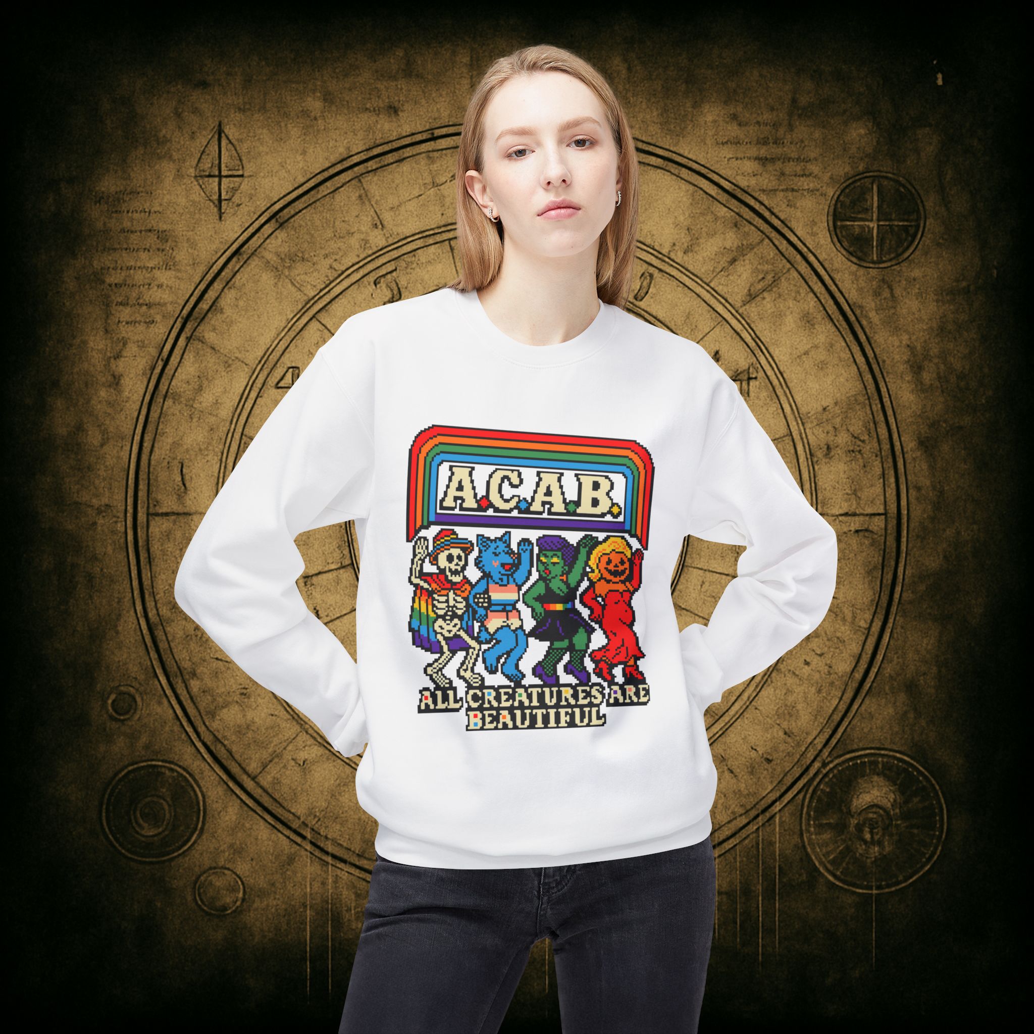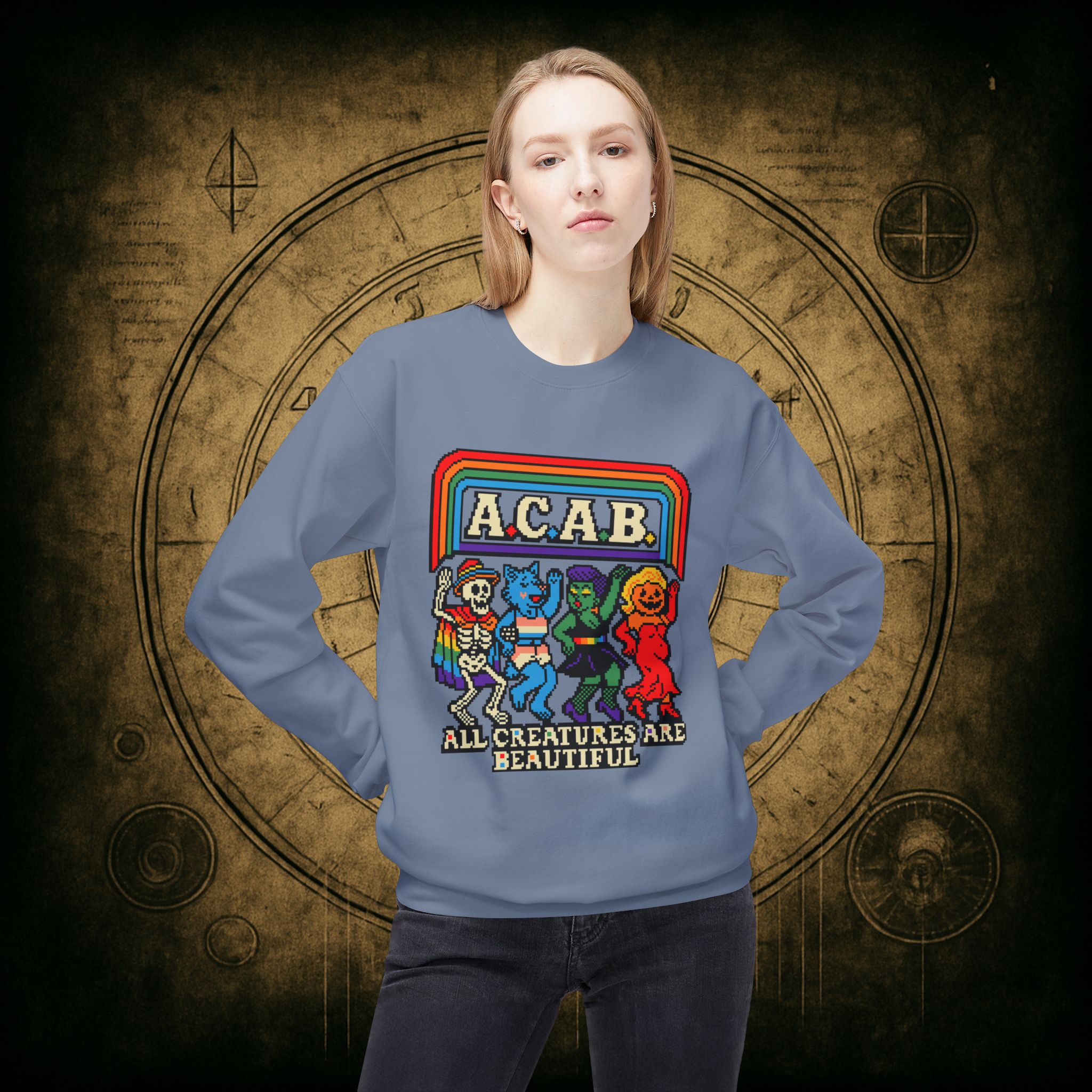 Skeletons, werewolves, goblins, and pumpkin babes, get in, we’re smashing norms and starting a dance party in the underworld. This unisex softstyle sweatshirt proudly screams A.C.A.B.: All Creatures Are Beautiful, obviously.
