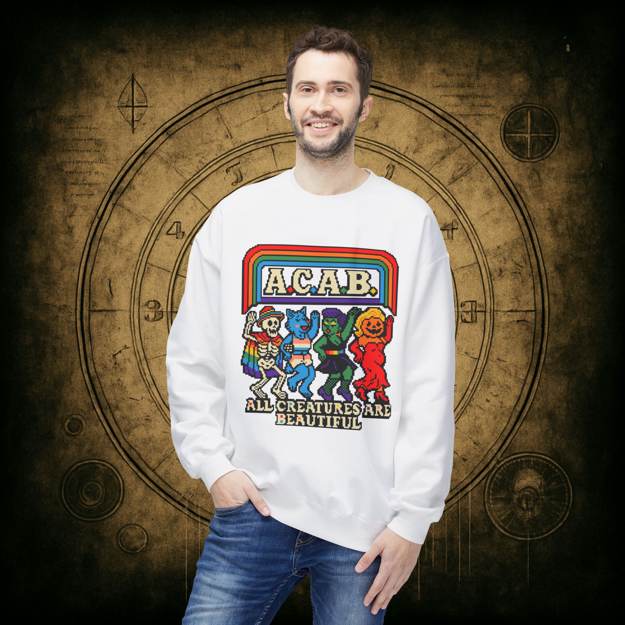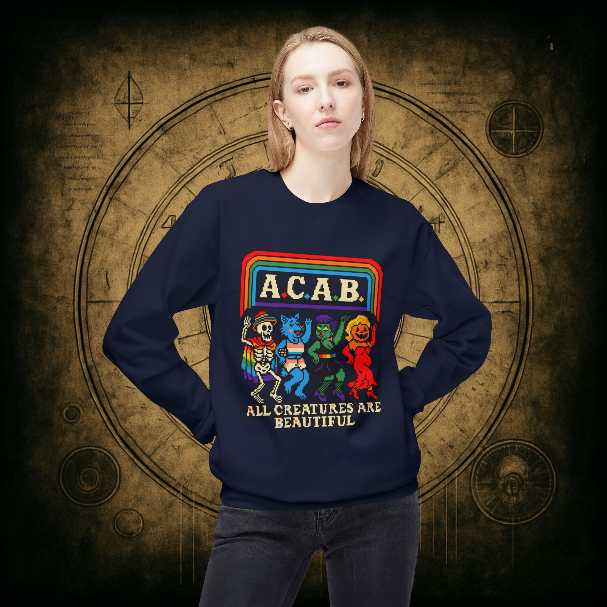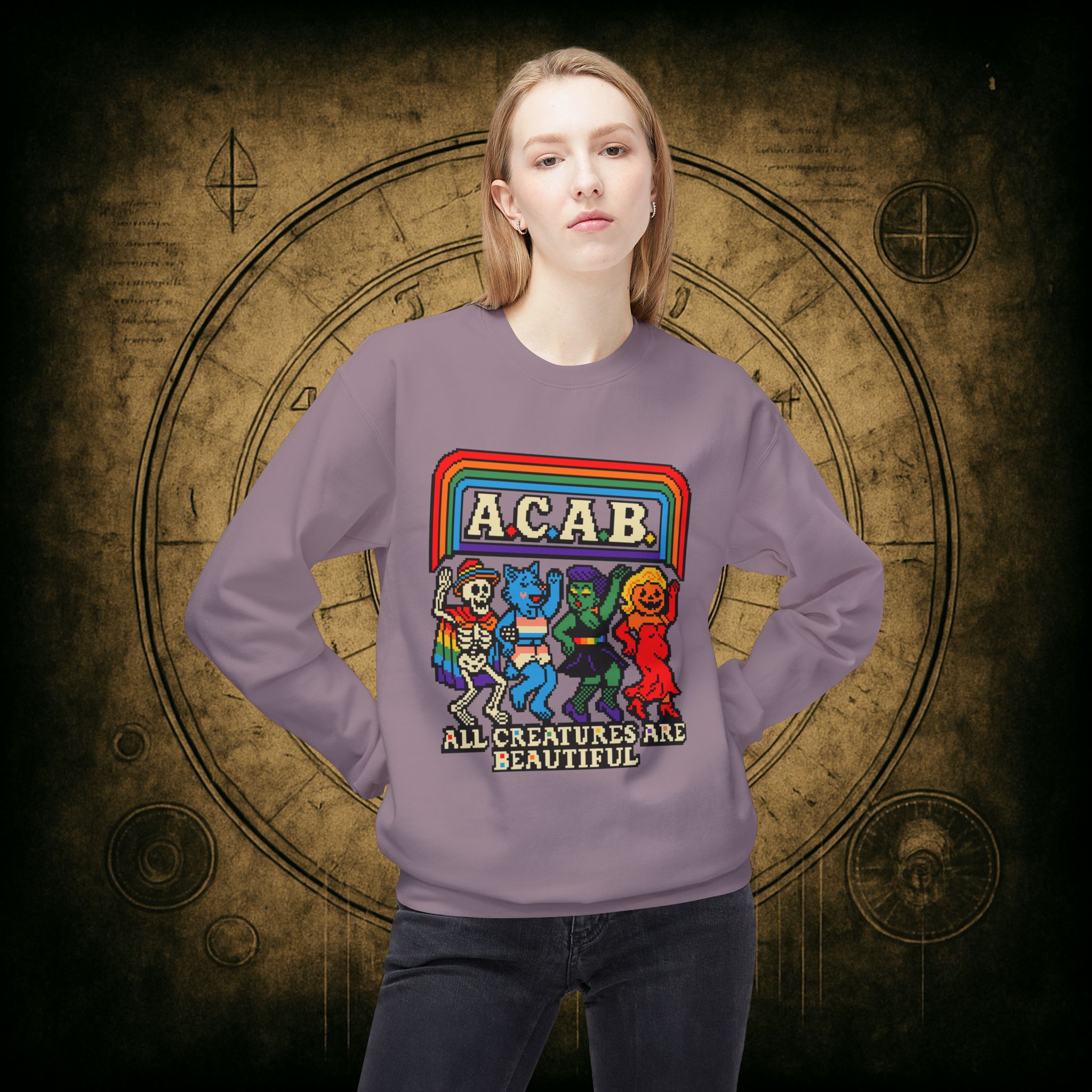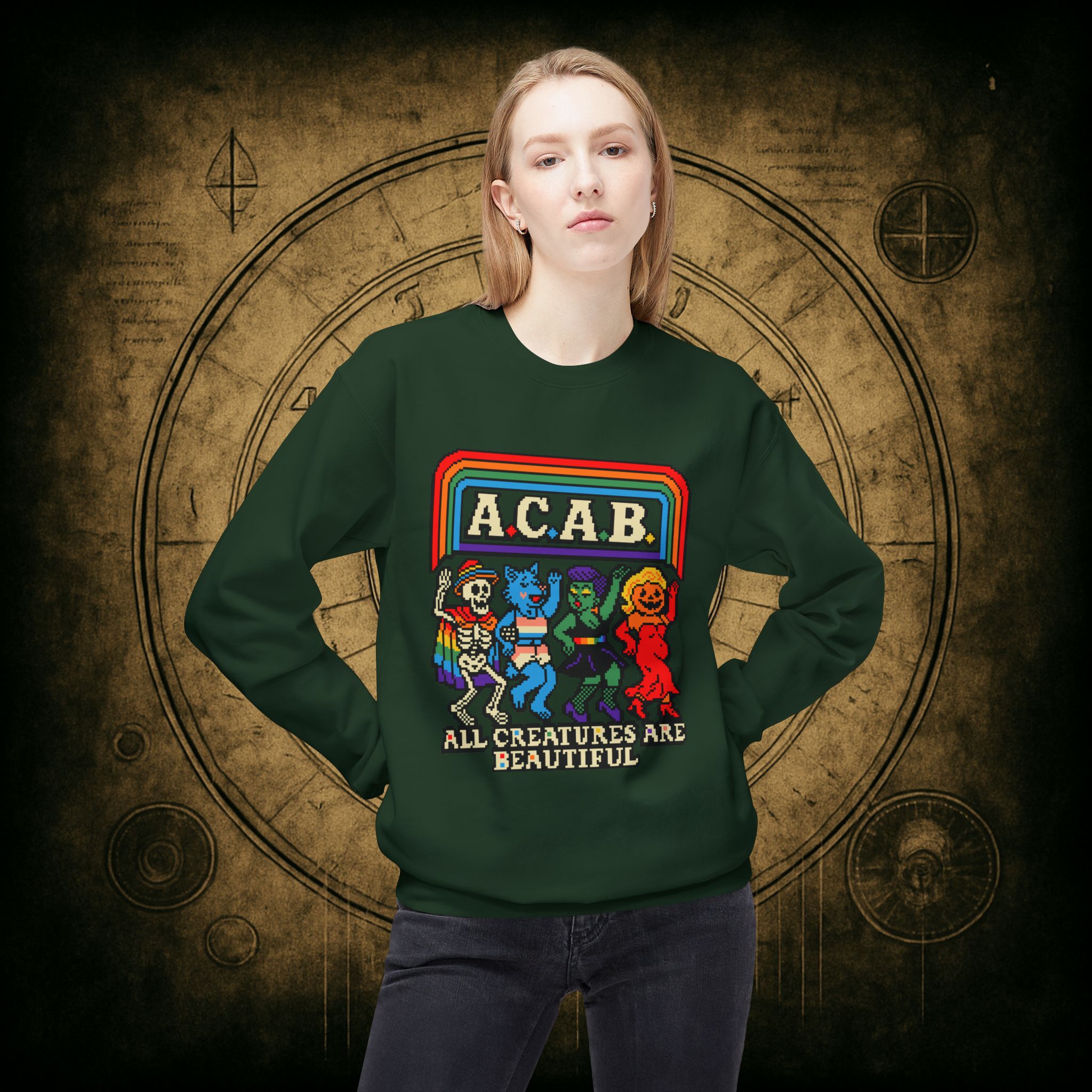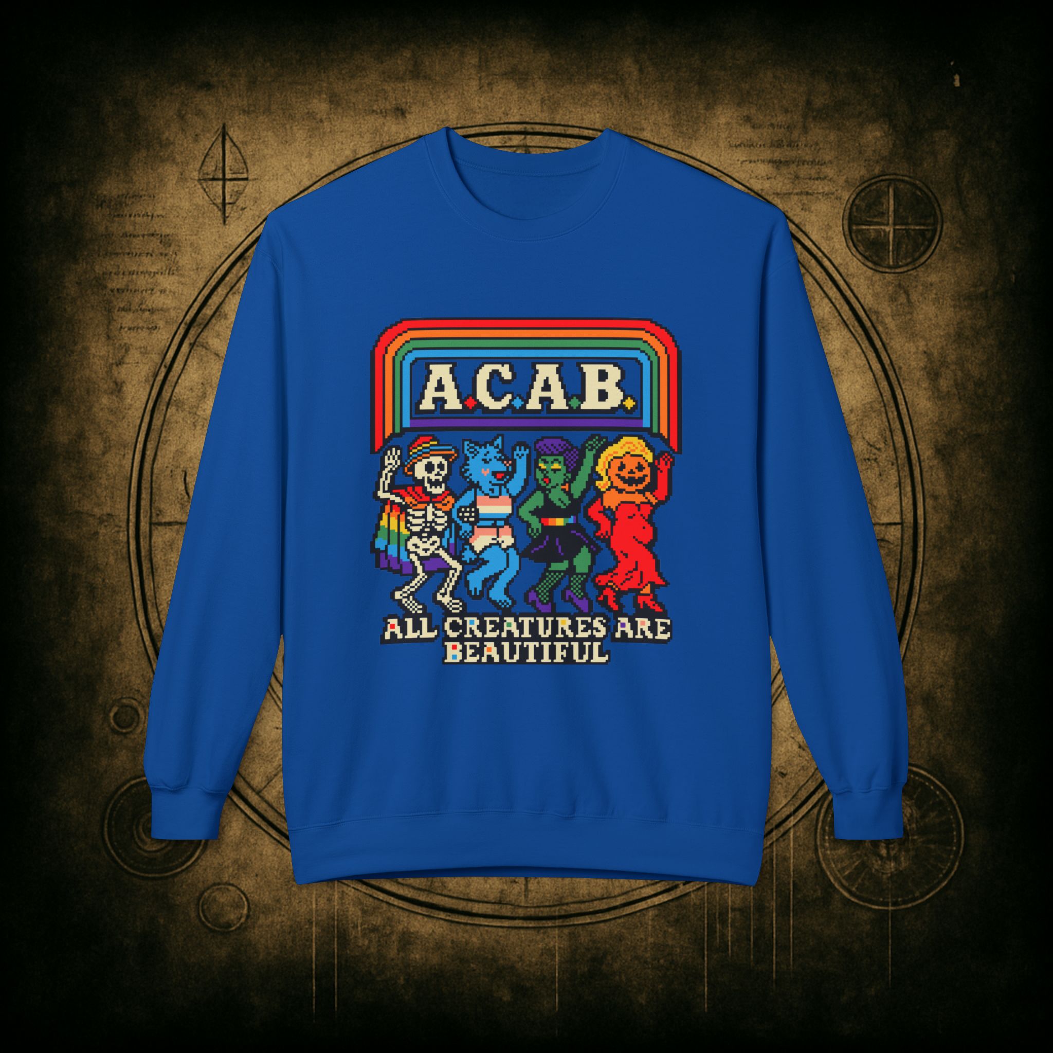Skeletons, werewolves, goblins, and pumpkin babes, get in, we’re smashing norms and starting a dance party in the underworld. This unisex softstyle sweatshirt proudly screams A.C.A.B.: All Creatures Are Beautiful, obviously.