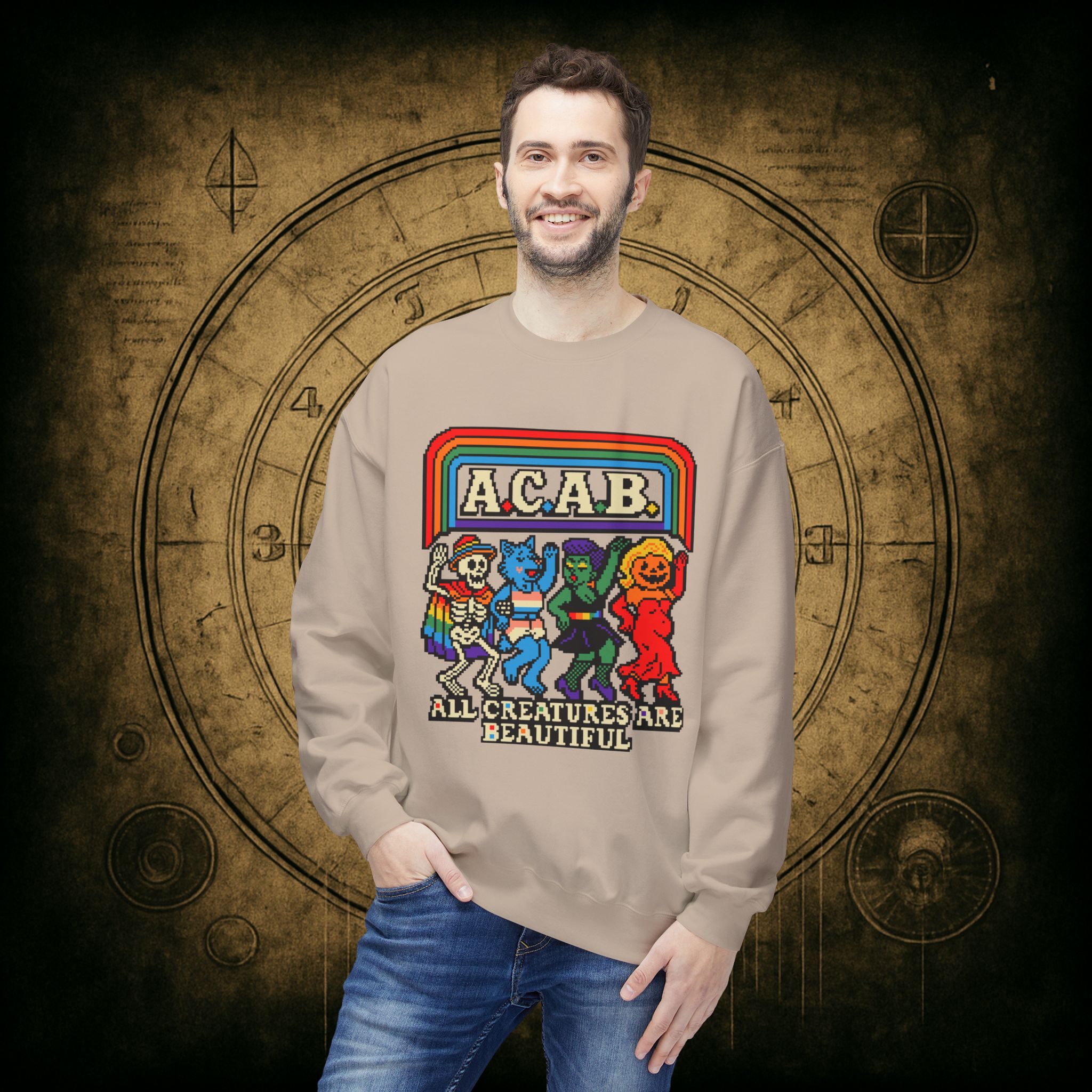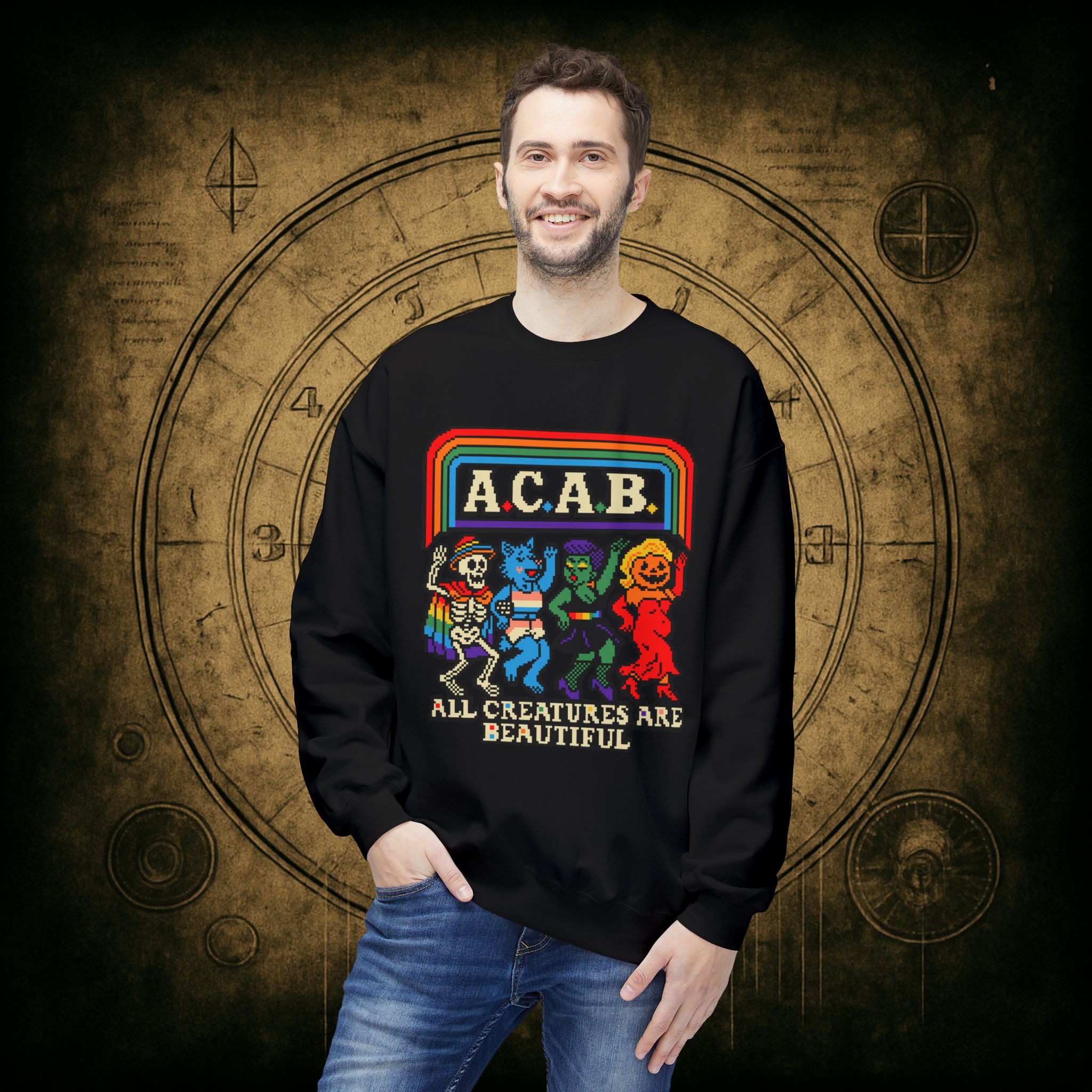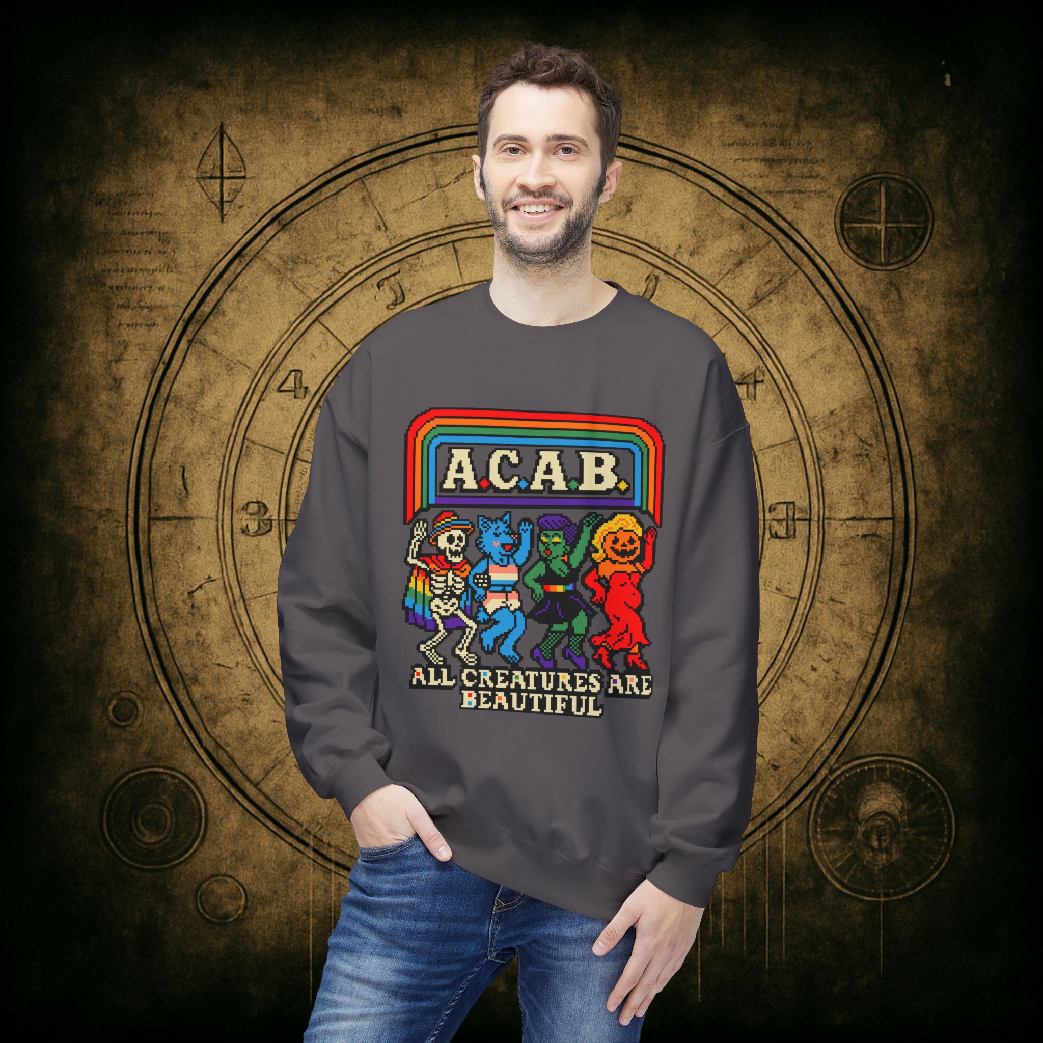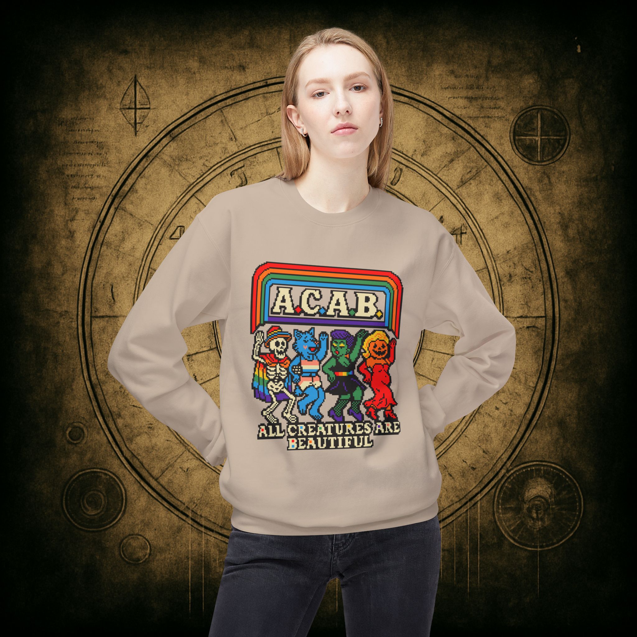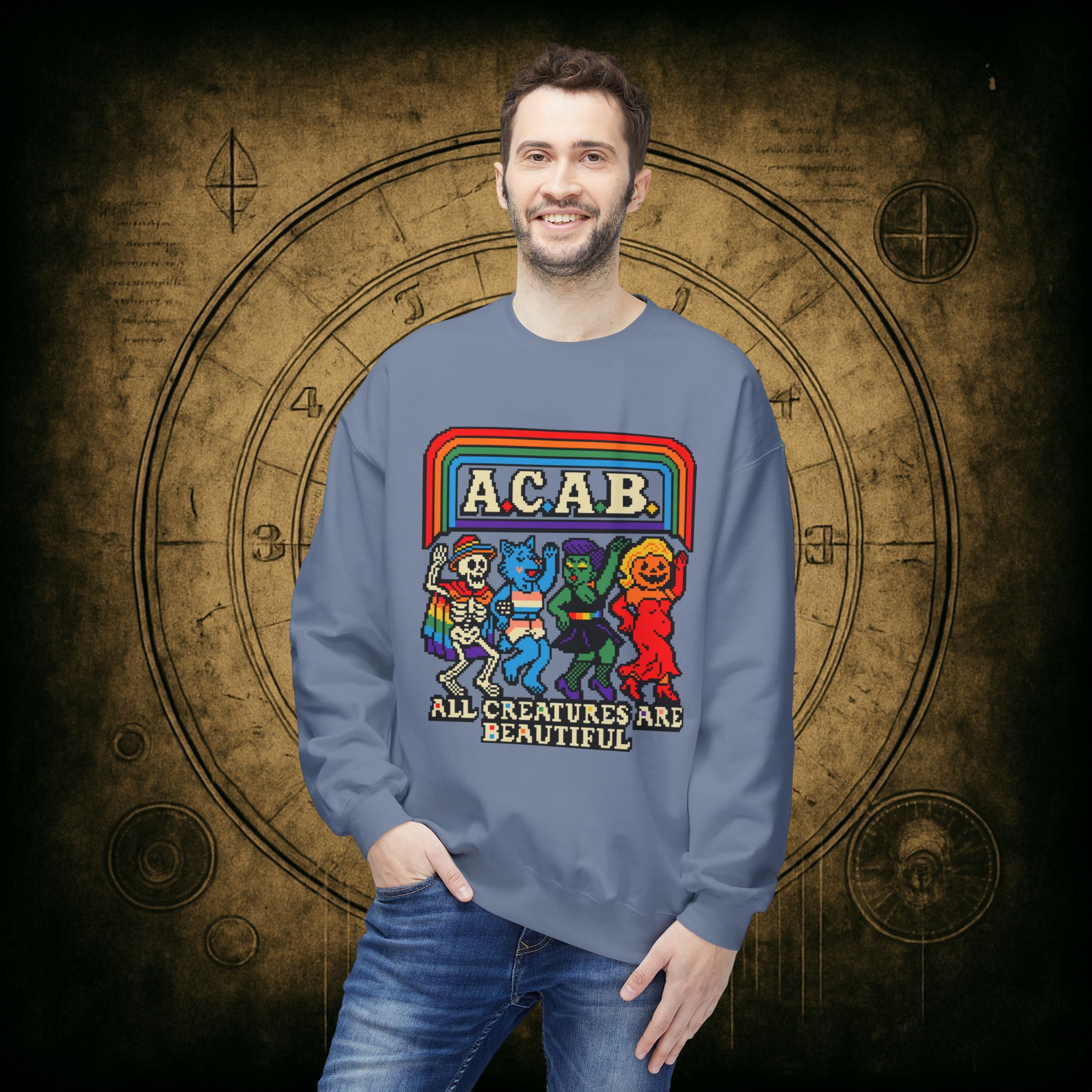 Skeletons, werewolves, goblins, and pumpkin babes, get in, we’re smashing norms and starting a dance party in the underworld. This unisex softstyle sweatshirt proudly screams A.C.A.B.: All Creatures Are Beautiful, obviously.