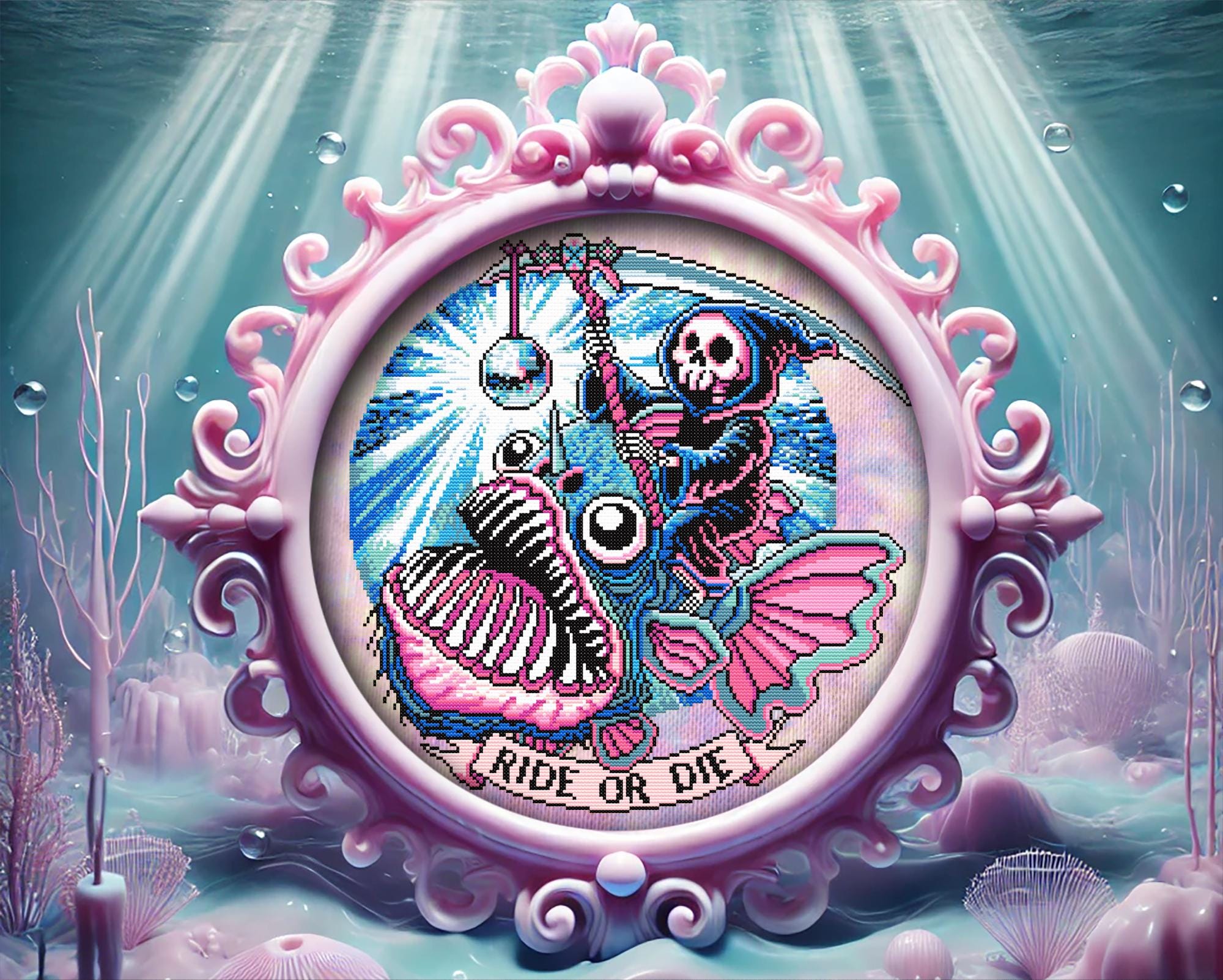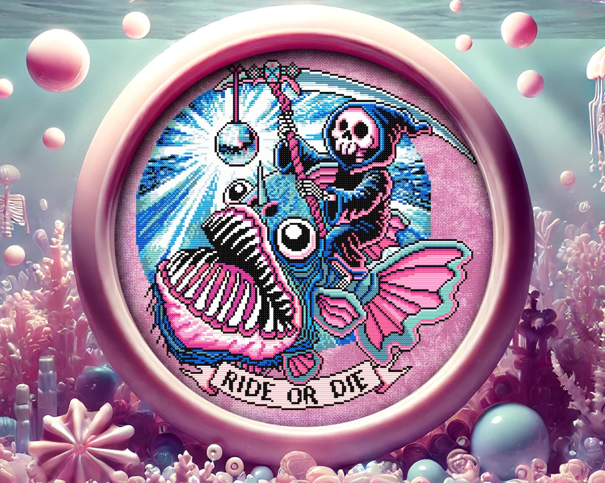 Morbid? Yes. Pastel goth cross stitch perfection? Absolutely. This spooky cross stitch masterpiece blends modern cross stitch aesthetics with a hilariously grim gothic cross stitch pattern, designed to make you laugh, cry, and question your life choices all at once. Stitched with just 11 DMC colors, it’s easy yet striking, with no background, so you can pair it with your favorite hand-dyed aida for extra voidcore vibes. The perfect mix of witchy cross stitch energy and occult cross stitch symbolism and because every existential crisis deserves options, you can stitch it with no text, Ride or Die (for those of us making similarly questionable life choices), or So Beautiful (because sometimes, the end is just that).