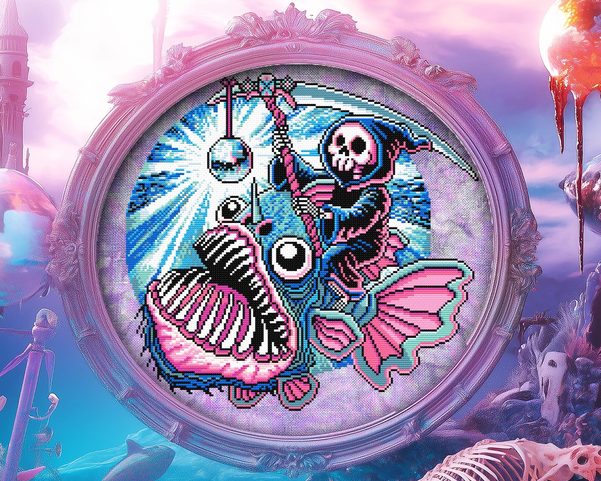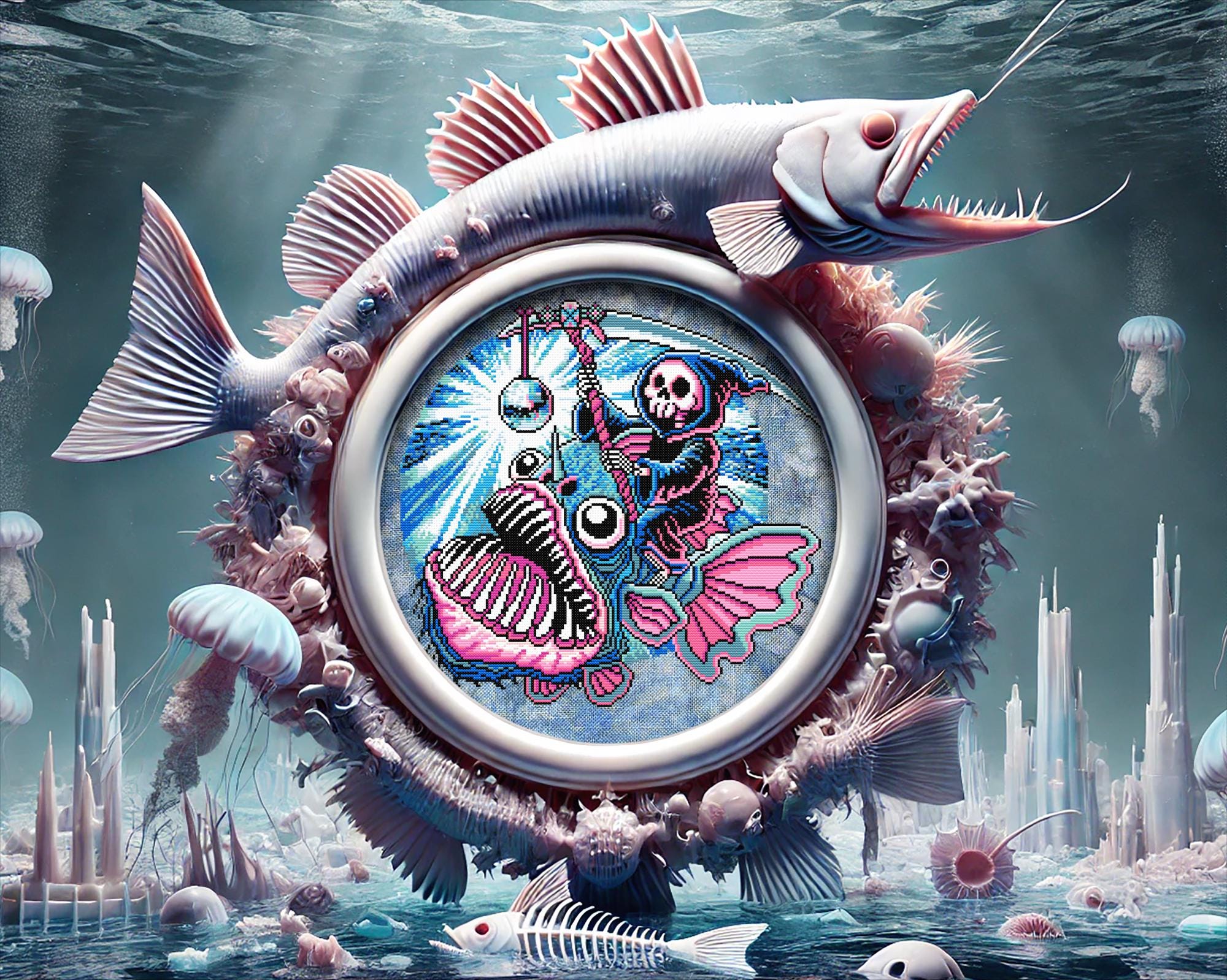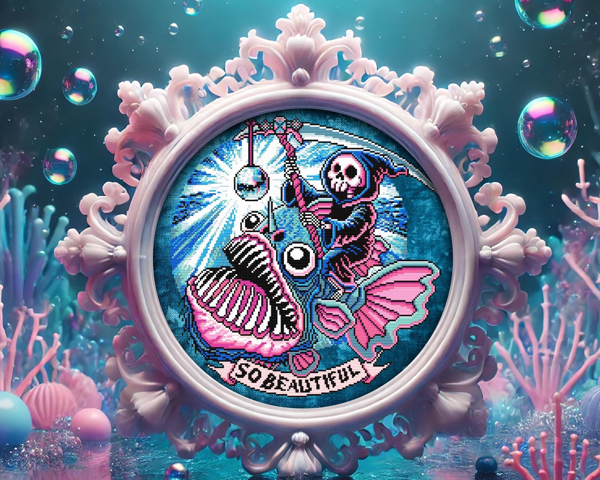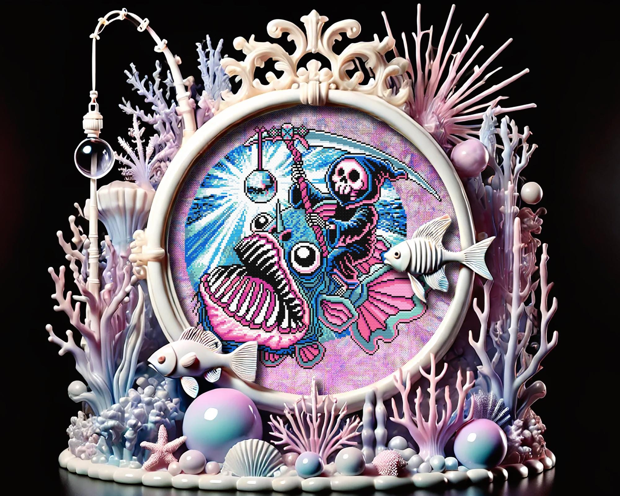 Imagine spending your whole life in the abyss, pitch black, crushing depths, a true creature of the void.. until one day, you finally see the light at the end of the tunnel. And just like that, your time is up. This angler fish cross stitch captures that eerie, almost poetic moment when our black seadevil cross stitch friend takes her final ascent, drawn to the glow of something she was never meant to reach. But of course, in true dark humor cross stitch fashion, that “light” isn’t salvation, it’s a disco ball, and the grimm reaper cross stitch figure is already waiting, scythe in hand, ready to welcome her to the other side.