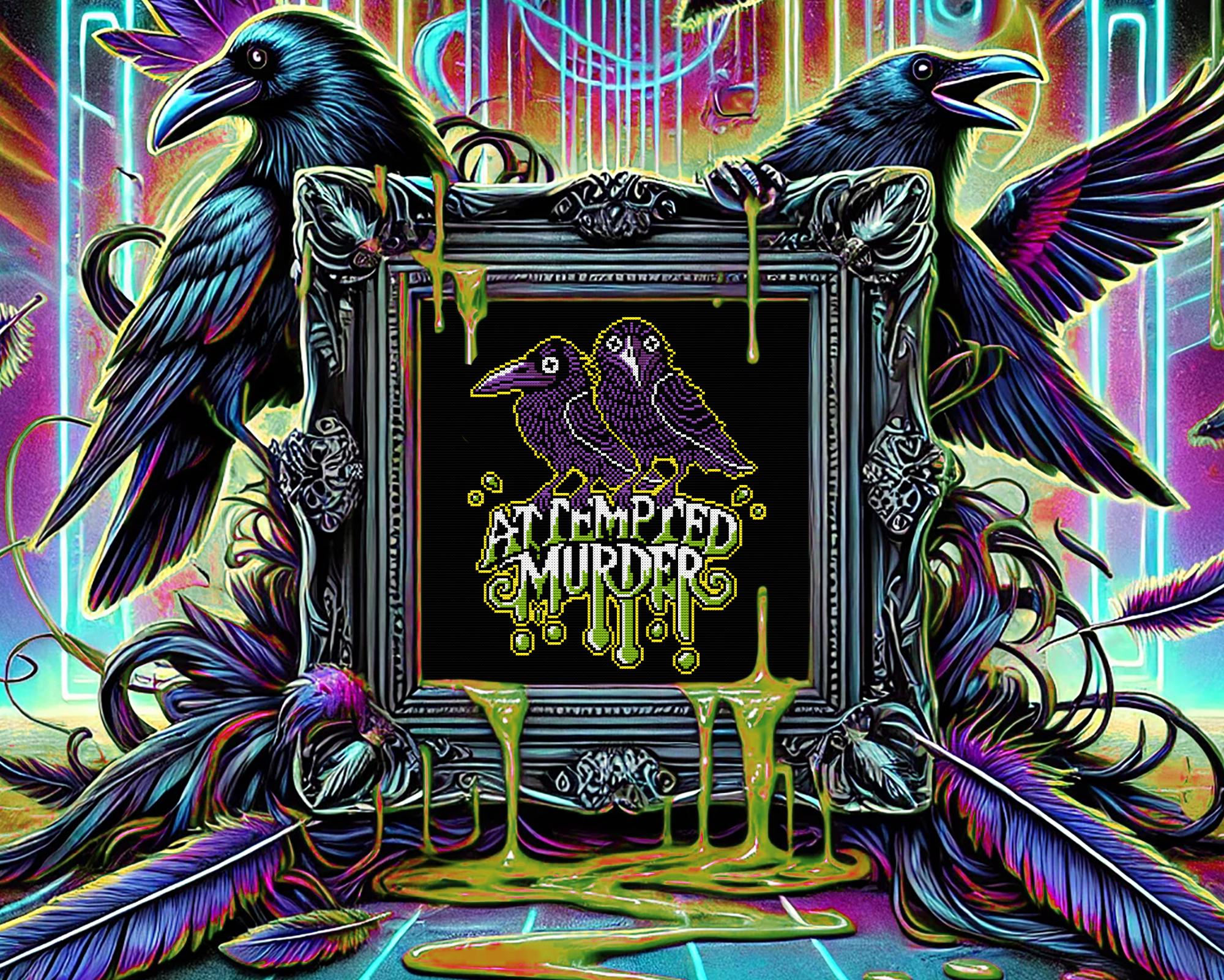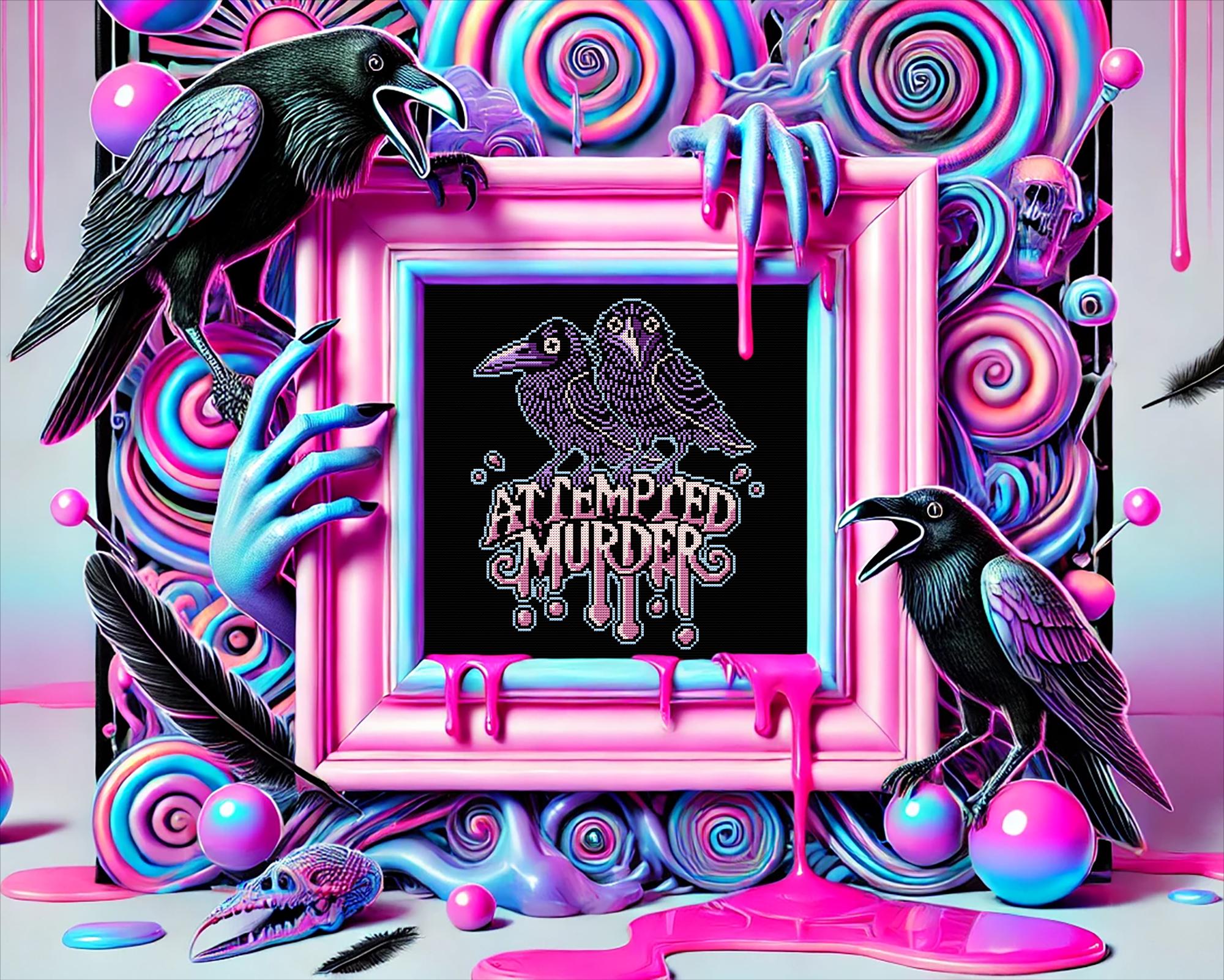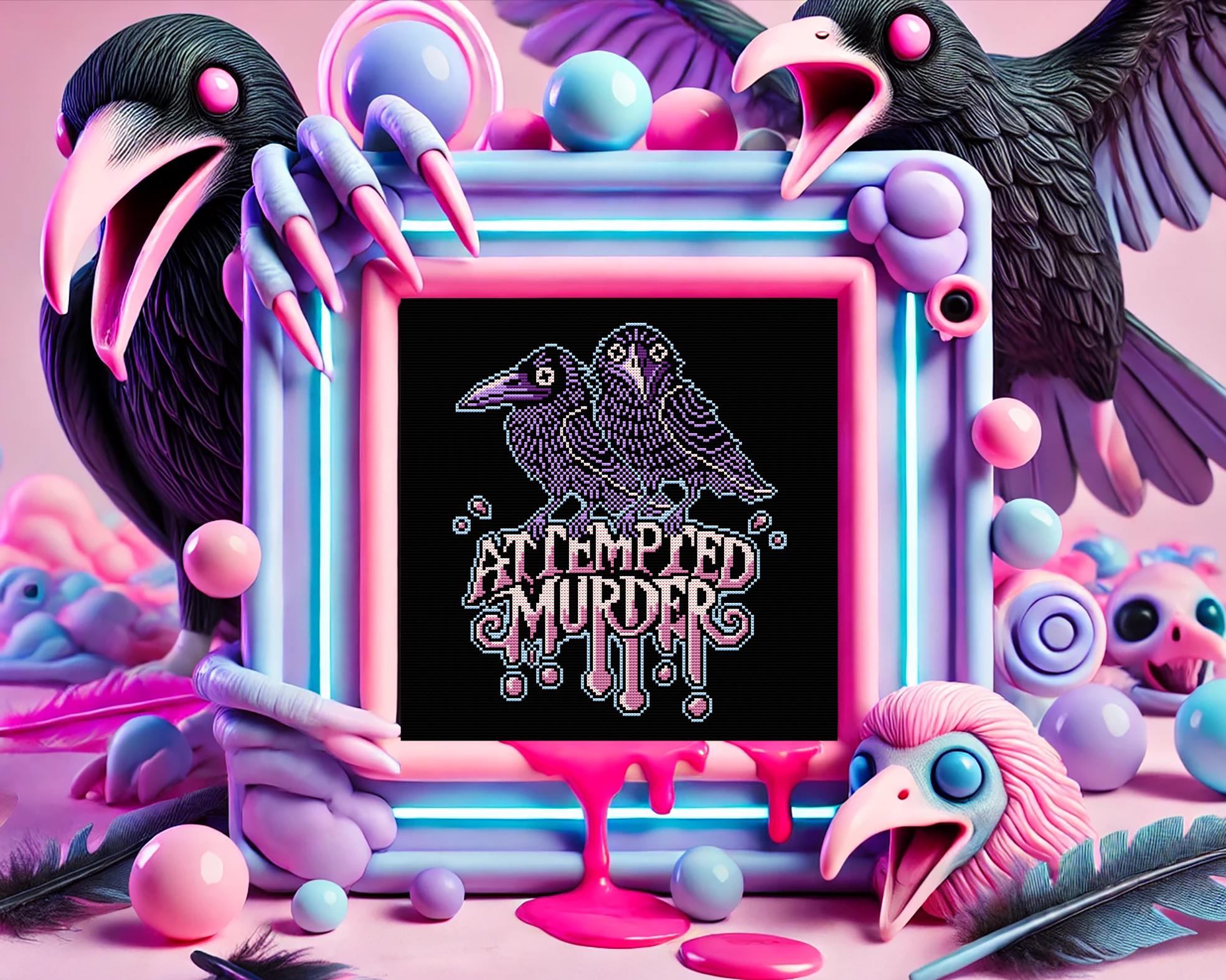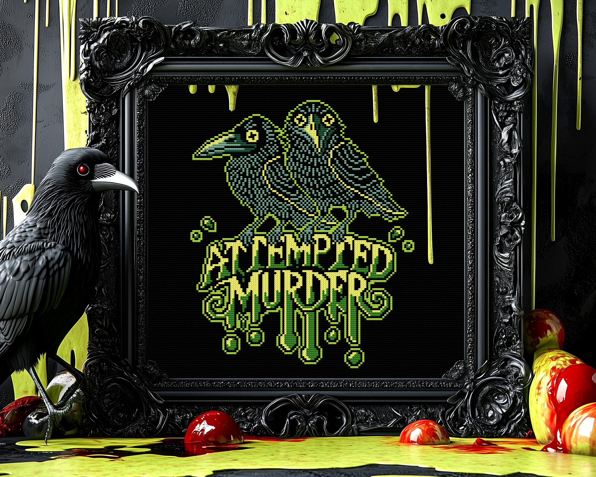 Prepare to crack up with this hilariously dark twist on a classic collective noun! These two mischievous crows are just shy of forming a full-on murder, leaving us with an Attempted Murder instead! Perfect for fans of gothic cross stitch and those who love a clever play on words, this Halloween cross stitch pattern will bring some spooky cross stitch vibes to your home. Whether you choose the bloody, toxic, pastel goth, or psychedelic version, these two little conspirators are ready to make their (not-so-lethal) perch in your collection!