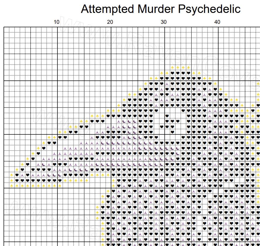 Choose the pastel goth cross stitch option if you’re looking for a softer, yet equally spooky touch, or opt for a bolder look with the murder cross stitch version. And don’t forget, whether you prefer the bloody or psychedelic style, this pattern will have you laughing with its funny cross stitch twist. It’s a must-have for those who appreciate a good snarky cross stitch! And for those keeping track of the details, this pattern is perfect for both seasoned stitchers and newcomers to the art of xstitch.