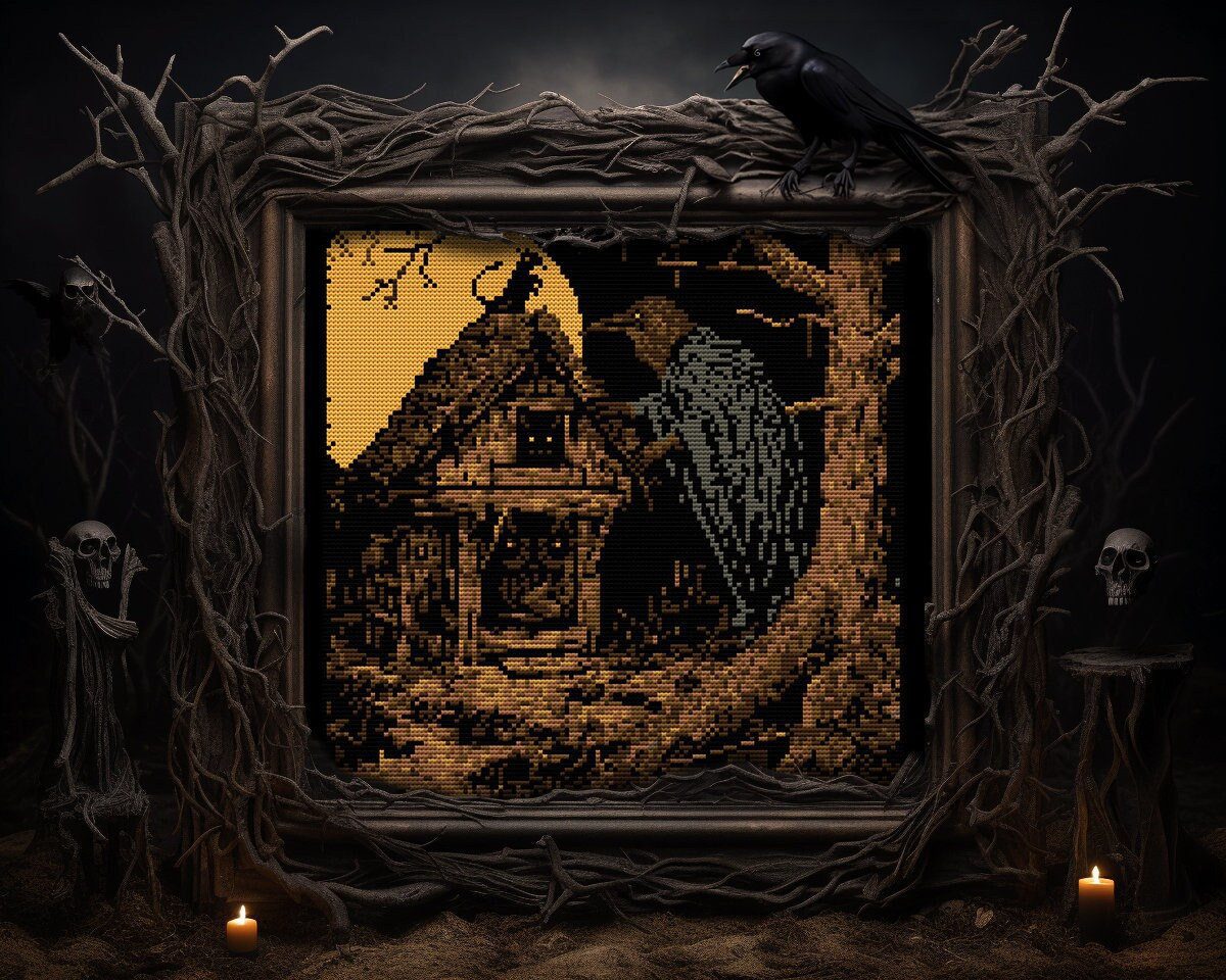 Delve into the hauntingly beautiful tale of Baba Yaga, who, under the full moon’s spectral glow, transforms into a raven. As Baba Raven, she flutters across her enchanted forest, caring for her critters and ensuring the harmony of her dark, mystic abode. Each thread in the cross stitch pattern echoes the quiet whispers of the forest and the cryptic caws of the crows. It is a dance of shadows under the lunar light, a ballet of the macabre that only the brave can behold, and only the true enthusiasts of gothic art can appreciate. It is more than just a pattern; it is a story woven into the very fabric of the cross stitch, a tale of magic, mystery, and the immortal Baba Yaga.