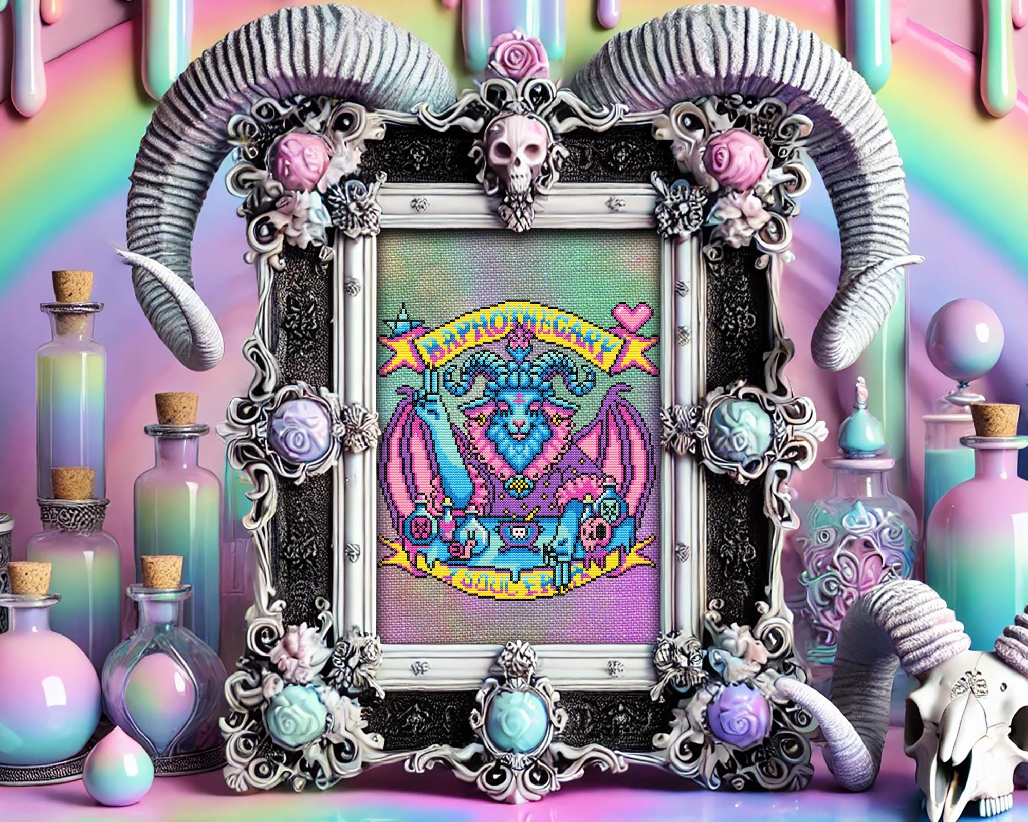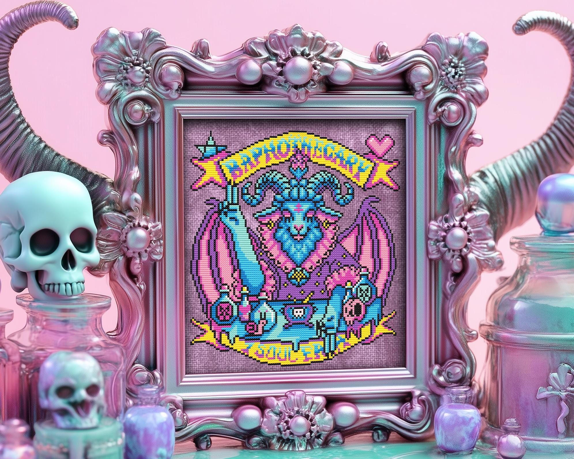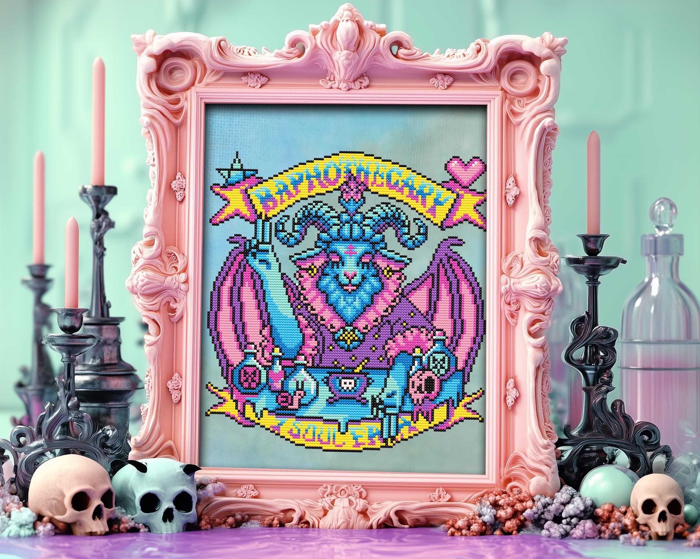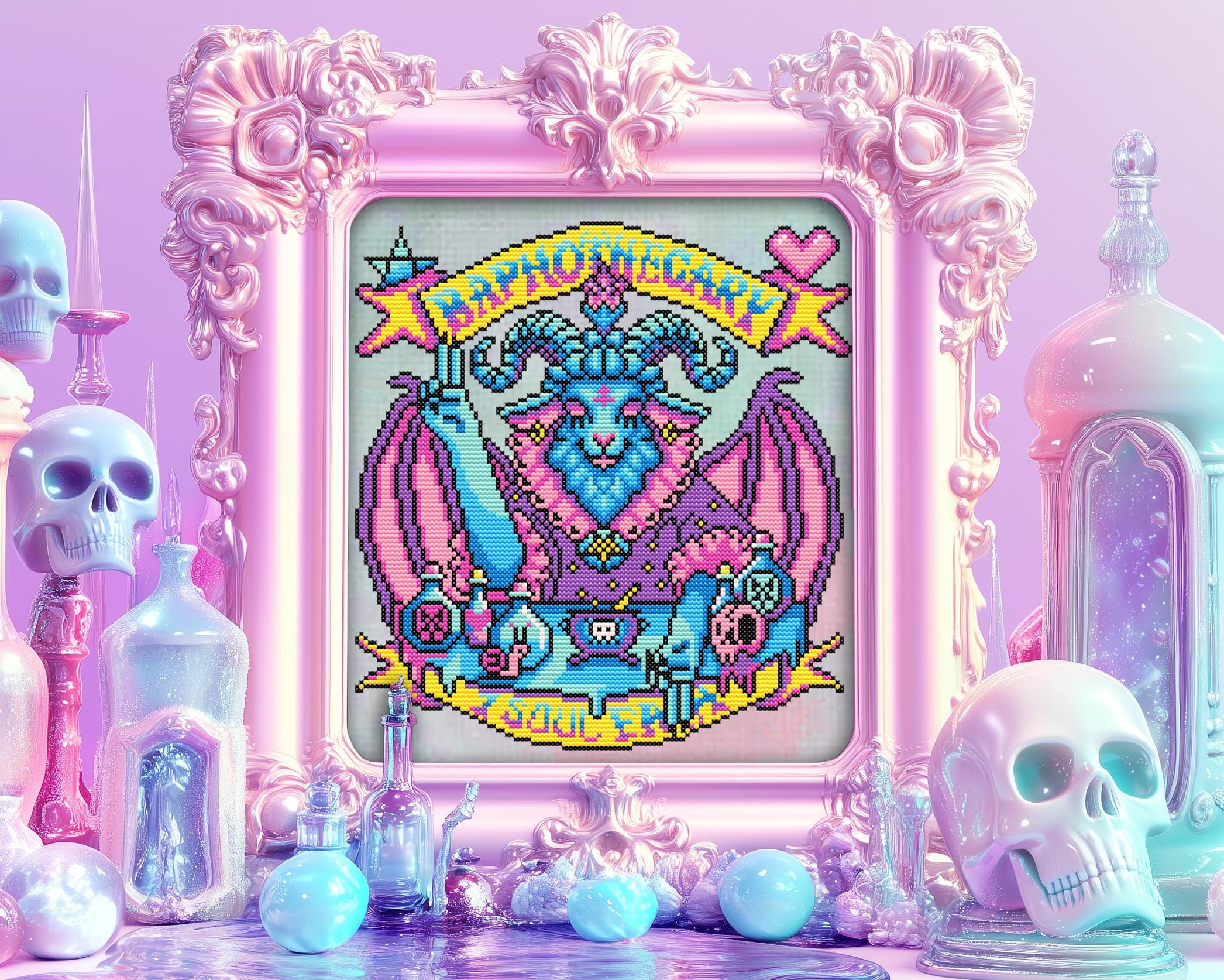 Enter the witchiest apothecary you’ve ever seen, where pastel goth dreams and occult aesthetics collide! Meet Baphomet cross stitch, but not as you know them. This fluffy, cotton candy pastel goth deity is rocking the most charming apothecary vibe, complete with a cheeky banner proclaiming Baphotecary and a soul-snatching sales pitch: “1 soul each.” (Because let’s face it, we’re fresh out of spare souls! ) Whether you’re brewing potions or simply stitching spells, this modern cross stitch masterpiece is here to enchant your hoop and your heart.
