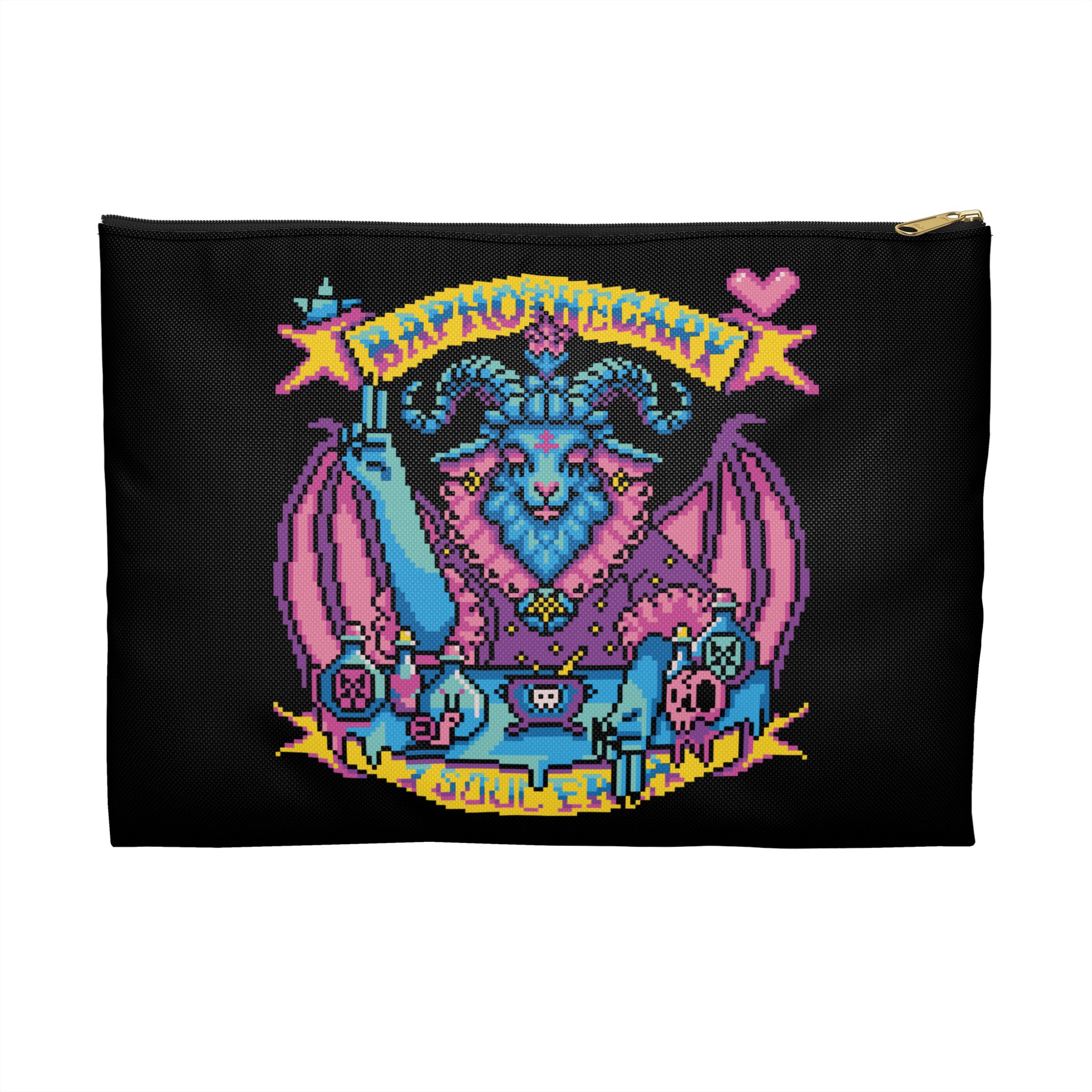 Say hello to your new craft-fueled chaos dealer. The Baphothecary Project Bag features a pixel-perfect potion-slinging Baphomet with glam rock eyeliner, bubblegum colors, and zero chill. Surrounded by enchanted bottles, tiny demons, and questionable herbs, this goat is ready to organize your projects and summon good vibes.