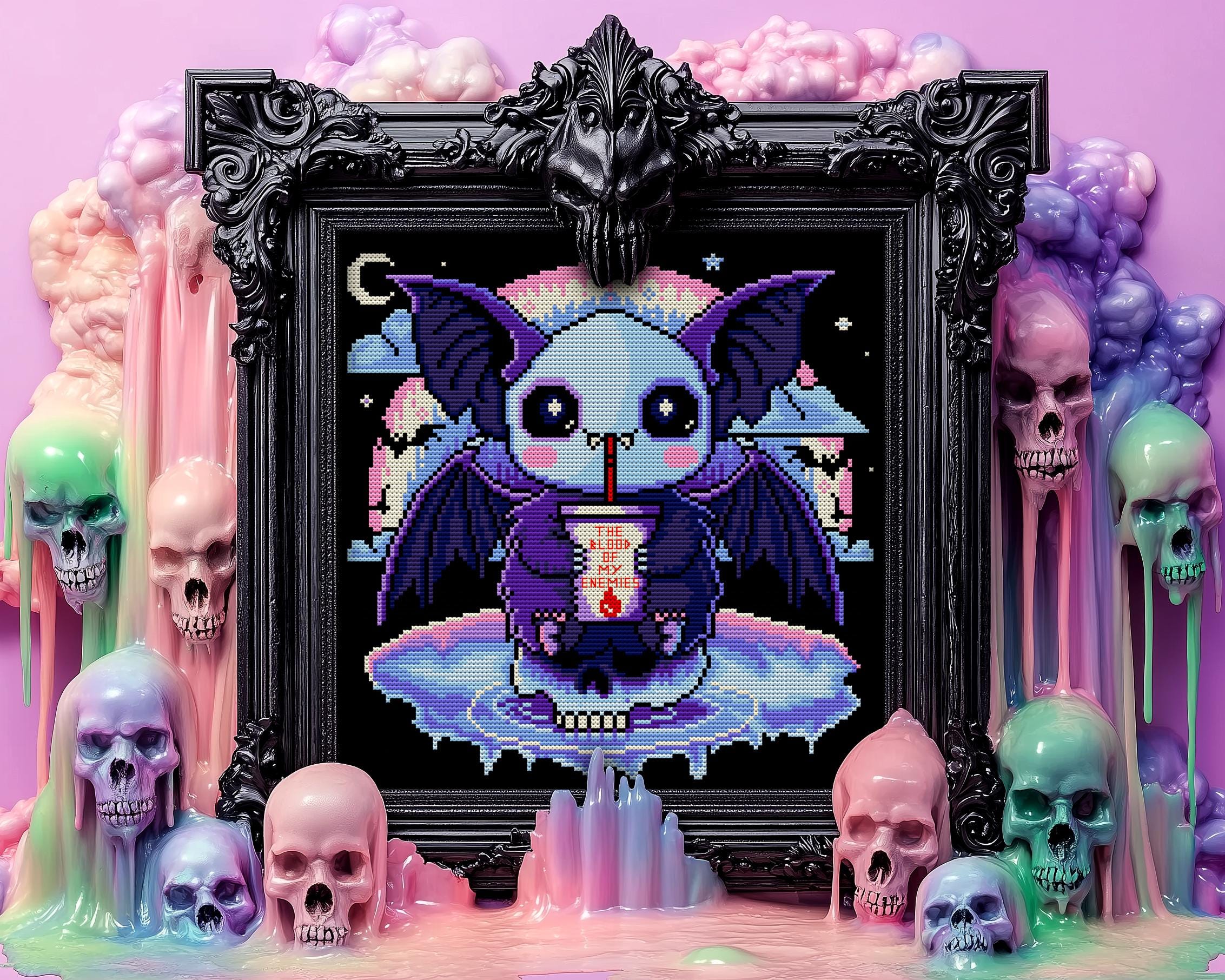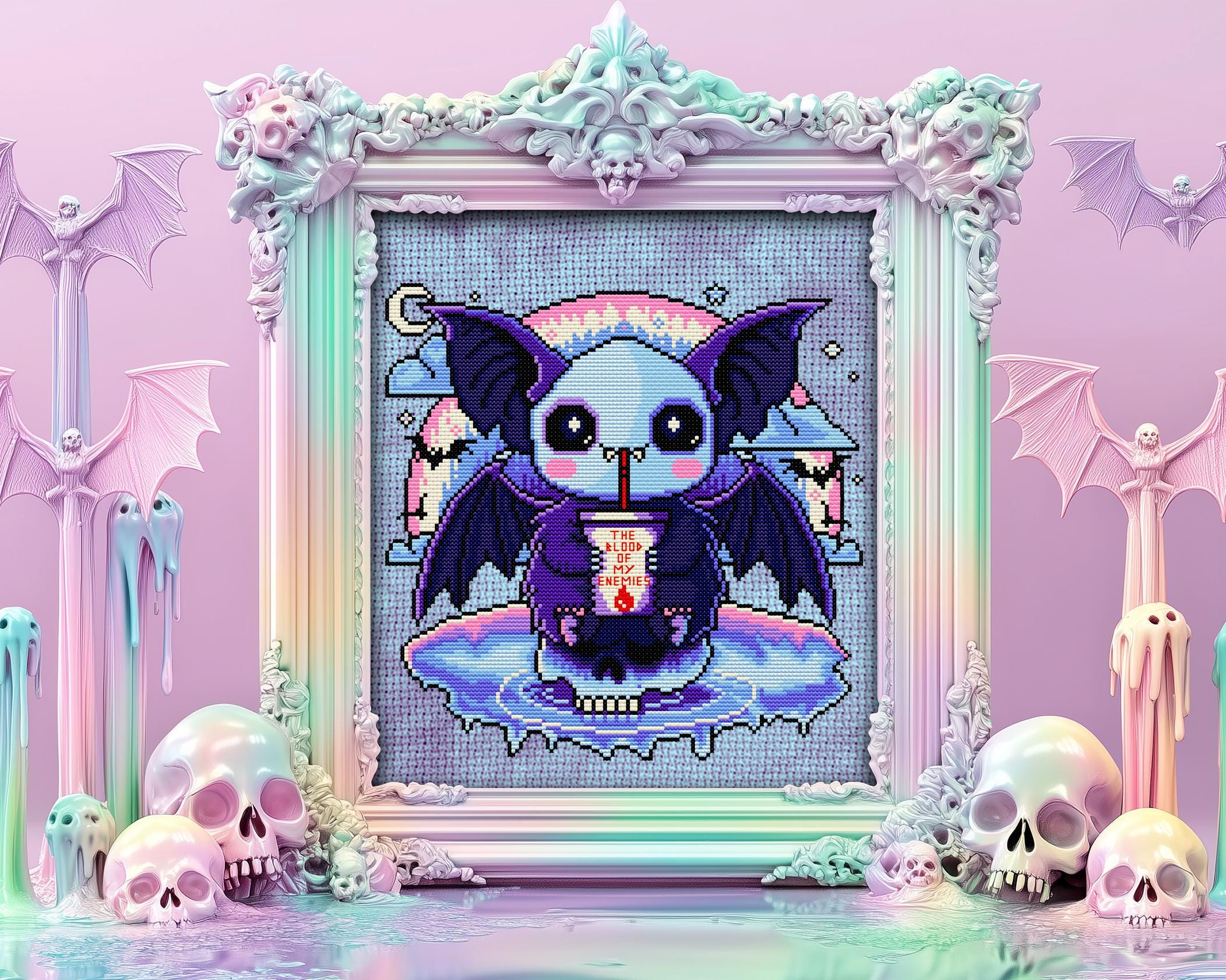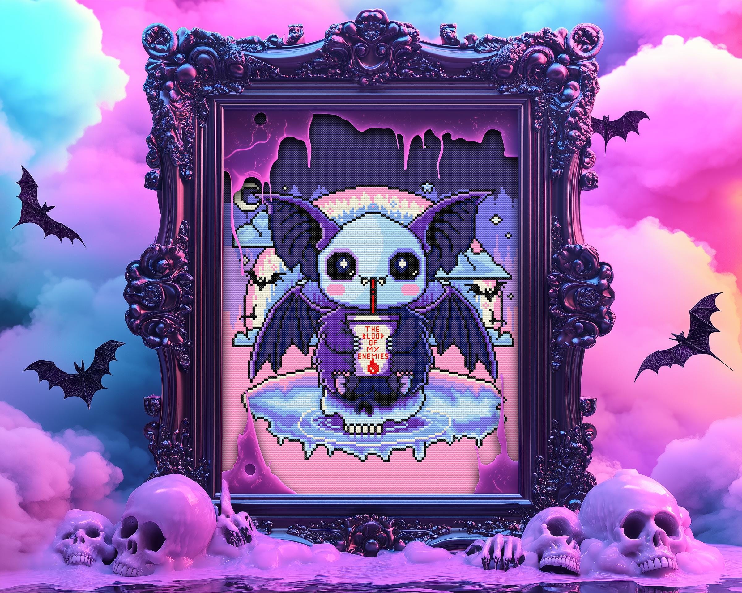 Oh, you’ve heard the old saying, “Revenge is sweet”? Well, this pastel goth vampire bat takes it very literally! Inspired by the intense poetry of Theognis “Let me drink the black blood of my enemies, so that, as a noble soul, I may fulfill this wish” this spooky cross stitch pattern flips ancient Greek vibes into a kawaii pastel scene. Our tiny terror, perched atop a skull, sips a dark red drink with a cheeky grin, and floats in an iridescent sea beneath a rainbow-dripping night sky. It’s witchy cross stitch with a wickedly adorable twist!