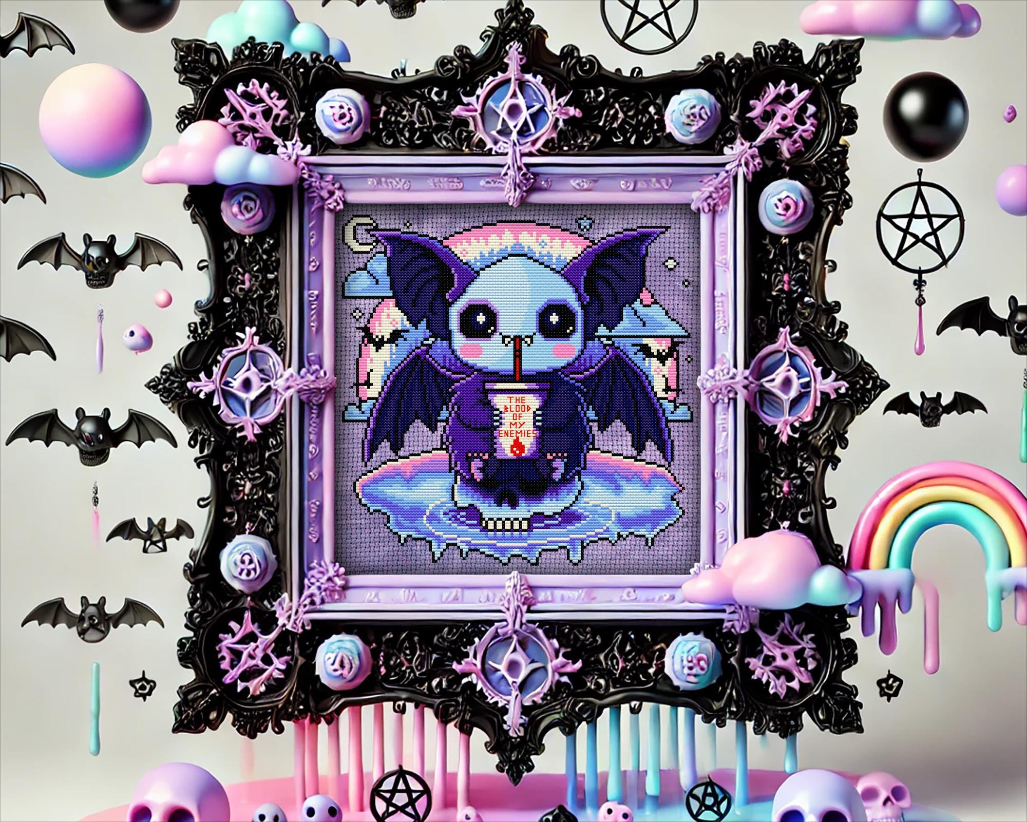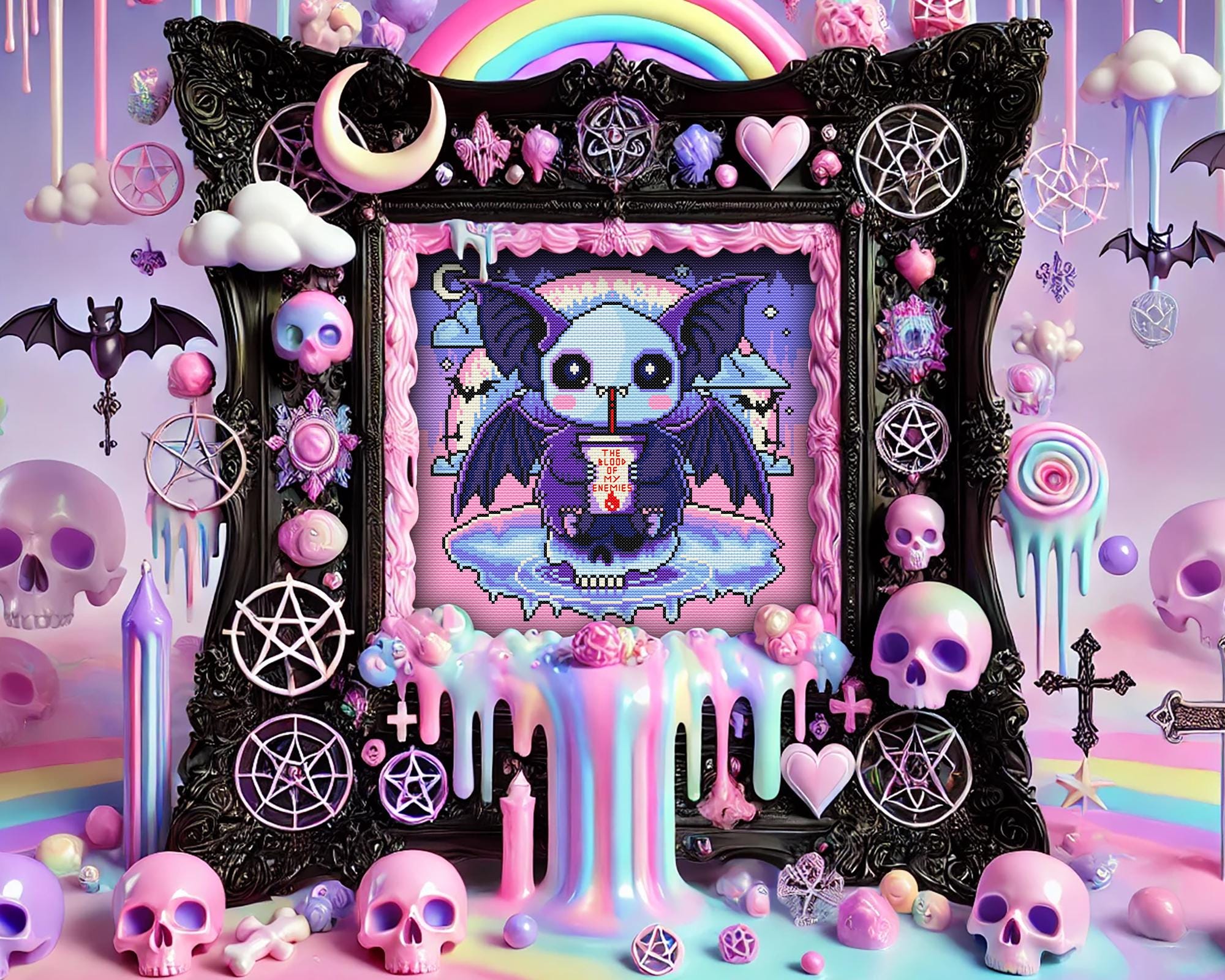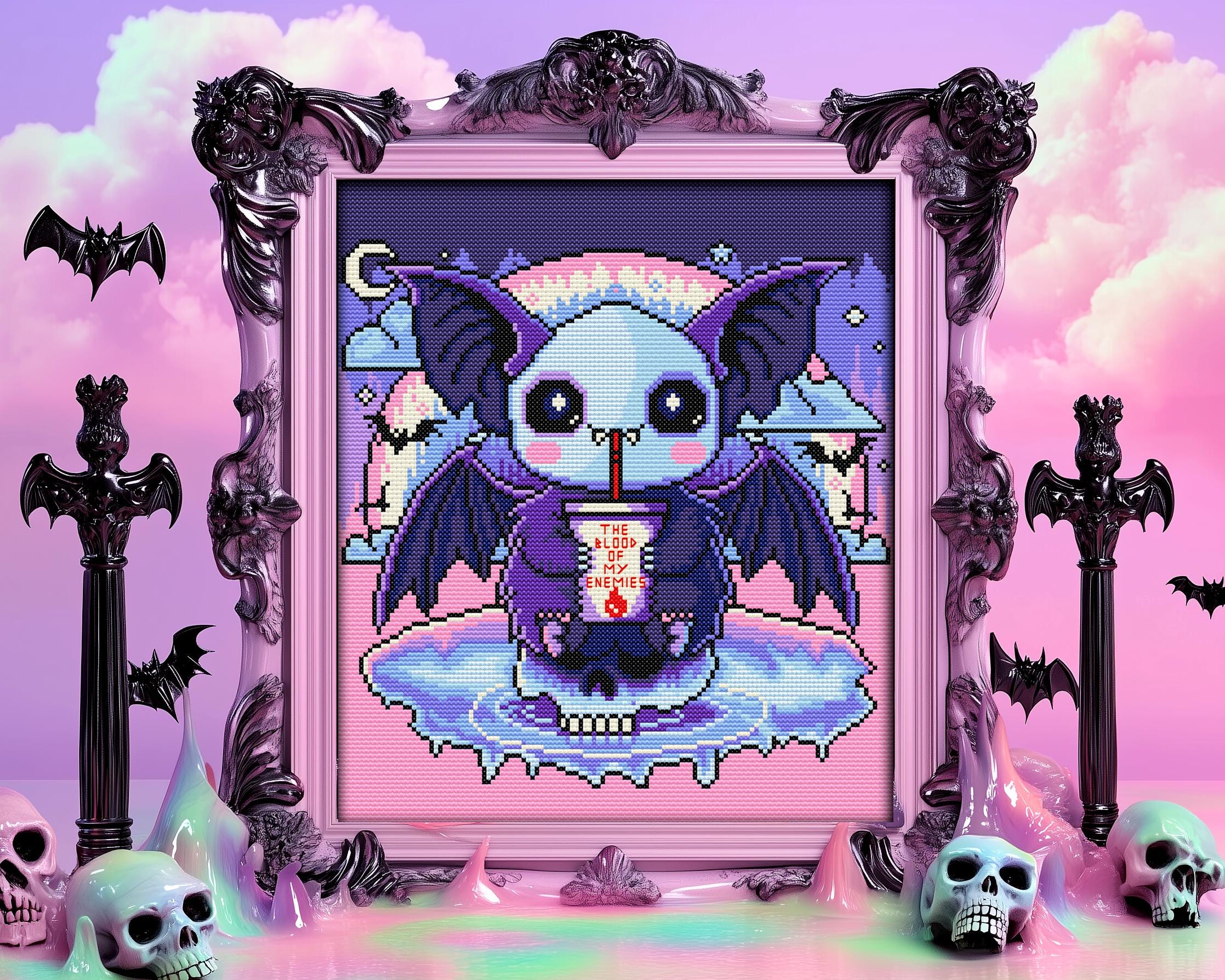 Oh, you’ve heard the old saying, “Revenge is sweet”? Well, this pastel goth vampire bat takes it very literally! Inspired by the intense poetry of Theognis “Let me drink the black blood of my enemies, so that, as a noble soul, I may fulfill this wish” this spooky cross stitch pattern flips ancient Greek vibes into a kawaii pastel scene. Our tiny terror, perched atop a skull, sips a dark red drink with a cheeky grin, and floats in an iridescent sea beneath a rainbow-dripping night sky. It’s witchy cross stitch with a wickedly adorable twist!