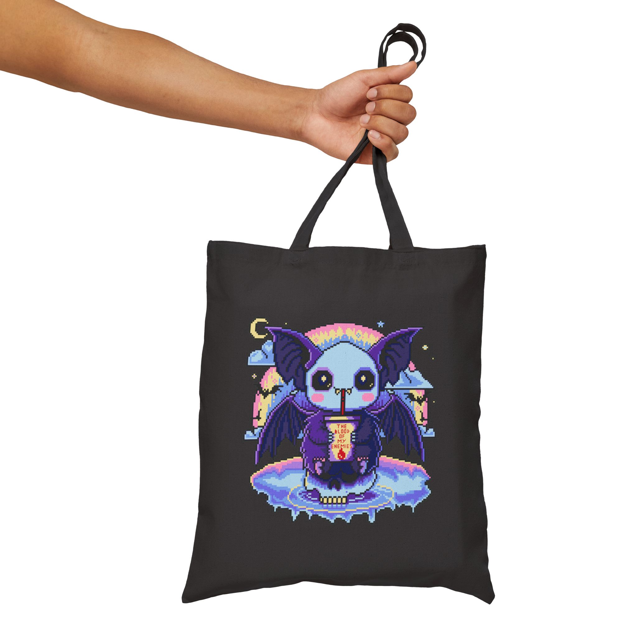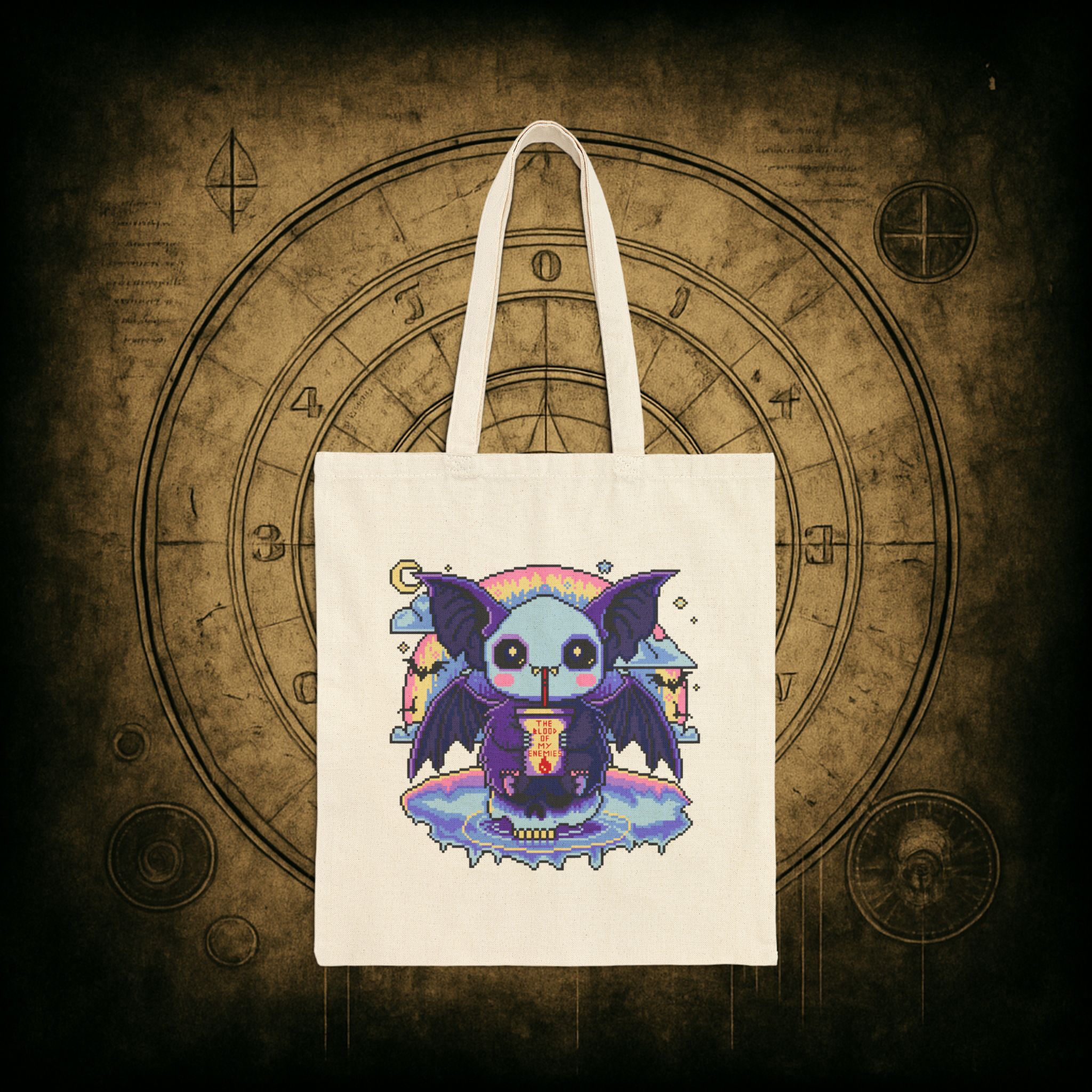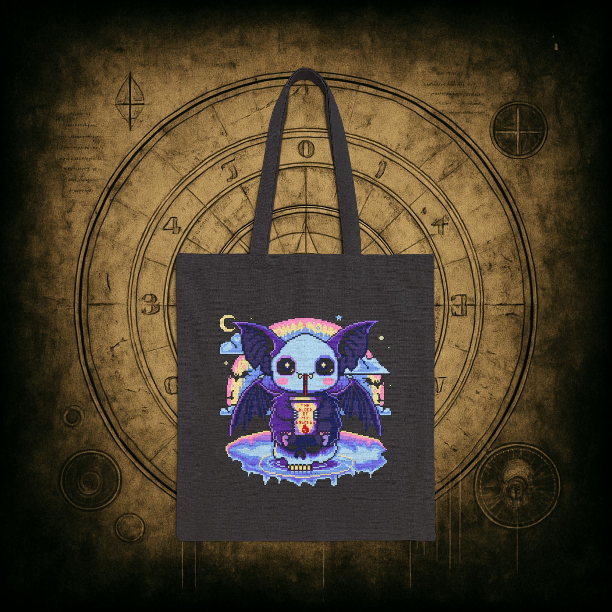 Behold, the cutest menace to ever sip chaos through a straw, the Blood of My Enemies Tote Bag is here, and it’s unbothered, well-hydrated, and absolutely diabolical. Featuring a pixel-perfect vampire bat cradling its sinister smoothie under a pastel moon, this bag carries vengeance in style. Ideal for grocery runs, cursed book hauls, or showing up uninvited to brunch with your ex’s ex.