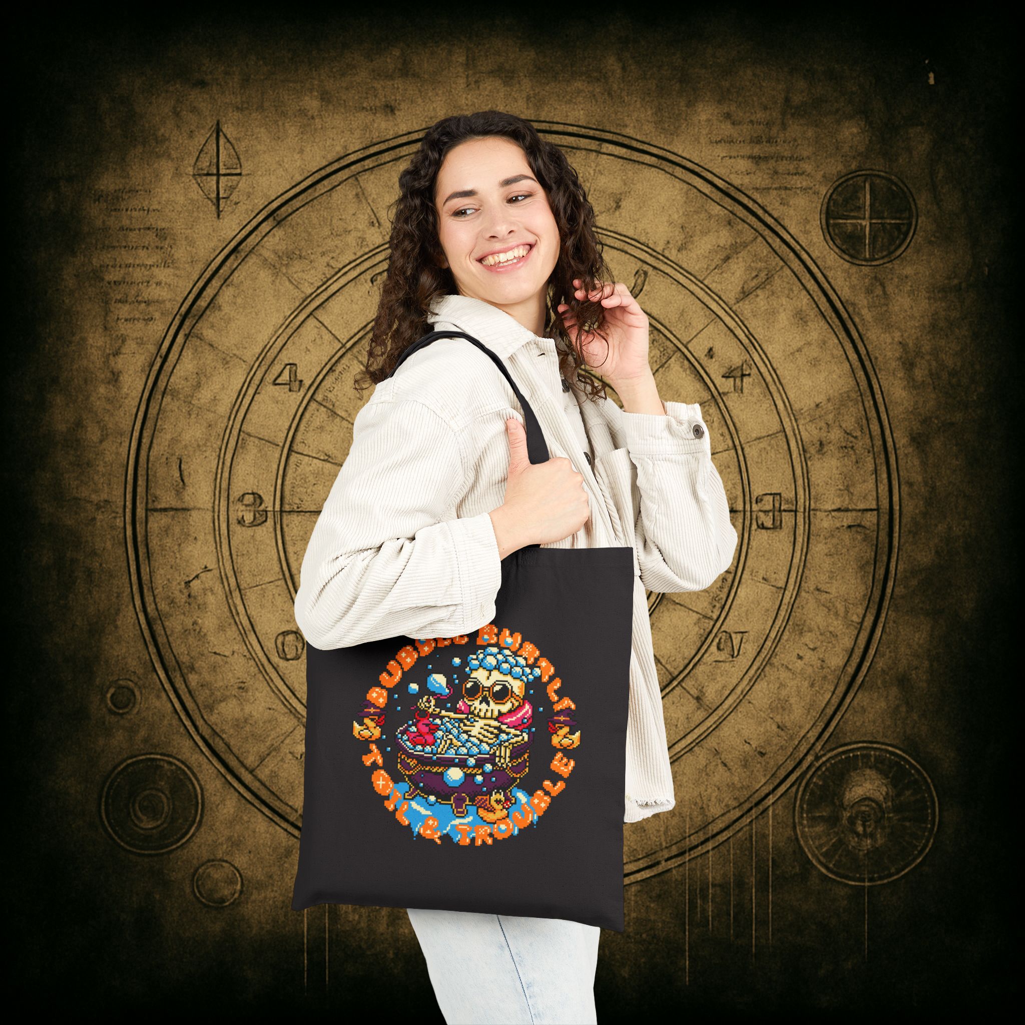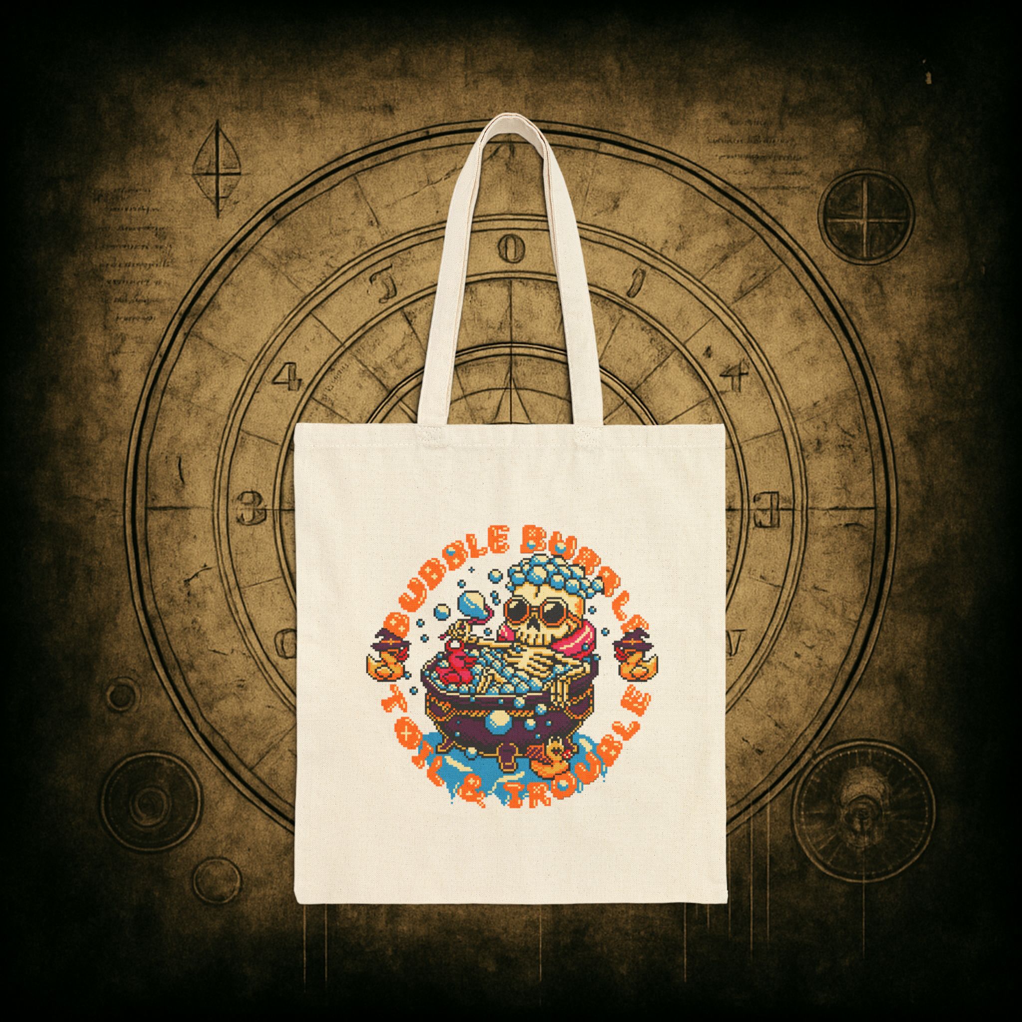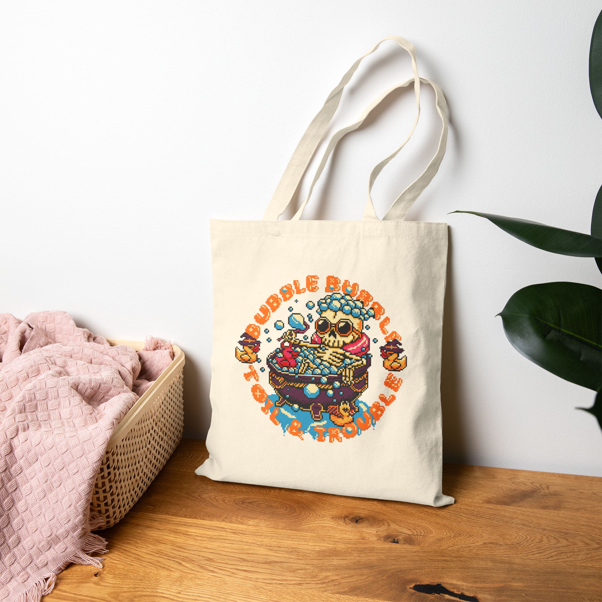 Bathtime brews and bubbly doom, the Bubble Bubble Tote Bag brings skeleton chic straight to your daily grind. Featuring a bone babe soaking in a cauldron of mischief, bubbles, and possibly stolen spells, this tote is ideal for witches who believe in self-care and summoning. Whether you’re headed to the potion shop, spa, or just carrying your emotional baggage in style, this bag’s got you covered.