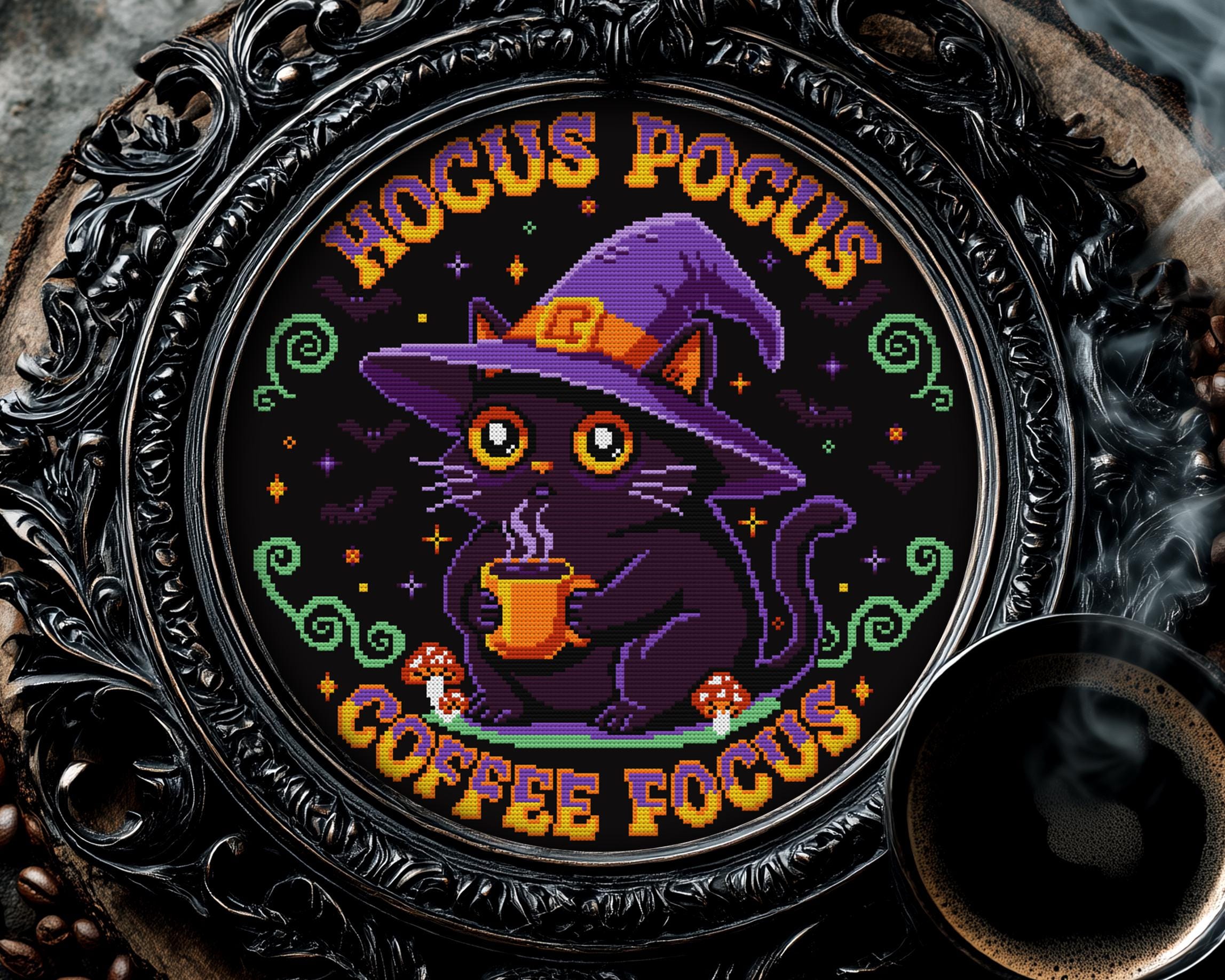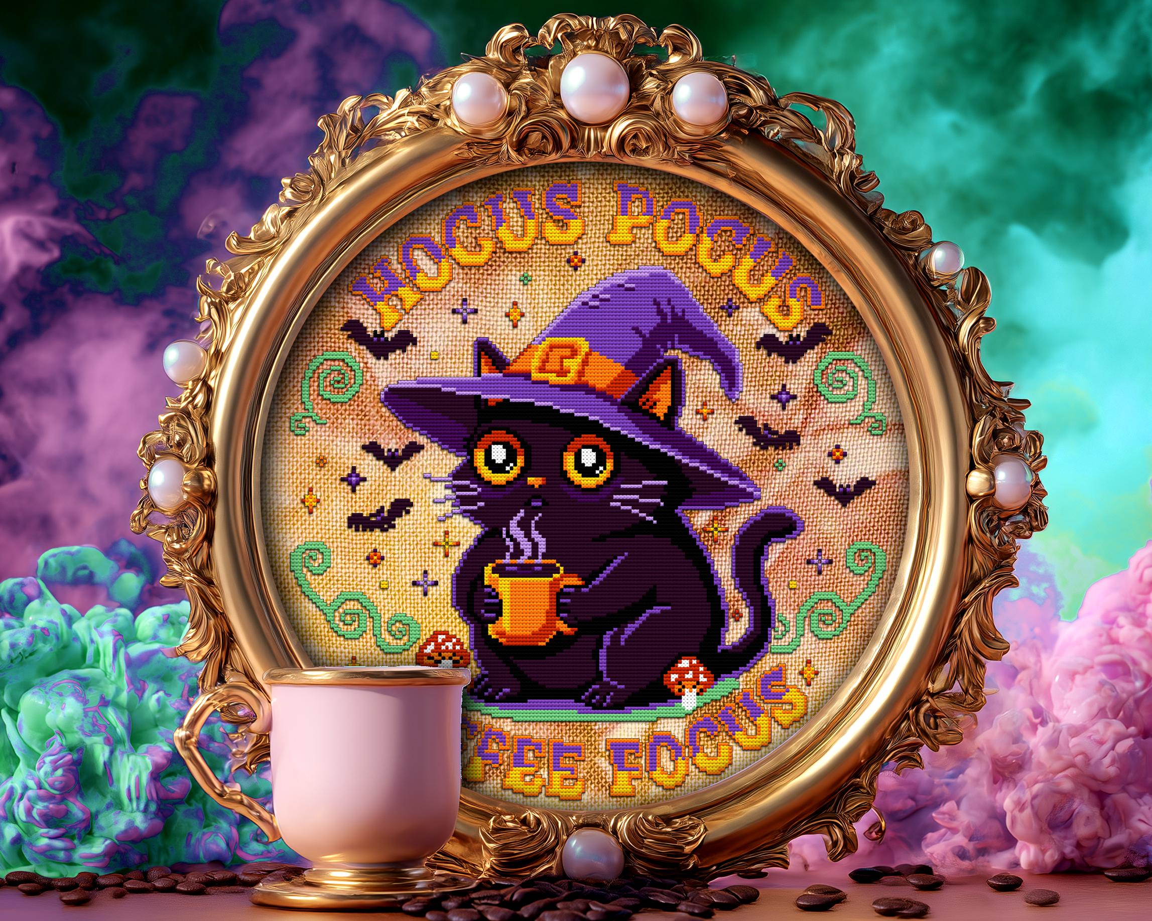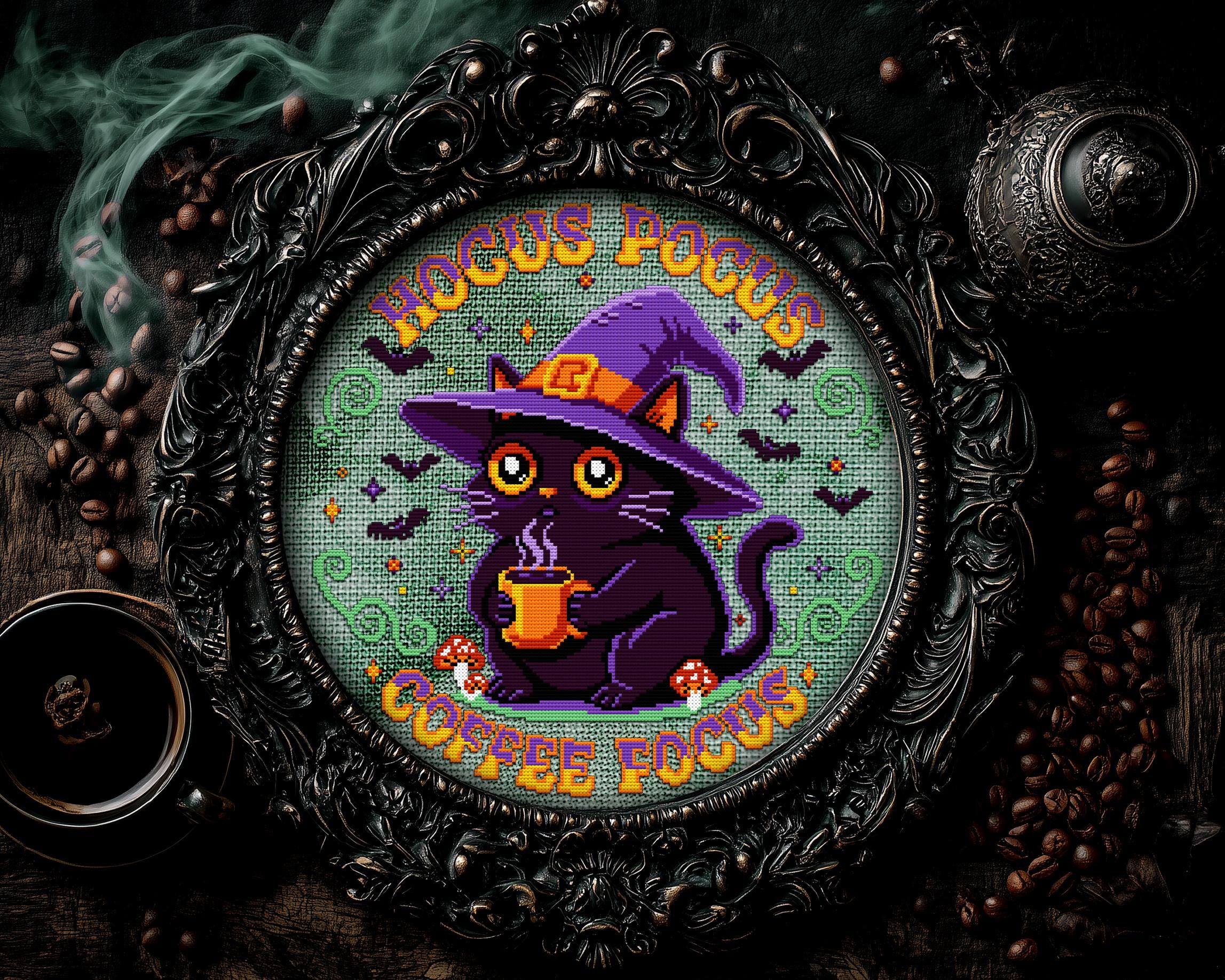 This caffeine-cursed kitty is the kind of gothic cross stitch that makes a spooky cross stitch heart purr at midnight. With “Hocus Pocus Coffee Focus” floating like a spell, it’s pure Halloween cross stitch chaos with a wink of witchy cross stitch attitude. Hang it up all year, because halloween cross stitch season is a lifestyle, not a date on the calendar. Those bug-eyed espresso orbs and that purple hat were brewed for a gothic cross stitch pattern lover who still wants it to feel like modern cross stitch magic. If you’ve ever stared into your mug and seen destiny, congrats, you’re officially in witchy xstitch territory, deep in the dark cross stitch zone.