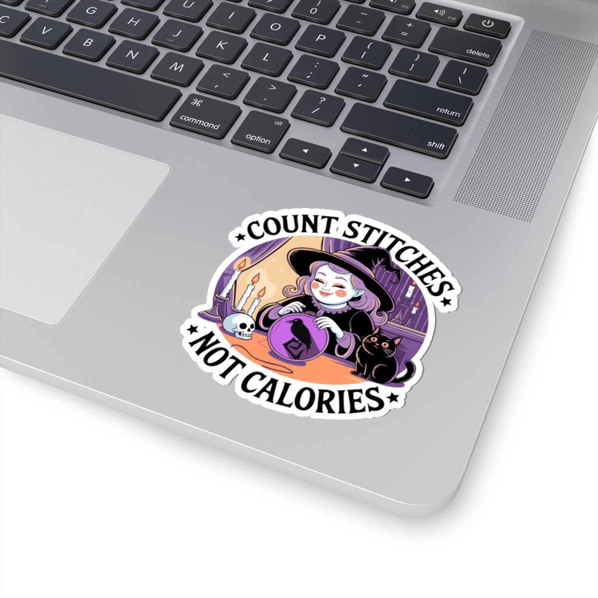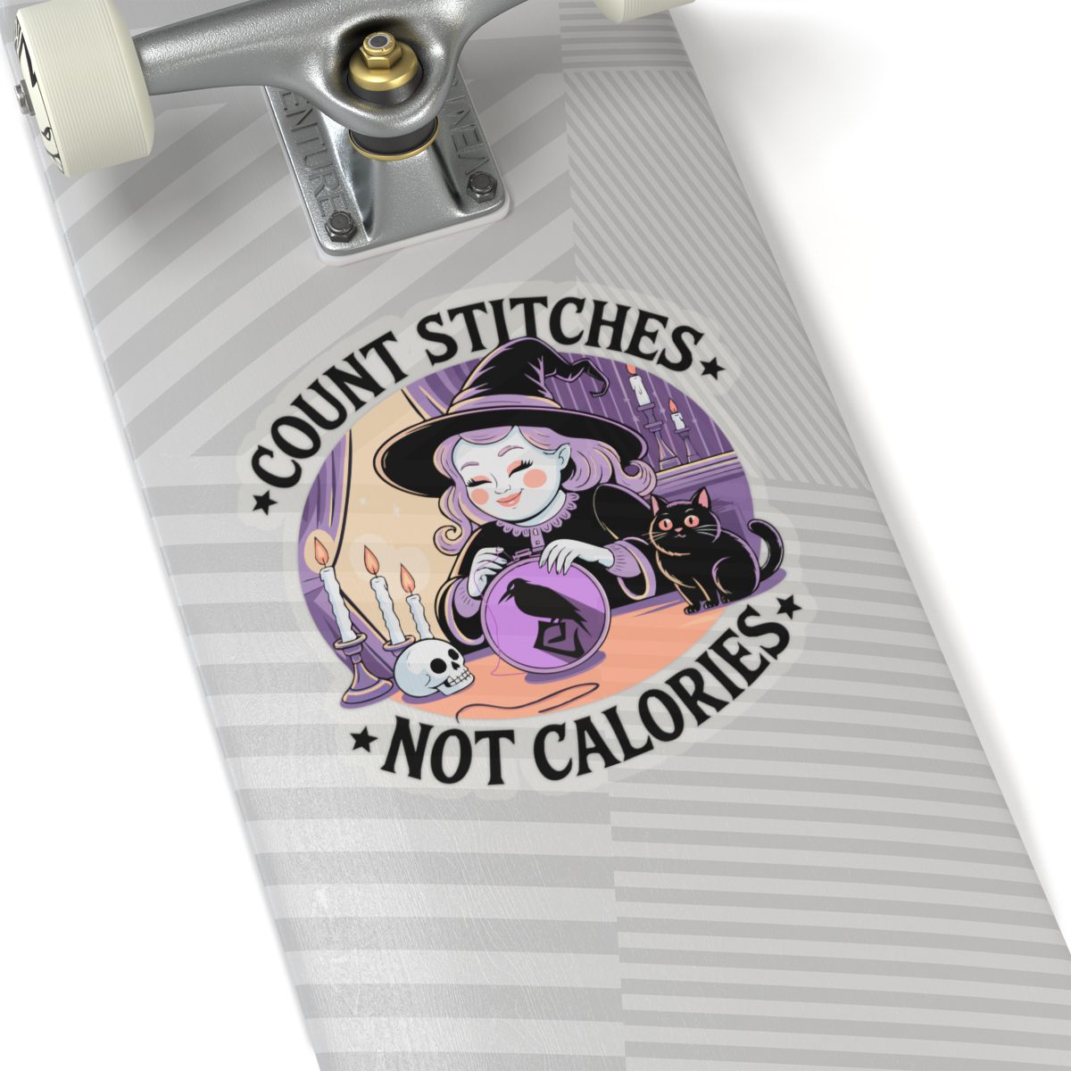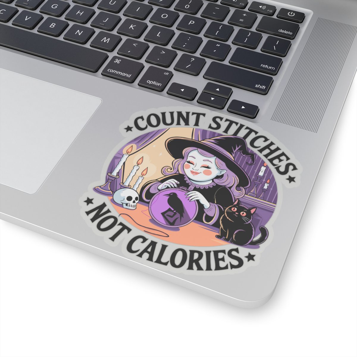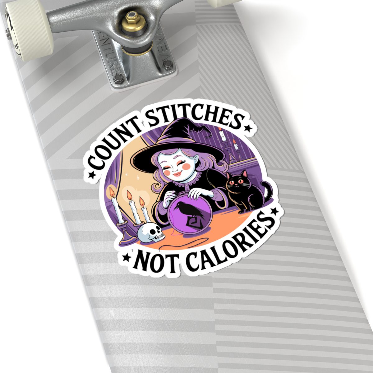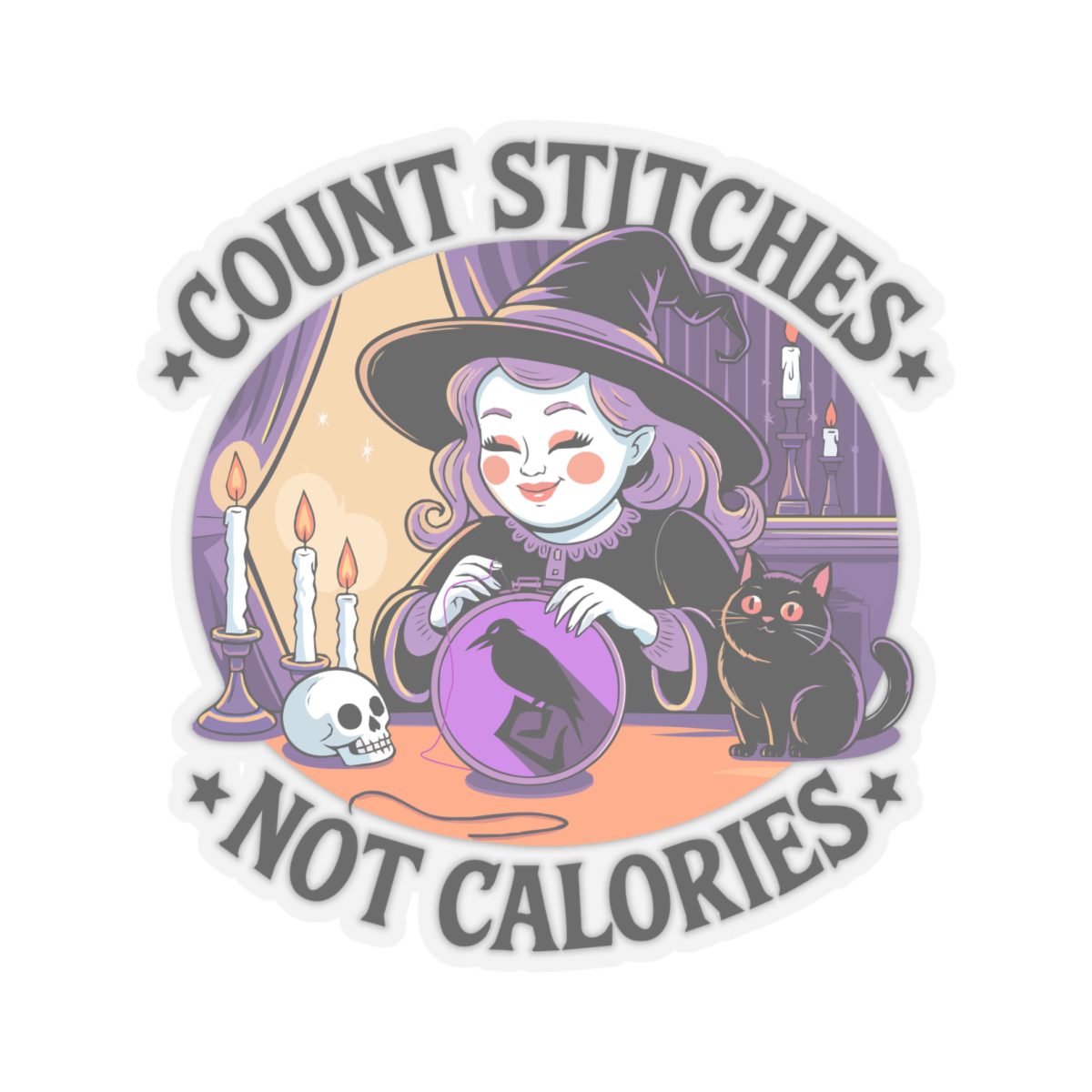 Forget diet culture, this witch is here for fiber in the floss, not on the plate. The Count Stitches Not Calories Kiss-Cut Sticker celebrates cozy chaos, confident crafting and the sacred act of snacking while stitching. Surrounded by candles, crystals, and a cat who silently judges your backstitch, she’s the patron saint of wholesome rebellion.