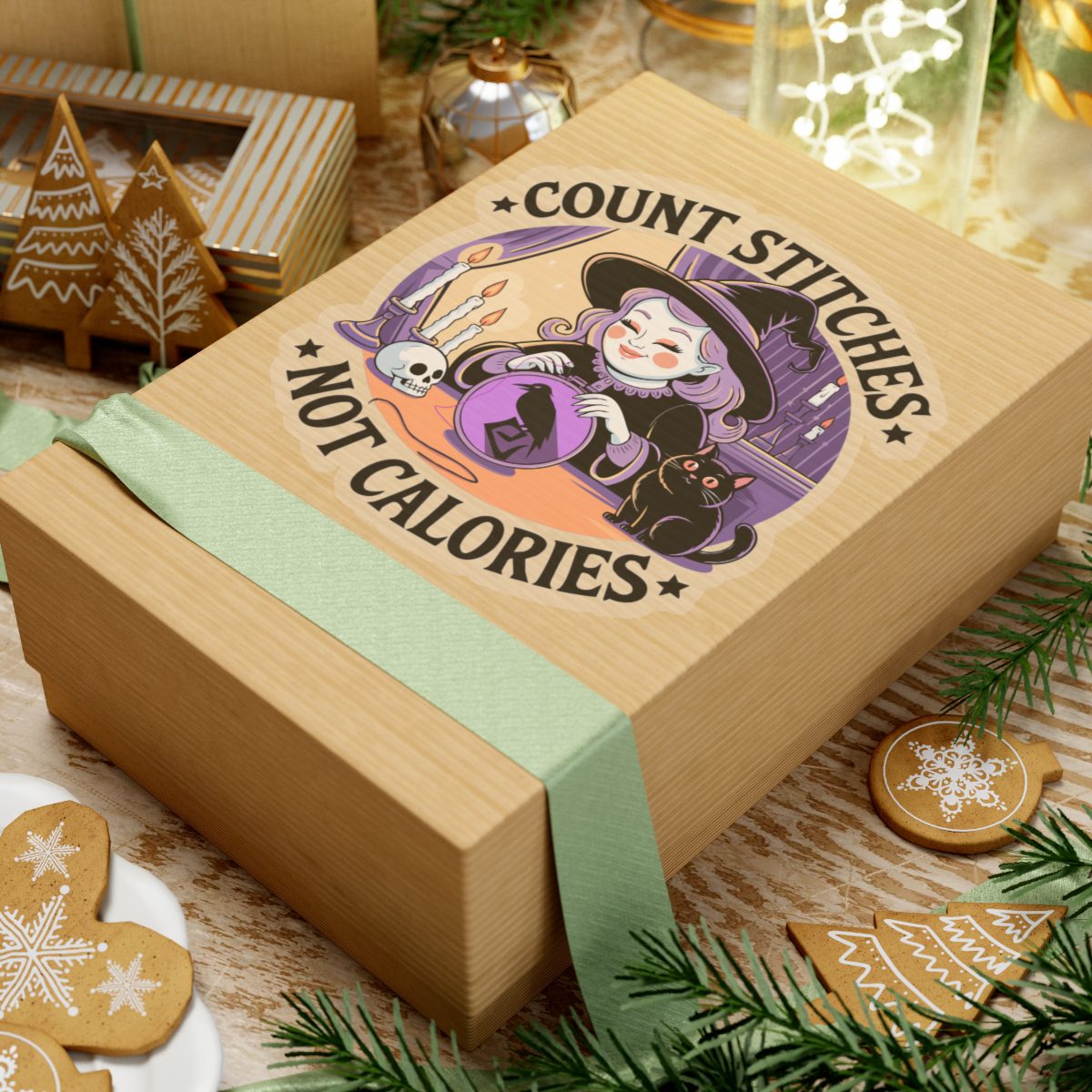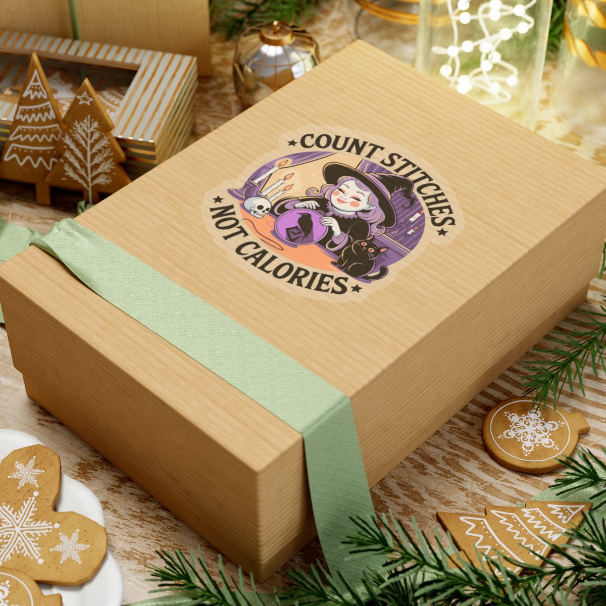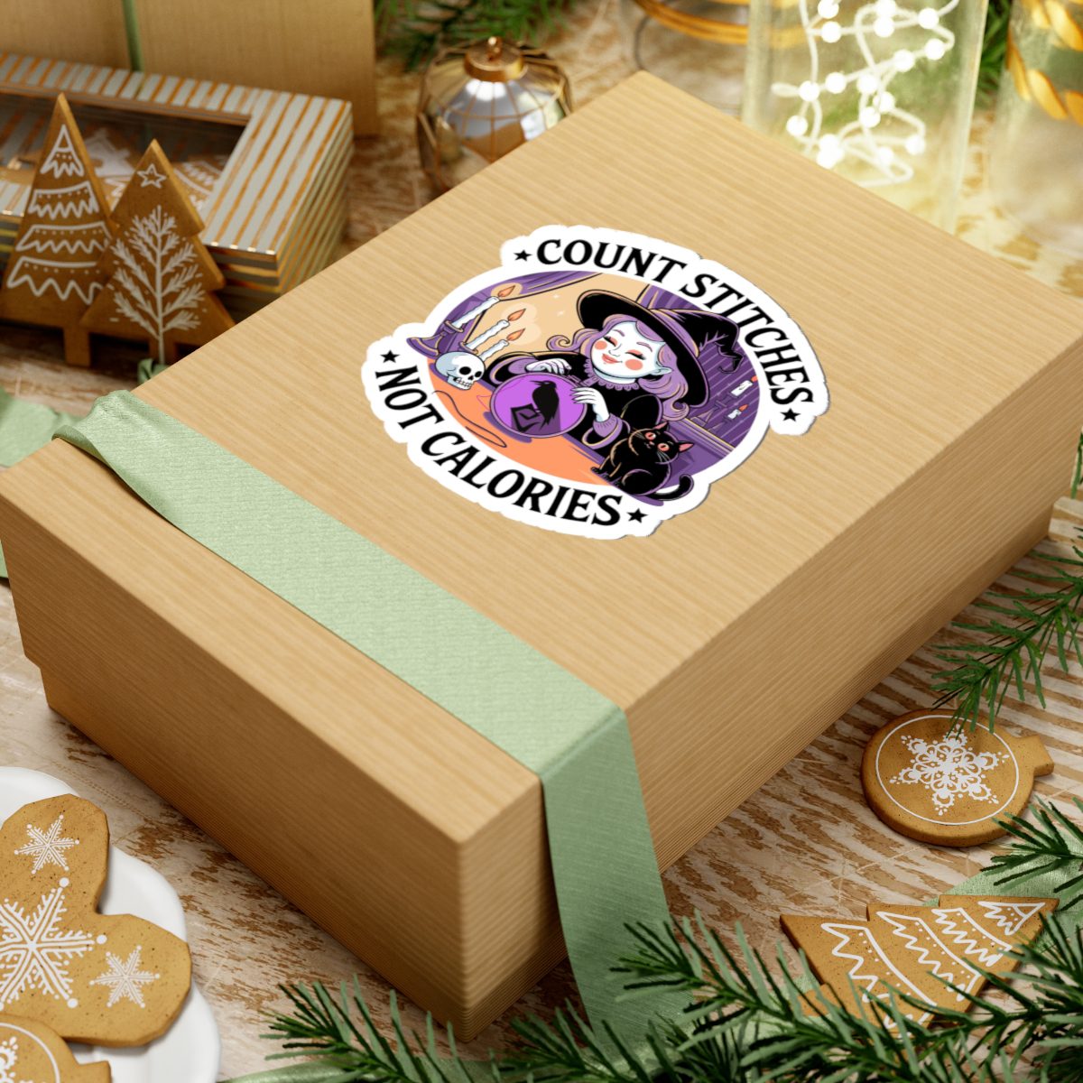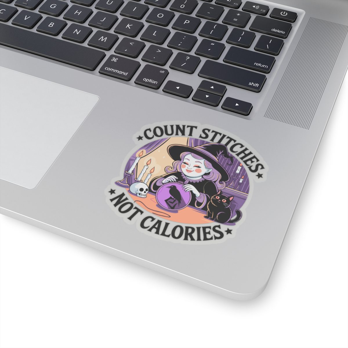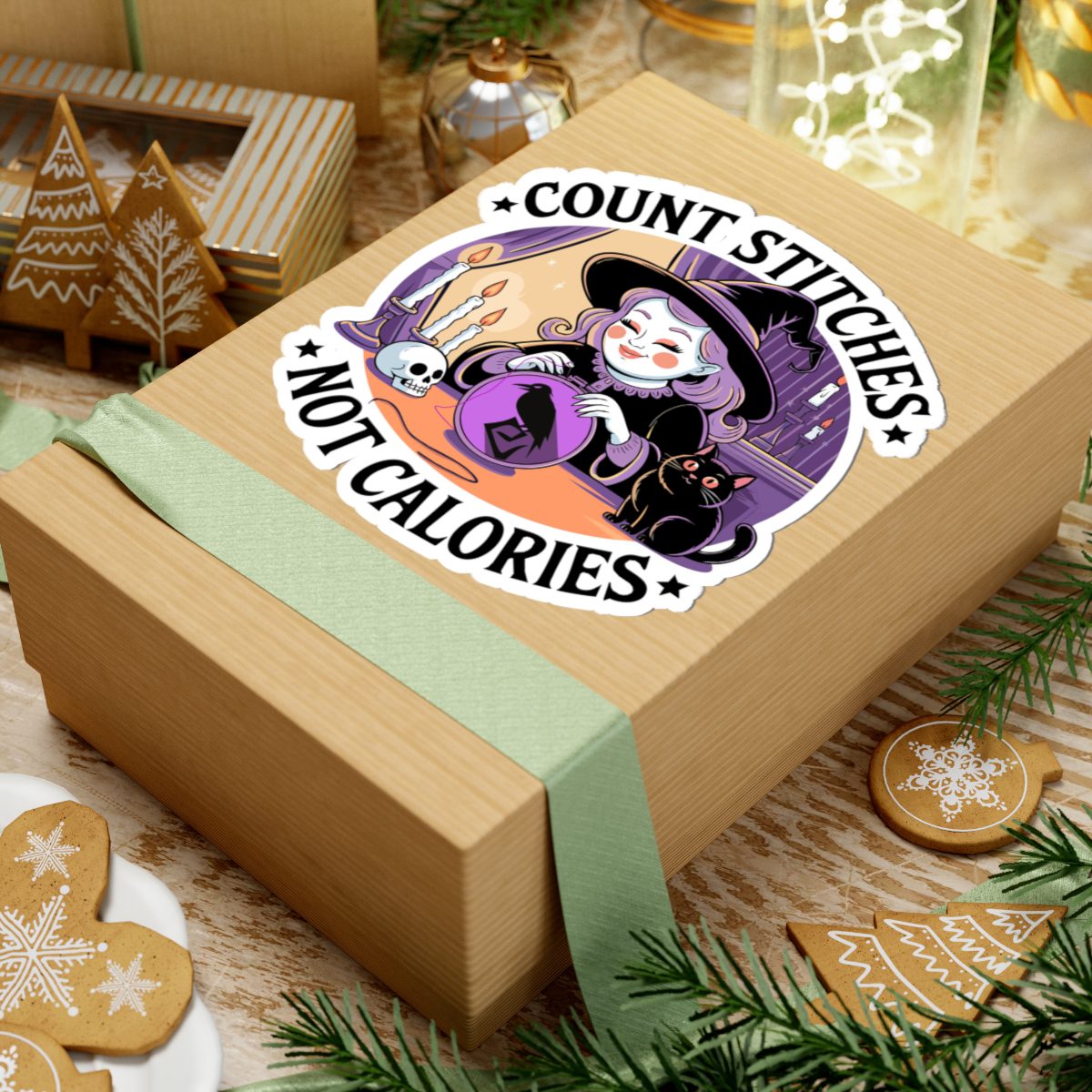 Forget diet culture, this witch is here for fiber in the floss, not on the plate. The Count Stitches Not Calories Kiss-Cut Sticker celebrates cozy chaos, confident crafting and the sacred act of snacking while stitching. Surrounded by candles, crystals, and a cat who silently judges your backstitch, she’s the patron saint of wholesome rebellion.