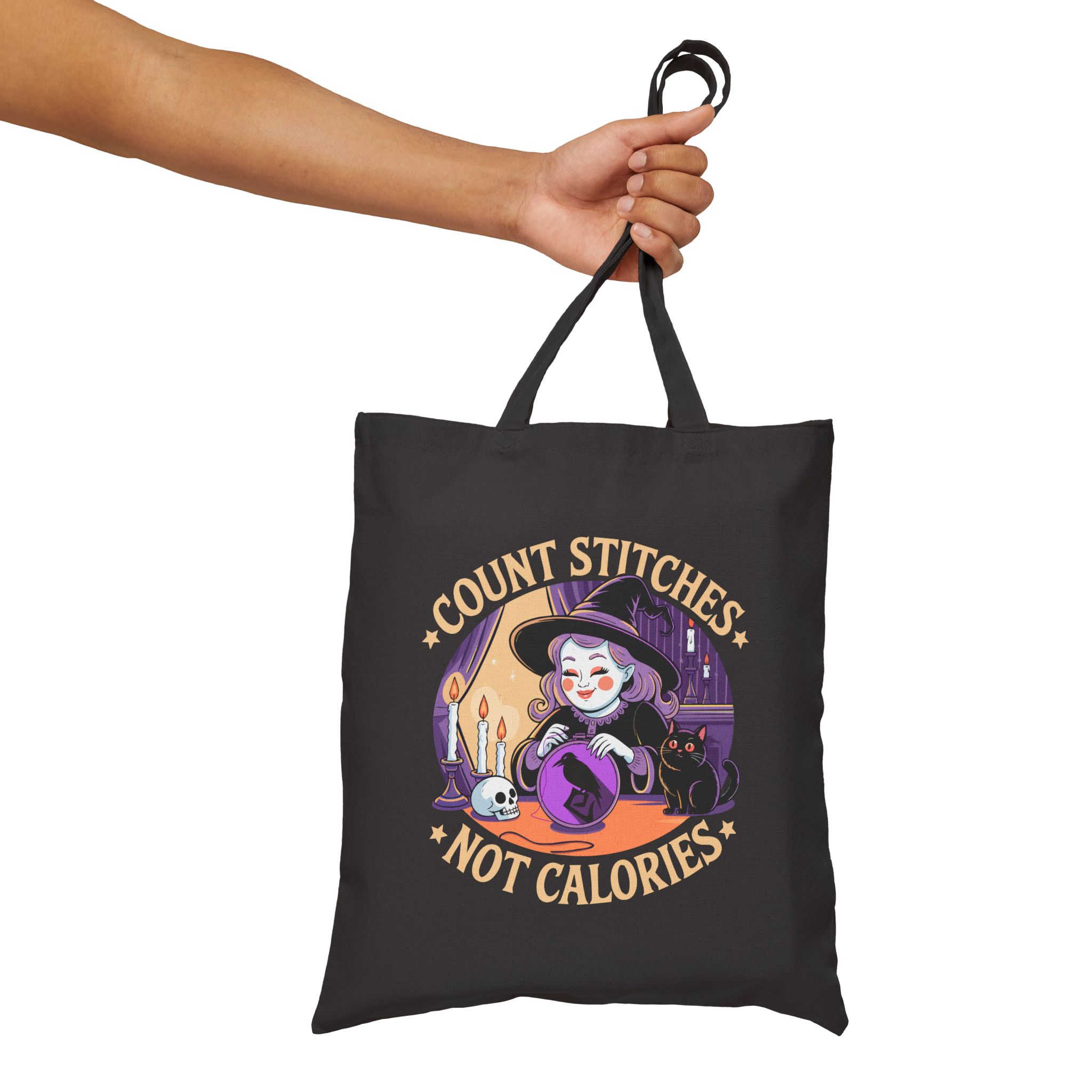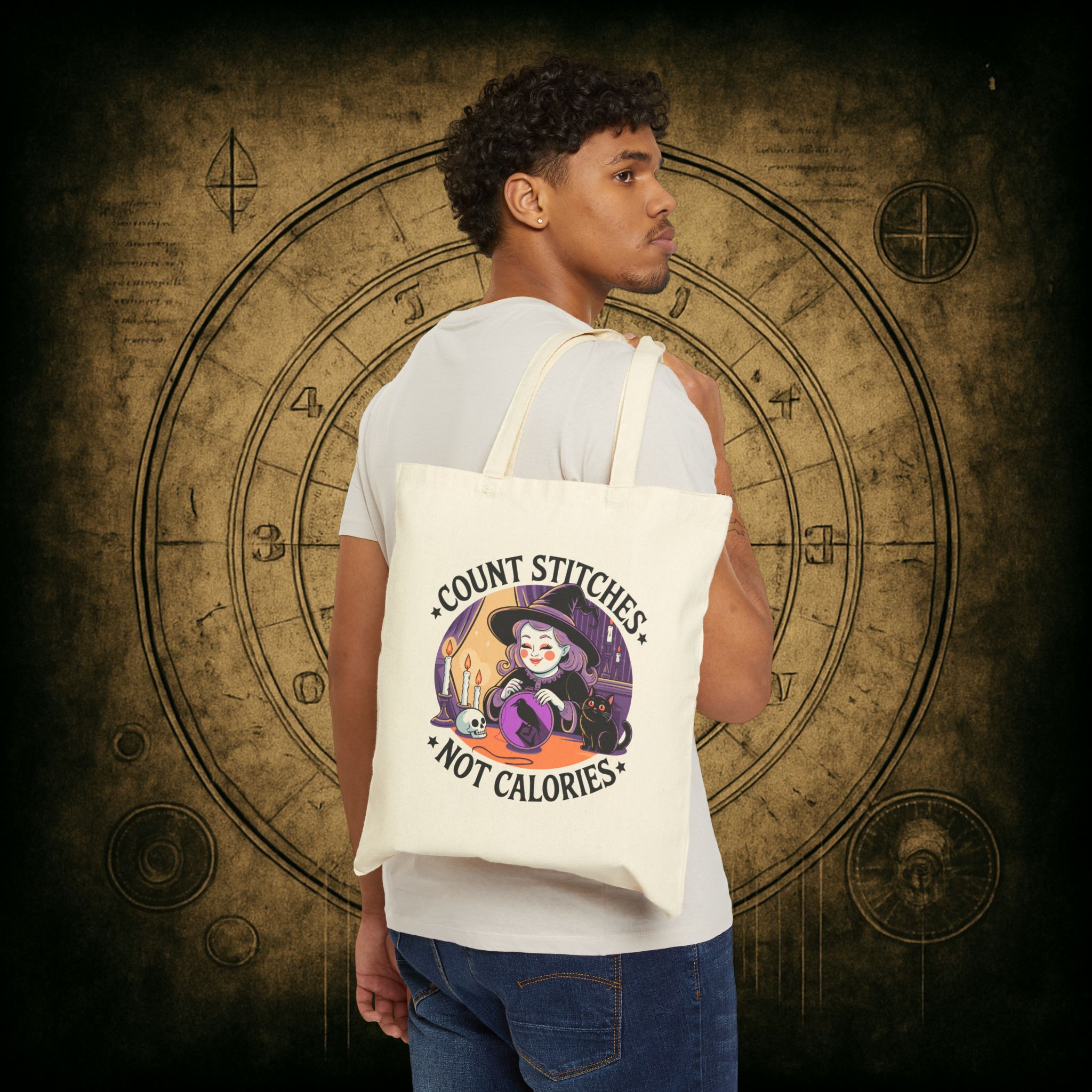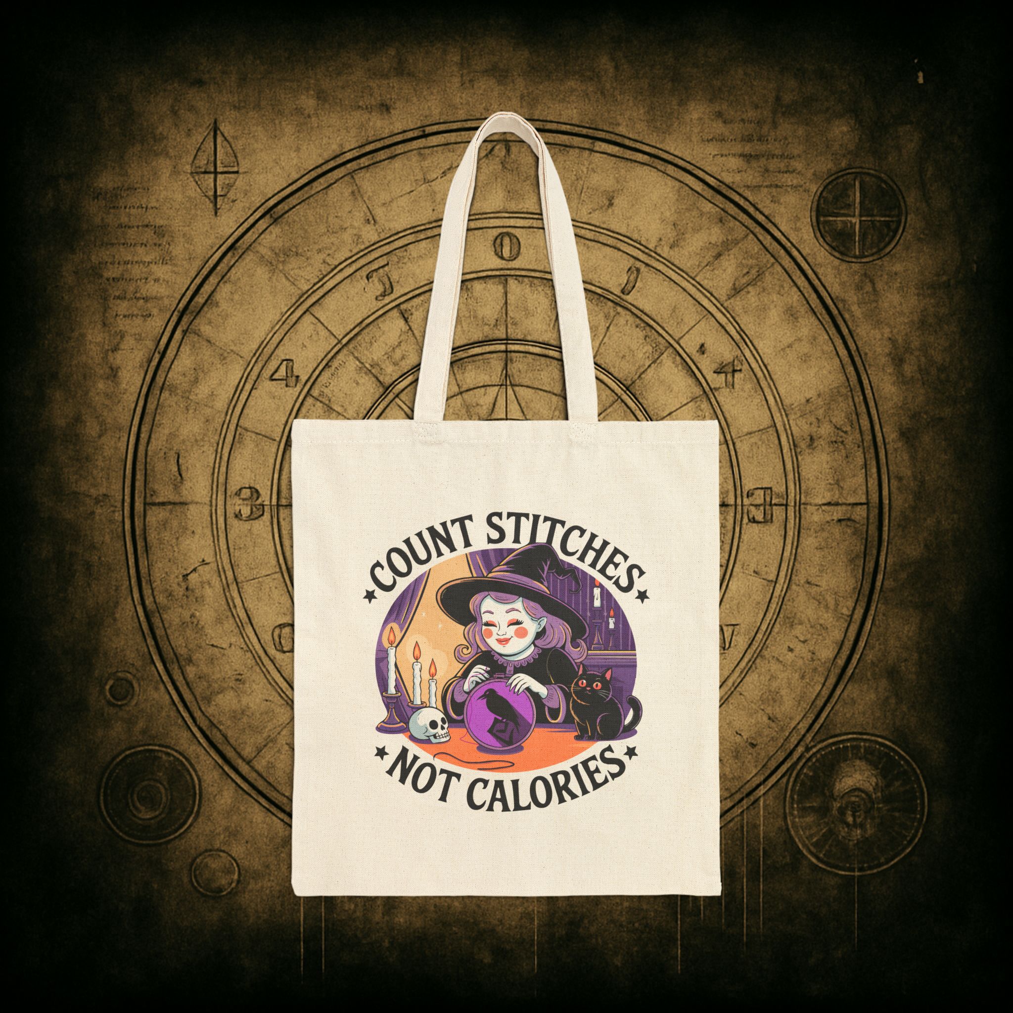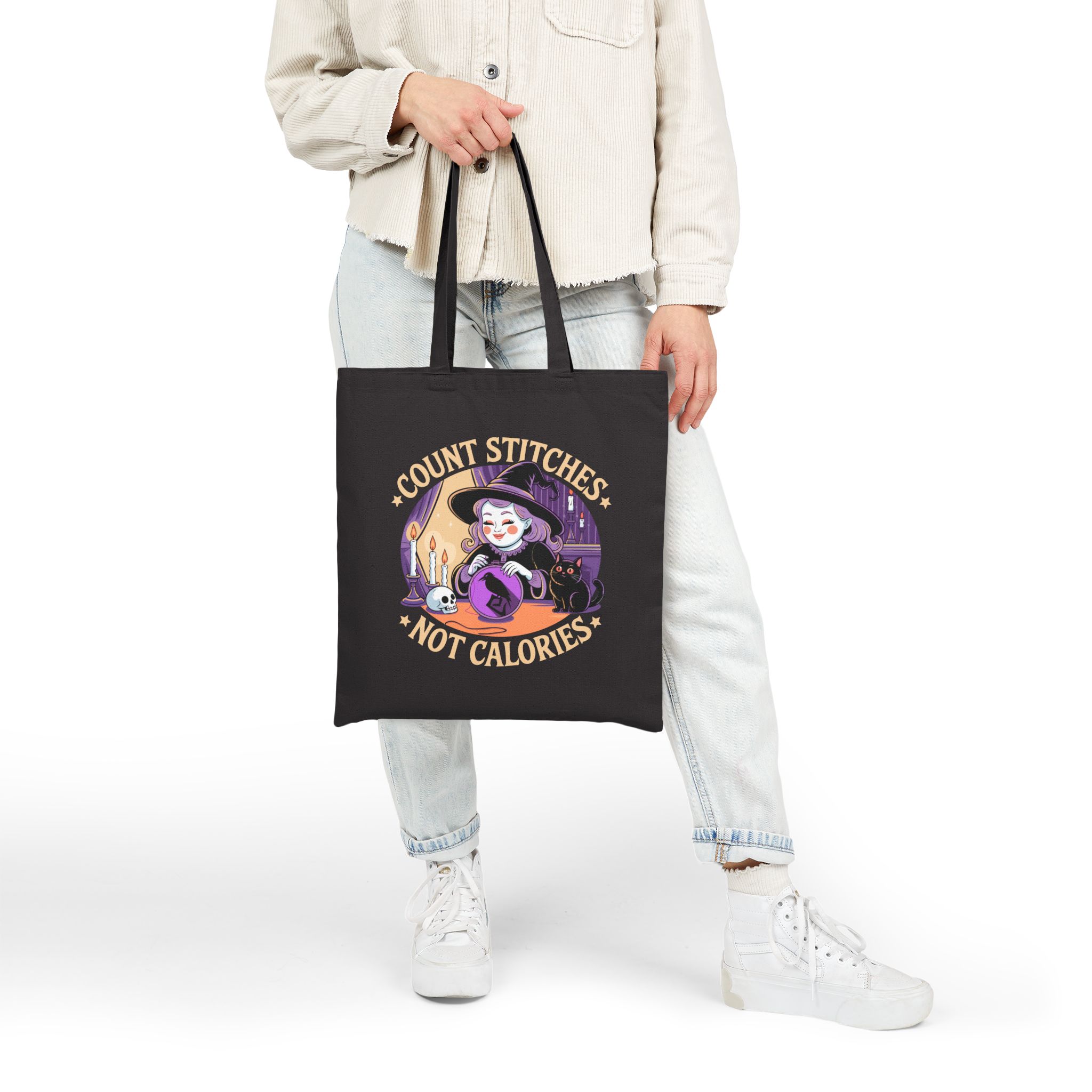 Drop the guilt and grab your hoop, the Count Stitches Not Calories Tote Bag is your official coven-approved excuse to skip the scale and stitch your soul happy. Featuring a joyful witch, her loyal void-fur familiar, and a skull who probably just wants snacks, this tote is perfect for carrying your embroidery kits, moon cookies, and zero shame. Because life’s too short to count carbs when you could be counting cross stitches.