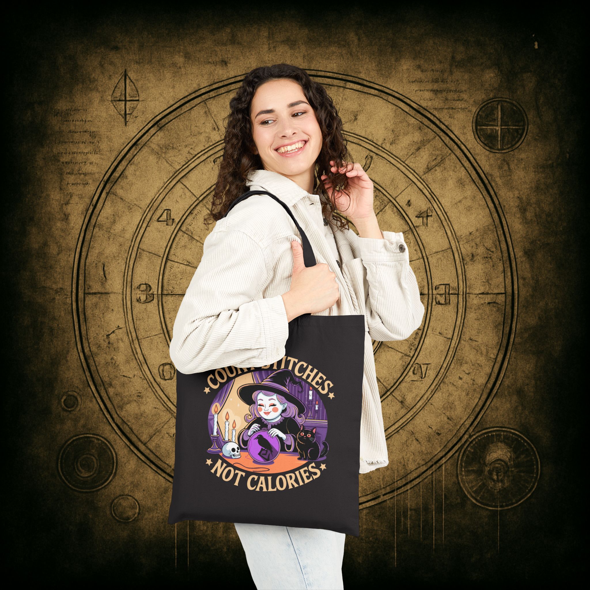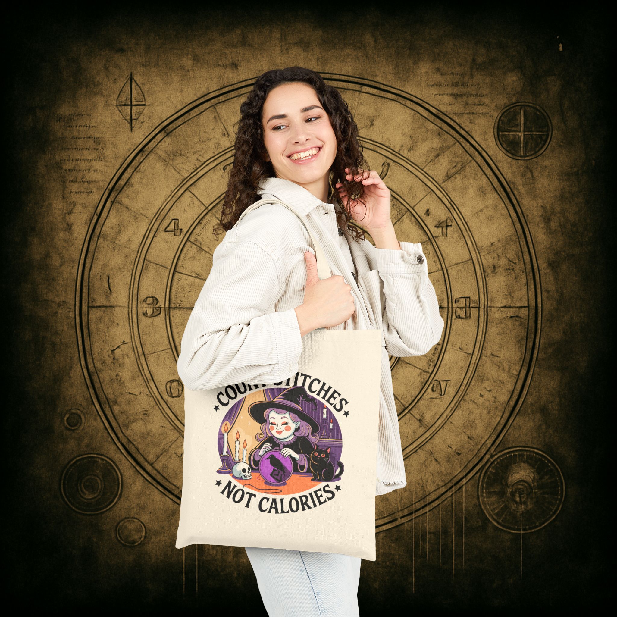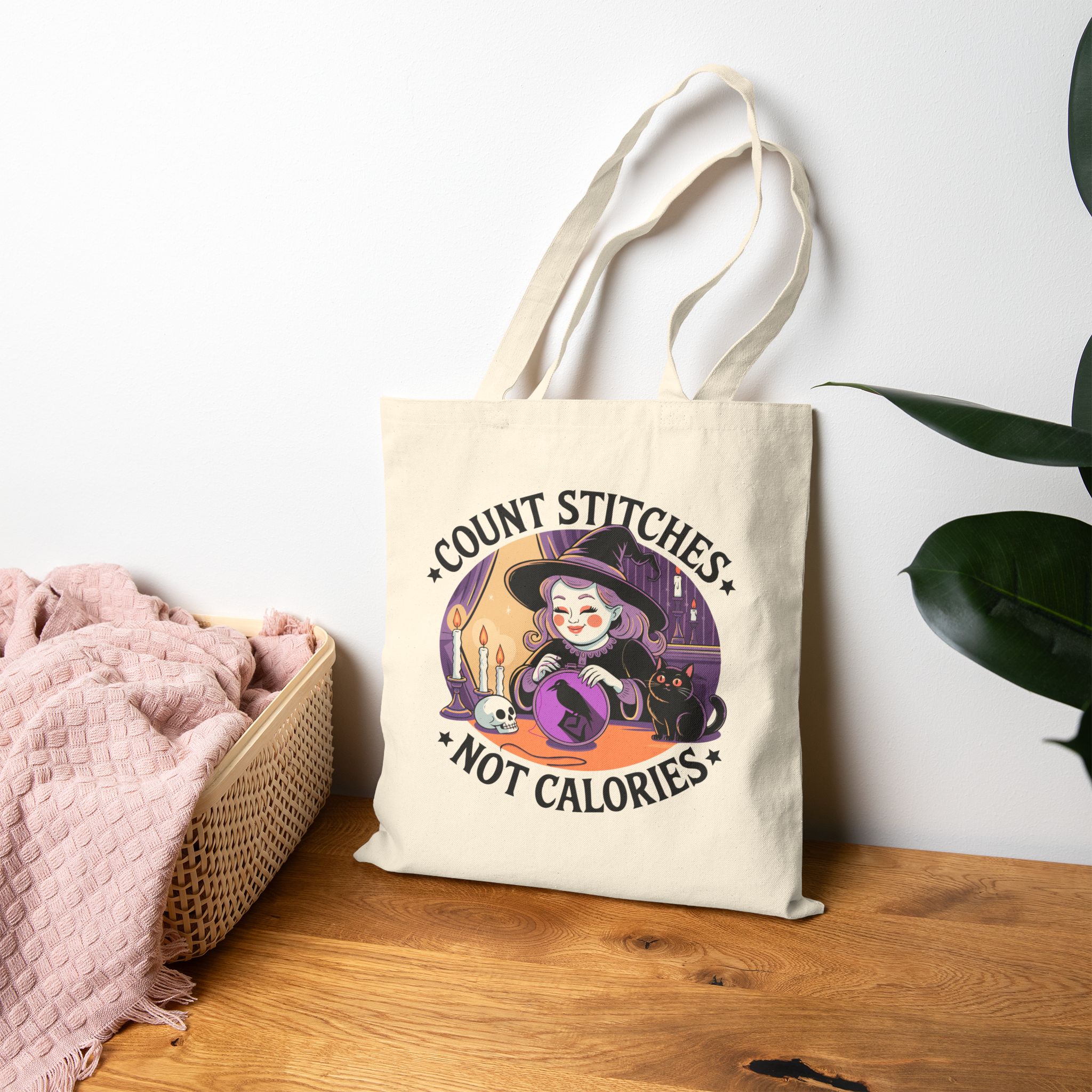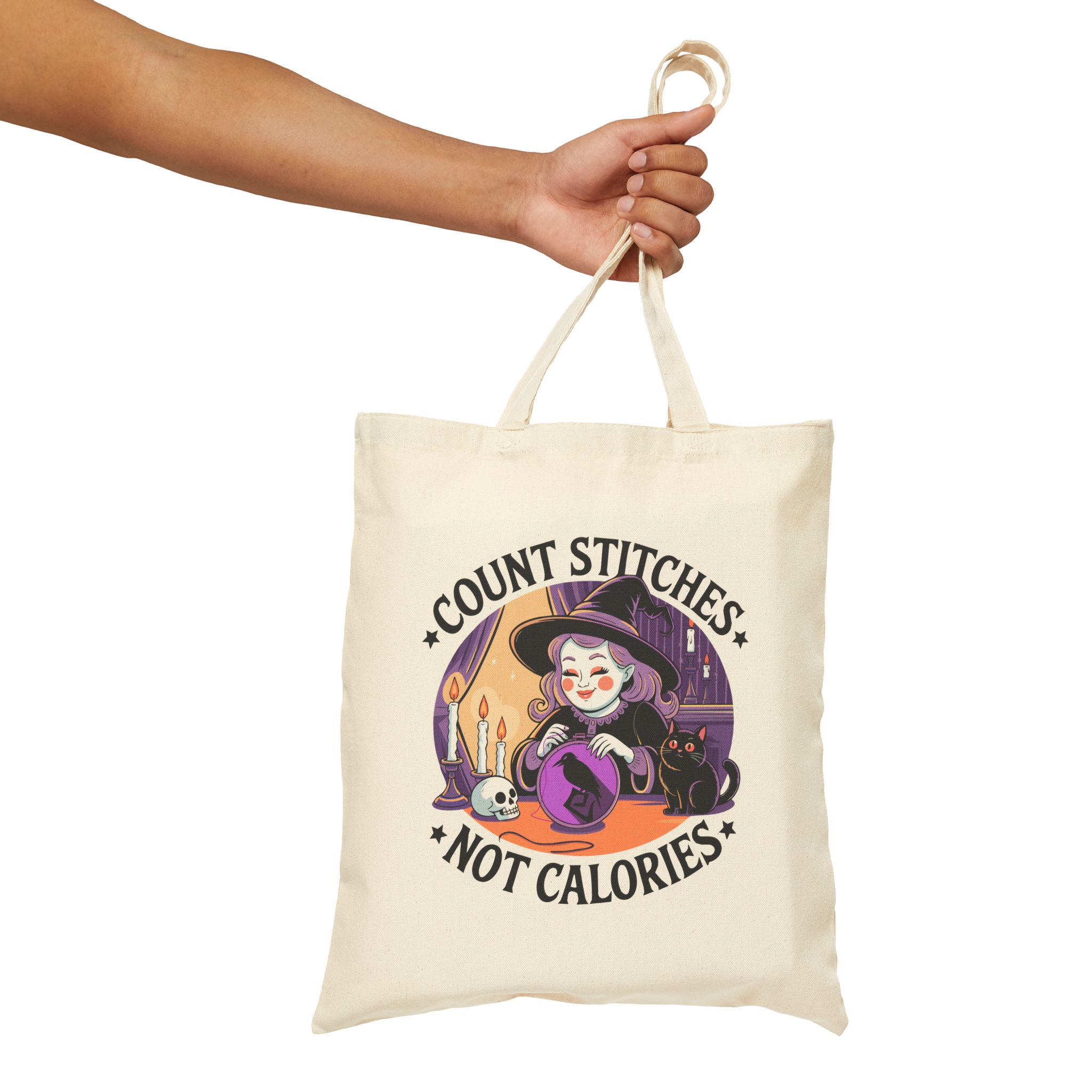 Drop the guilt and grab your hoop, the Count Stitches Not Calories Tote Bag is your official coven-approved excuse to skip the scale and stitch your soul happy. Featuring a joyful witch, her loyal void-fur familiar, and a skull who probably just wants snacks, this tote is perfect for carrying your embroidery kits, moon cookies, and zero shame. Because life’s too short to count carbs when you could be counting cross stitches.