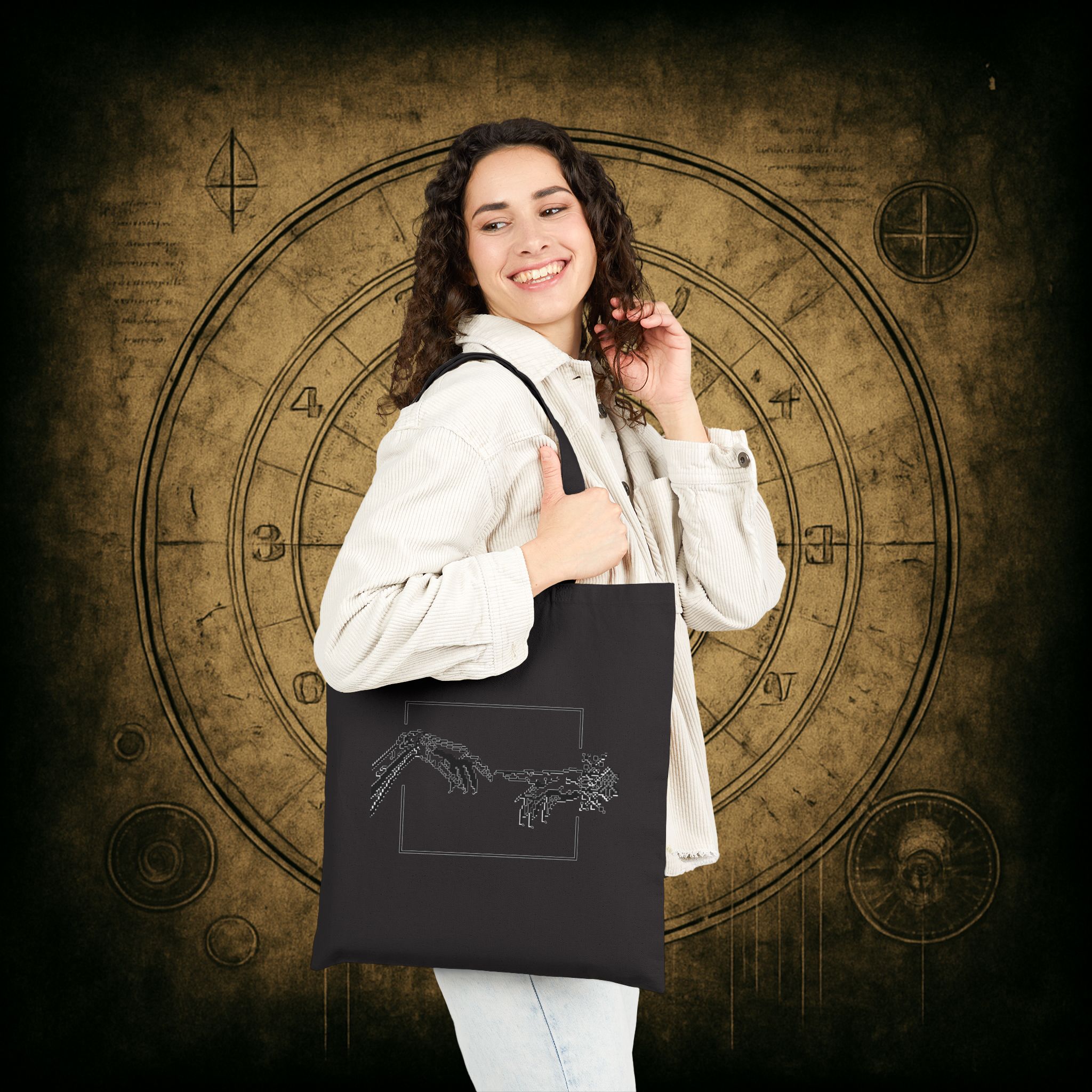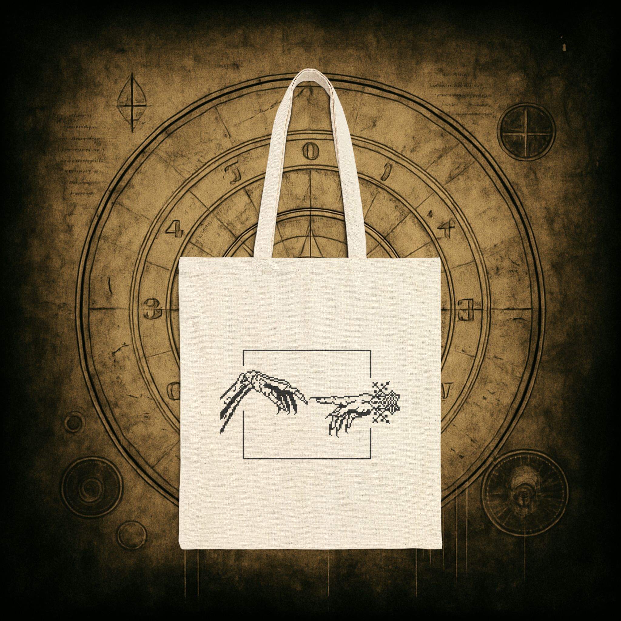 Step aside, Michelangelo, this is divine design, RavenCoven style. The Creation of Lilith Tote Bag reimagines the birth of rebellion in pixelated necro-glory. Two skeletal hands reach across the void, one dissolving into cursed stitches as if summoned from another realm entirely. It’s an ode to the first lady of defiance and the sacred art of making things with your bare (bony) hands. Ideal for carrying cross-stitch kits, spell ingredients, or the burden of your own unholy power.