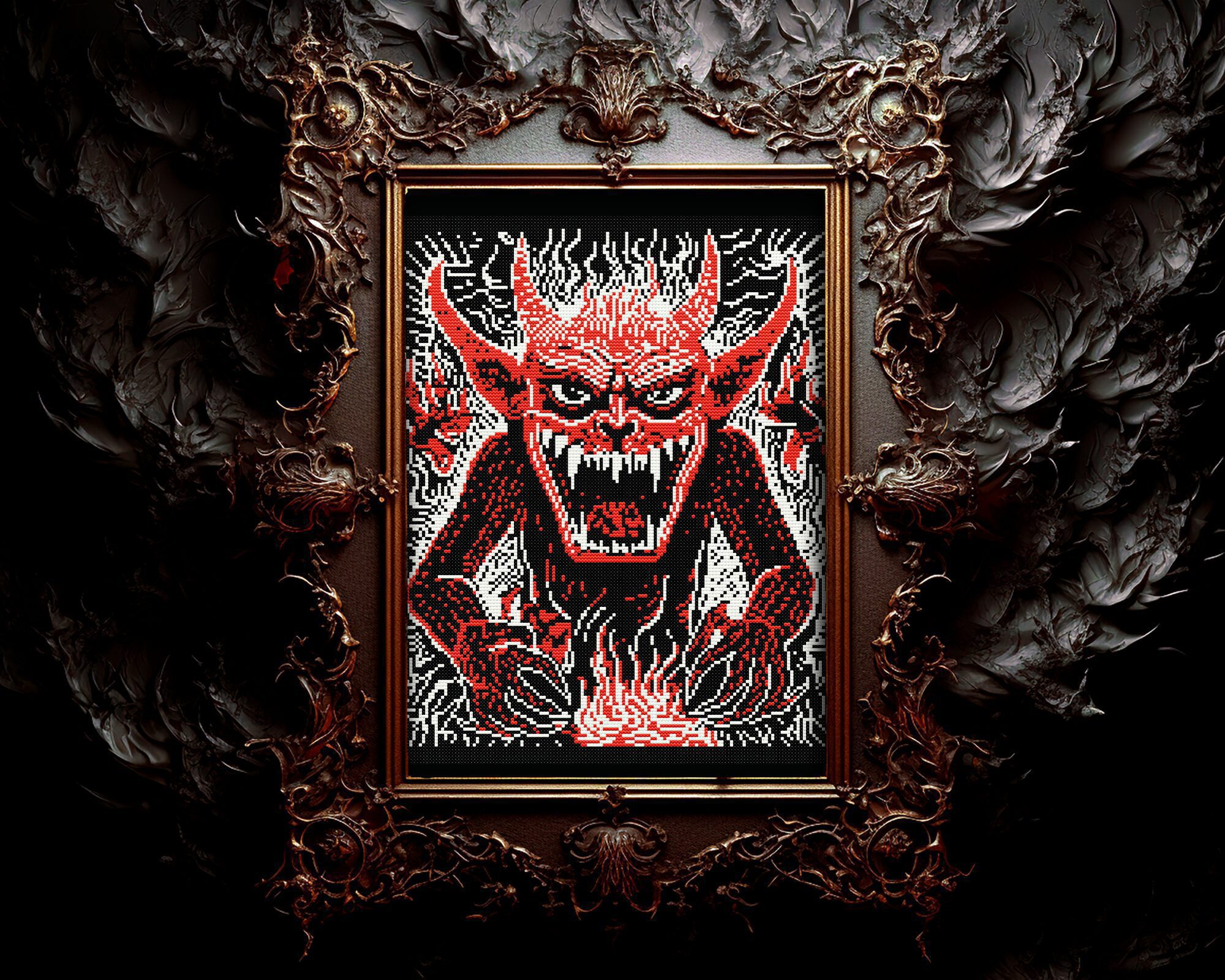 This Demon cross stitch comes alive under the light of the Halloween moon, promising a creepy cross stitch experience that dips into the realms of horror cross stitch. Its rich, dark cross stitch strokes echo with the sound of ancient incantations, making it an interesting addition to your occult cross stitch or Wiccan cross stitch collections.