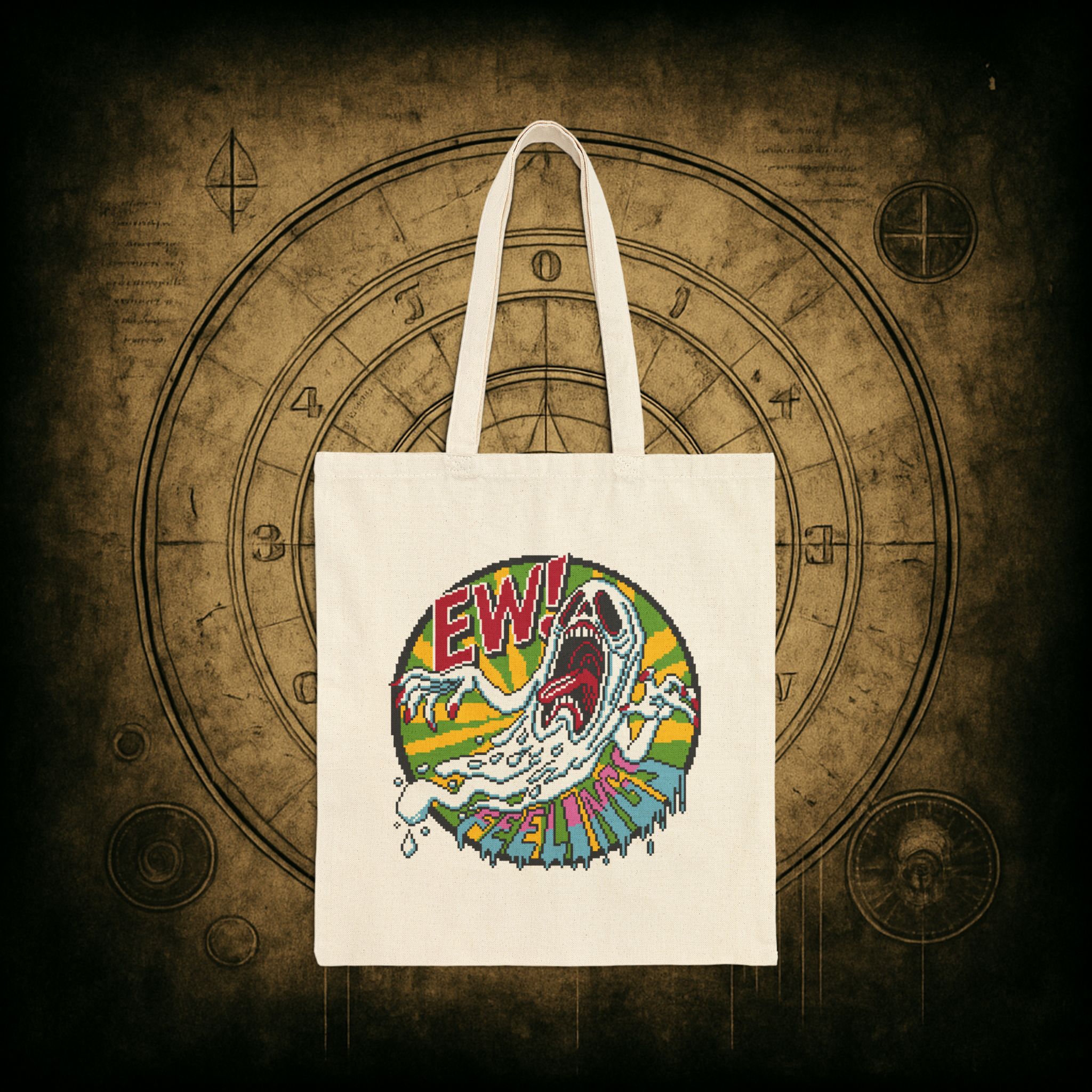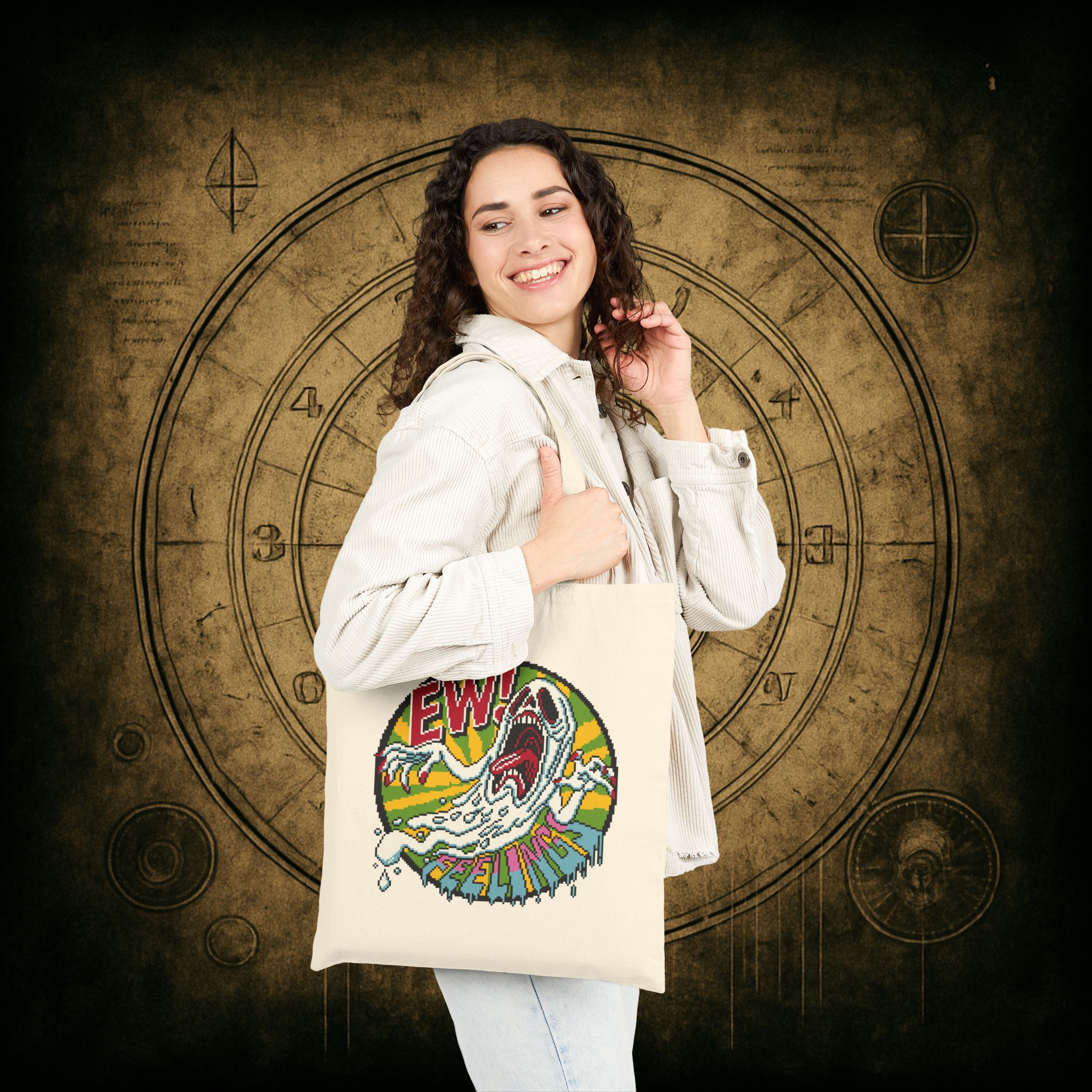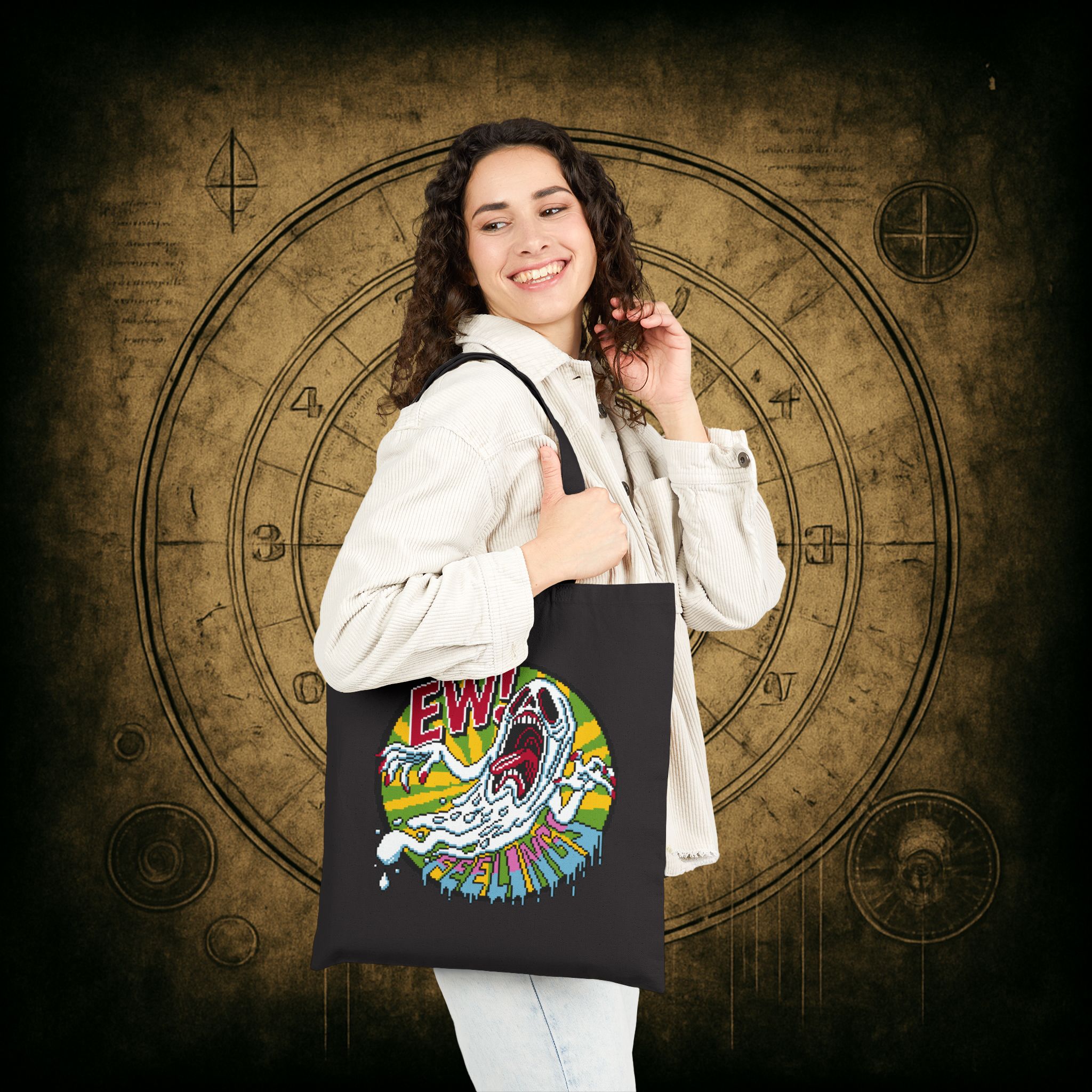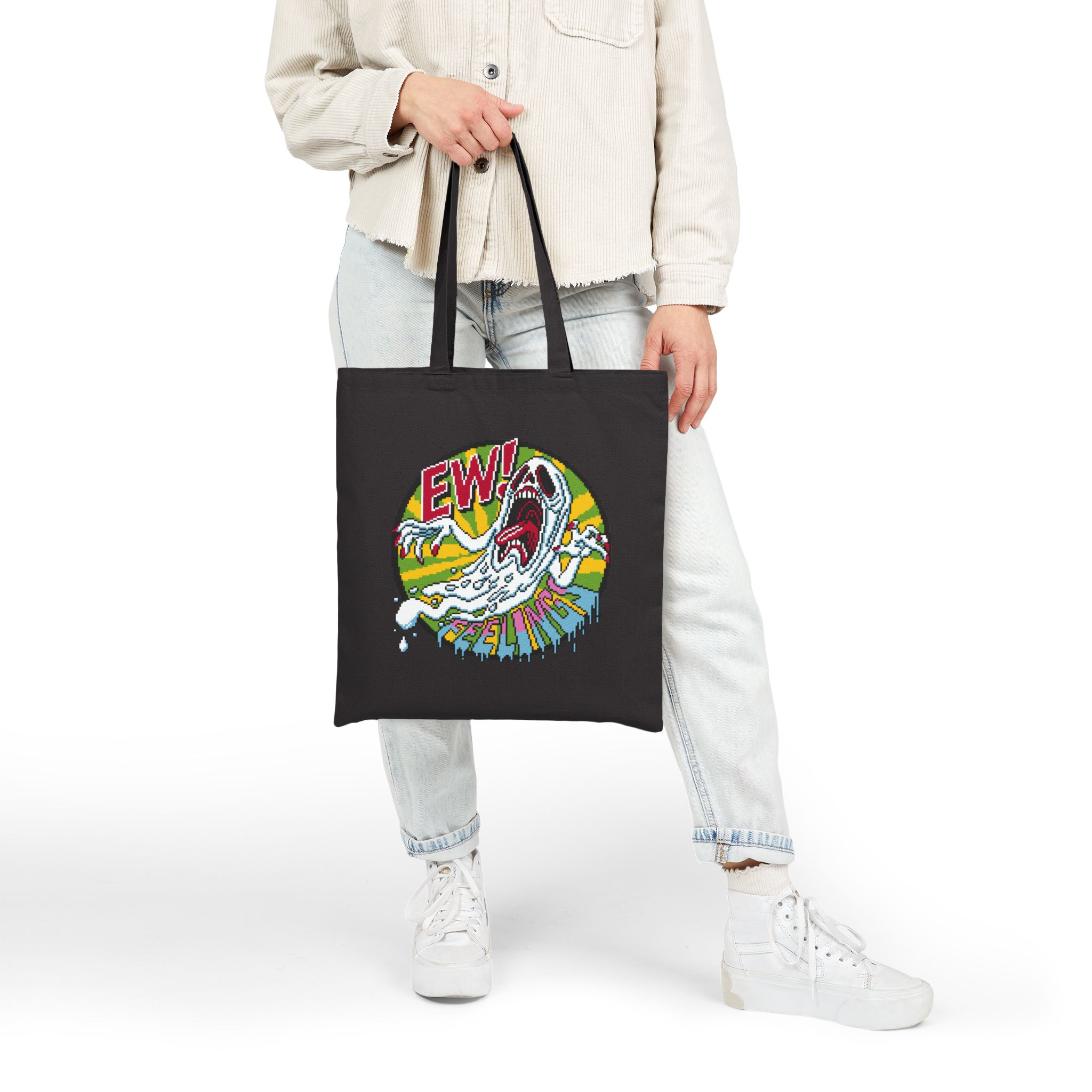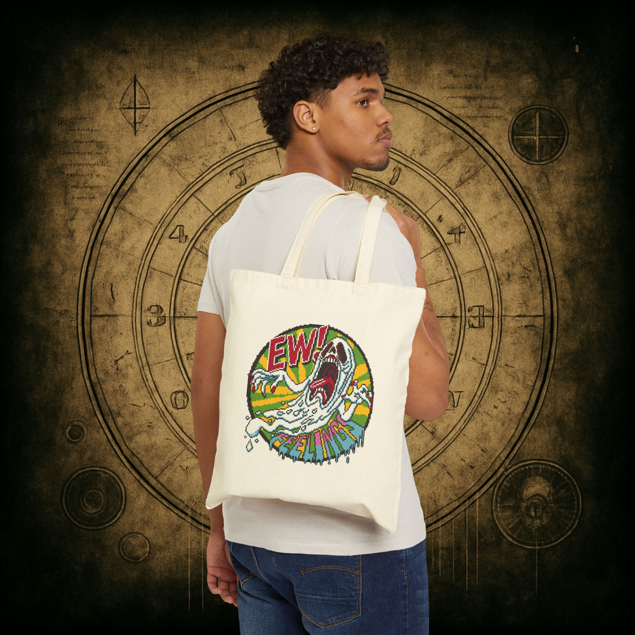 For those who flinch at emotional vulnerability but still need a cute vessel for snacks, books, and mild existential dread, behold the Ew! Feelings Tote Bag. Screaming ghosts and retro chaos make this bag the ultimate shield against unsolicited heart-to-hearts.