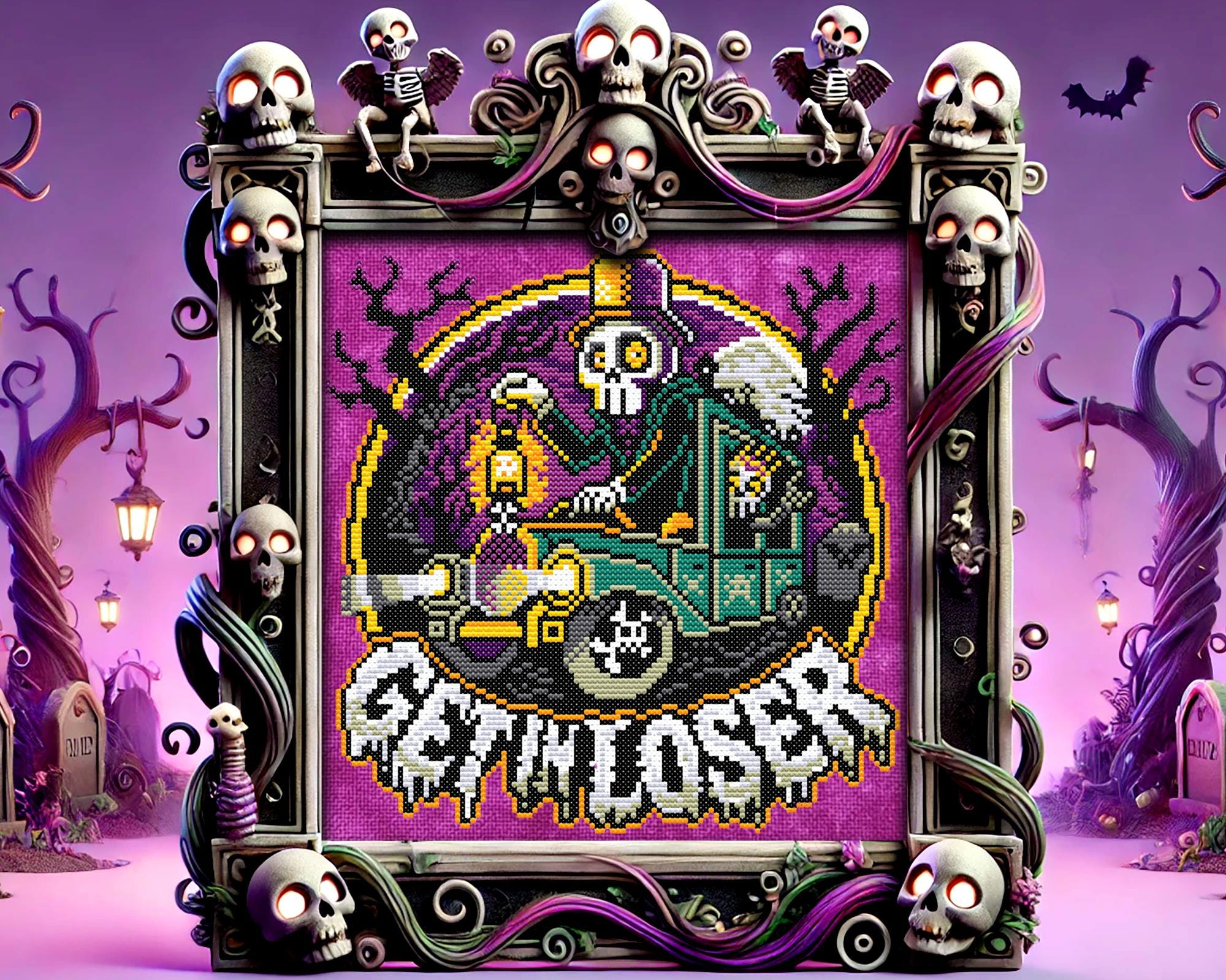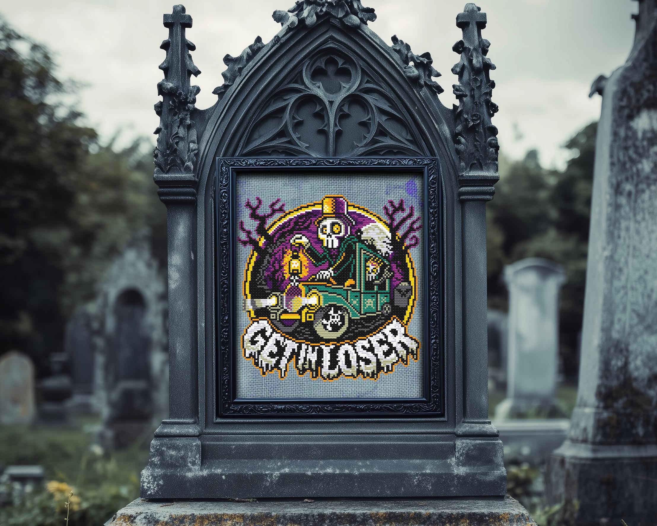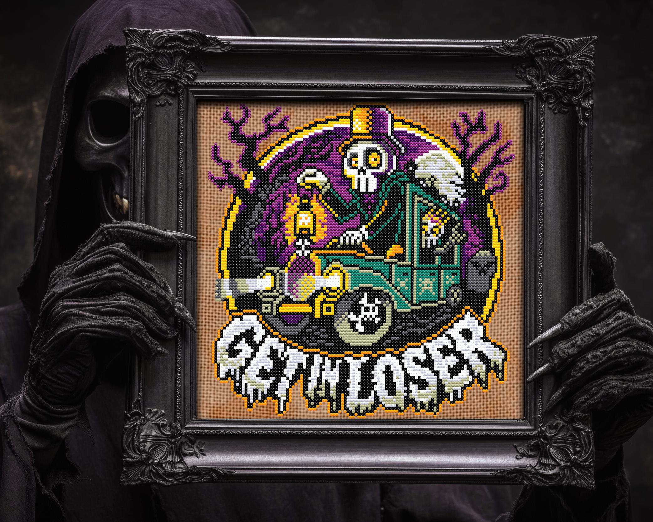 Picture this: a gothic cross stitch masterpiece featuring a snazzy skeleton chauffeur, decked out in a top hat, driving the sleek 1929 Cunningham V-8 hearse through a foggy, moonlit cemetery. With their skull flame lantern lighting the way and a lively skeleton queen popping out of her coffin in the backseat, shouting “Get in, loser!”, this design is the ultimate mix of creepy cross stitch and funny cross stitch vibes.