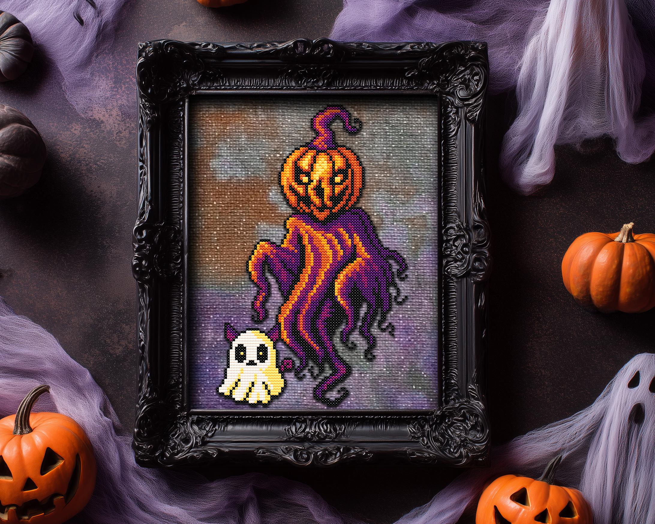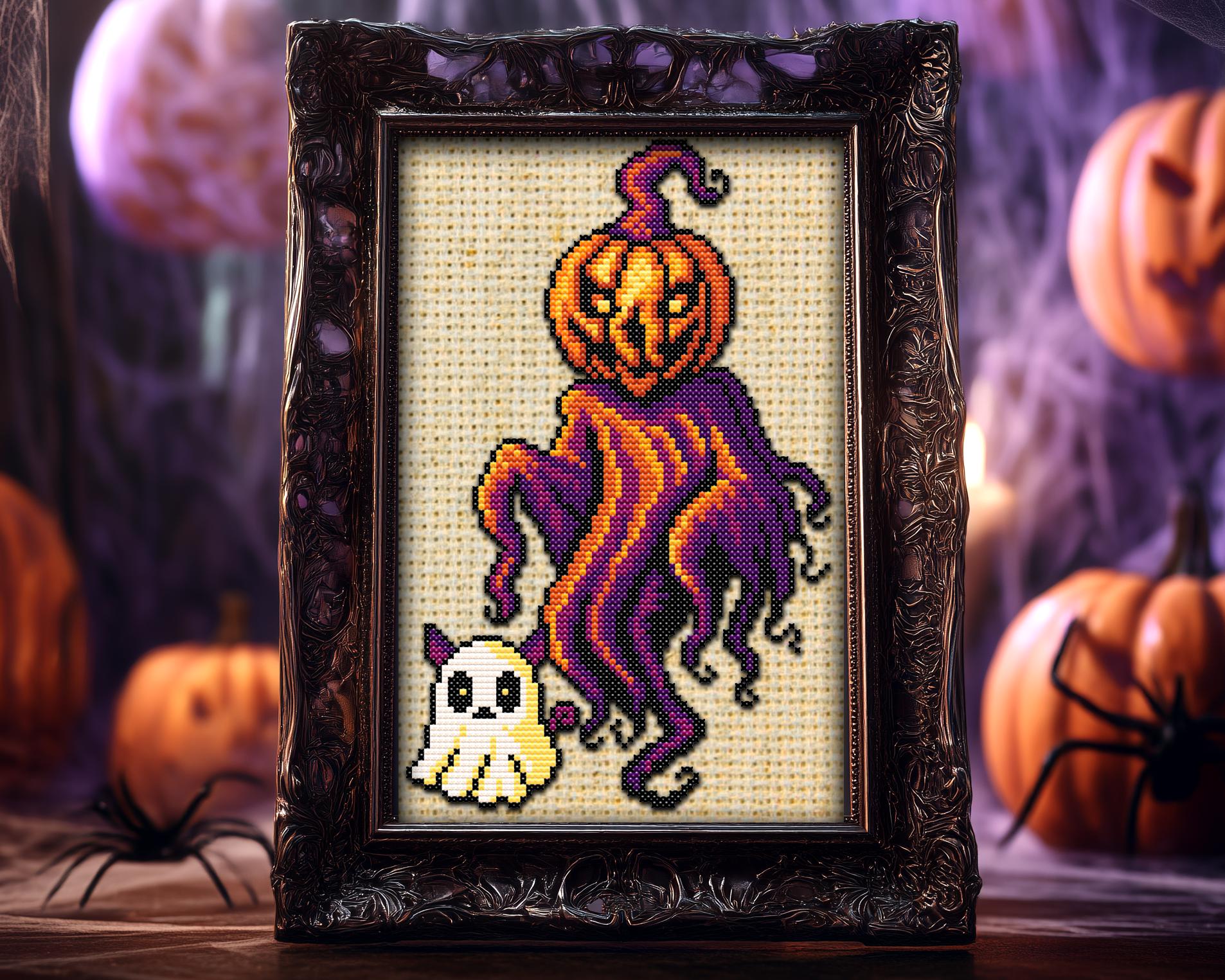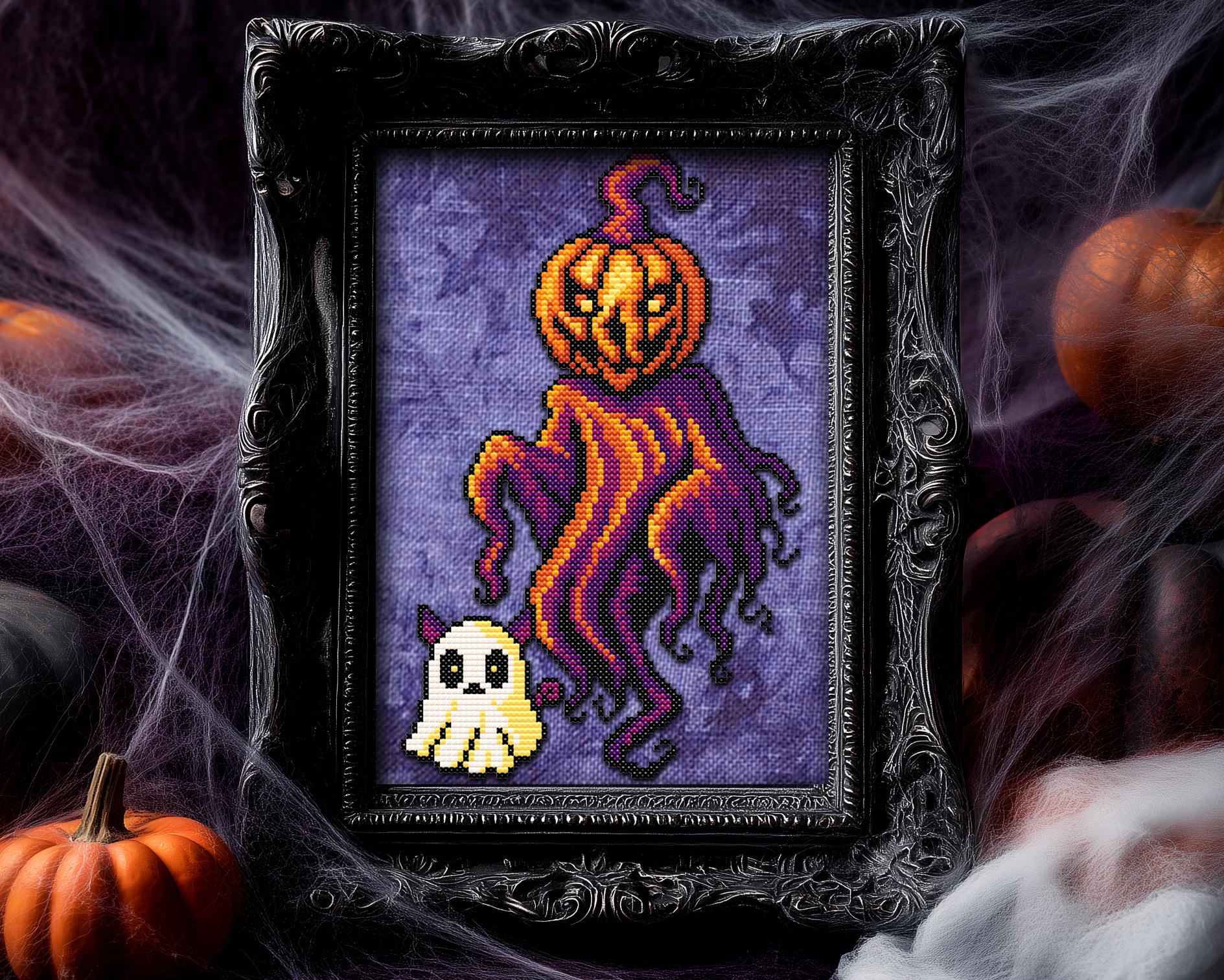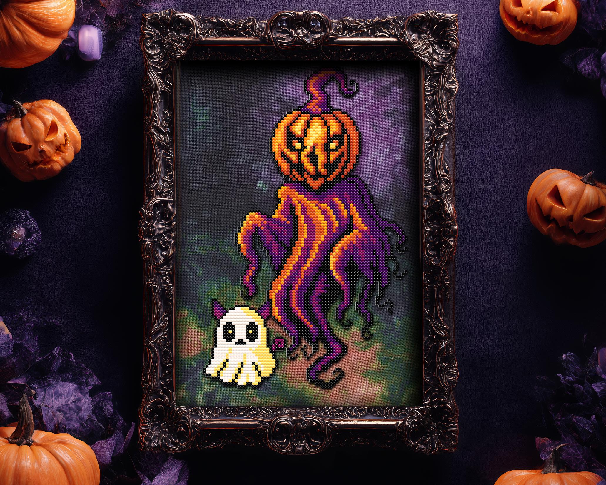 From the moldy depths of a cursed pumpkin patch rises… Ghourd cross stitch pattern! A wretchedly whimsical fusion of ghost and gourd, this snarky spirit brings the full might of a jack-o-lantern hangover and a spooky cross stitch fever dream. Float-stomping straight outta the rotten soil, Ghourd is here to hex your hoops with a twisty little smirk and a tragic sense of style. Cloaked in dark cross stitch chaos and dripping with vibrant Halloween cross stitch drama, he’s dragging his adorable ghost cross stitch cat familiar along for the ride, though someone really should tell that cat its pointy ears are peeking through the sheet. This creepy cross stitch buddy system is 100% certified to haunt your craft room.