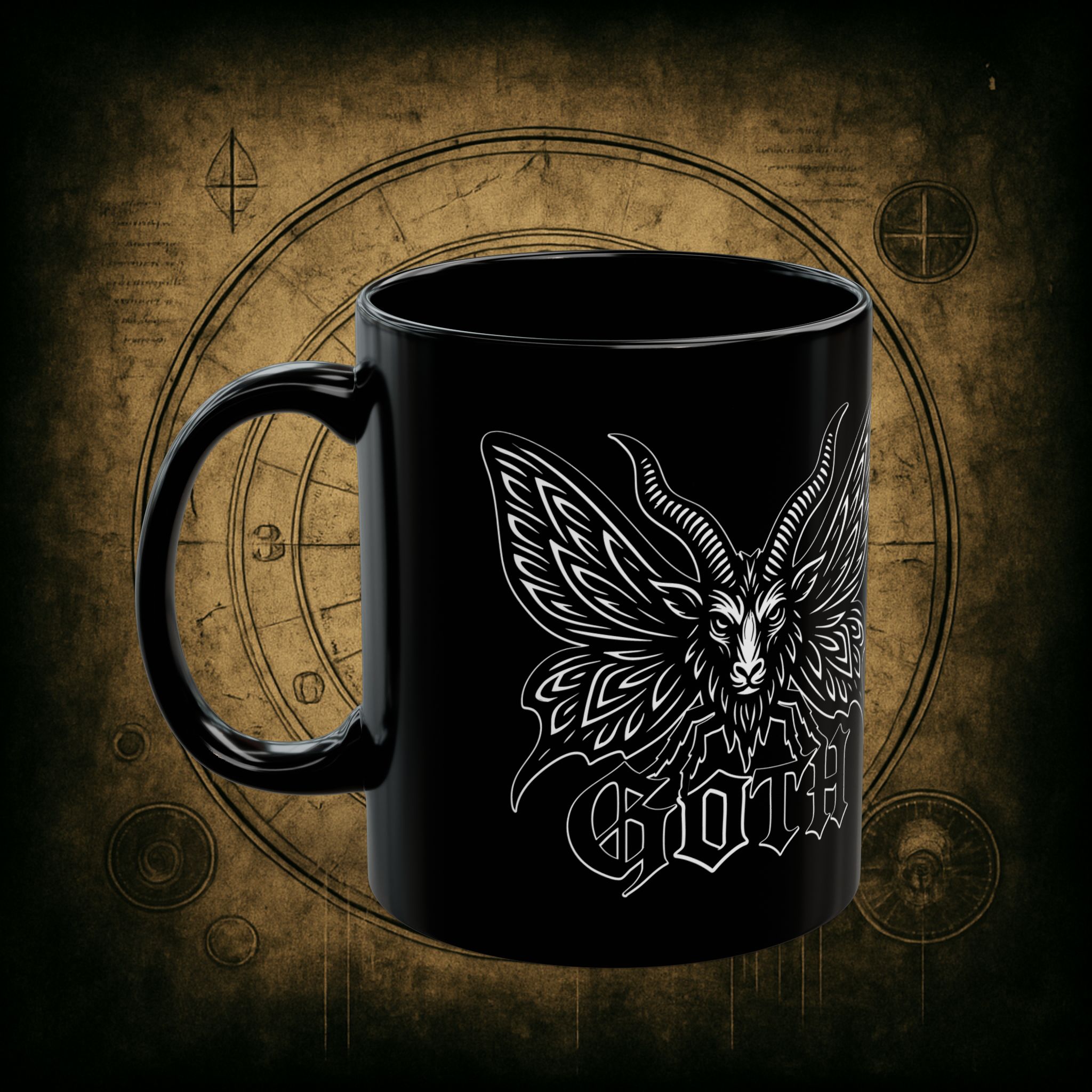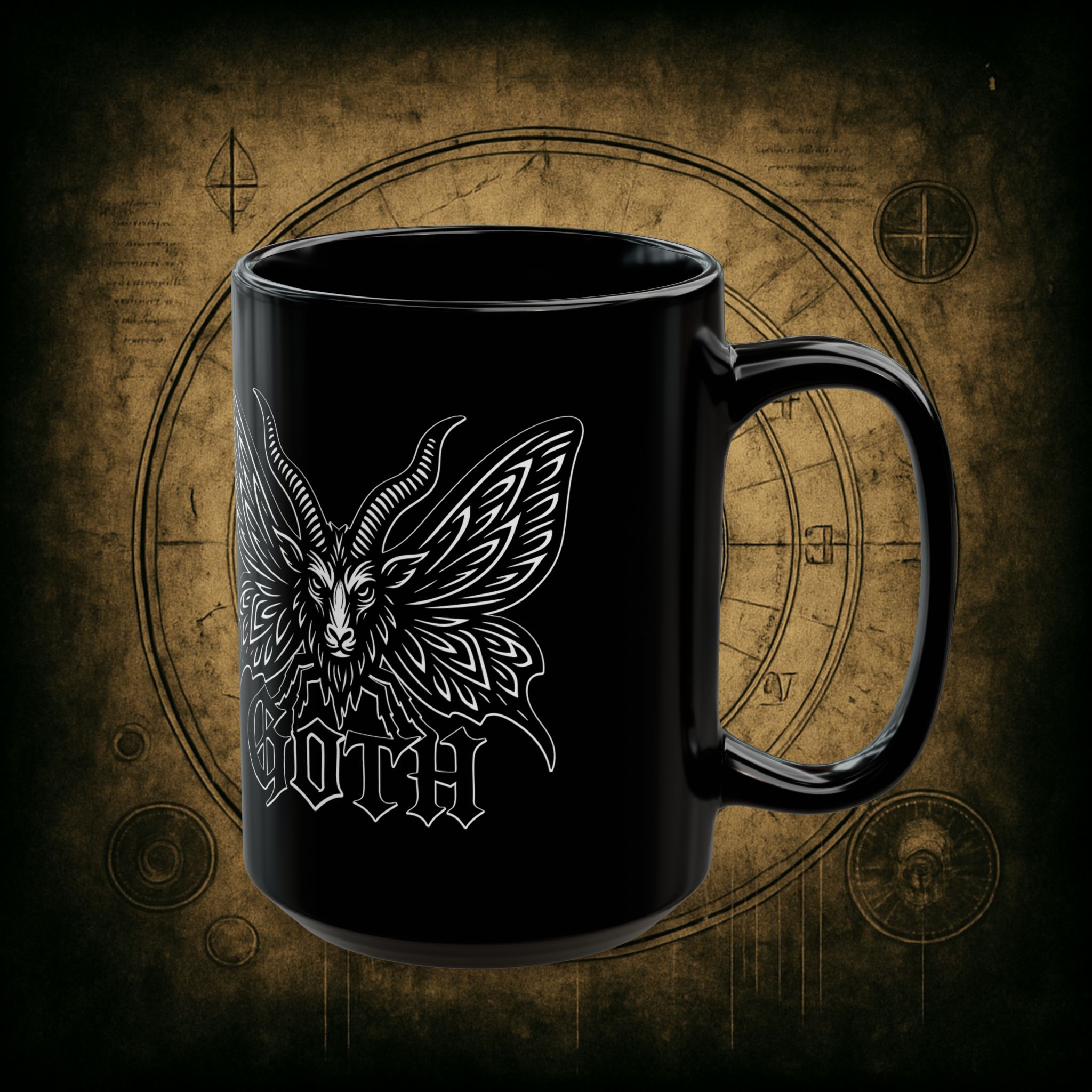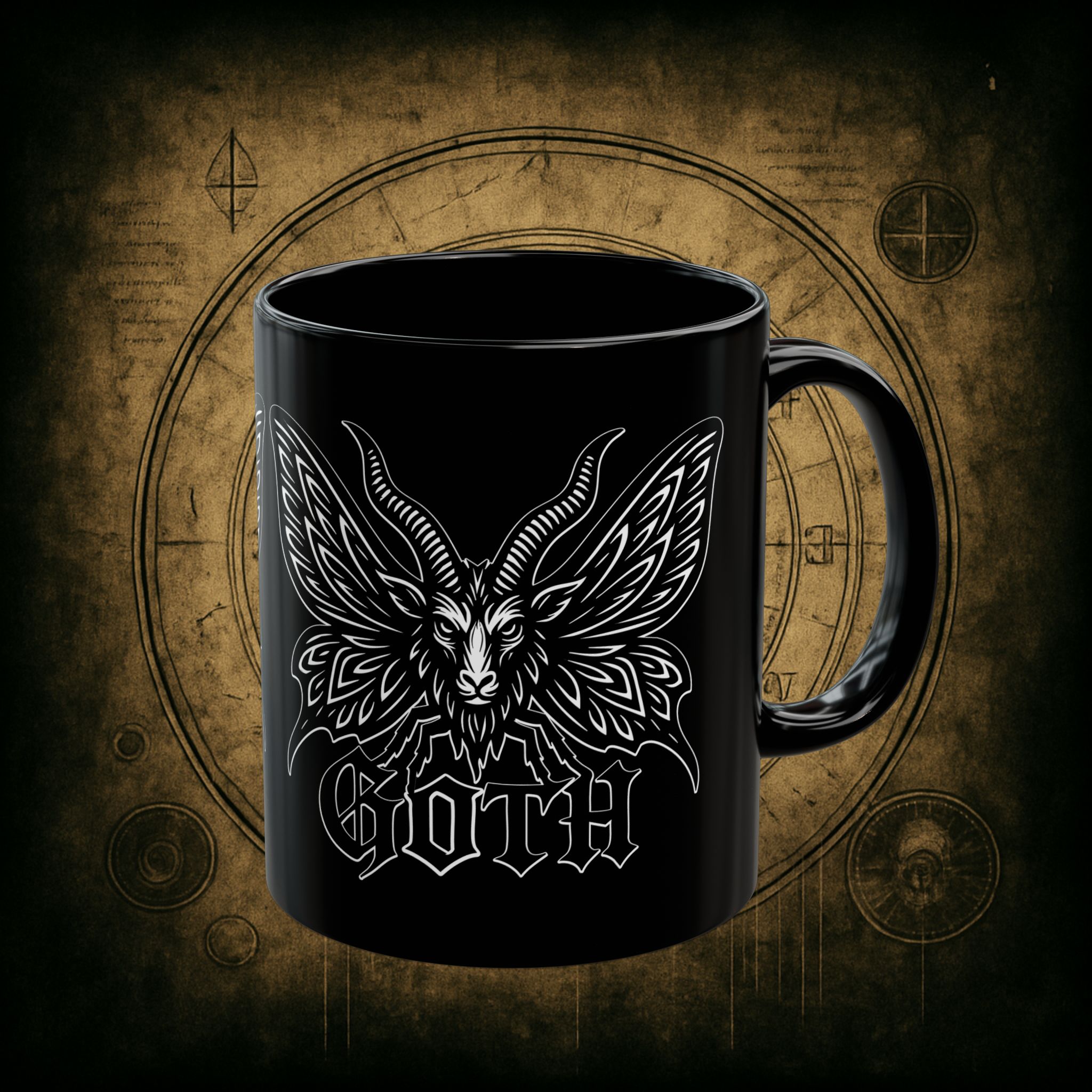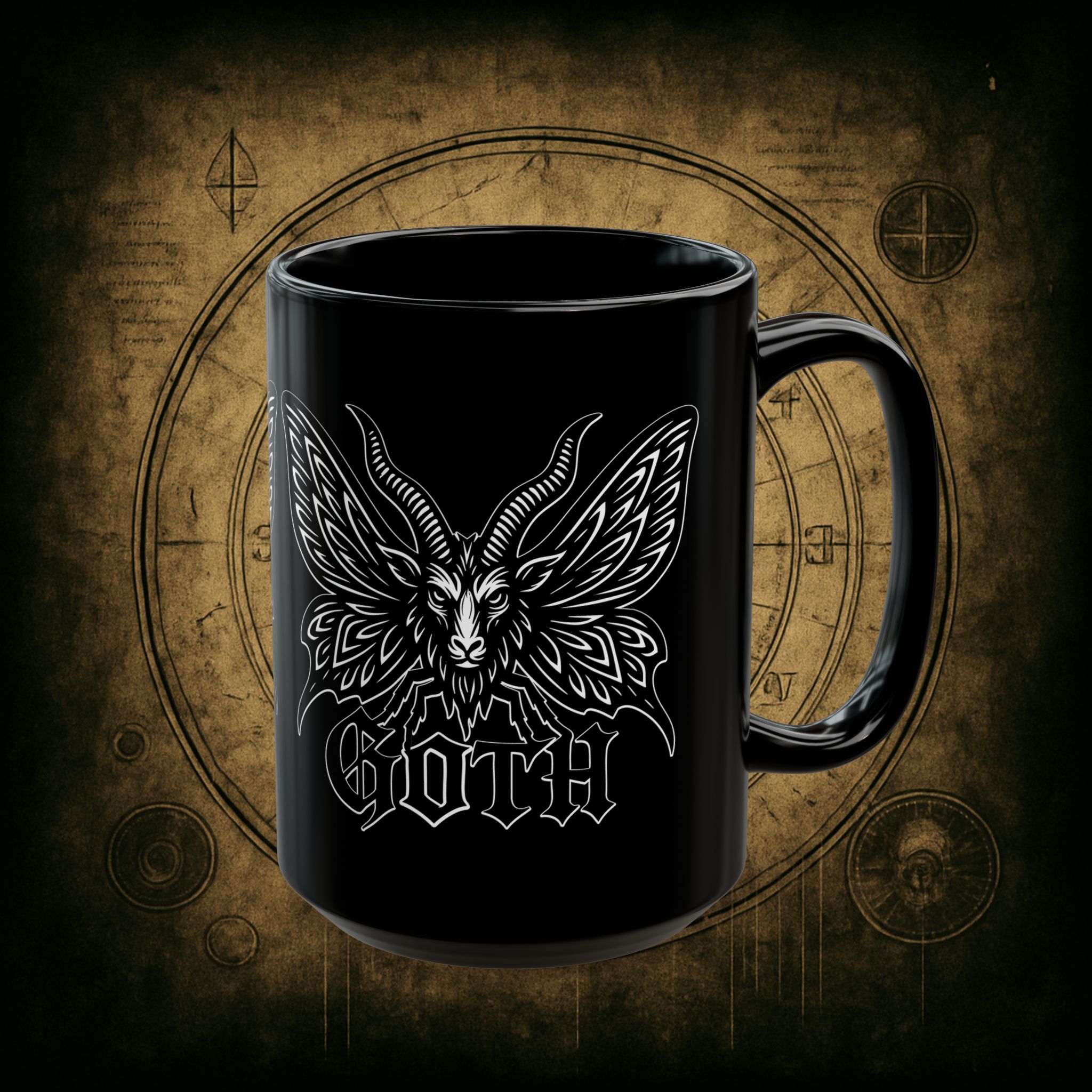 Summon your caffeine with the sigil of all things brooding and beautiful: a winged goat-moth hybrid that looks like it drinks black coffee and writes poetry about graveyards. 🦇🐐