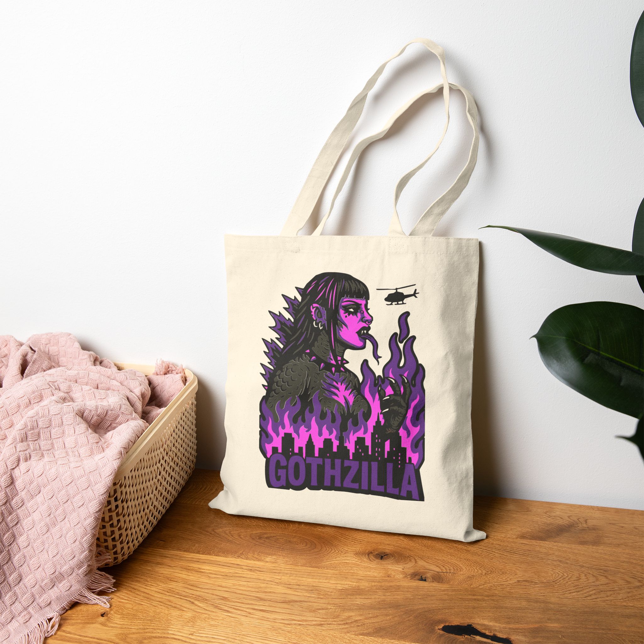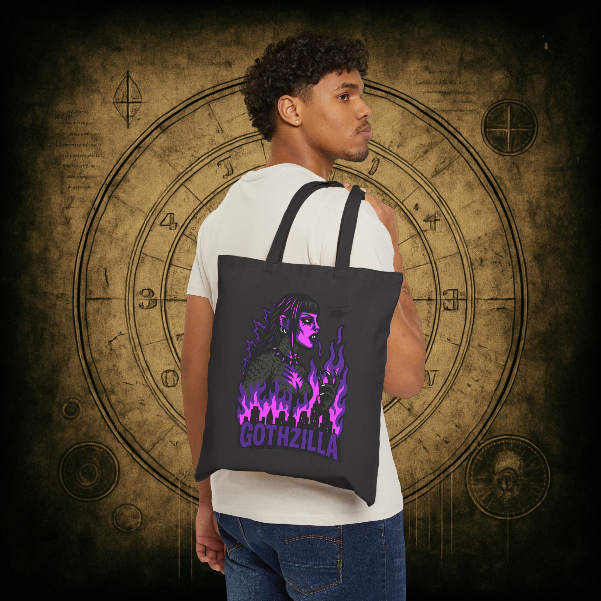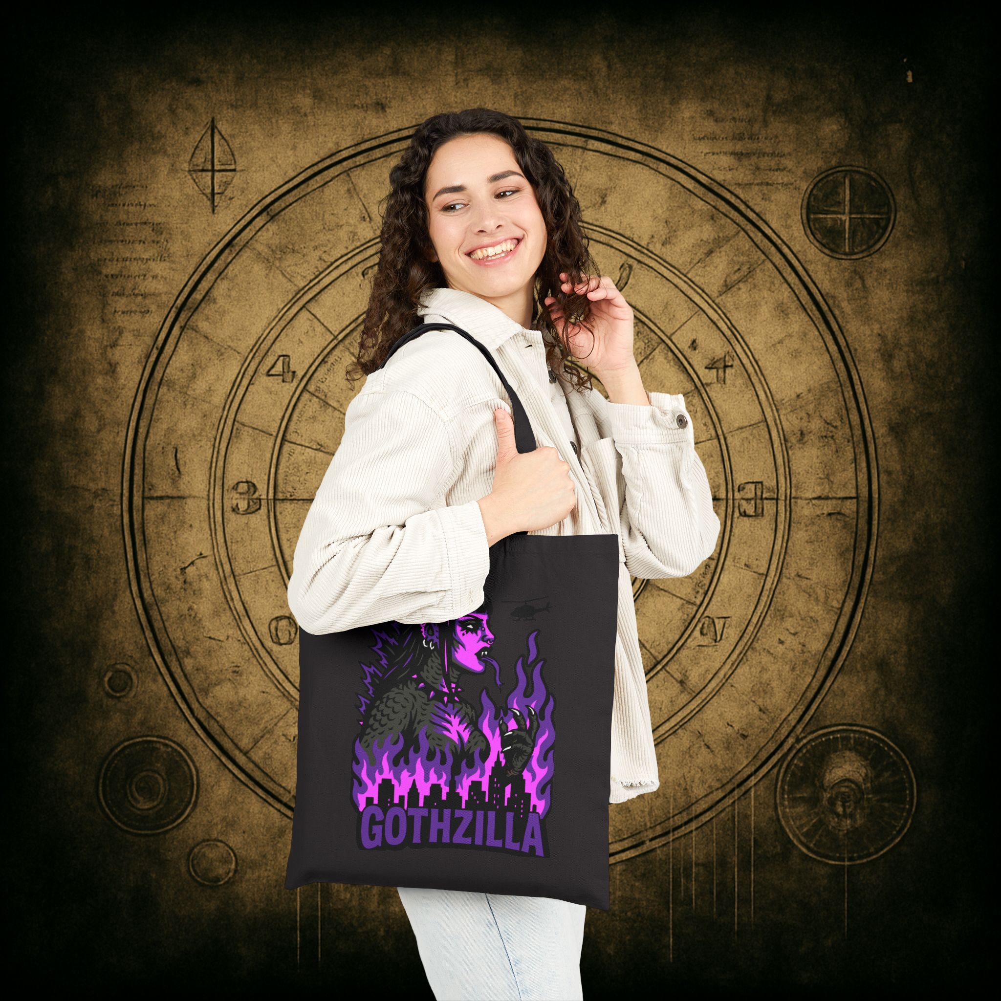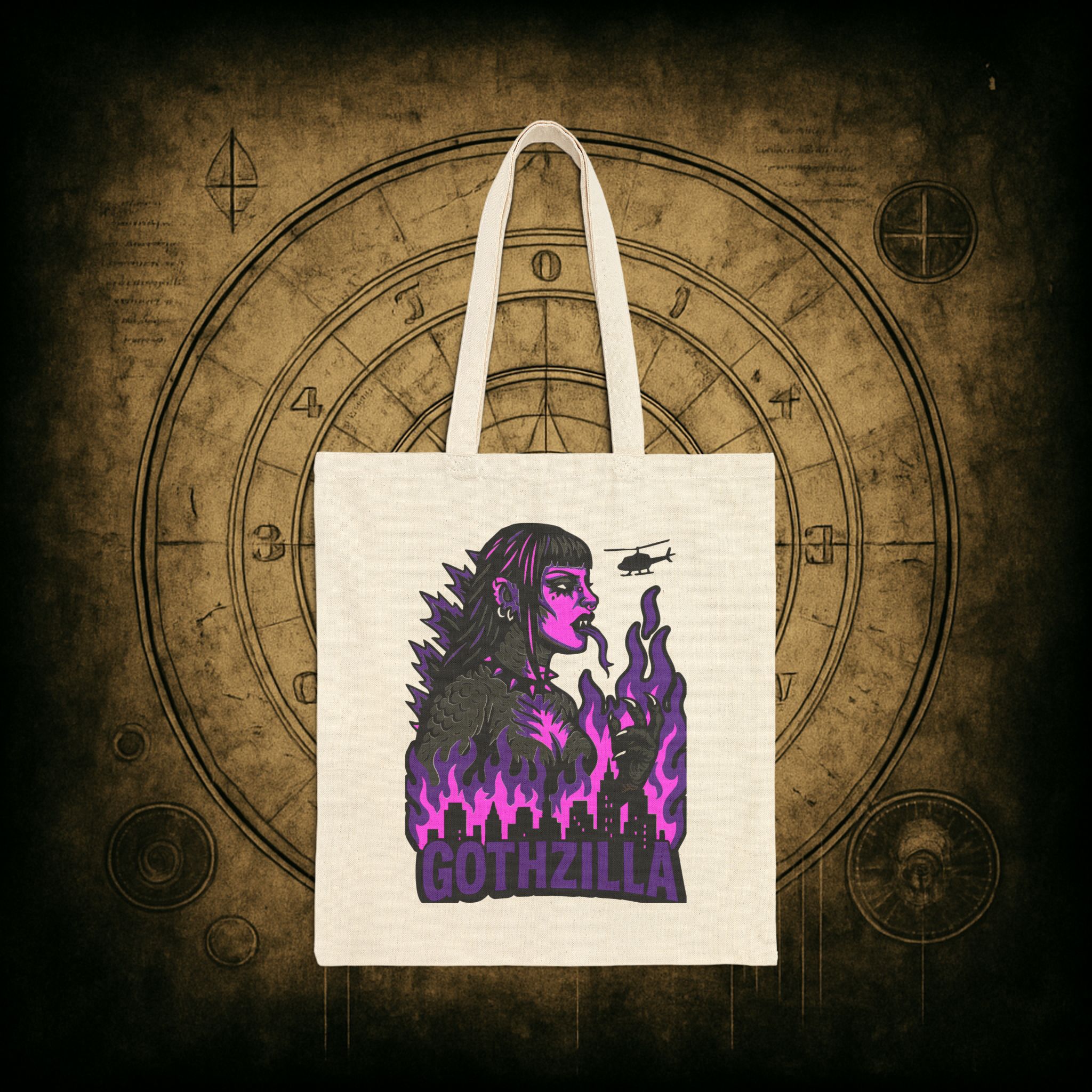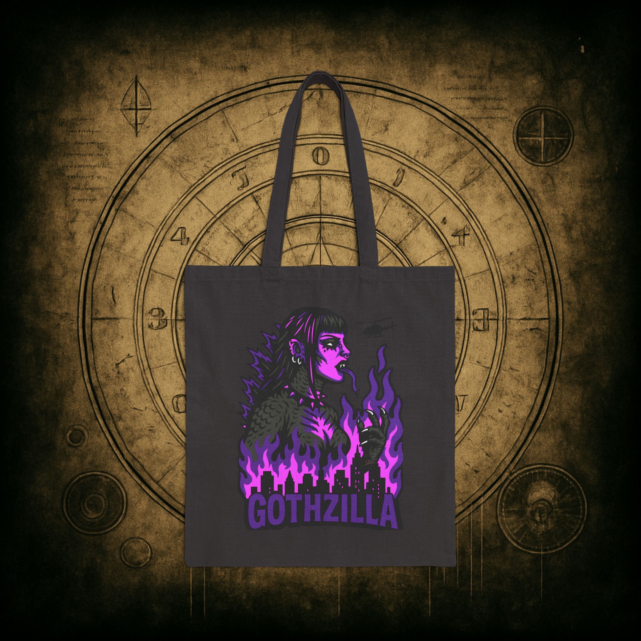 Meet your new favorite carry-all: Gothzilla, the fire-breathing queen of doom and gloom! With her razor-sharp eyeliner, industrial piercings, and a city-crushing attitude, this gothic kaiju icon is here to stomp all over mediocrity one haunted errand at a time. Encircled by violet infernos and a decimated skyline, she’s the monstrous mood we all aspire to be. 🦇💥
