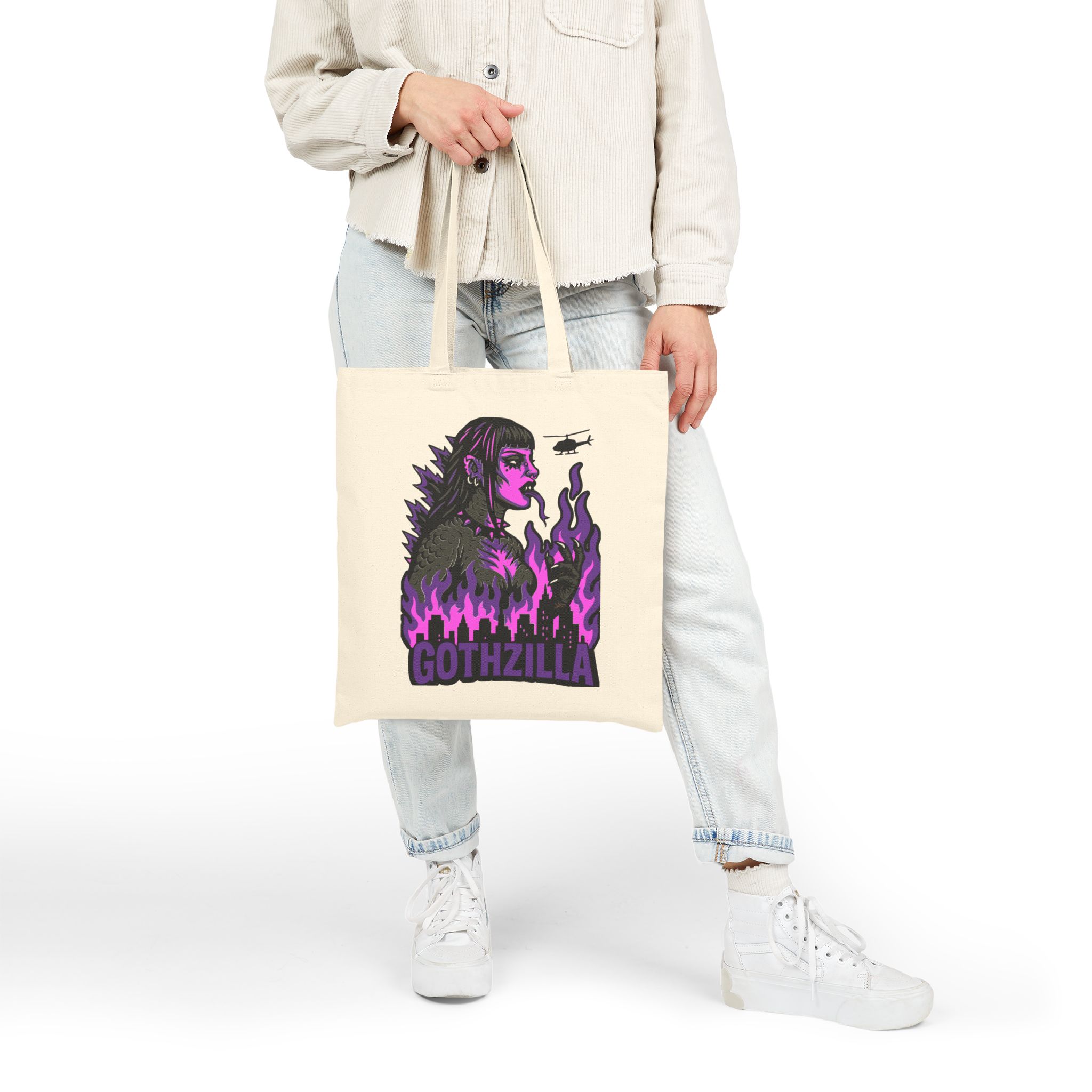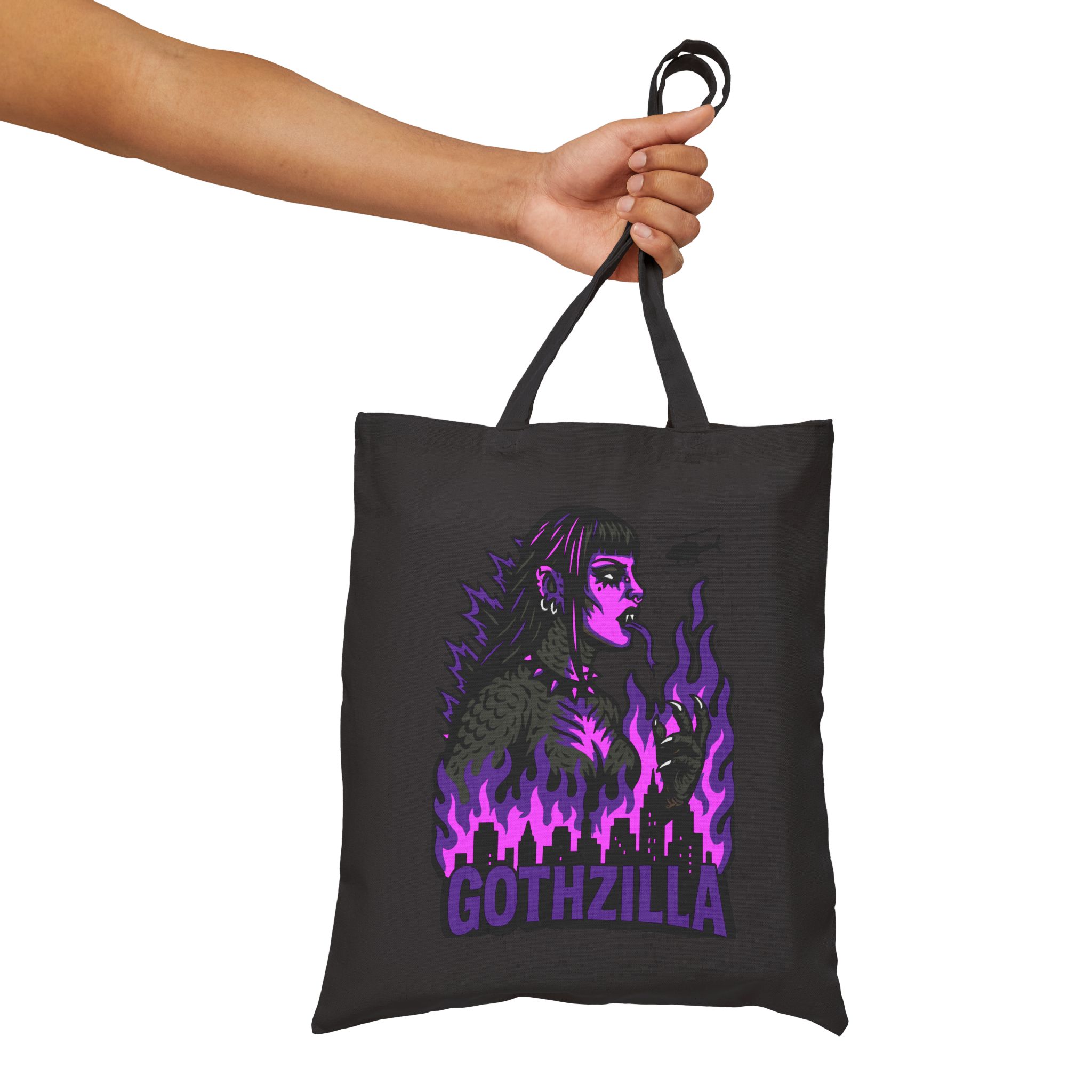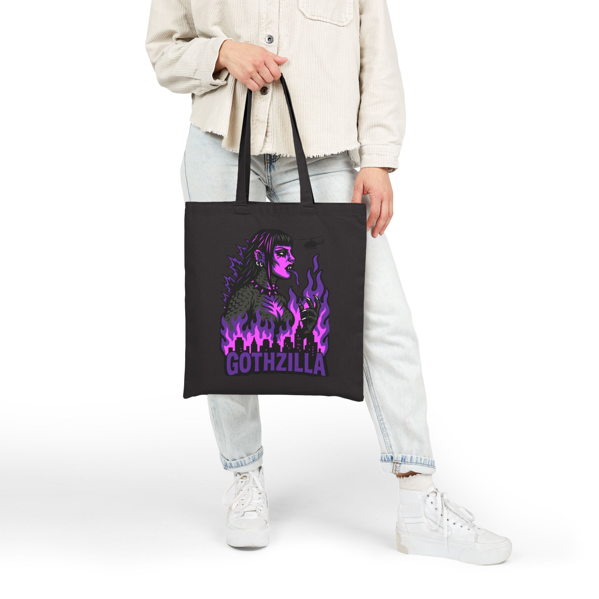Made of durable black cotton, this bag’s ready for the apocalypse and your next coffee run. With the word GOTHZILLA blazing beneath her reign of terror, this isn’t just a tote… it’s a threat.