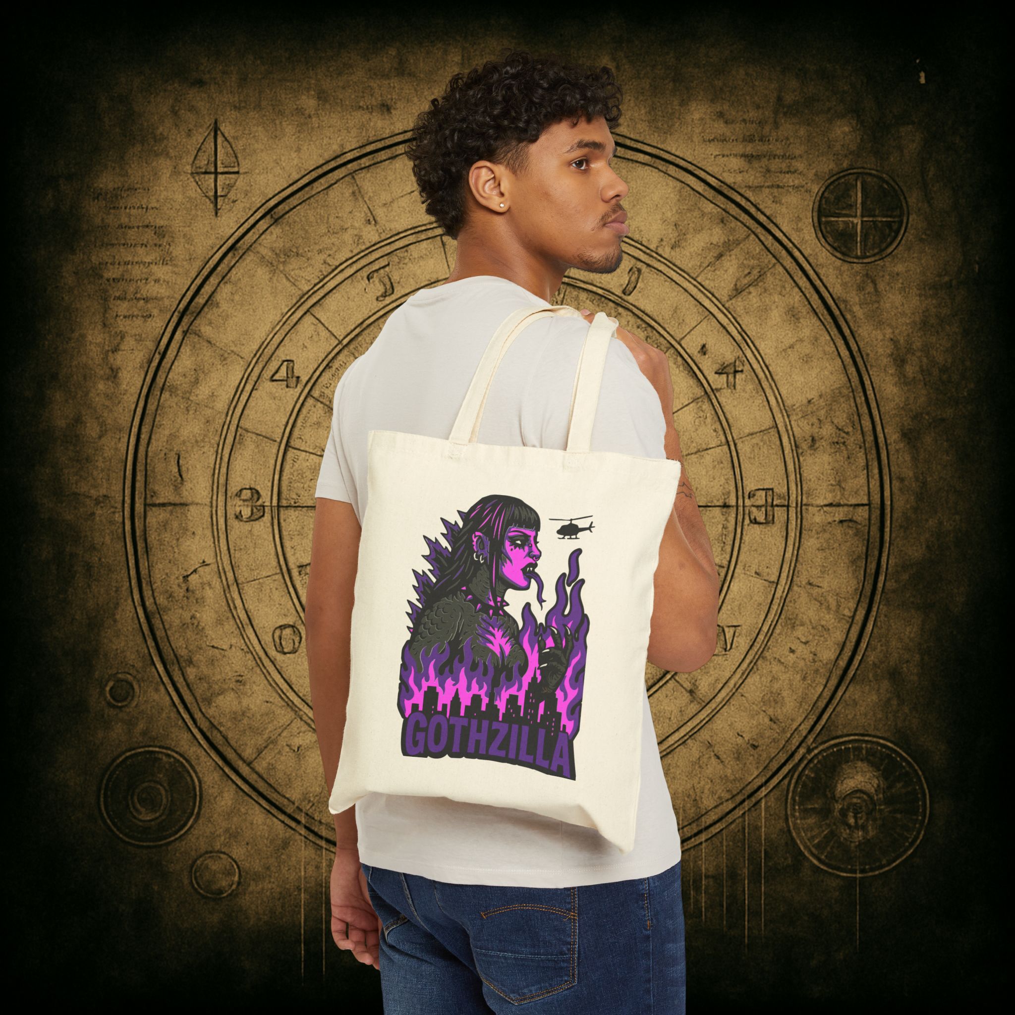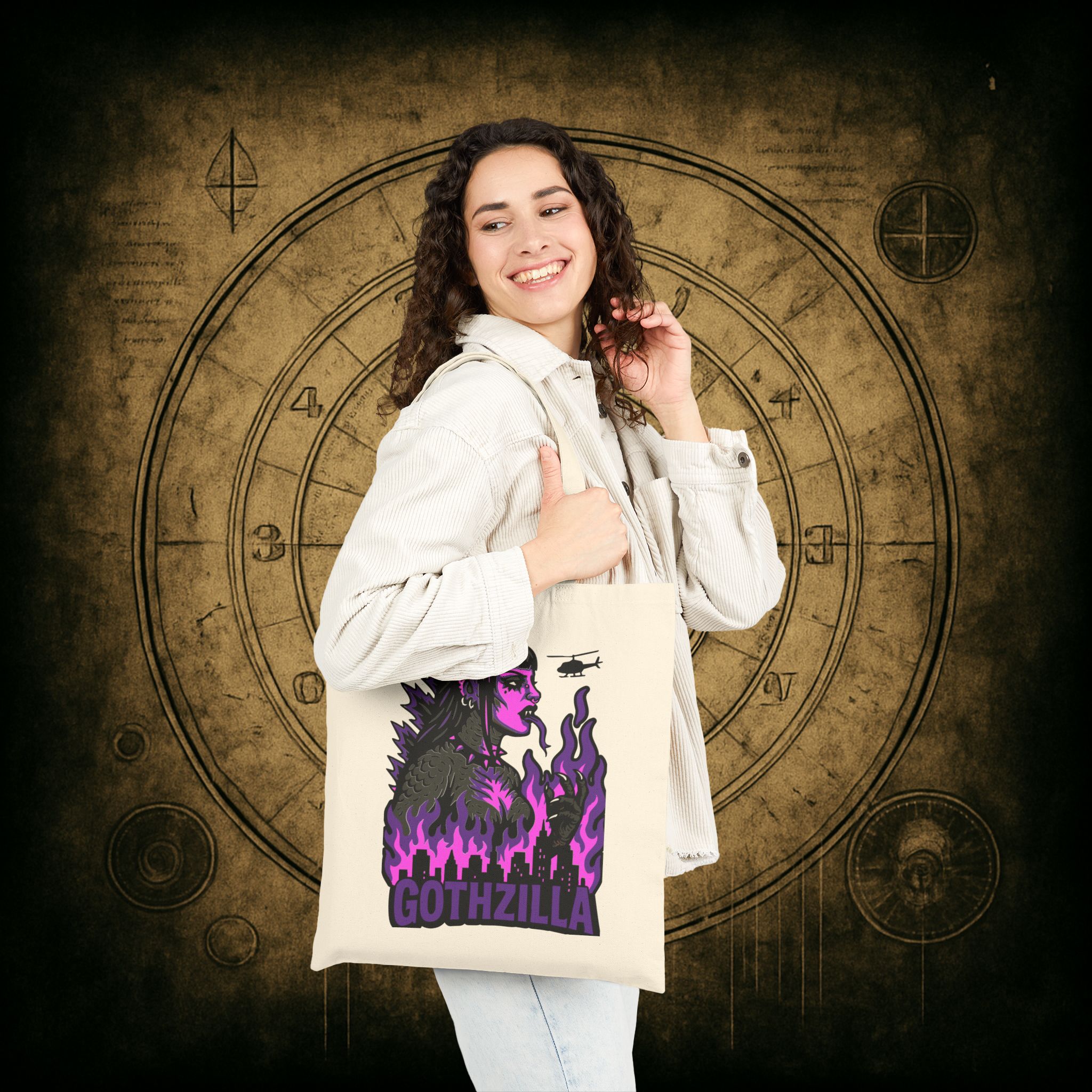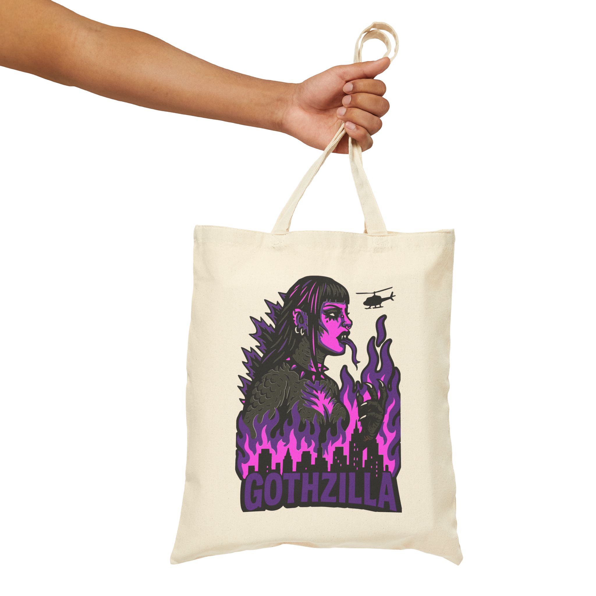 Made of durable black cotton, this bag’s ready for the apocalypse and your next coffee run. With the word GOTHZILLA blazing beneath her reign of terror, this isn’t just a tote… it’s a threat.