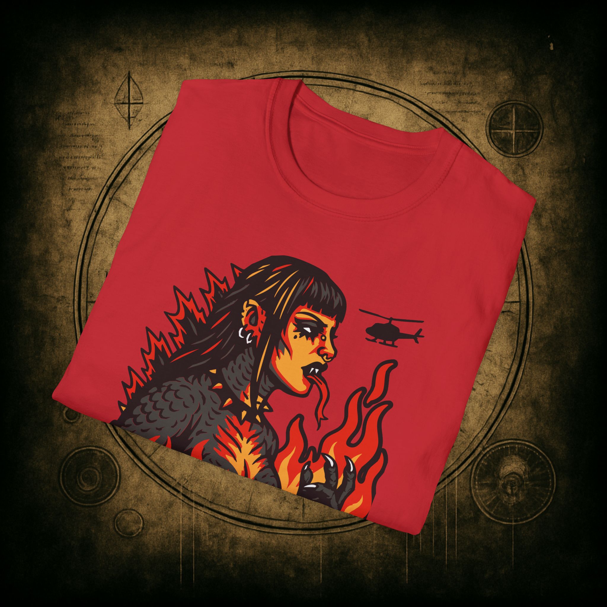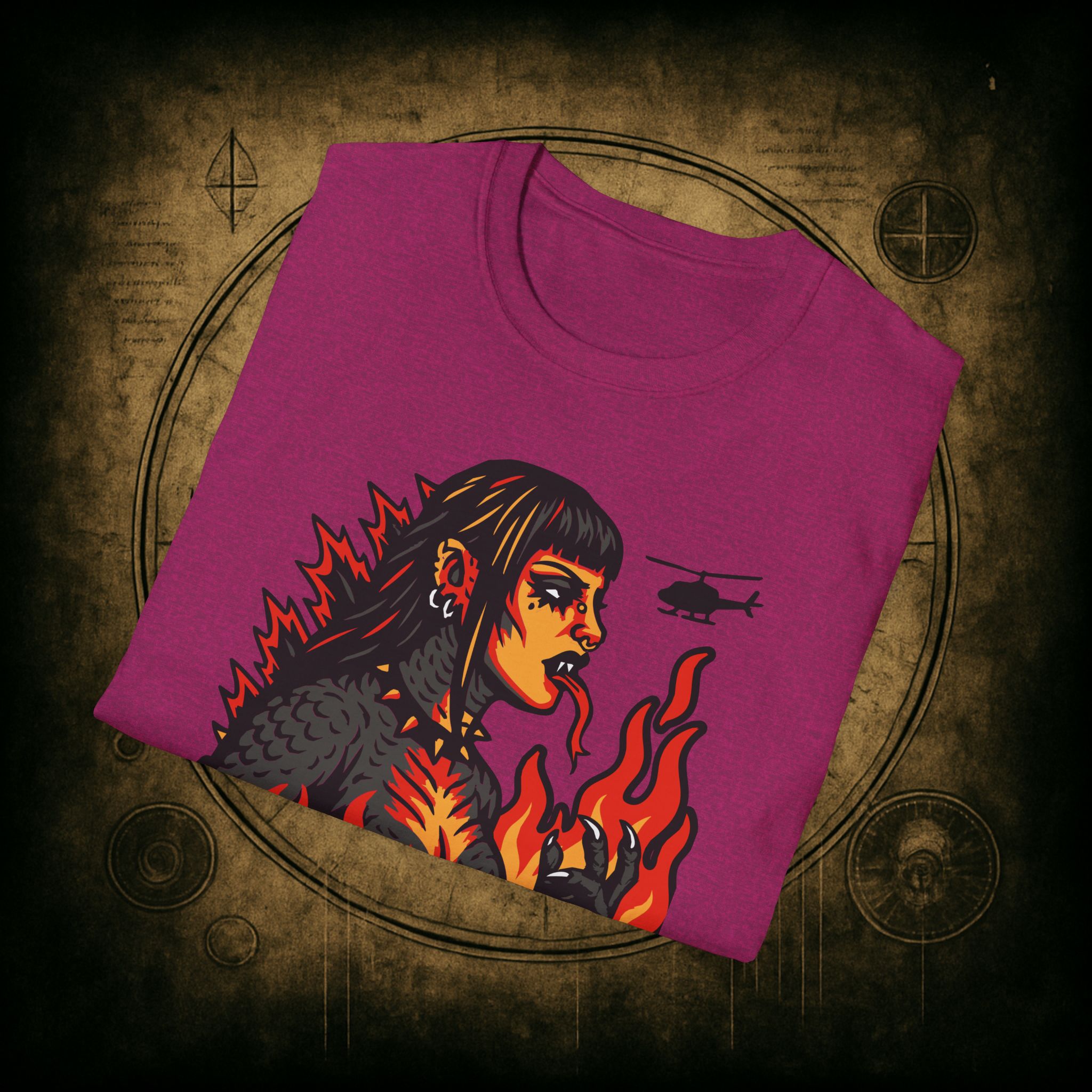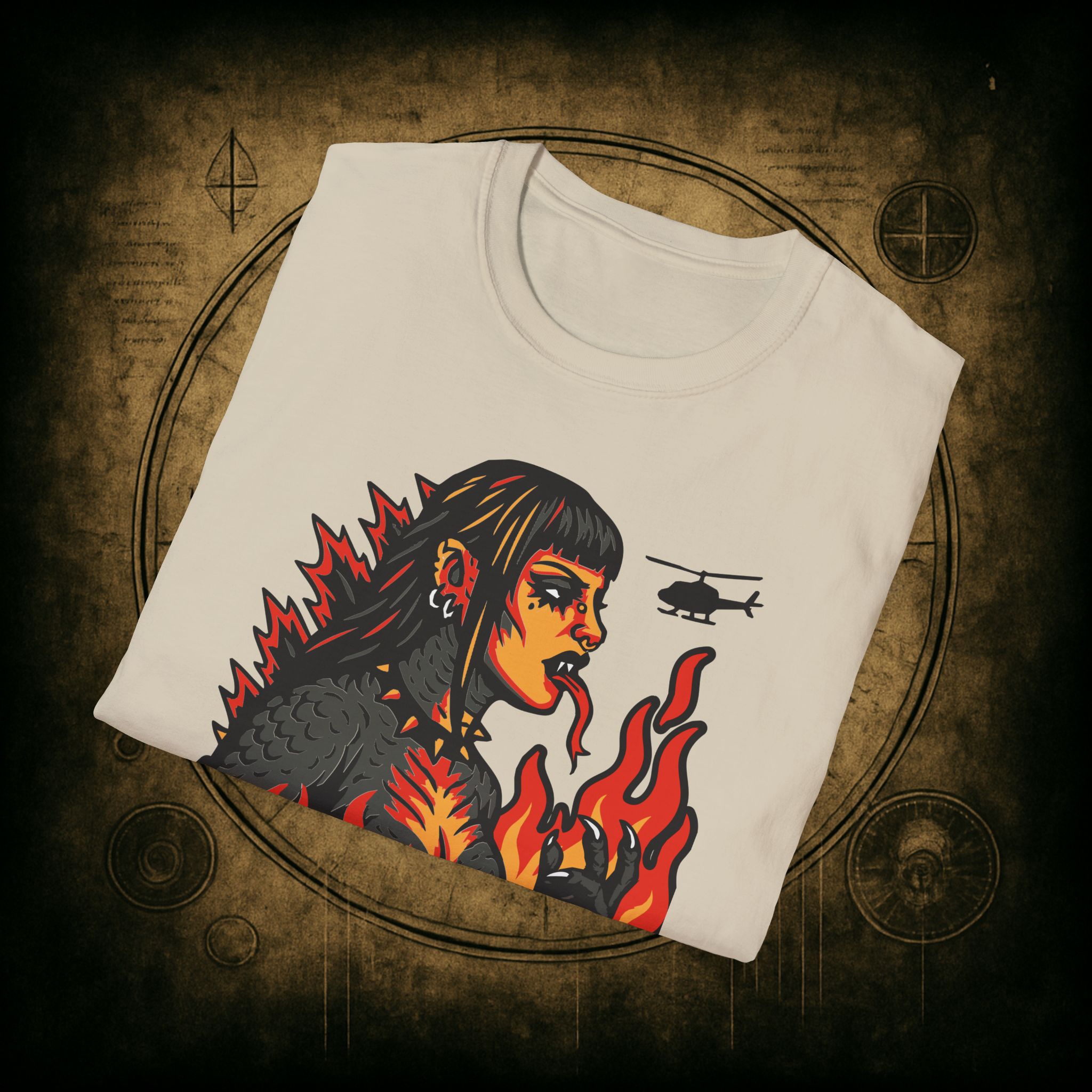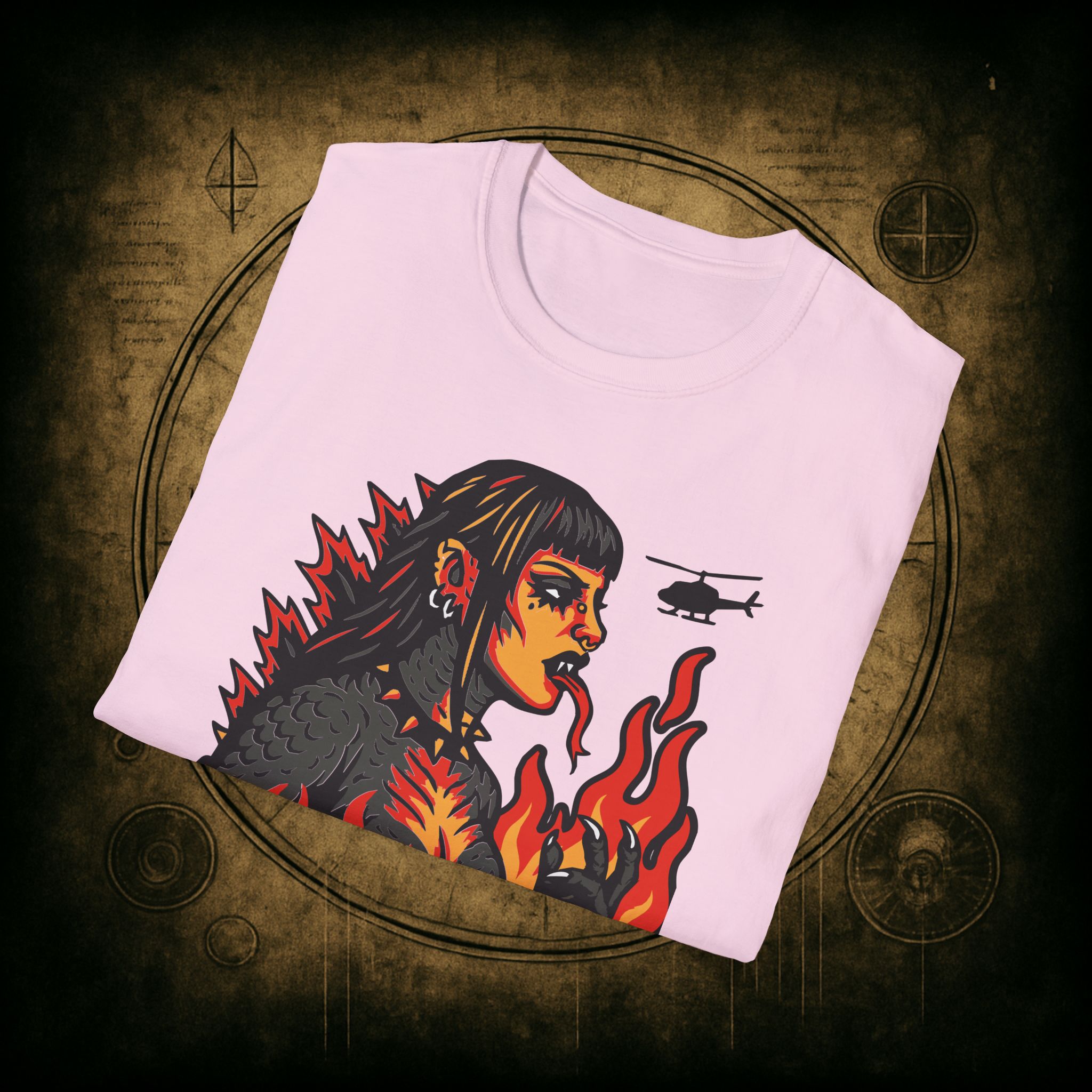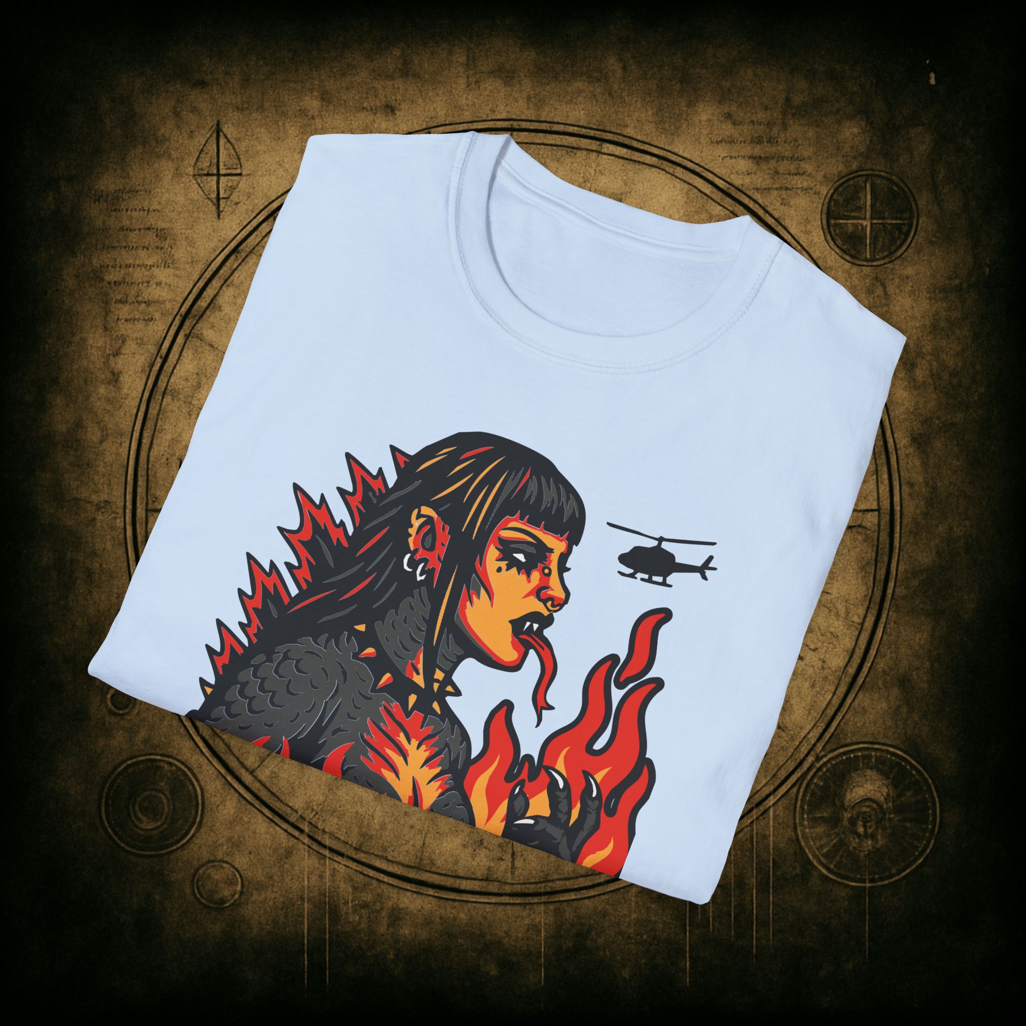 Set against a skyline in flames and helicopters that should really know better, this tee screams power, eyeliner, and emotional damage. She’s not here for your opinions. She’s here to stomp the patriarchy in platform boots.