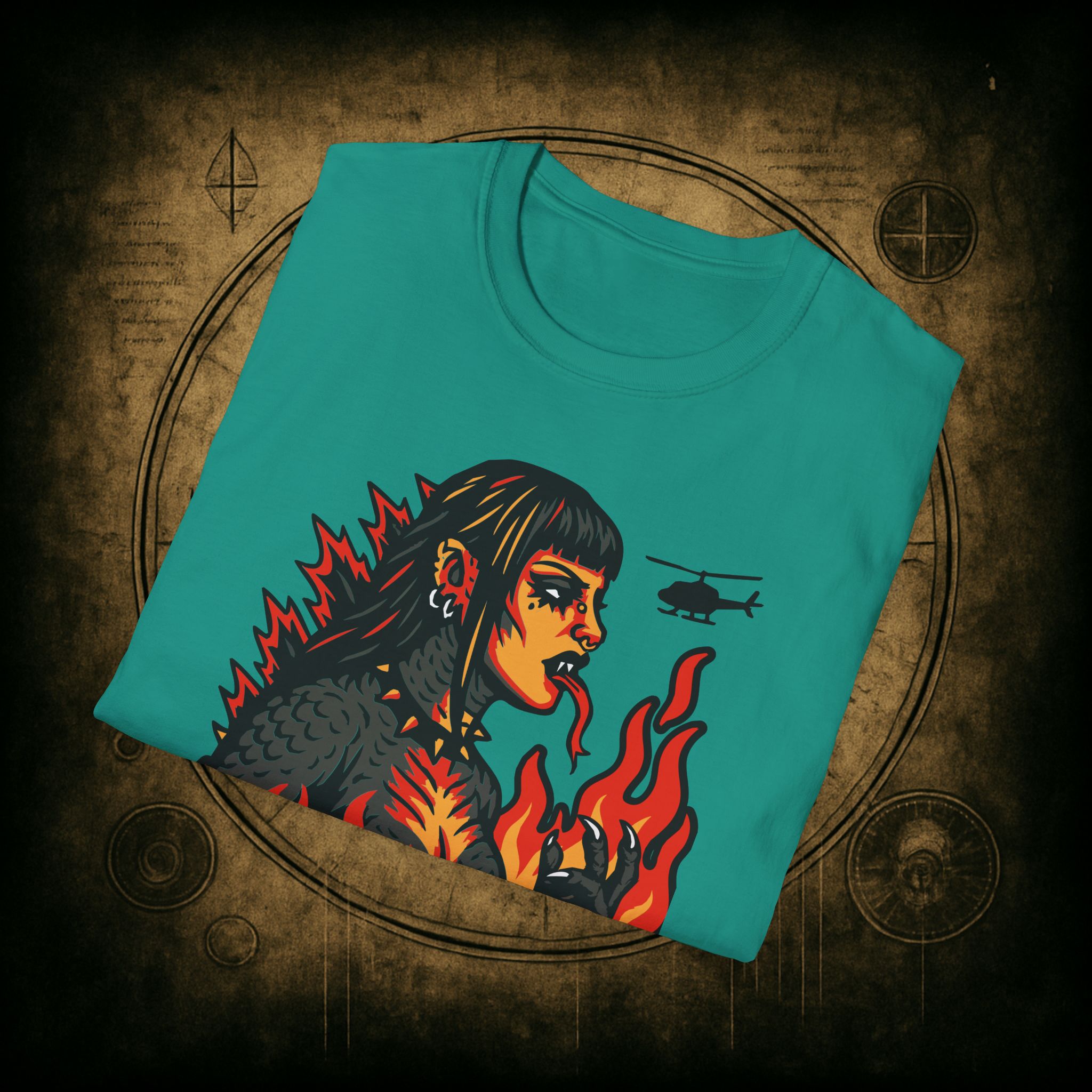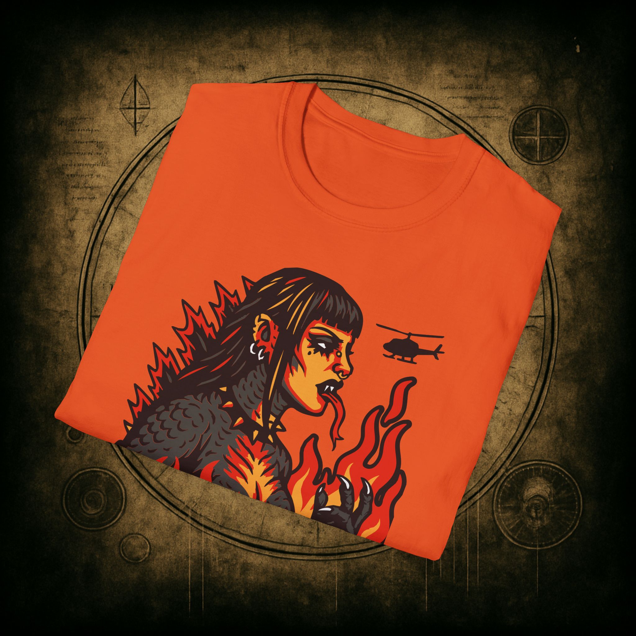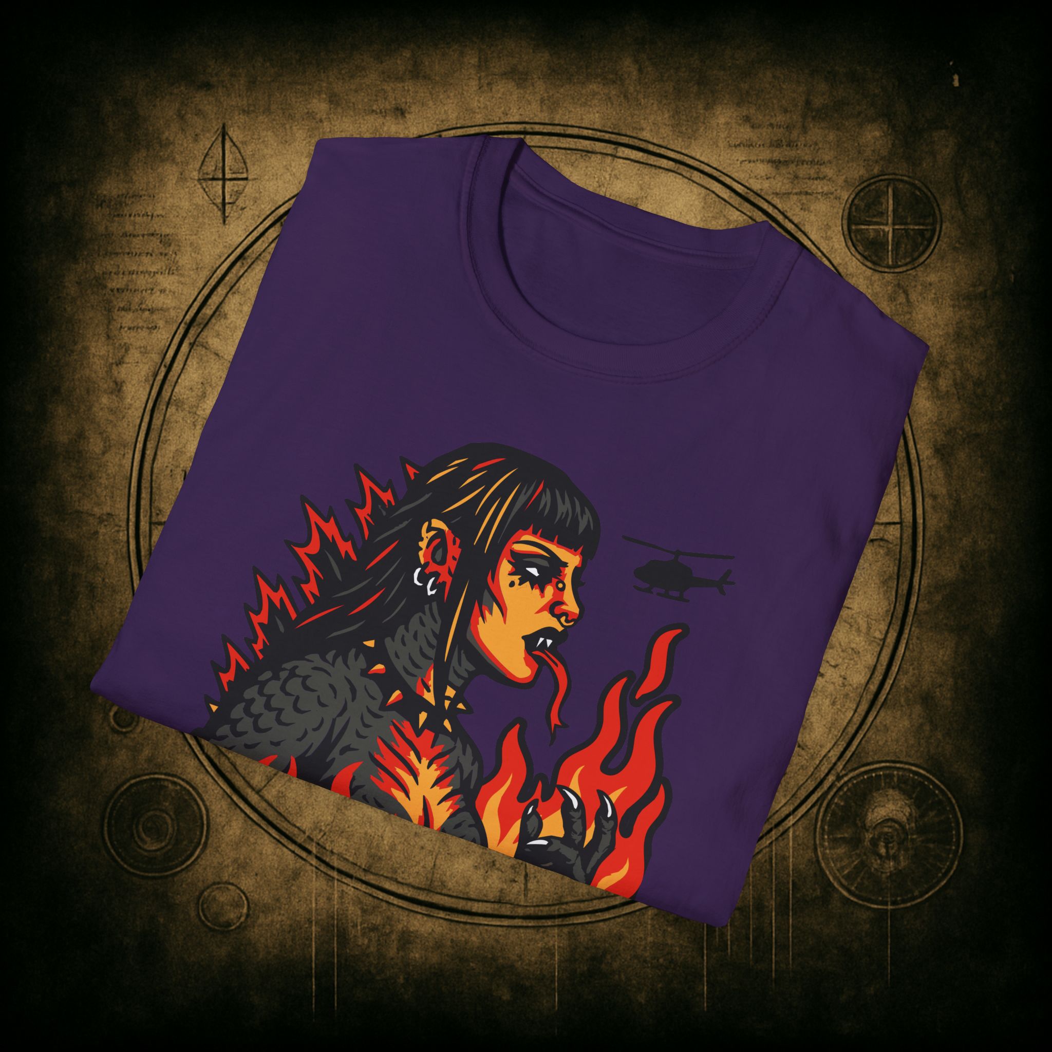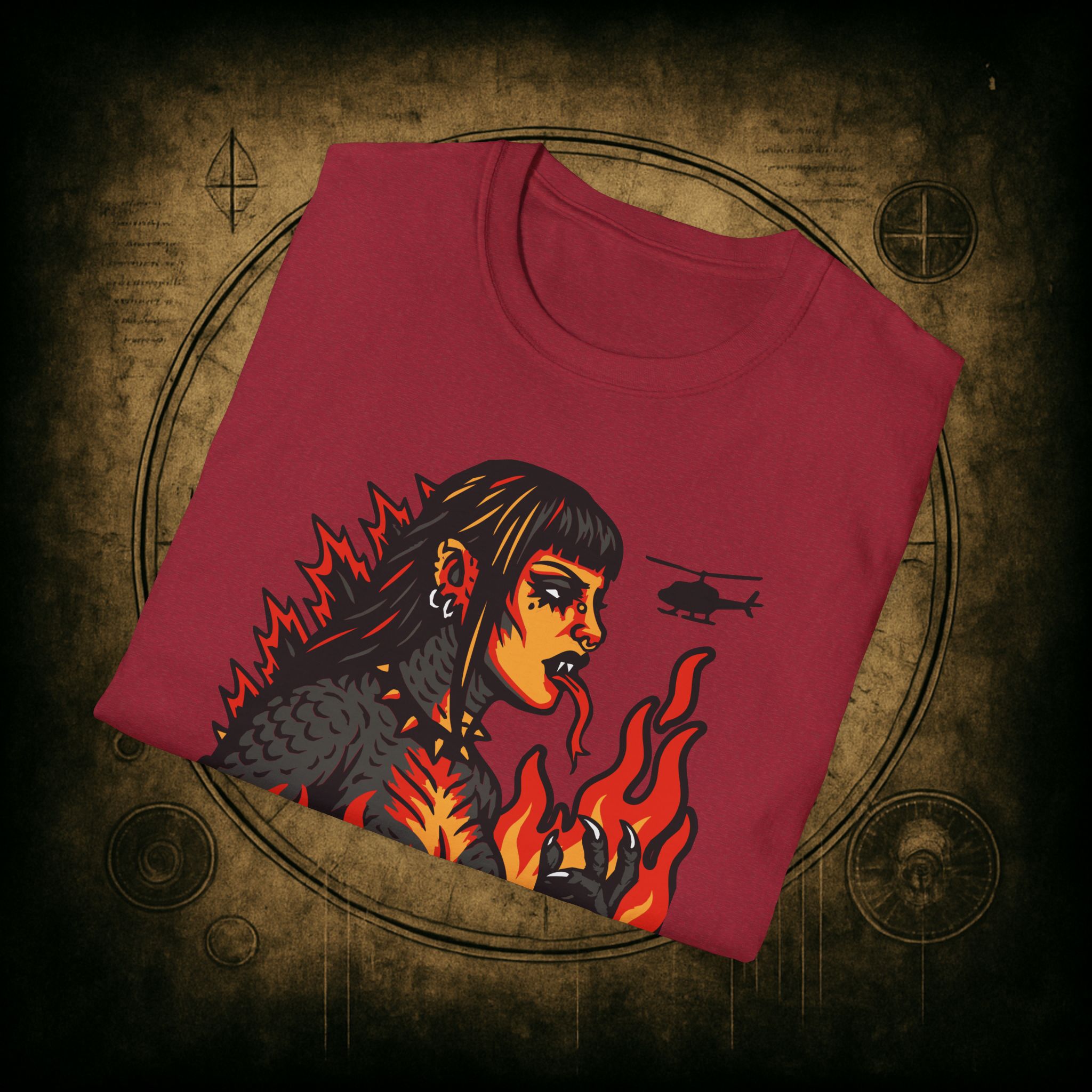 Set against a skyline in flames and helicopters that should really know better, this tee screams power, eyeliner, and emotional damage. She’s not here for your opinions. She’s here to stomp the patriarchy in platform boots.