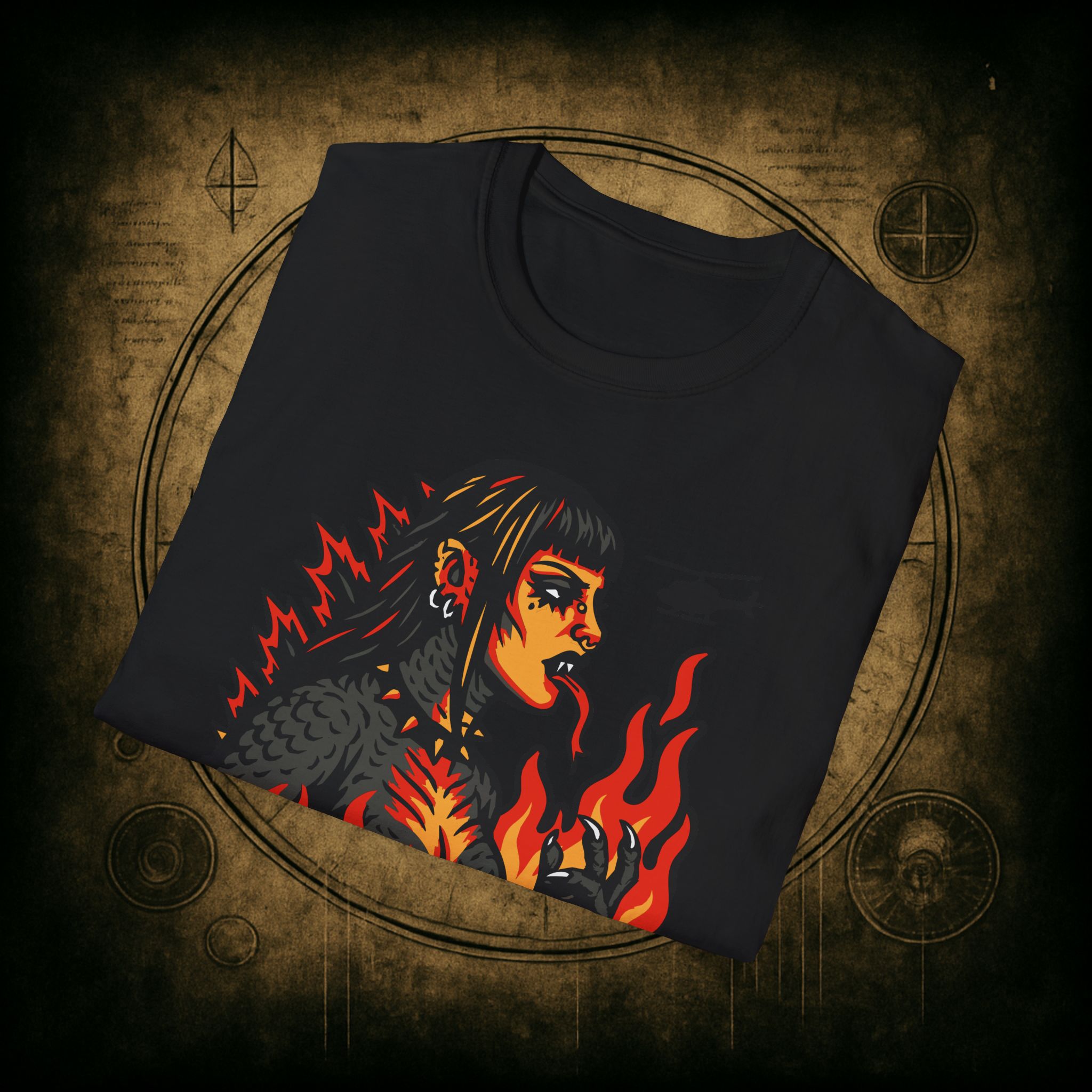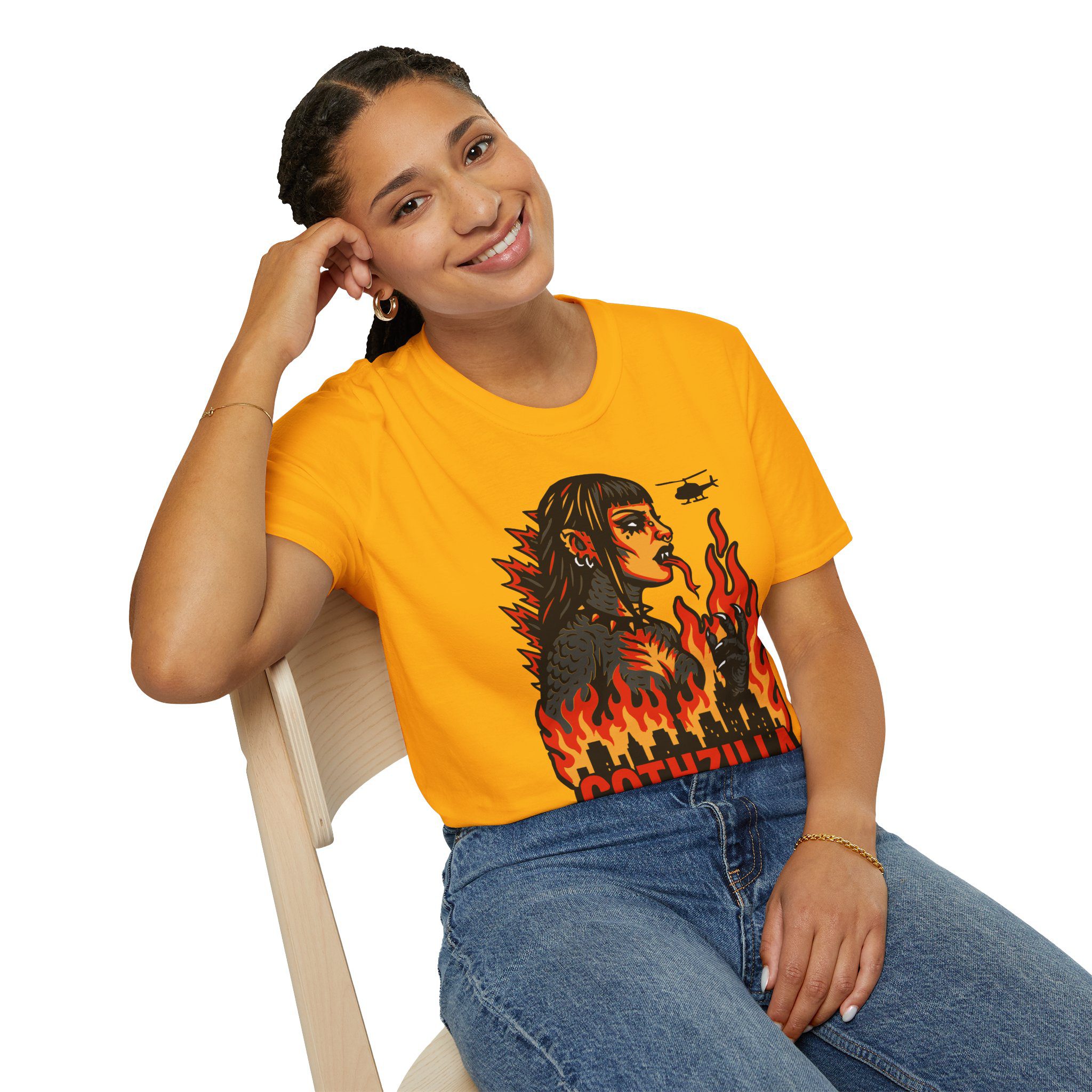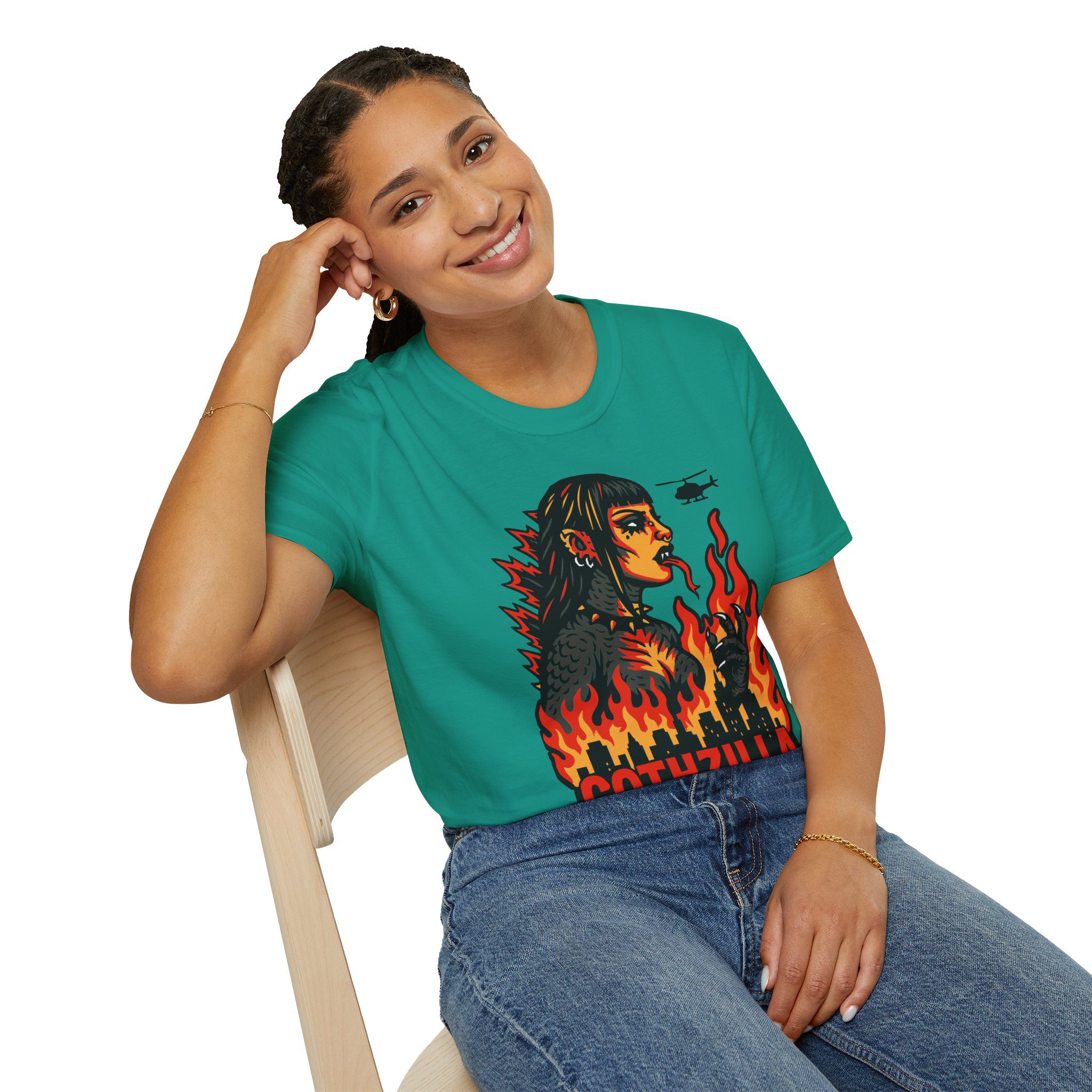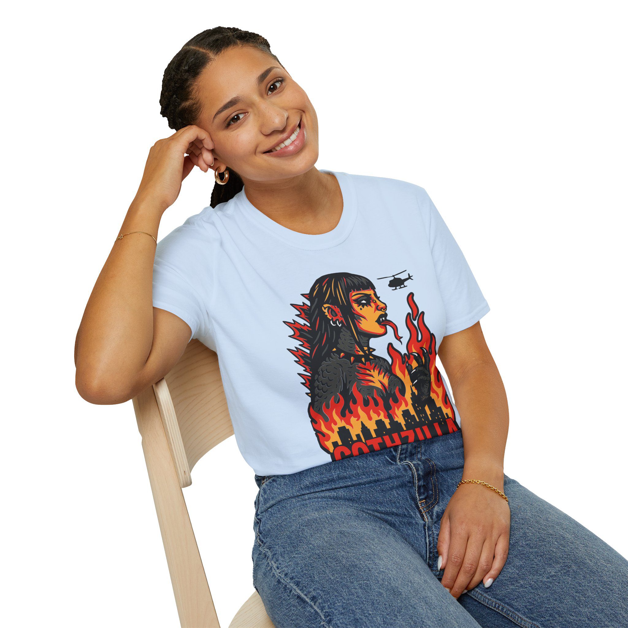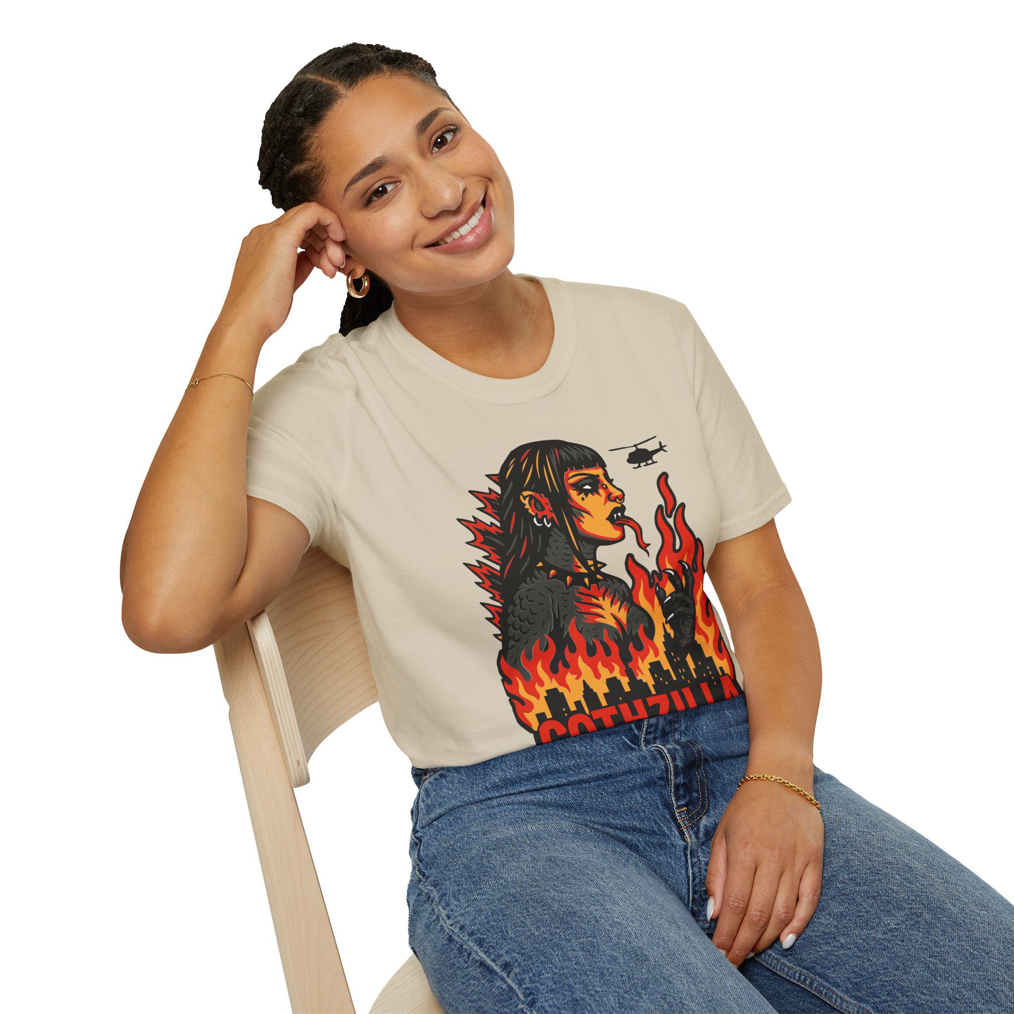 Set against a skyline in flames and helicopters that should really know better, this tee screams power, eyeliner, and emotional damage. She’s not here for your opinions. She’s here to stomp the patriarchy in platform boots.
