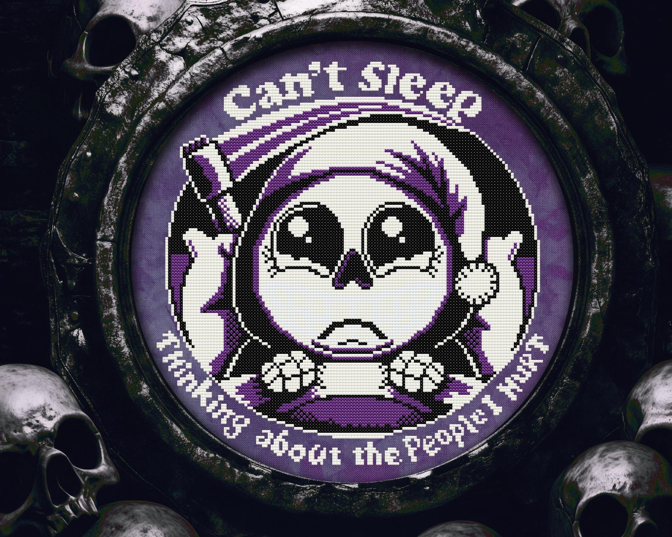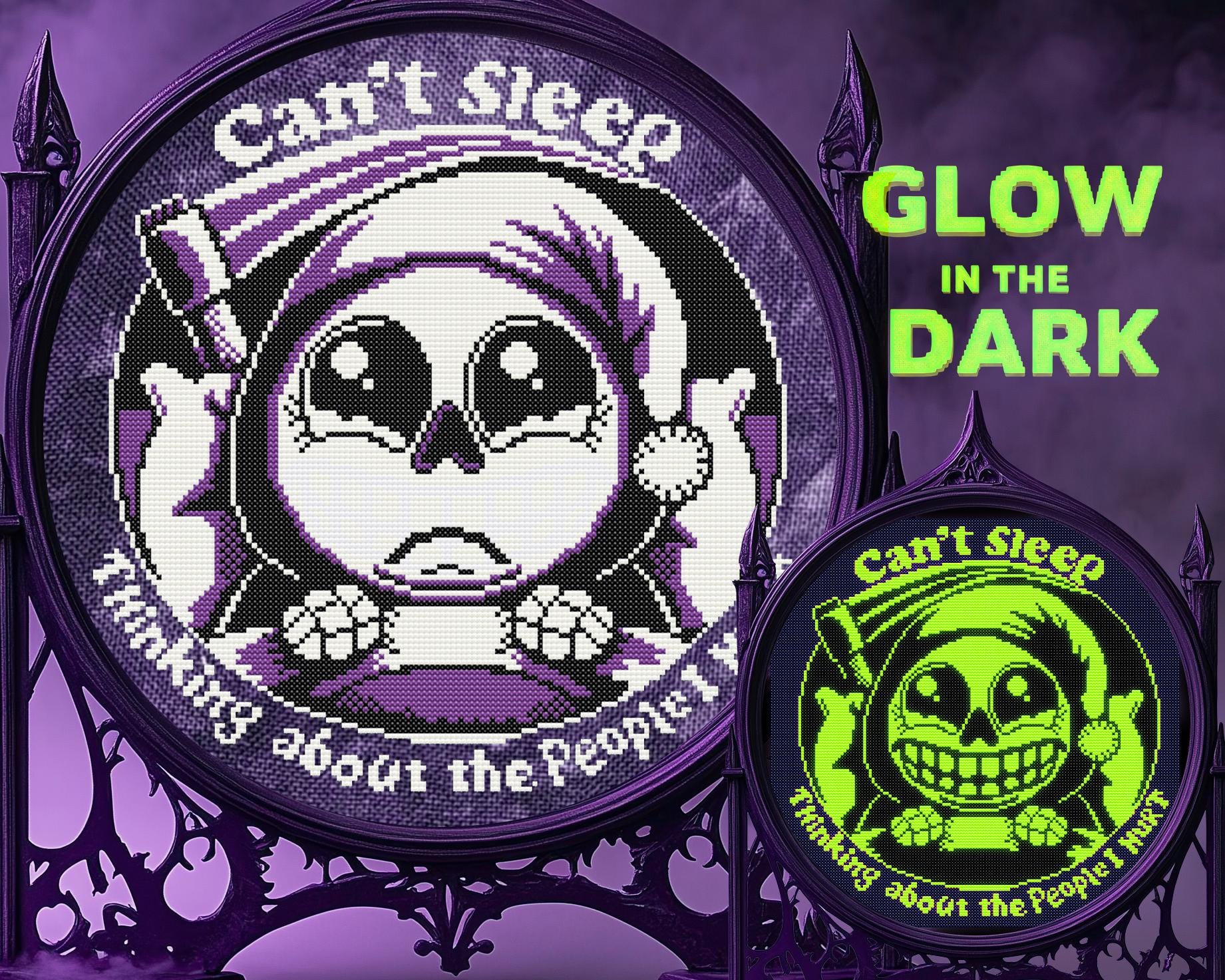 Ever find yourself wide awake at 3 AM, staring at the ceiling, reliving all the chaos you’ve sown? This grim reaper cross stitch understands. First, it’s all big, watery eyes, wrapped up in a kawaii cross stitch nightmare of guilt-ridden insomnia. But then, oh, flip the lights off and let that glow in the dark cross stitch thread do its magic. BAM! That nervous little skeleton suddenly remembers that maybe, just maybe, they enjoyed the mayhem. That grin? Pure dark humor cross stitch delight. You can practically hear the snarky whisper: “Oops. Did I do that?”