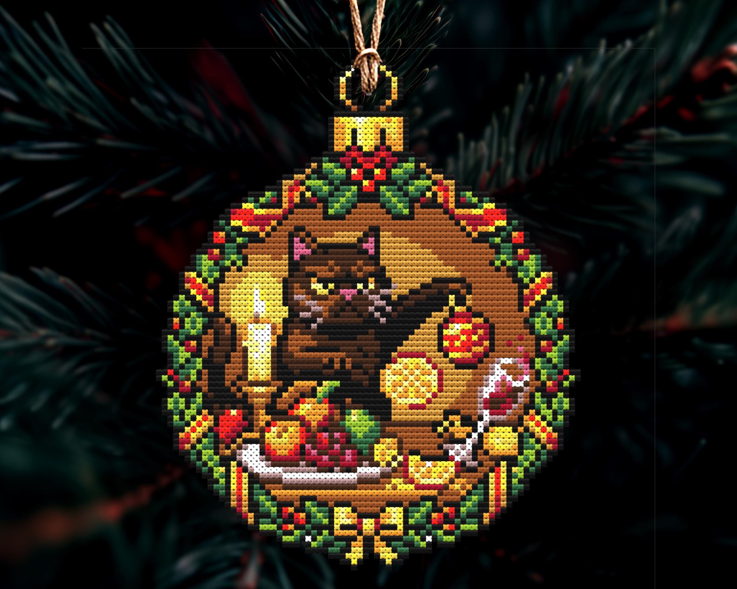 It reads a little altar adjacent too, since the candle and berries give quiet Wiccan cross stitch vibes without trying too hard. For the truly unhinged season, it can absolutely go full krampus Cross stitch if you stitch it like he s guarding the naughty list. Even with the attitude, the ornament shape keeps it oddly sweet, so it flirts with kawaii cross stitch and pastel goth cross stitch energy. Make it Xmas Cross Stitch for your winter decor, then let your xstitch heart enjoy the part where the cat stares back like I live here now.