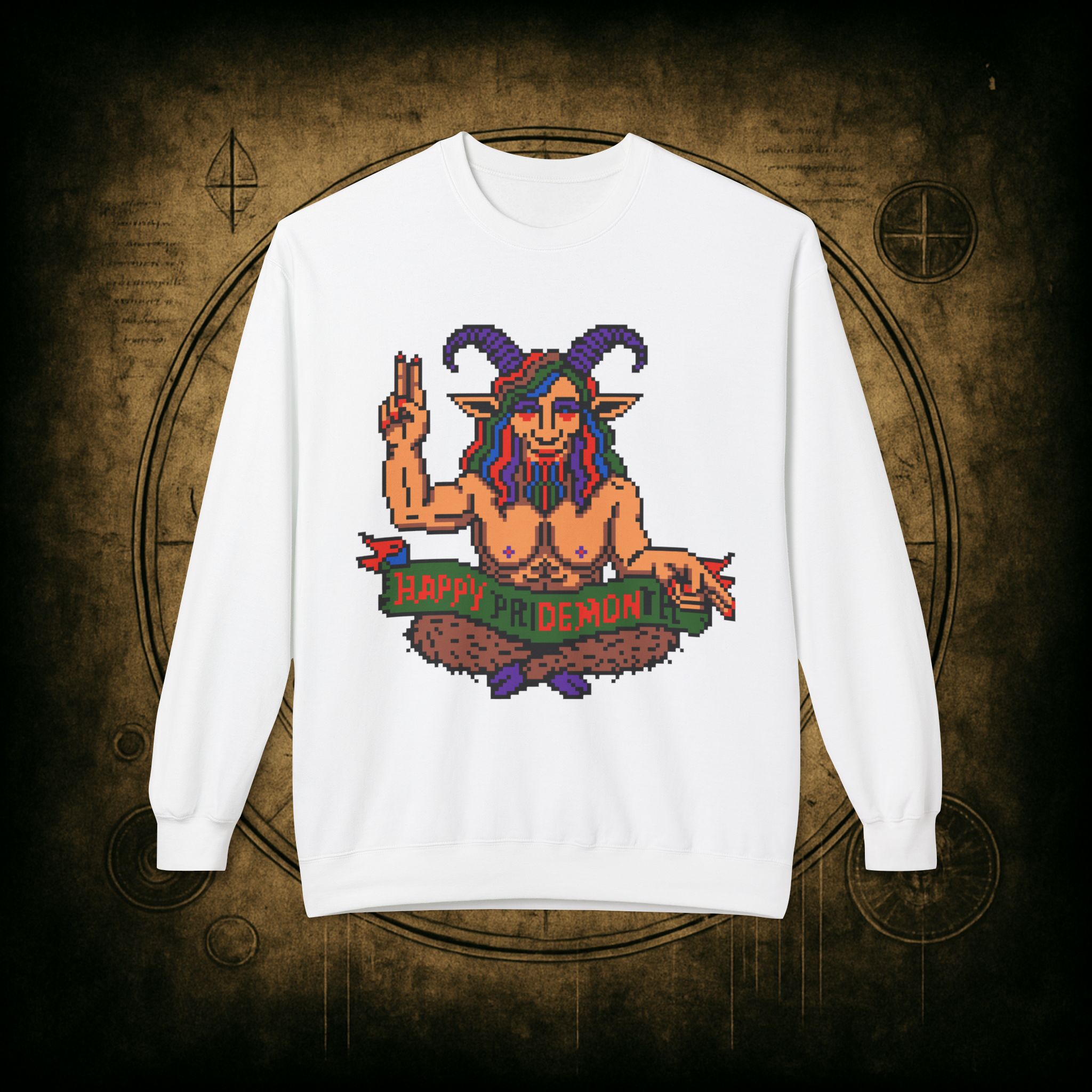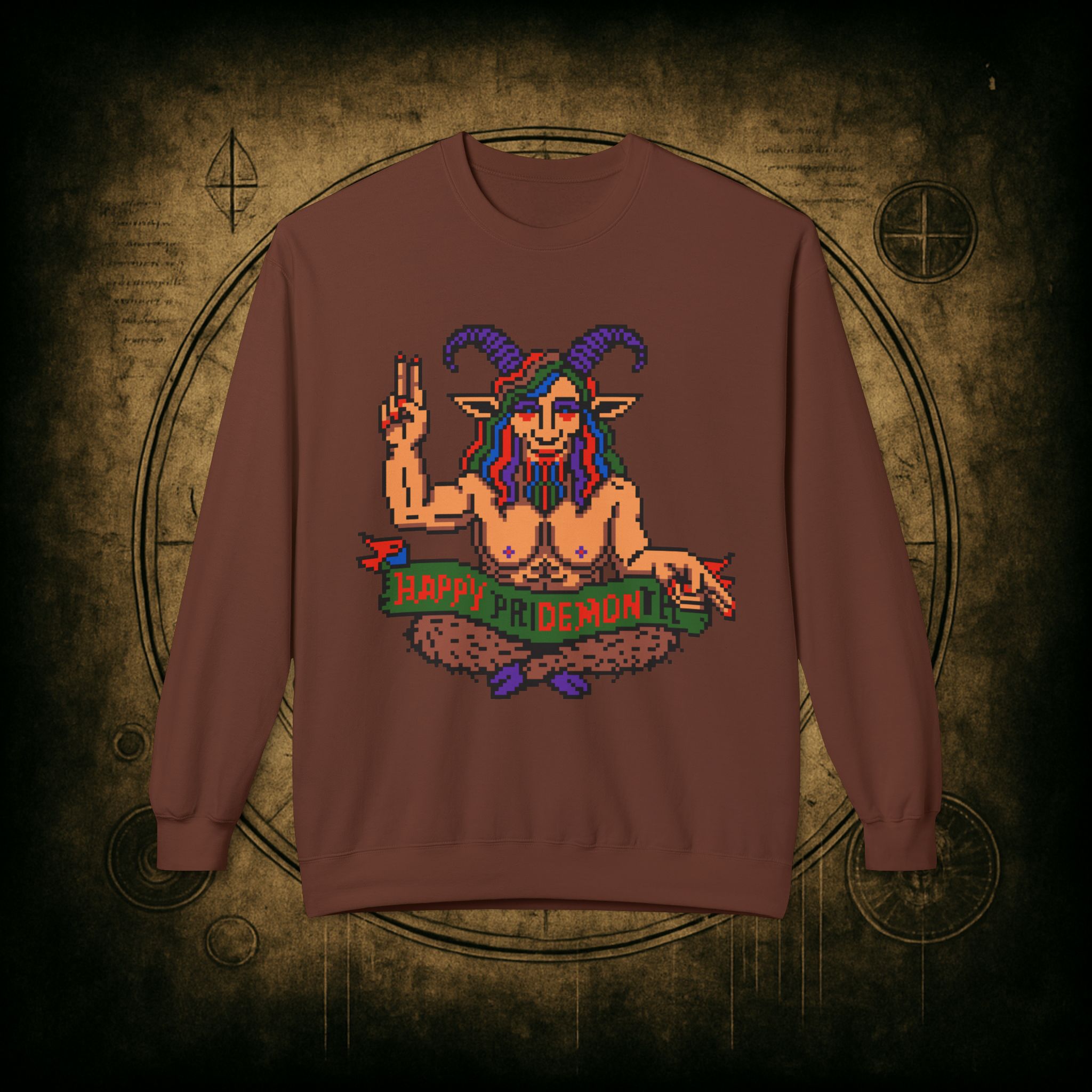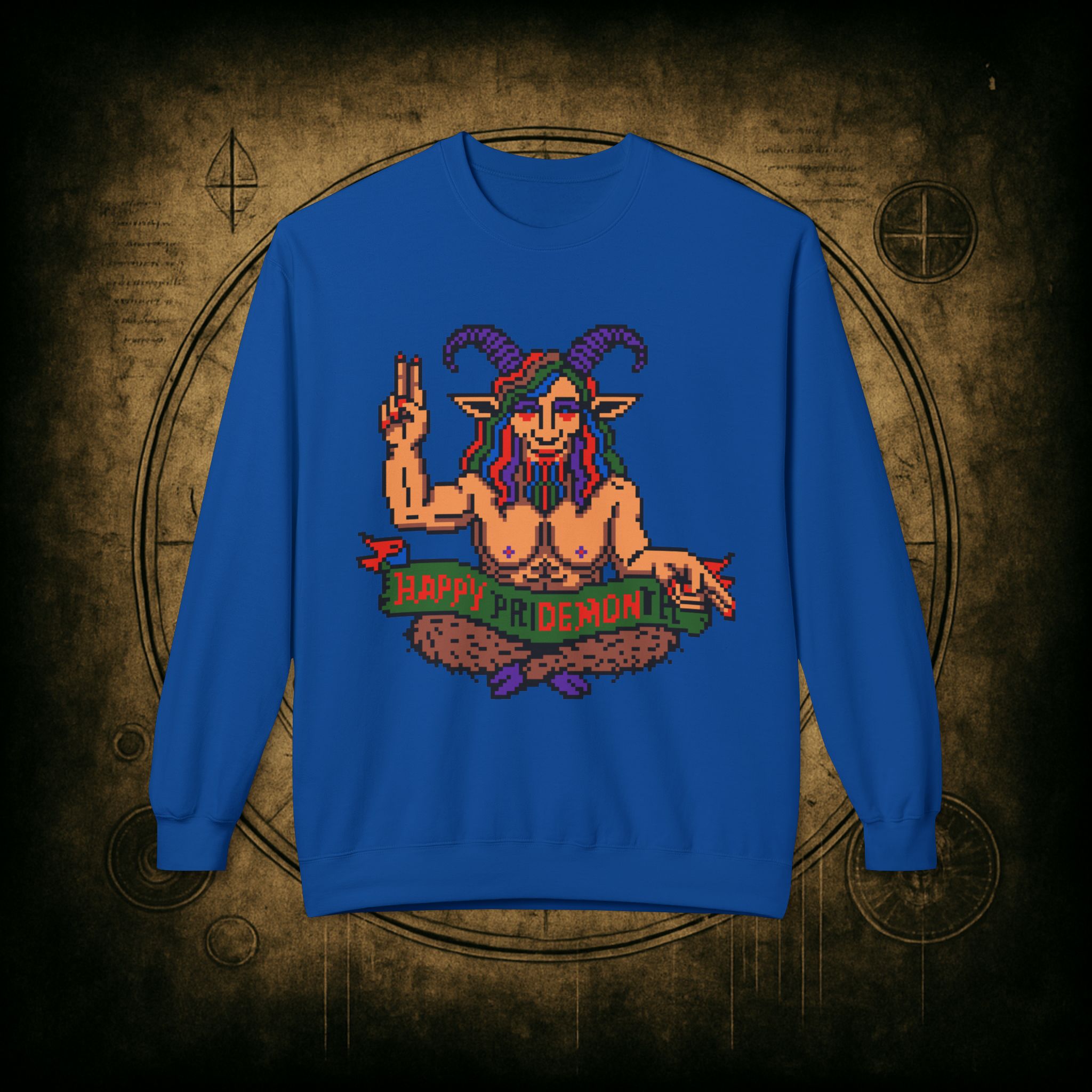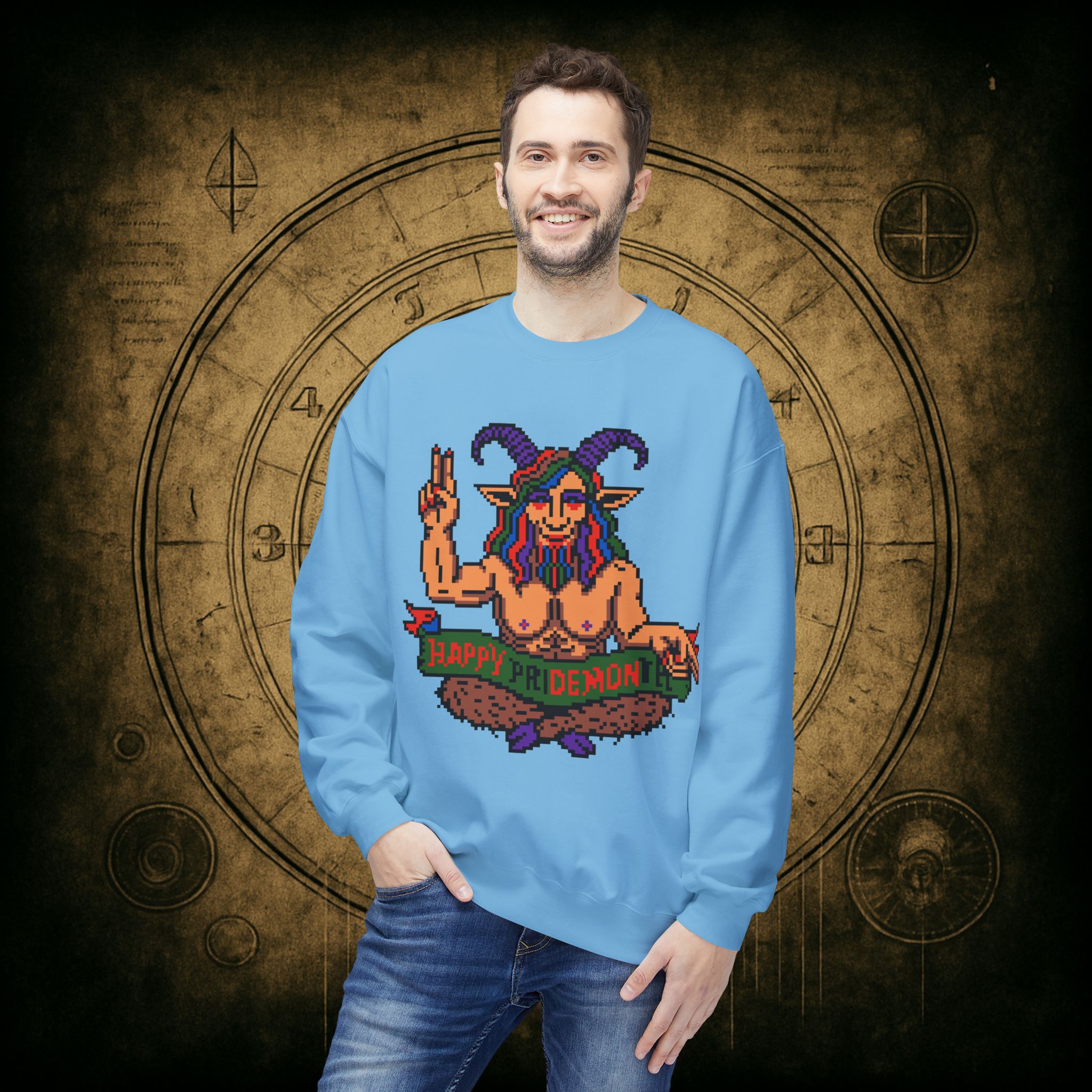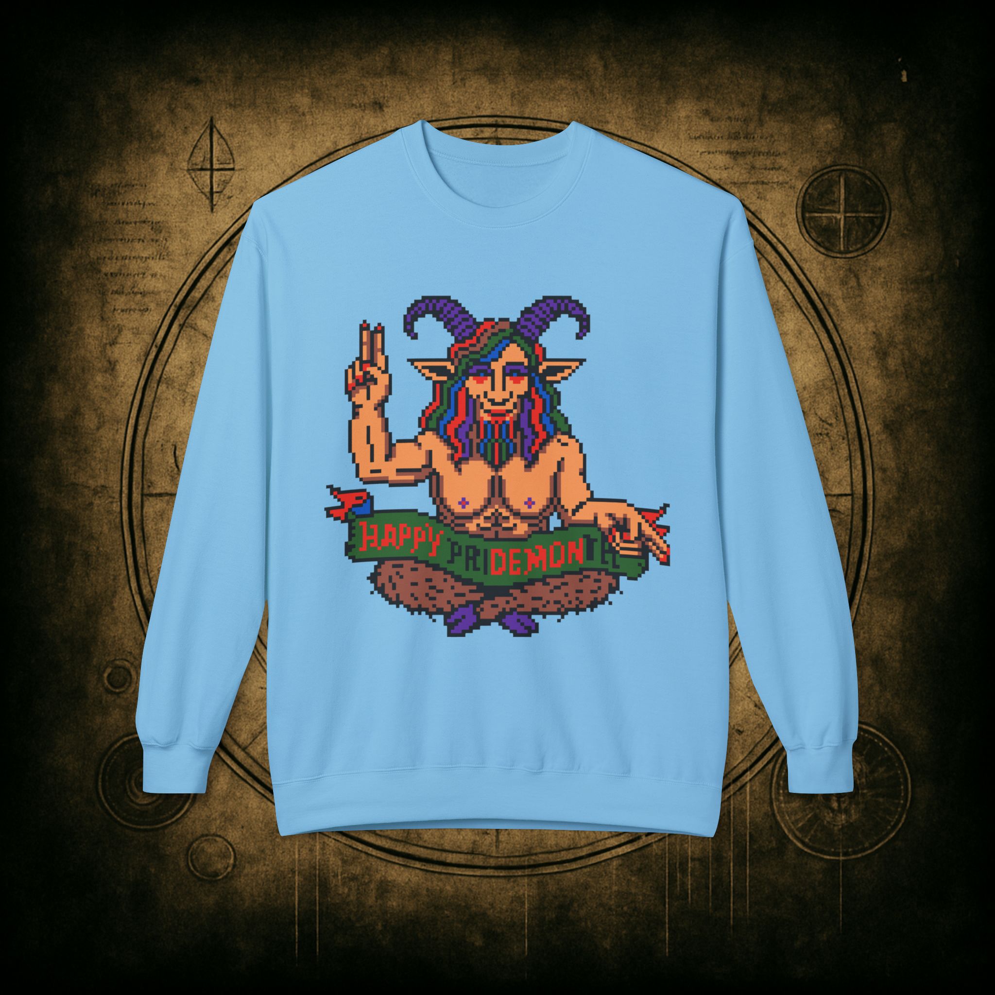 Raise those horns and throw that peace sign, darling, this pixel-perfect pan goat deity is here to serve sass, celebration, and a whole lotta rainbow realness. Whether you’re queer, chaotic, or just vibing with both, this sweatshirt is your official Pride Month invocation attire.
