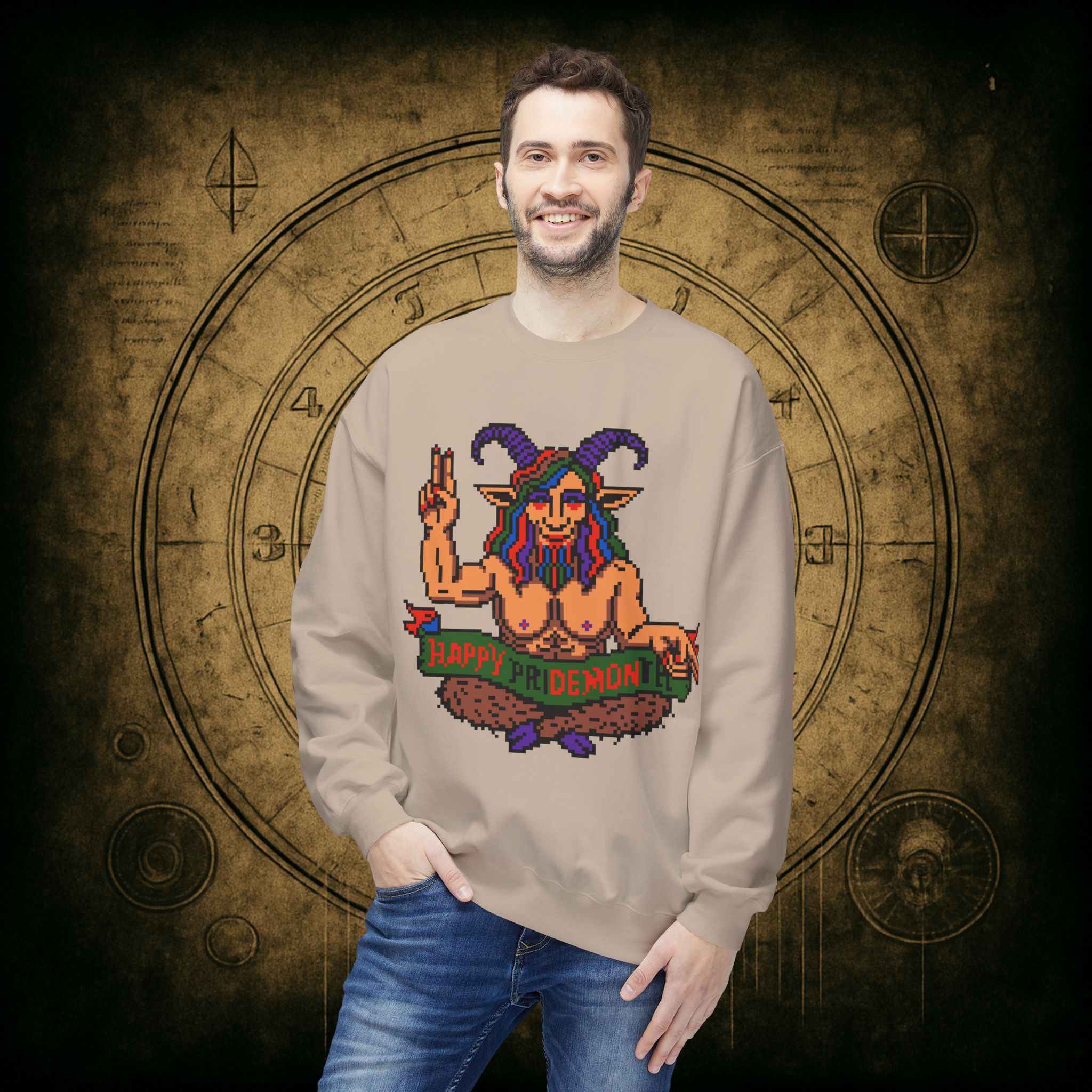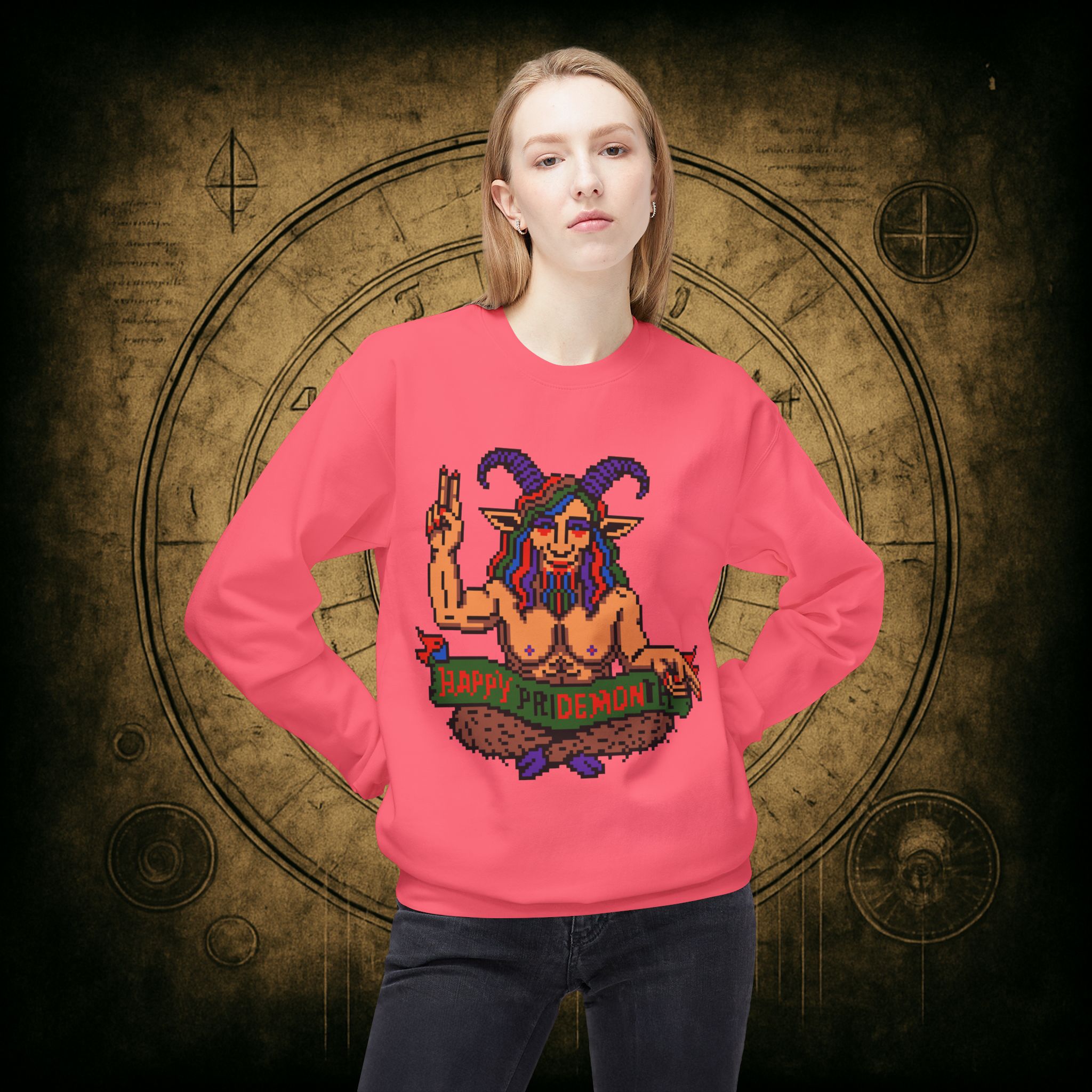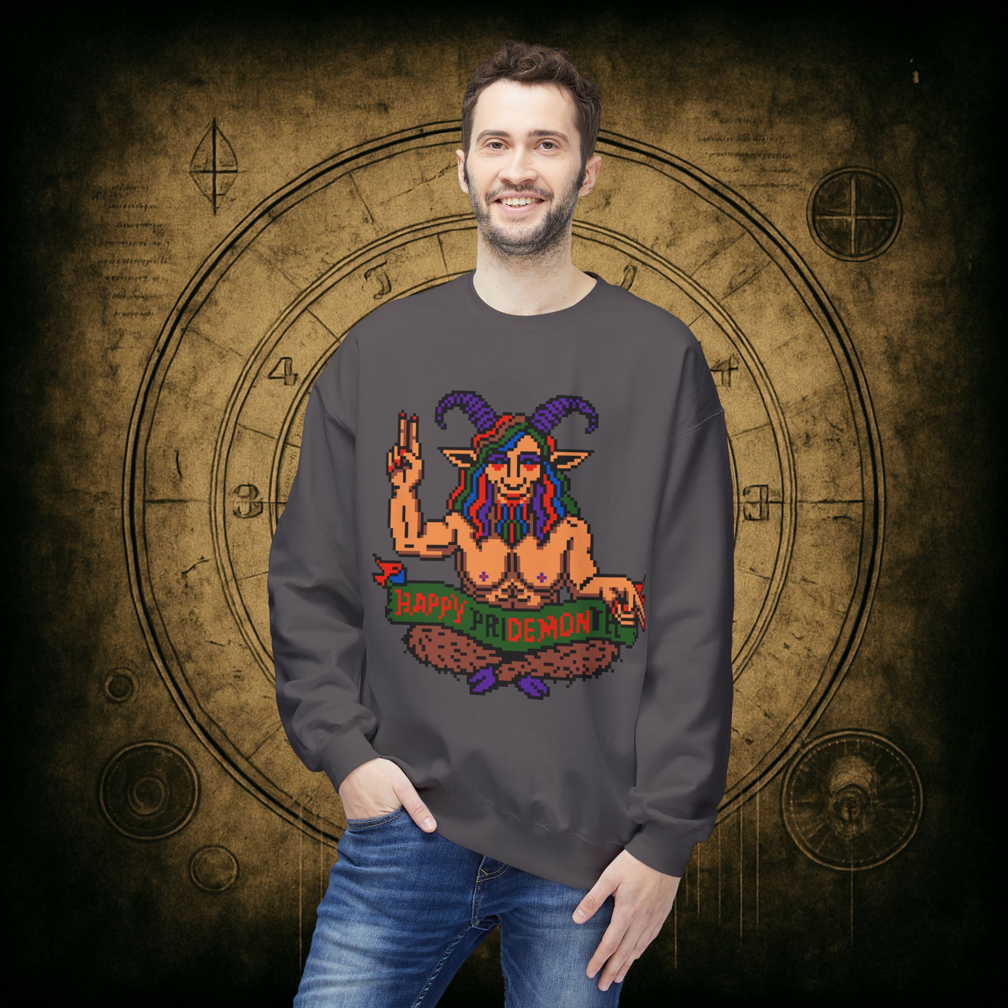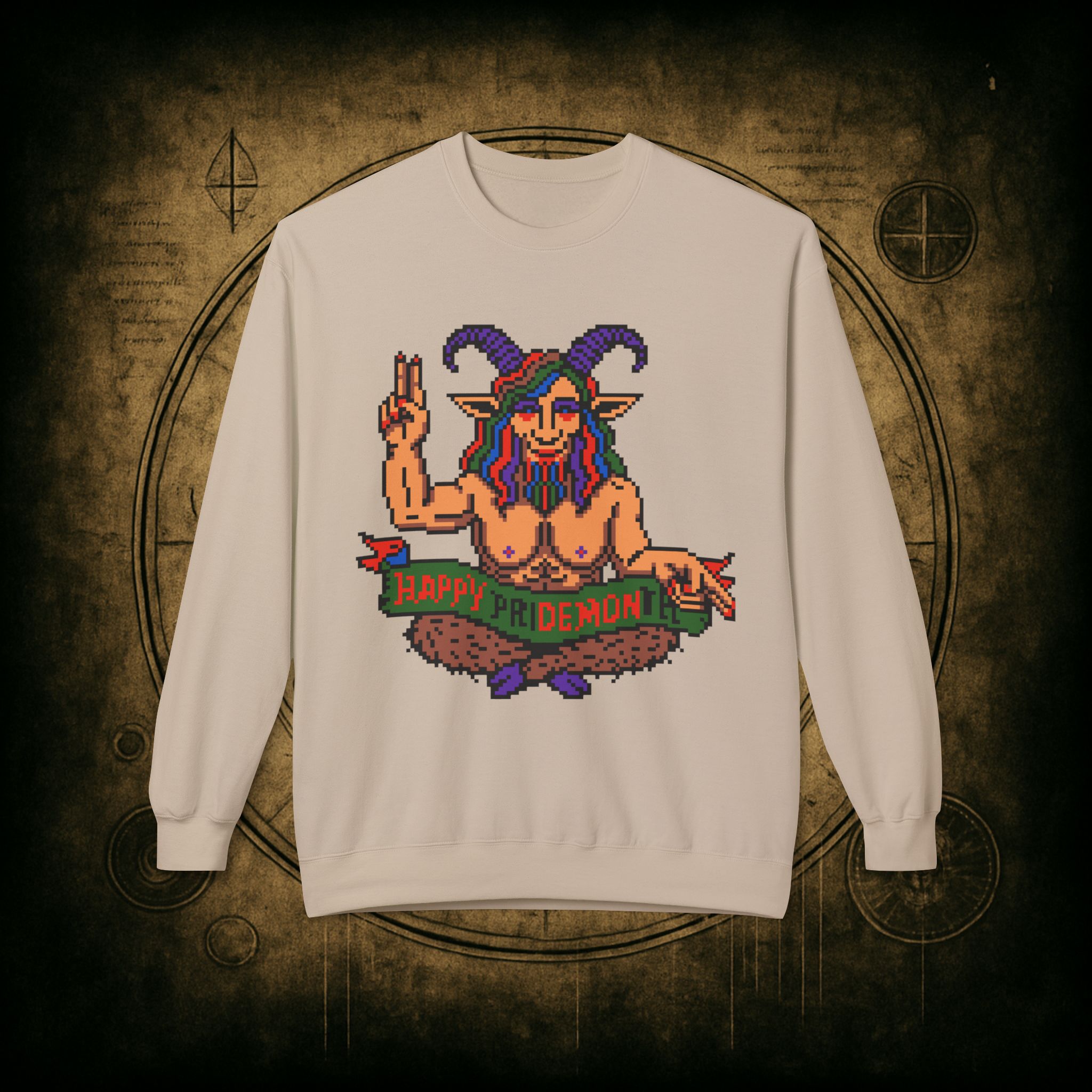Raise those horns and throw that peace sign, darling, this pixel-perfect pan goat deity is here to serve sass, celebration, and a whole lotta rainbow realness. Whether you’re queer, chaotic, or just vibing with both, this sweatshirt is your official Pride Month invocation attire.