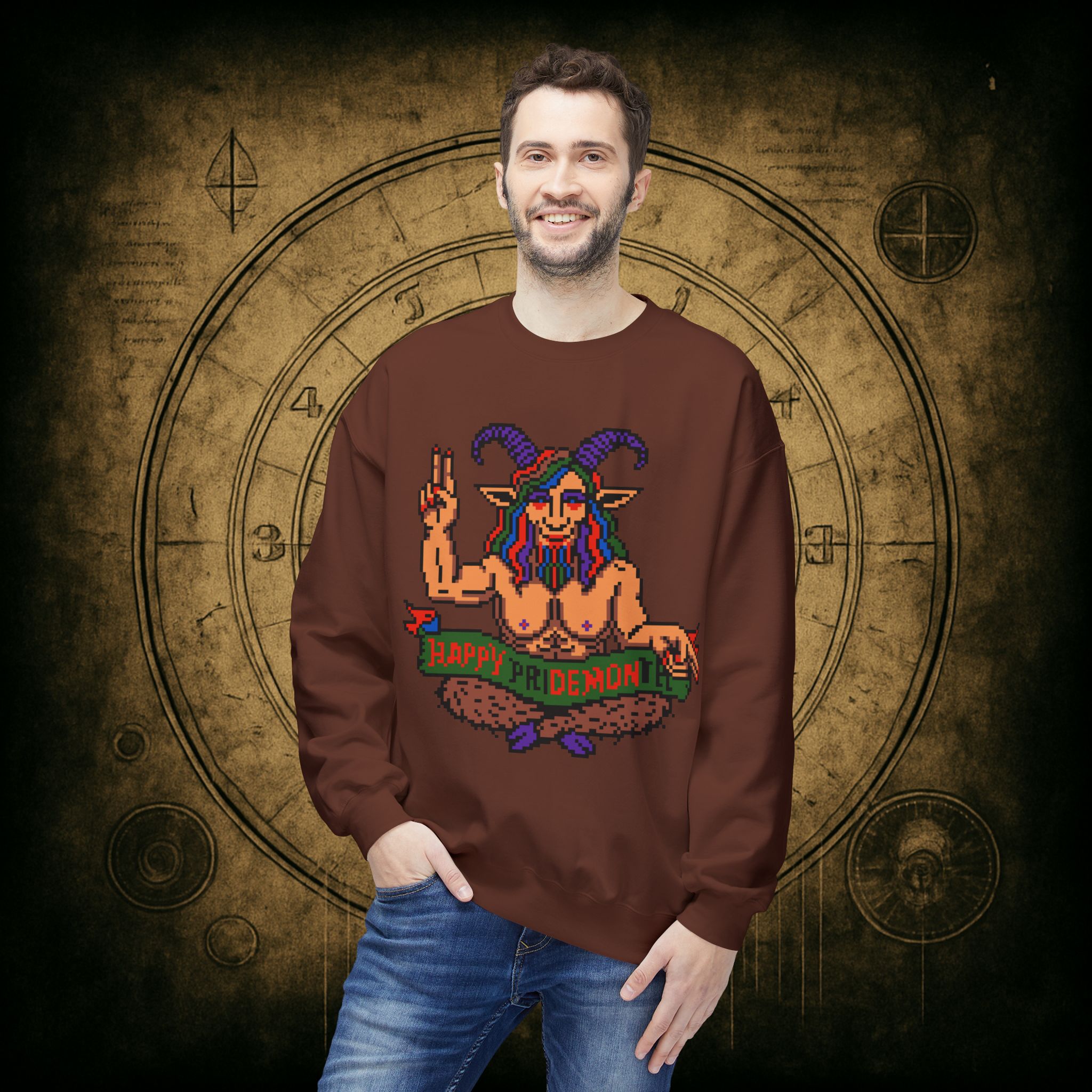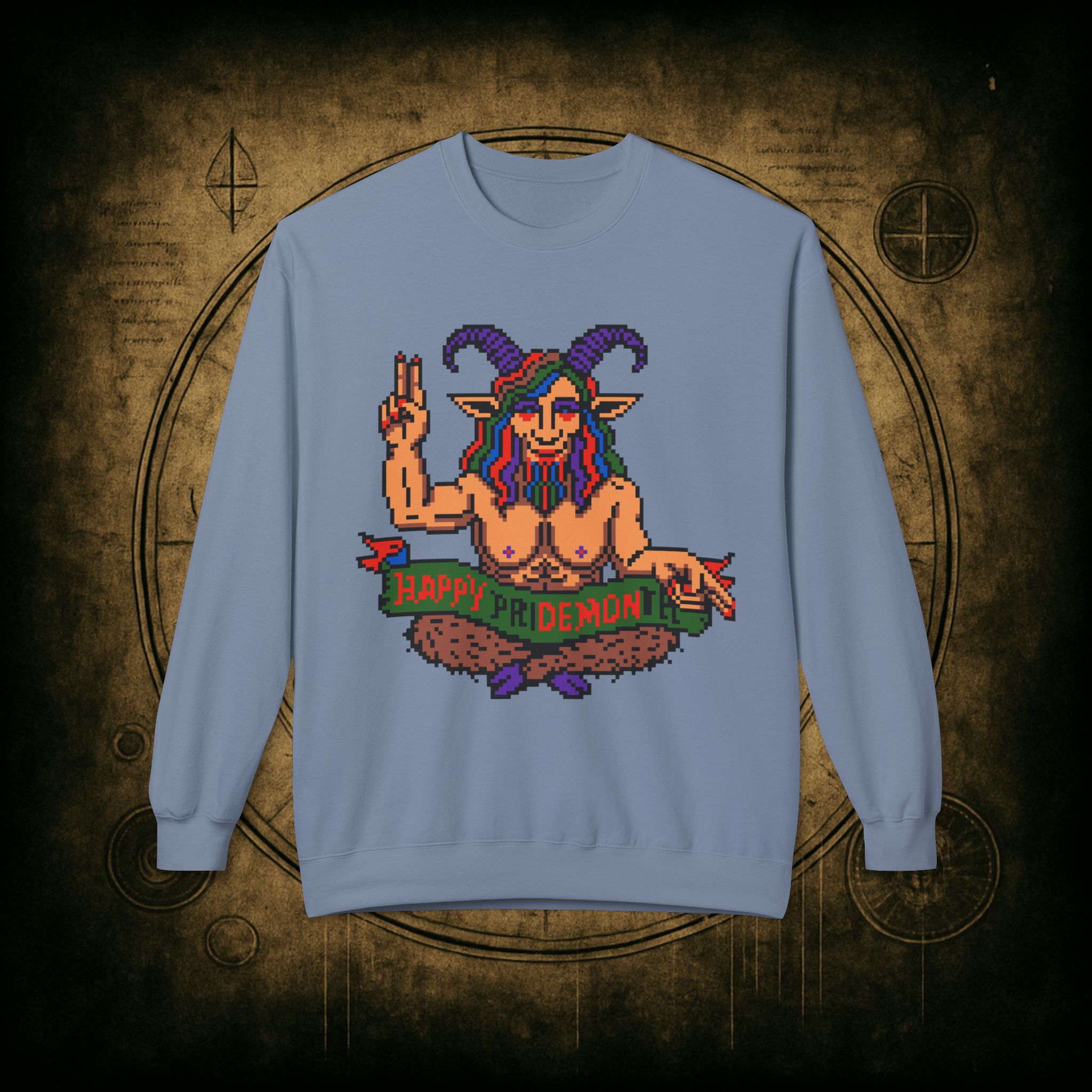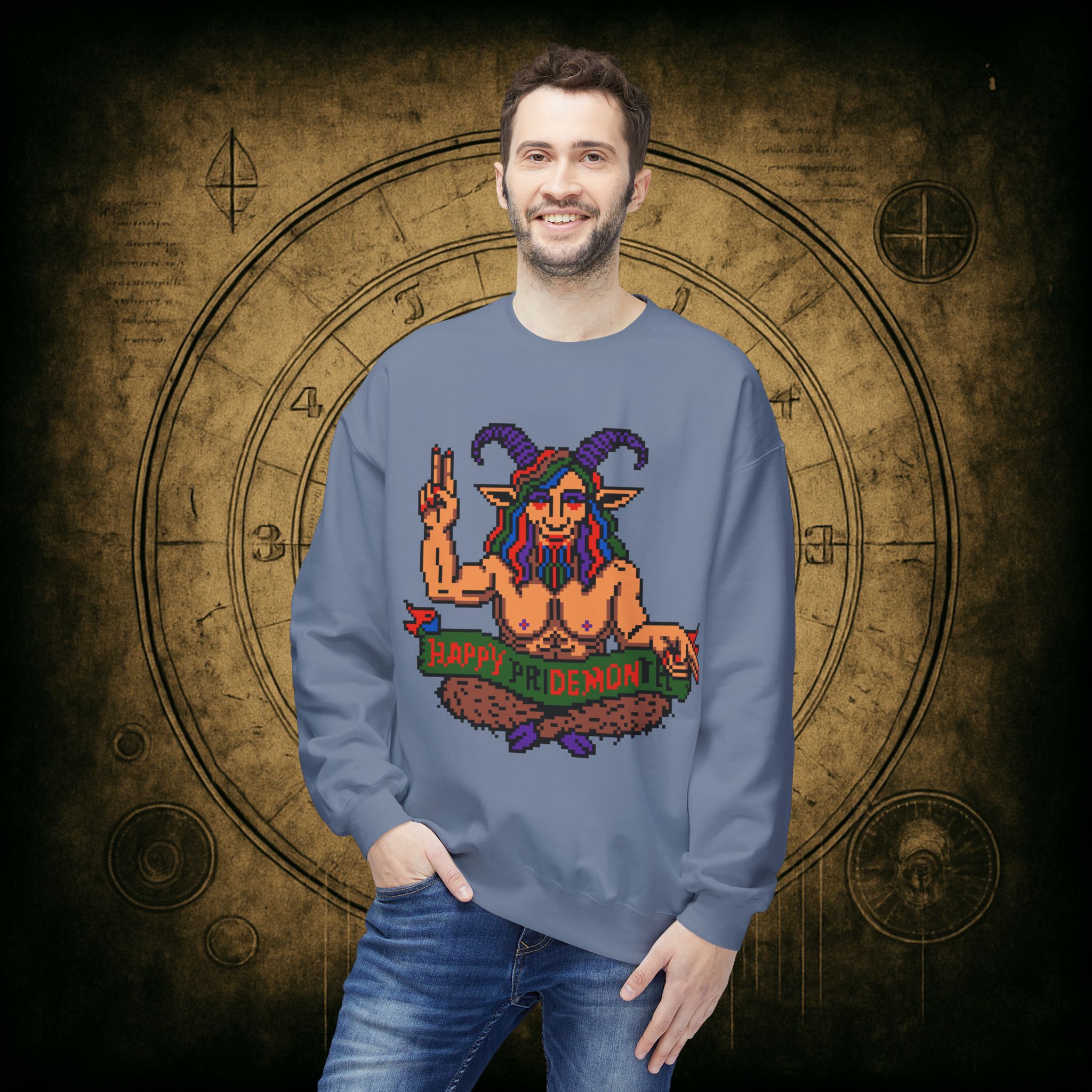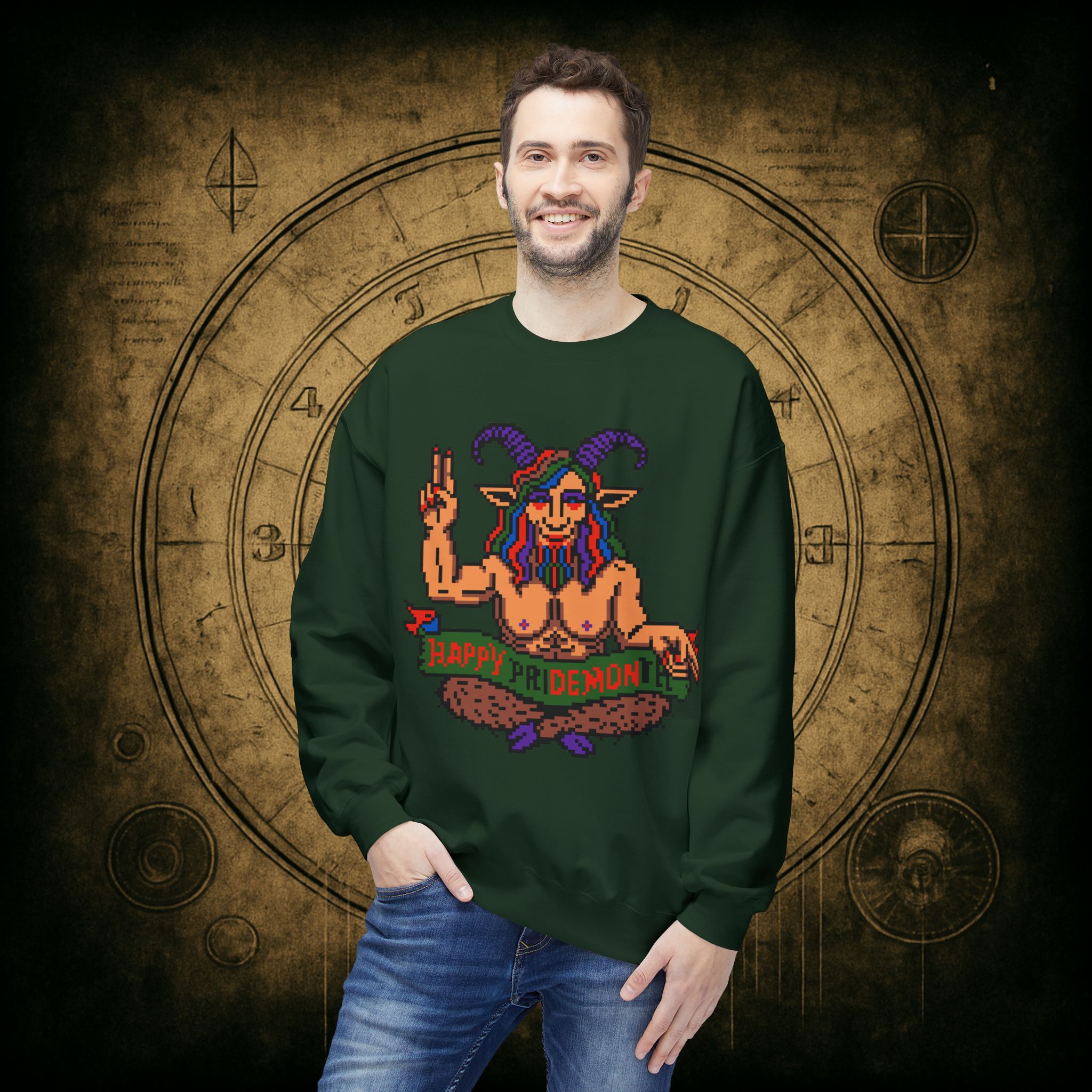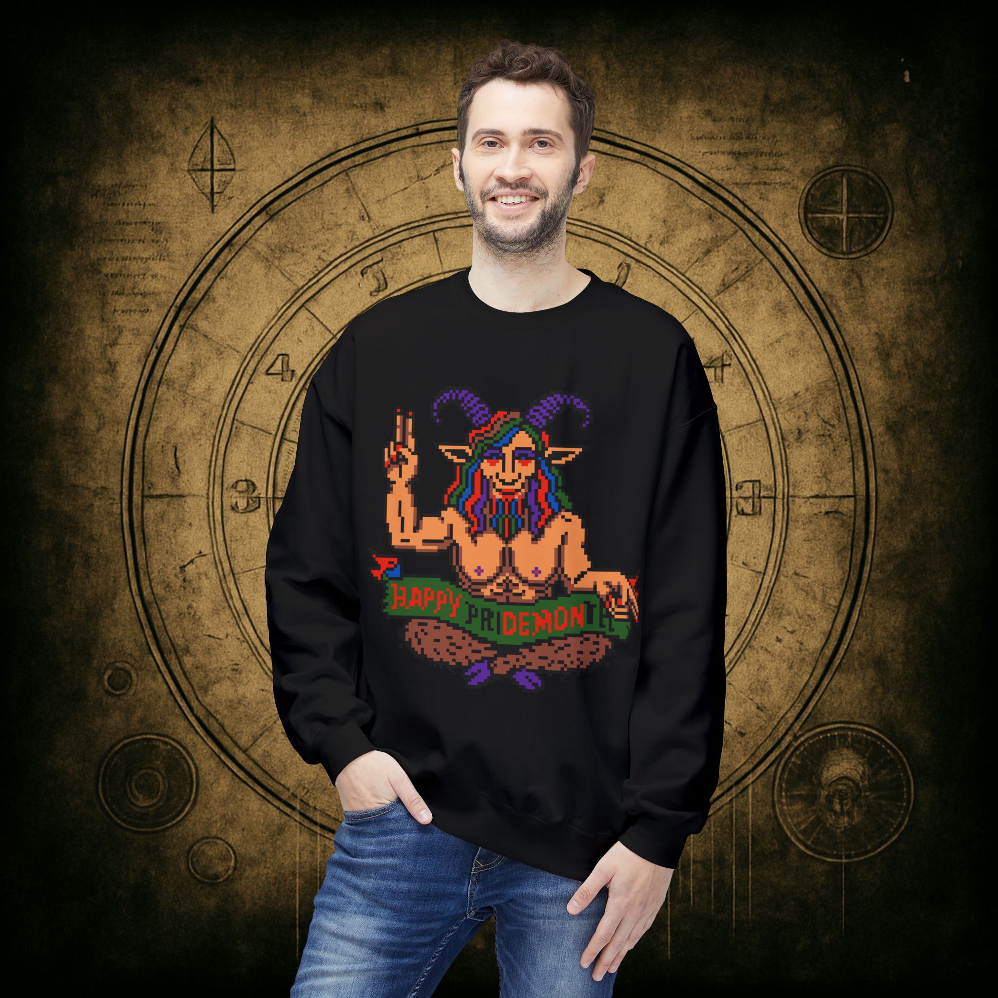 Raise those horns and throw that peace sign, darling, this pixel-perfect pan goat deity is here to serve sass, celebration, and a whole lotta rainbow realness. Whether you’re queer, chaotic, or just vibing with both, this sweatshirt is your official Pride Month invocation attire.