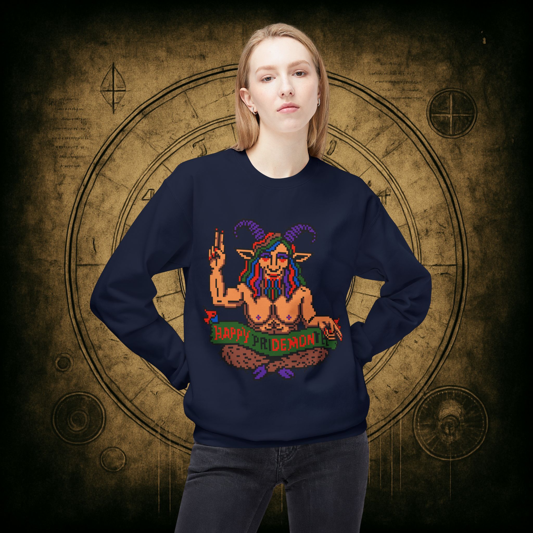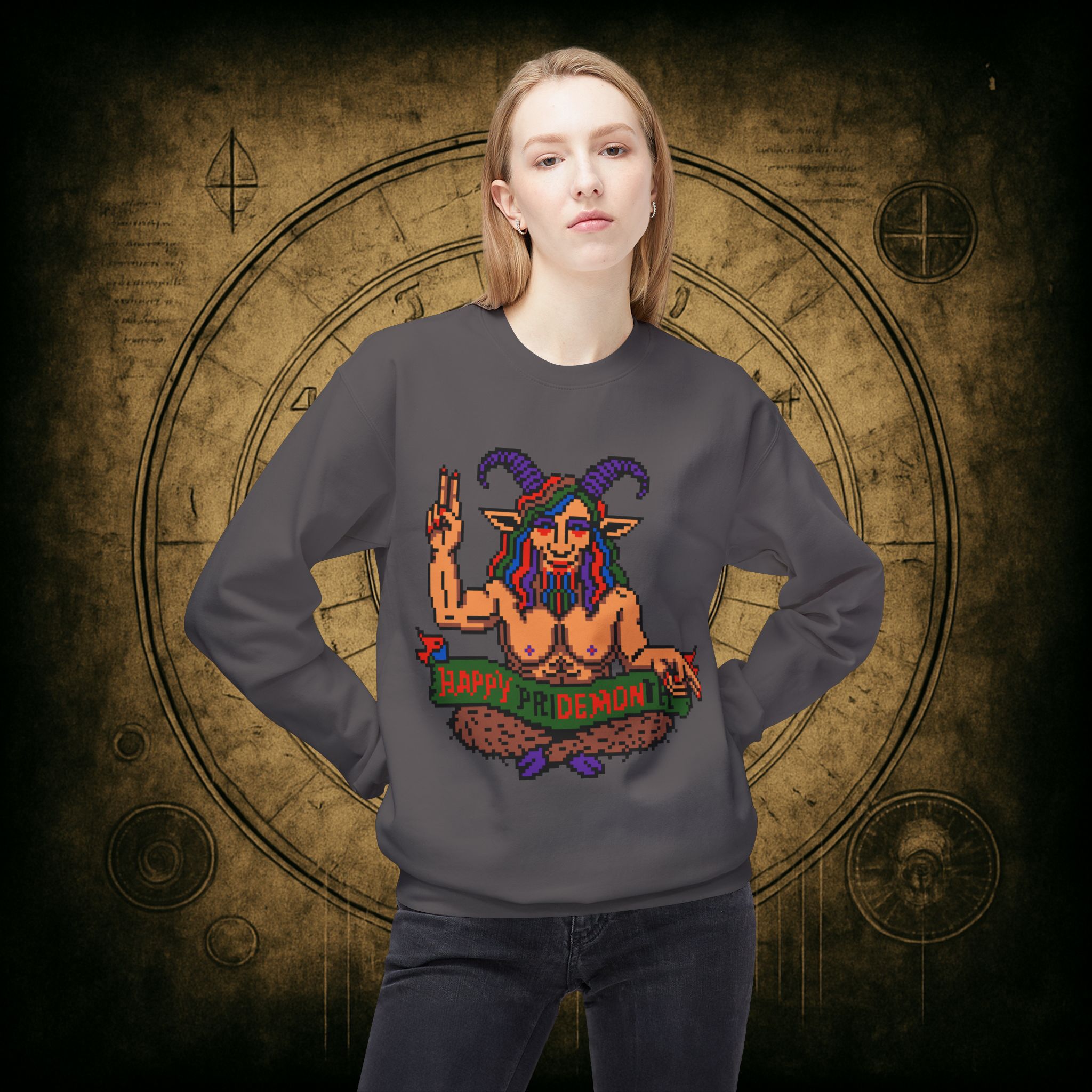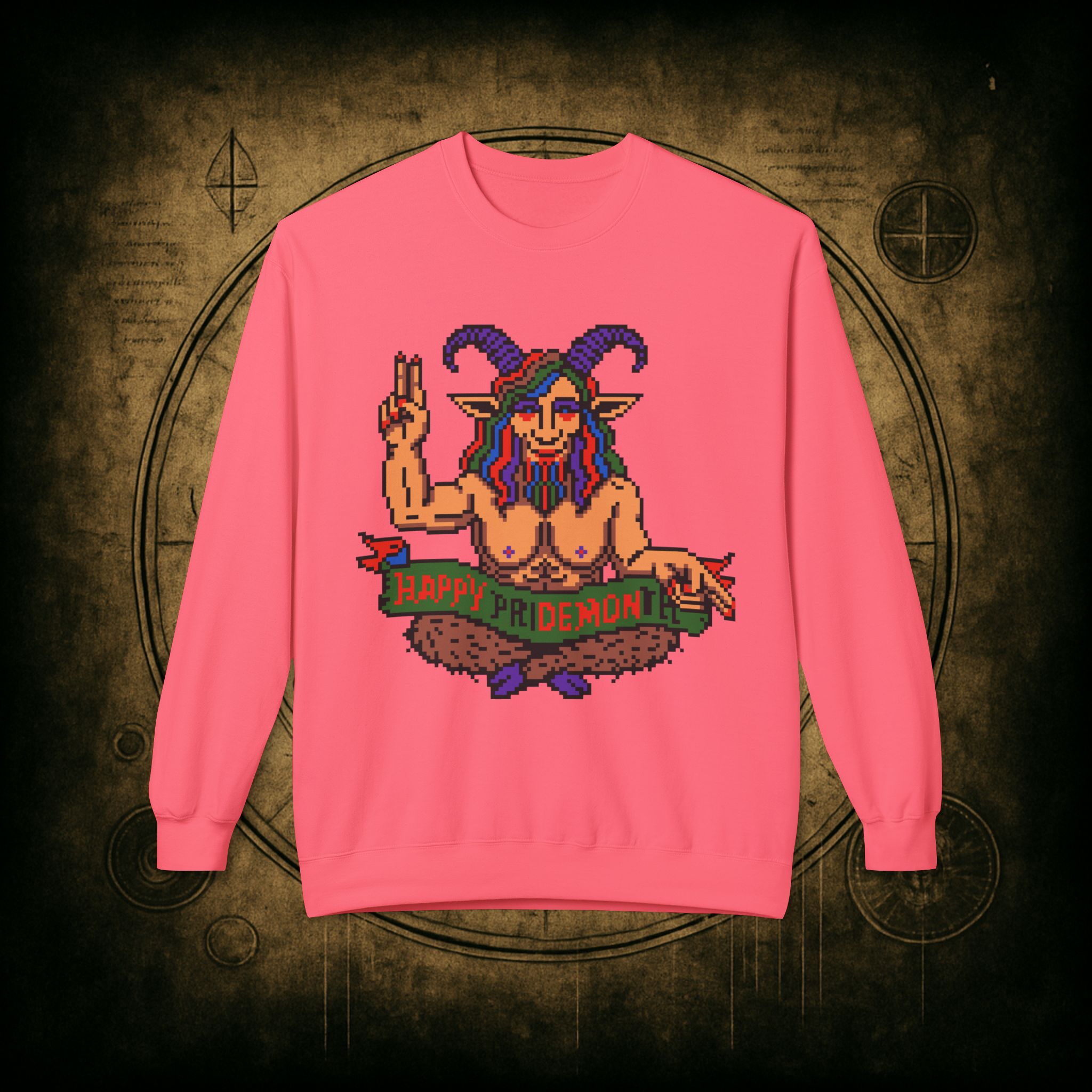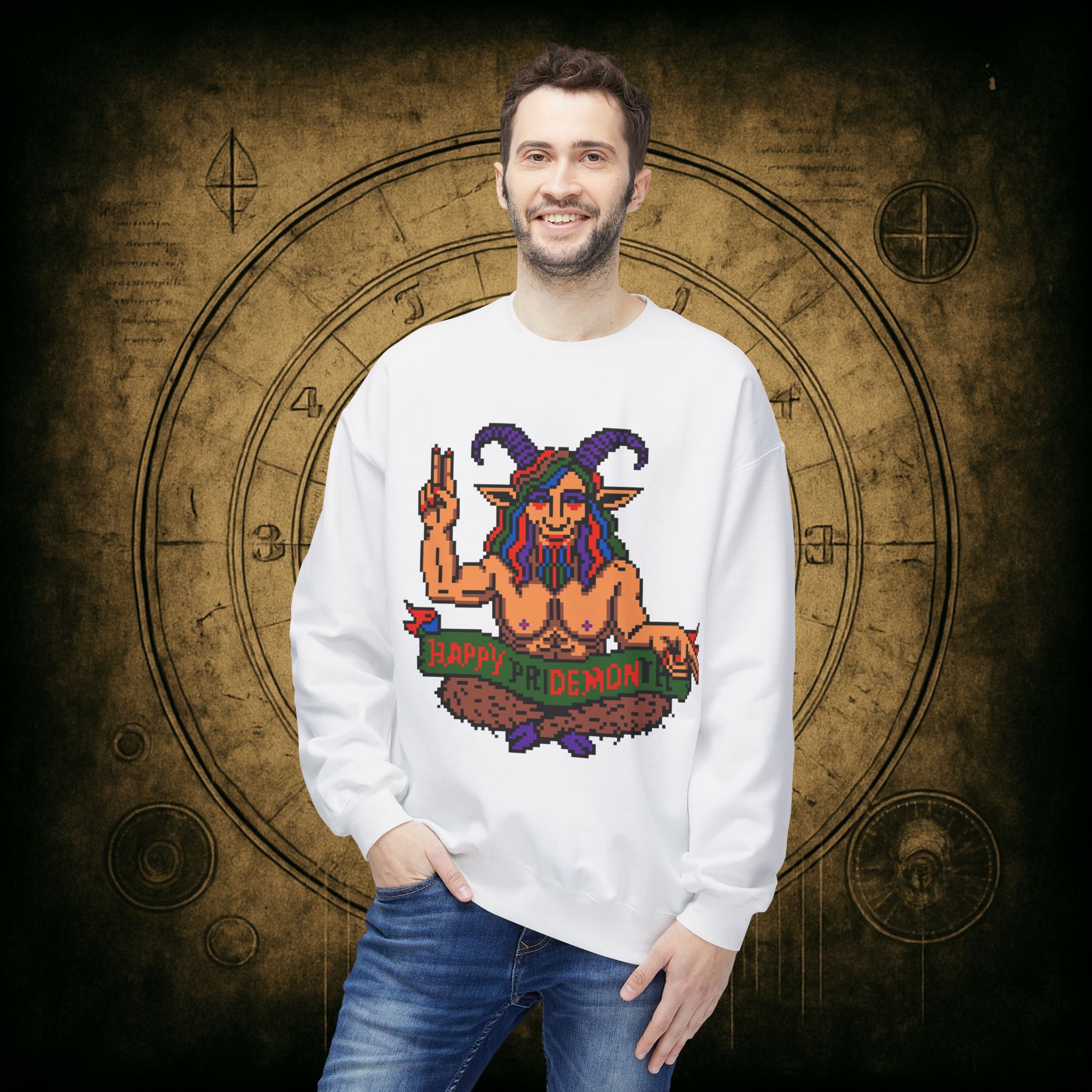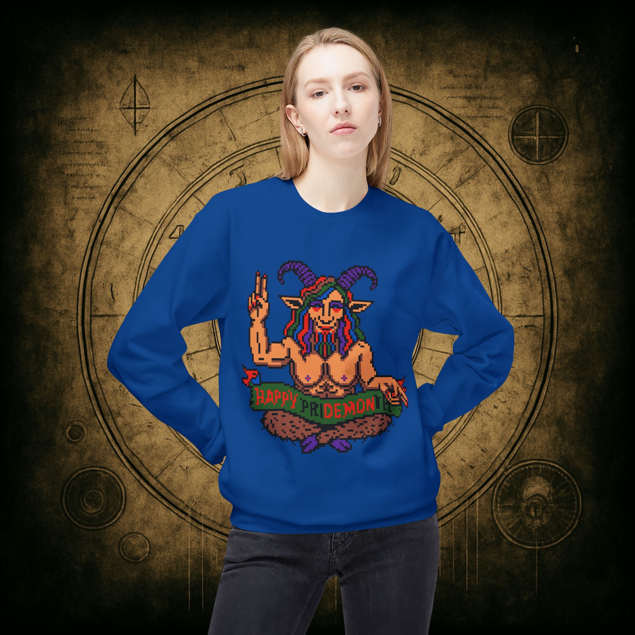 Raise those horns and throw that peace sign, darling, this pixel-perfect pan goat deity is here to serve sass, celebration, and a whole lotta rainbow realness. Whether you’re queer, chaotic, or just vibing with both, this sweatshirt is your official Pride Month invocation attire.