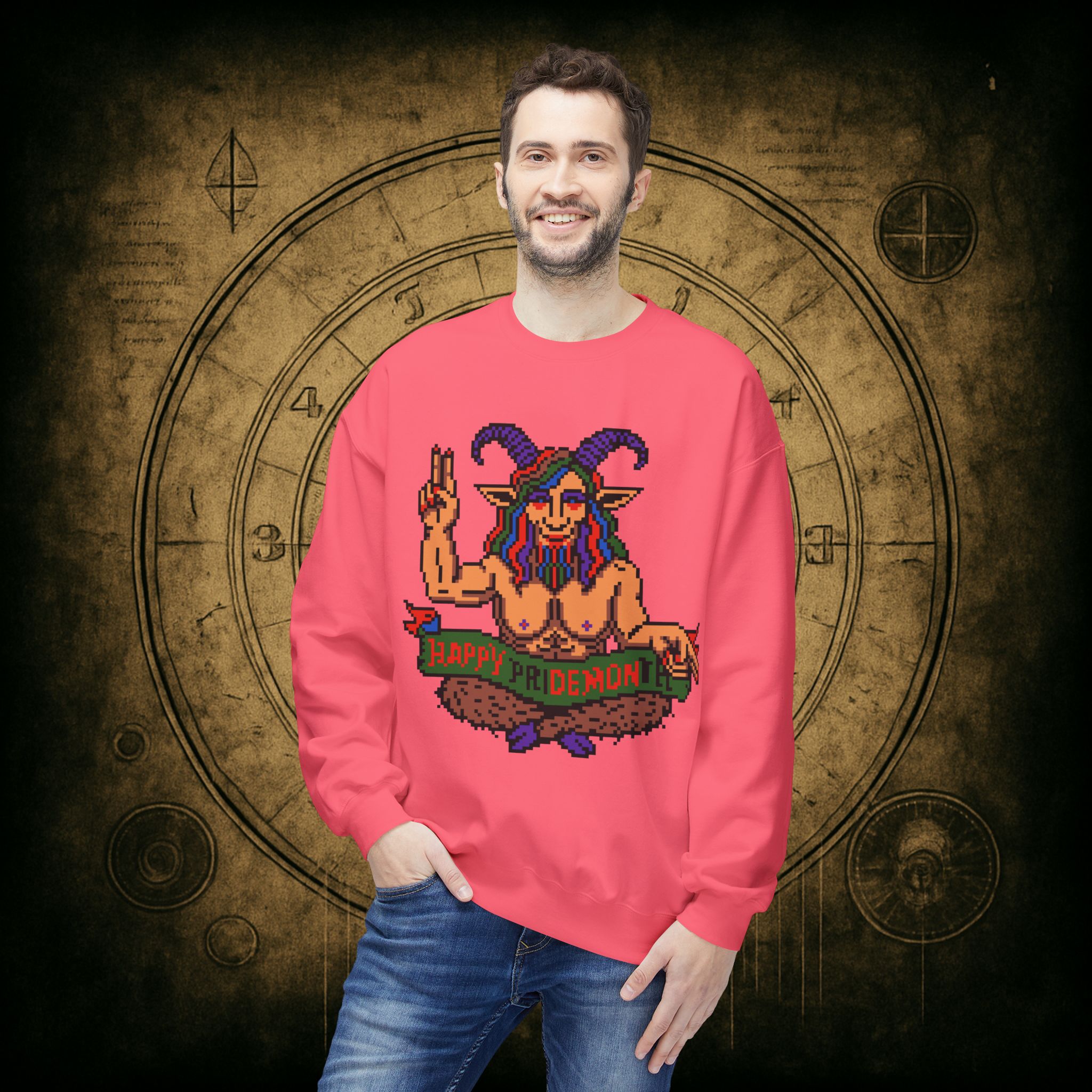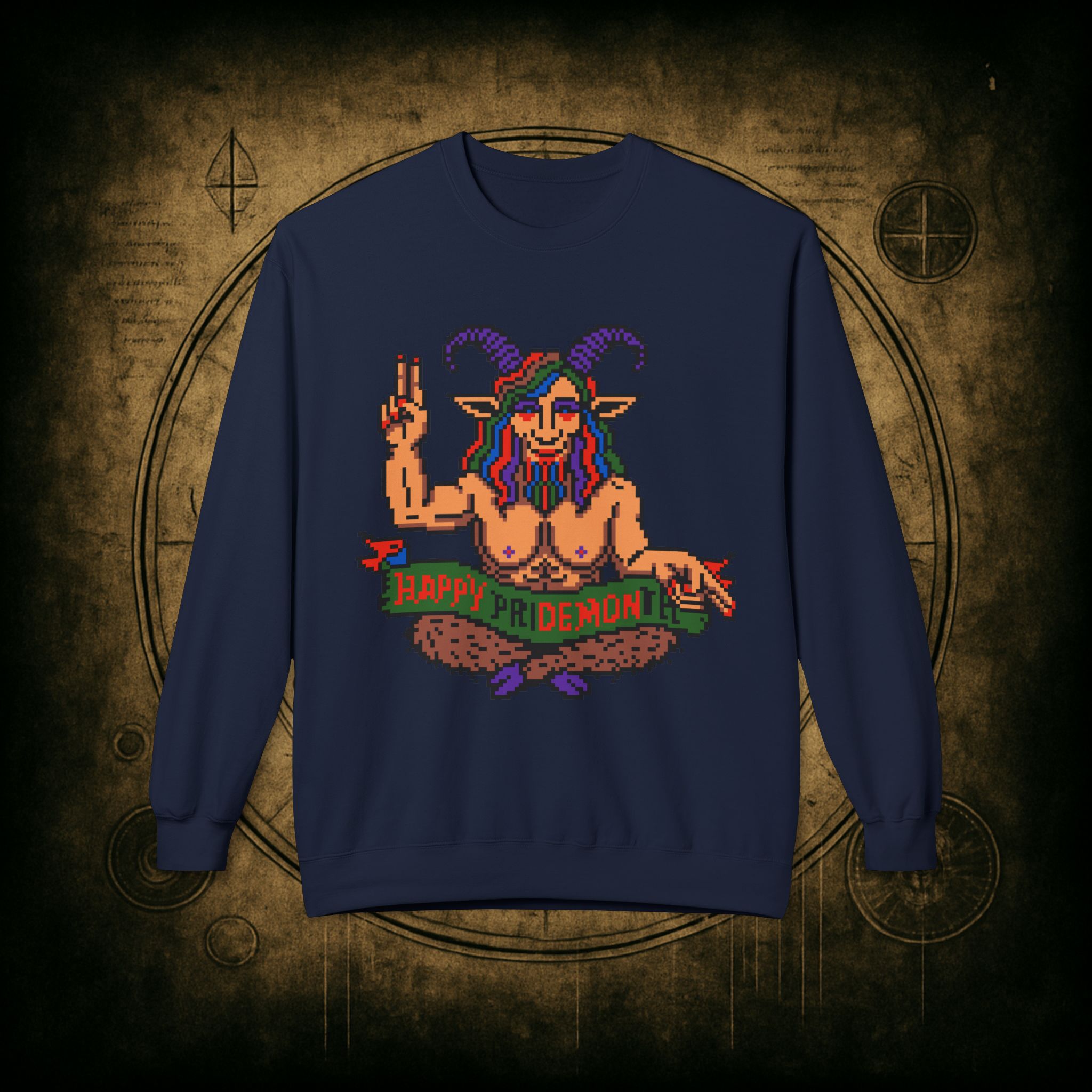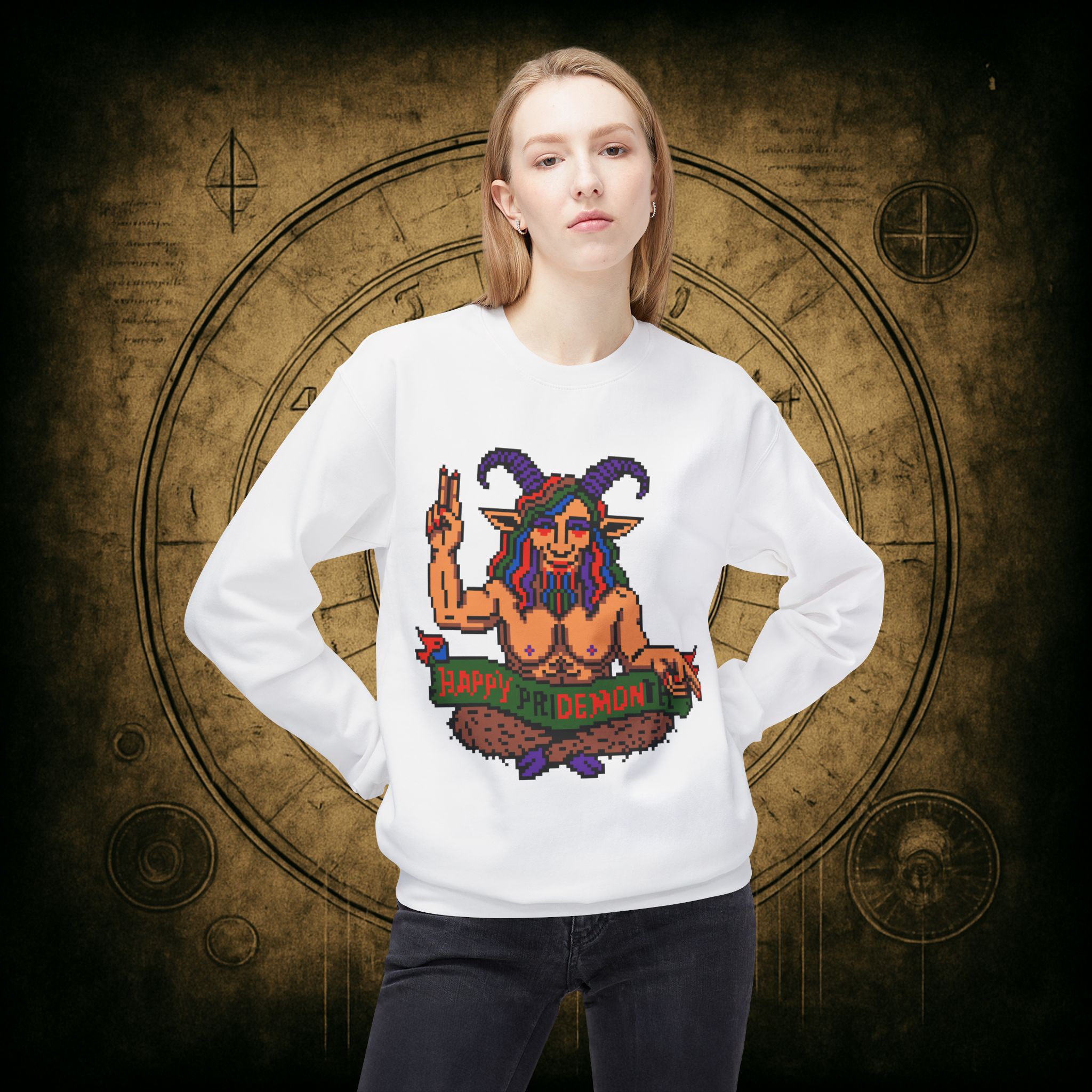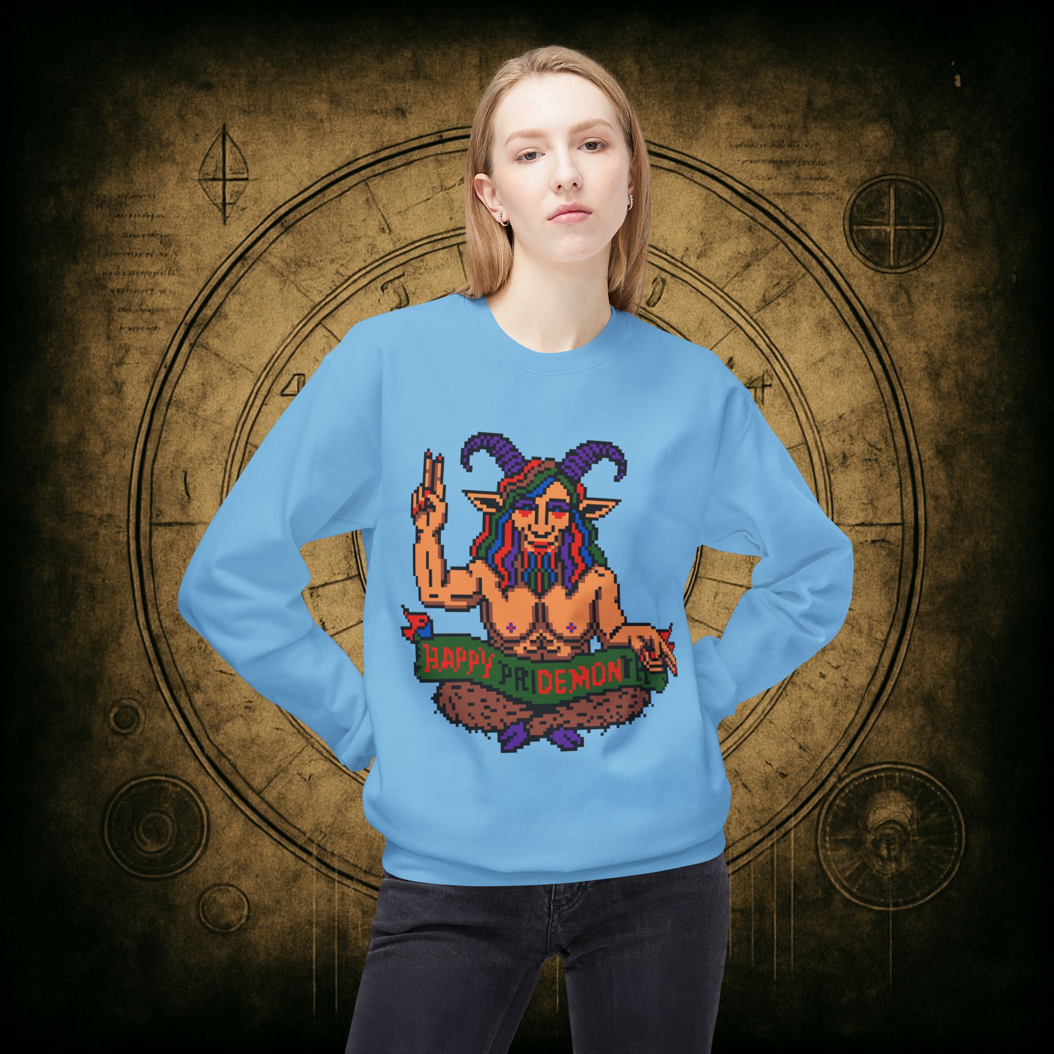 Raise those horns and throw that peace sign, darling, this pixel-perfect pan goat deity is here to serve sass, celebration, and a whole lotta rainbow realness. Whether you’re queer, chaotic, or just vibing with both, this sweatshirt is your official Pride Month invocation attire.