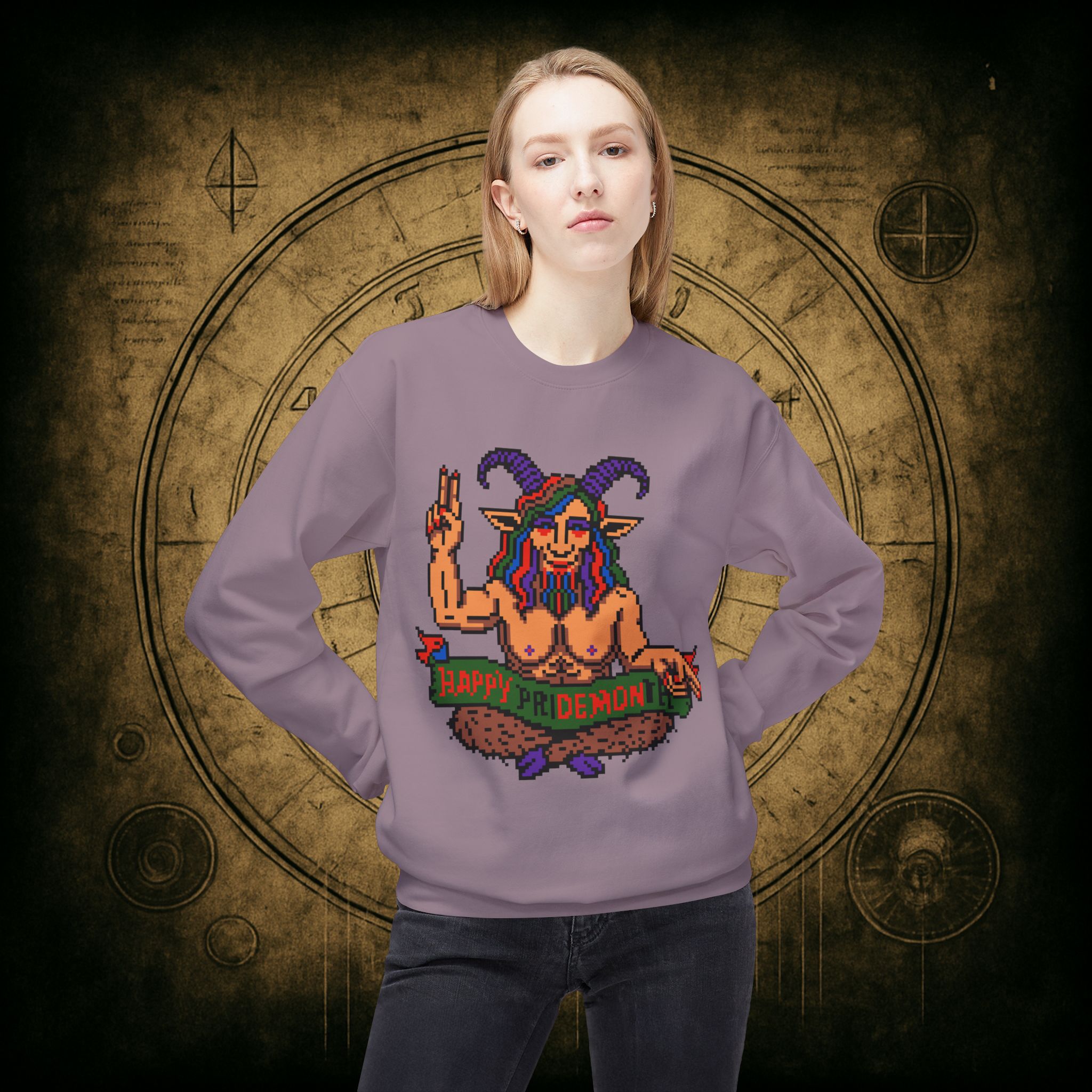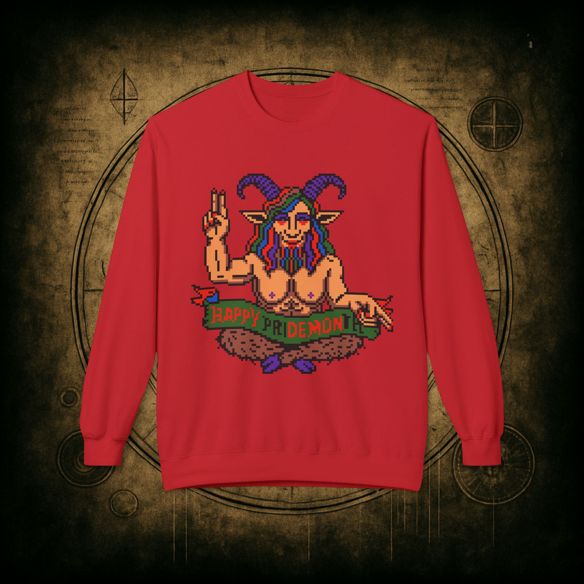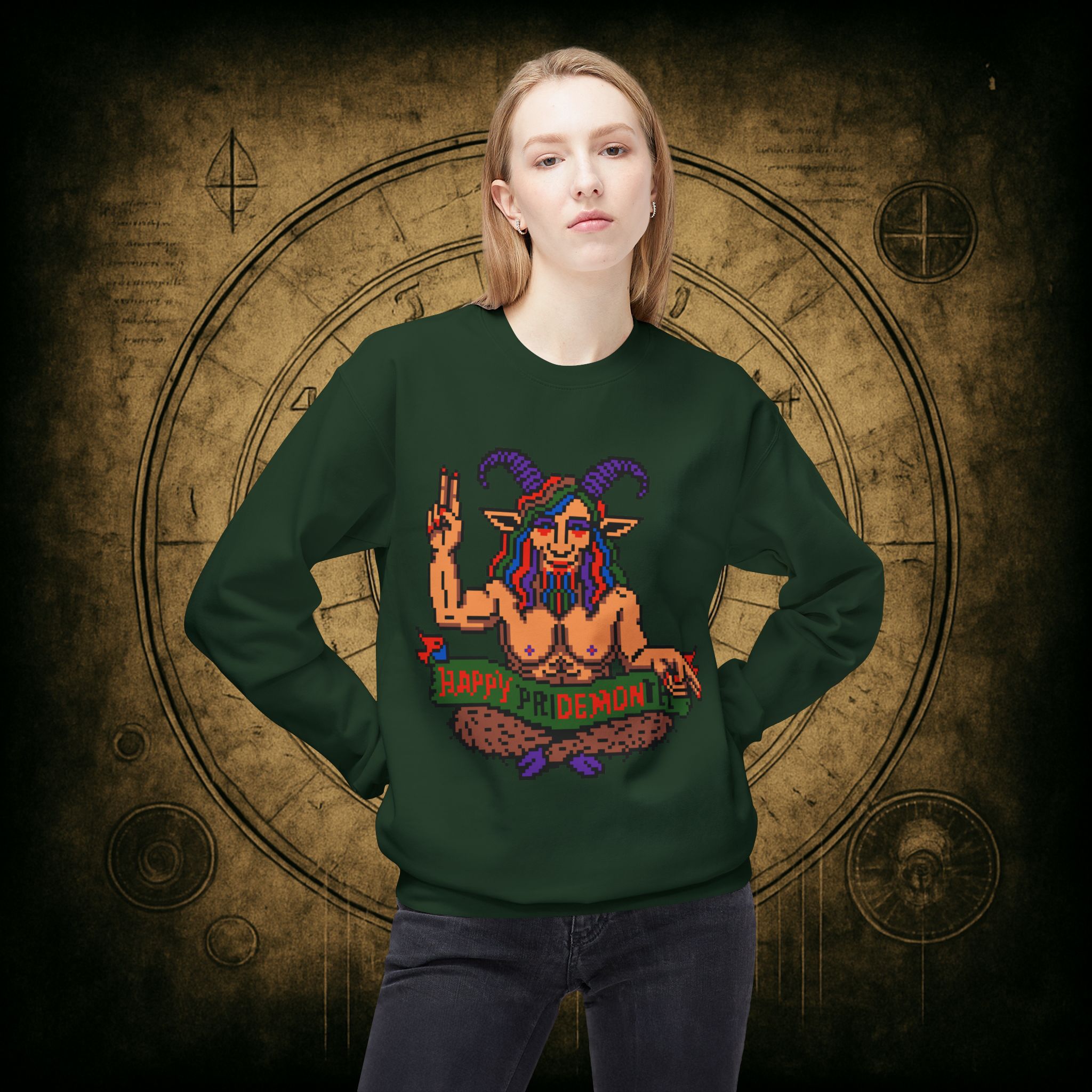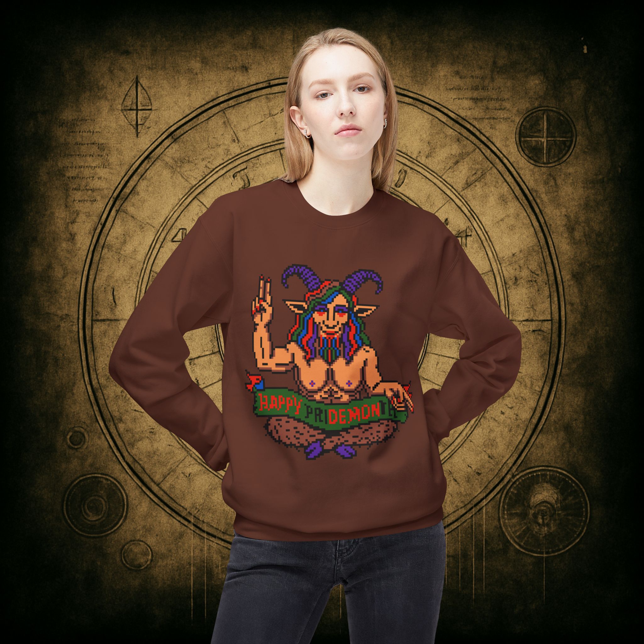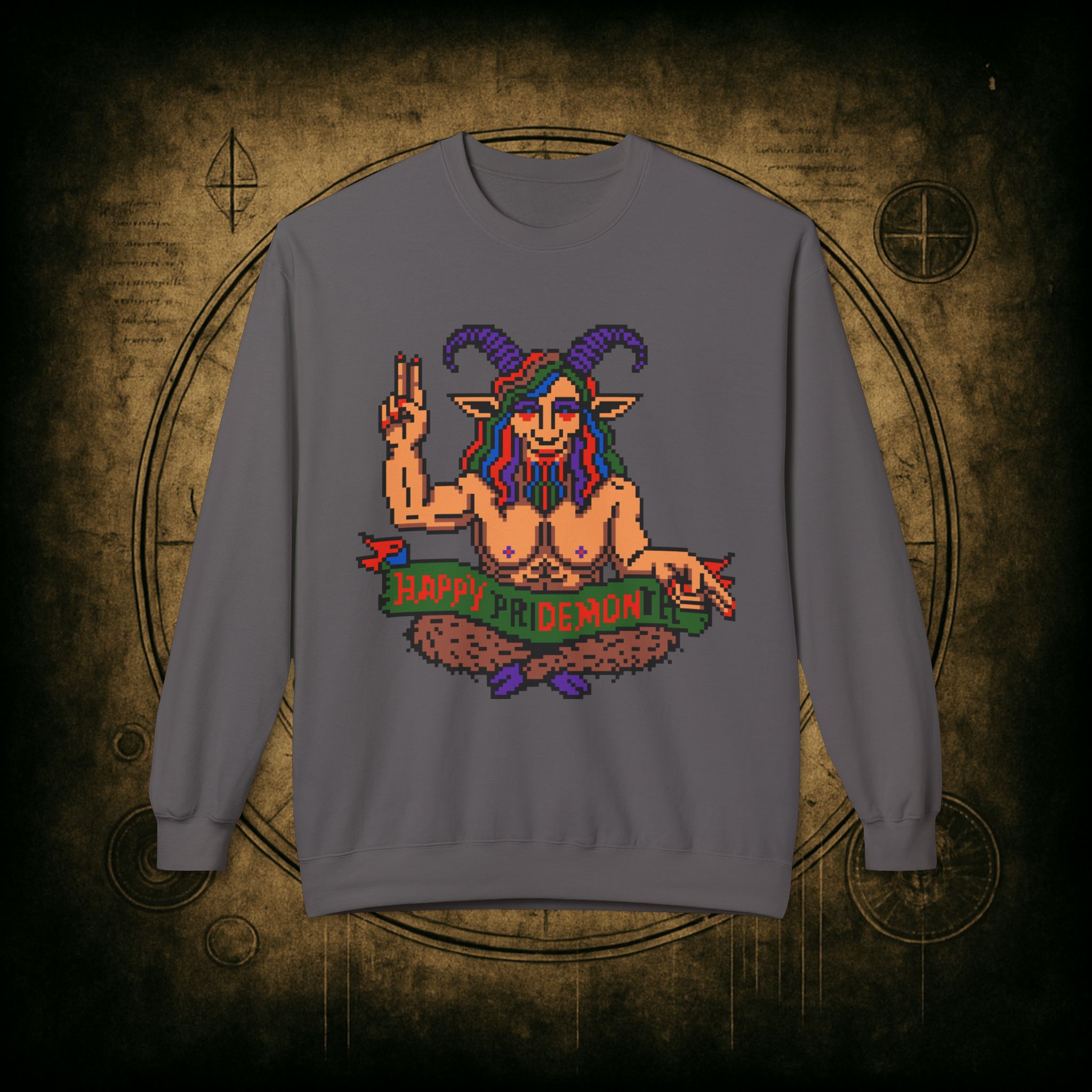 Raise those horns and throw that peace sign, darling, this pixel-perfect pan goat deity is here to serve sass, celebration, and a whole lotta rainbow realness. Whether you’re queer, chaotic, or just vibing with both, this sweatshirt is your official Pride Month invocation attire.