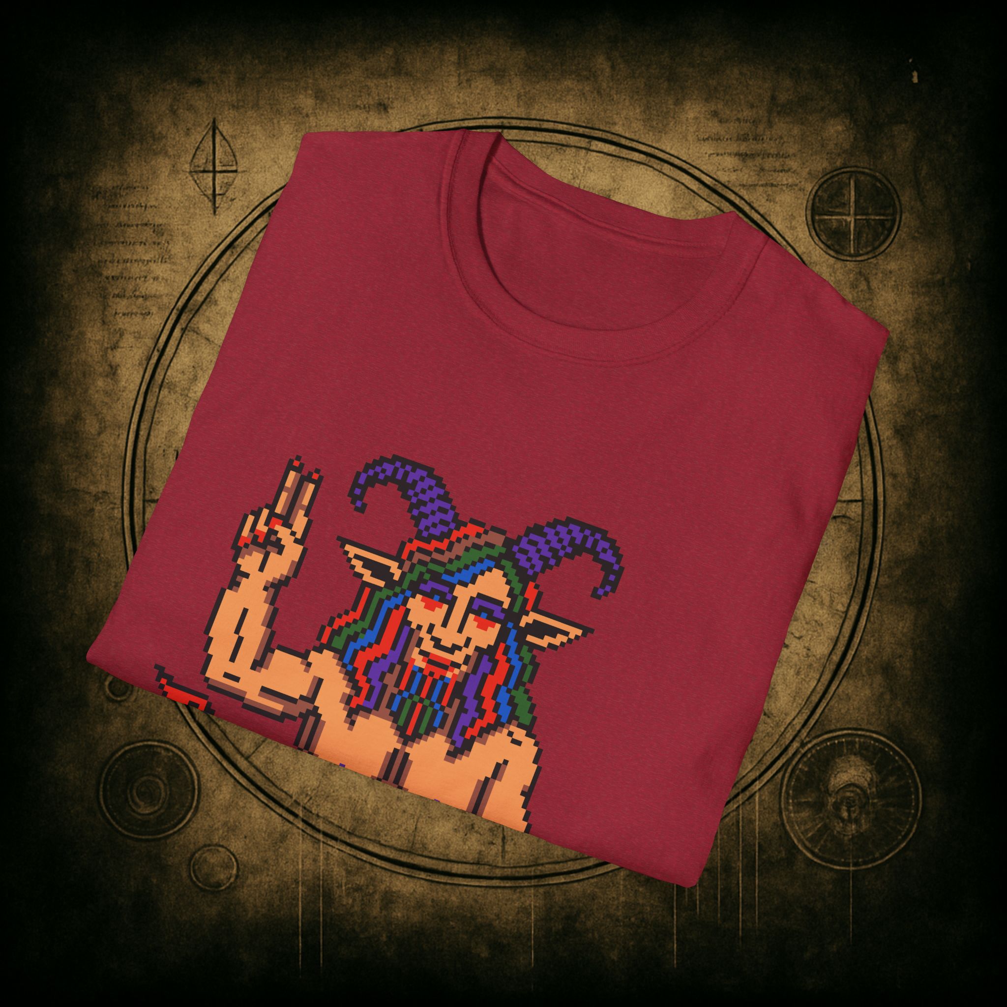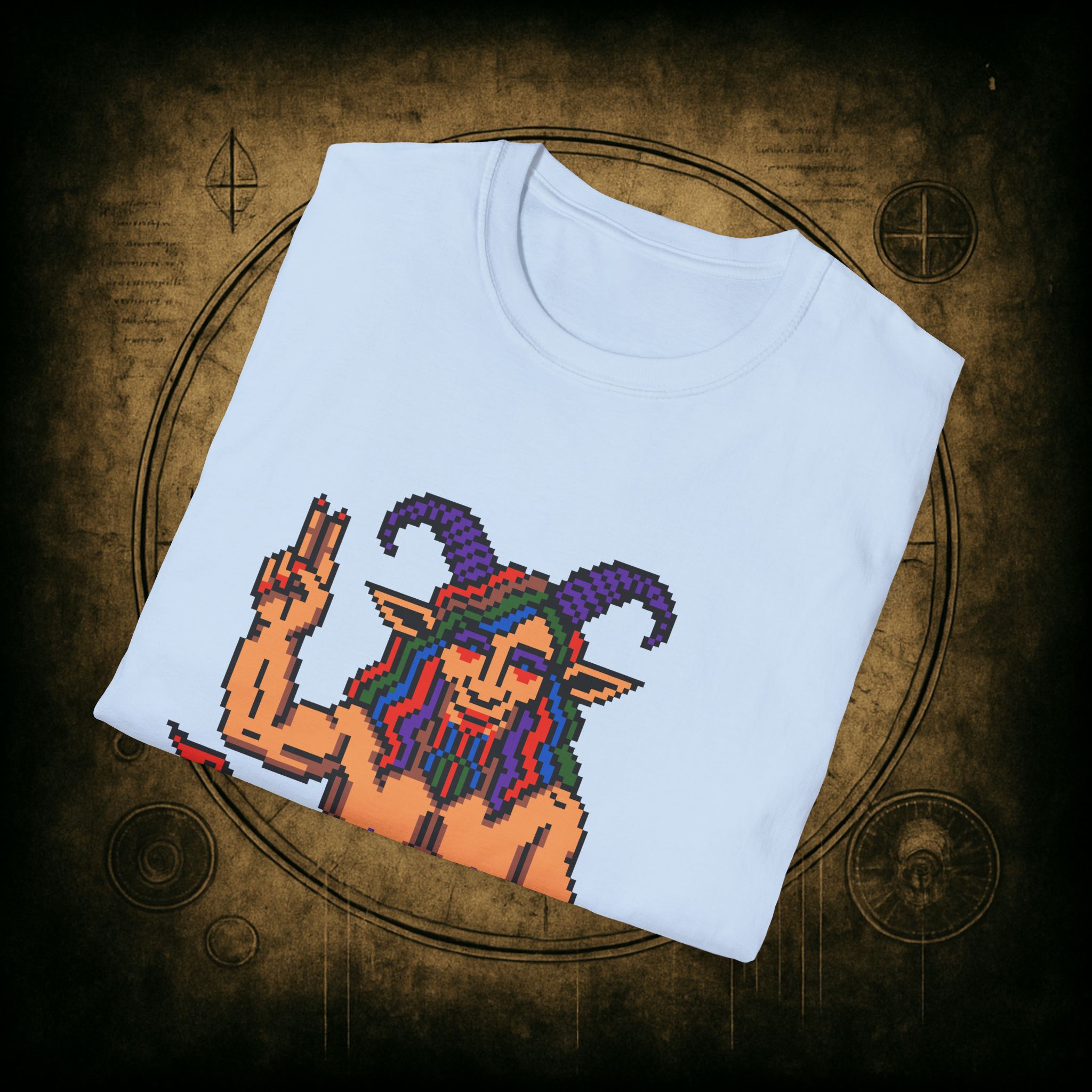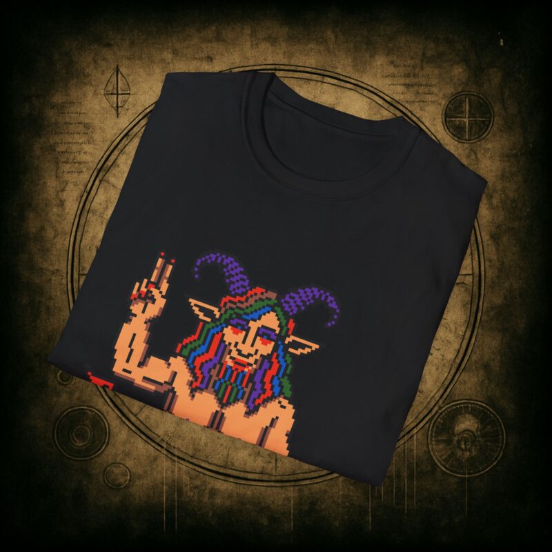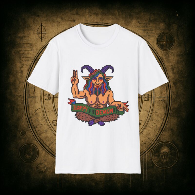 Clad in pixel art pride, throwing double peace signs, and flaunting luscious locks in every flag color imaginable, this demonic deity isn’t here to pass judgment, just vibes and glitter curses.