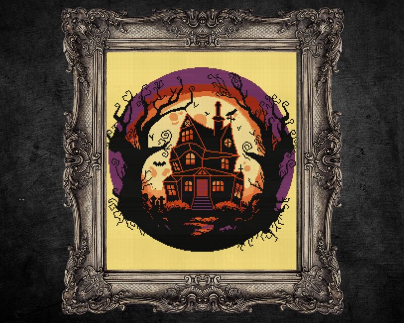 This modern cross stitch pattern featuring a meticulously detailed design of a haunted mansion, shrouded in mist and darkness, with twisted trees looming in the background and a ghostly full moon casting its light over a nearby cemetery. This pattern captures the essence of the macabre, the perfect blend of fear and beauty, and it’s perfect for those who are fans of the gothic horror genre, H.P Lovecraft works, Edgar Allan Poe, Stephen King and similar authors, and for those who enjoy the feeling of being creeped out.