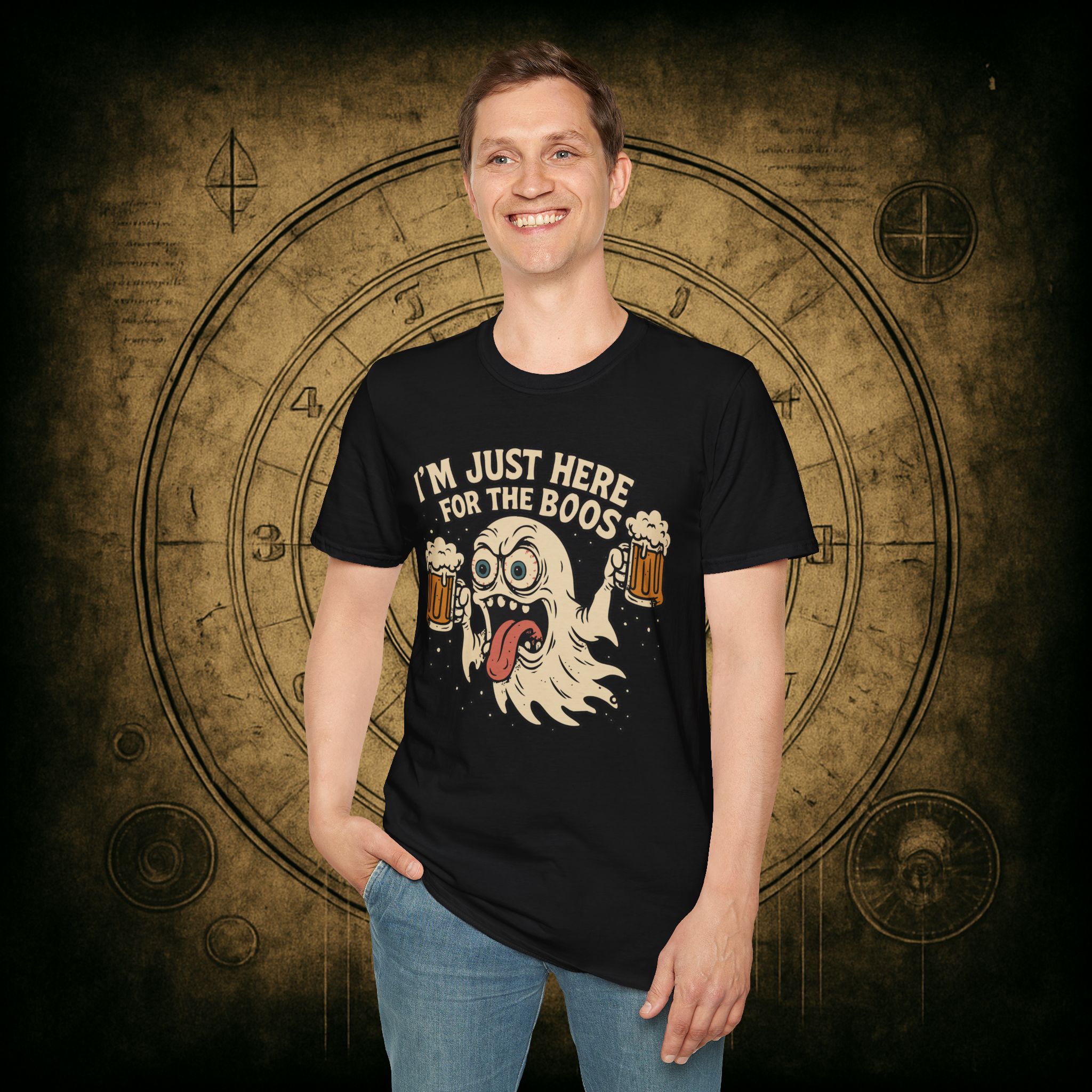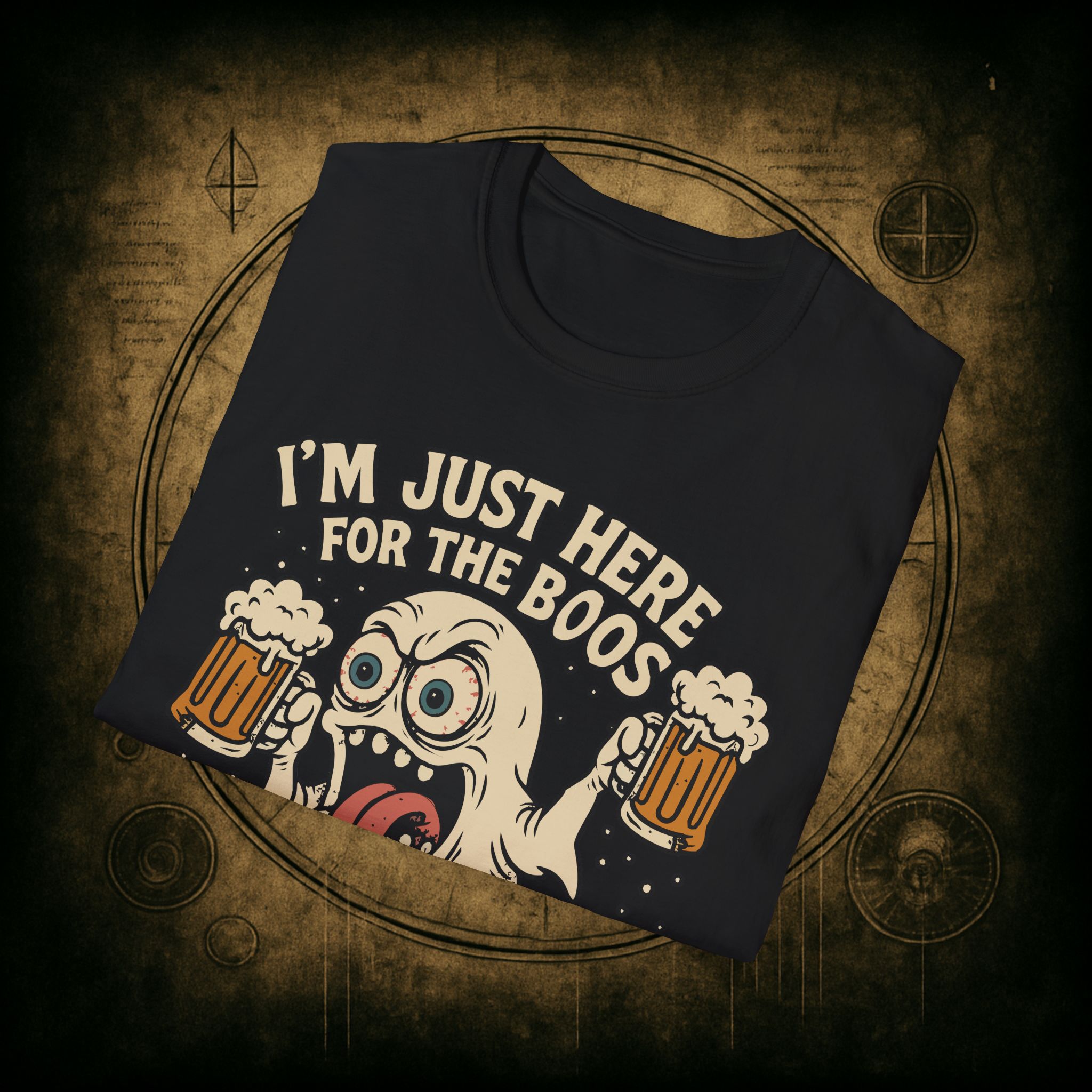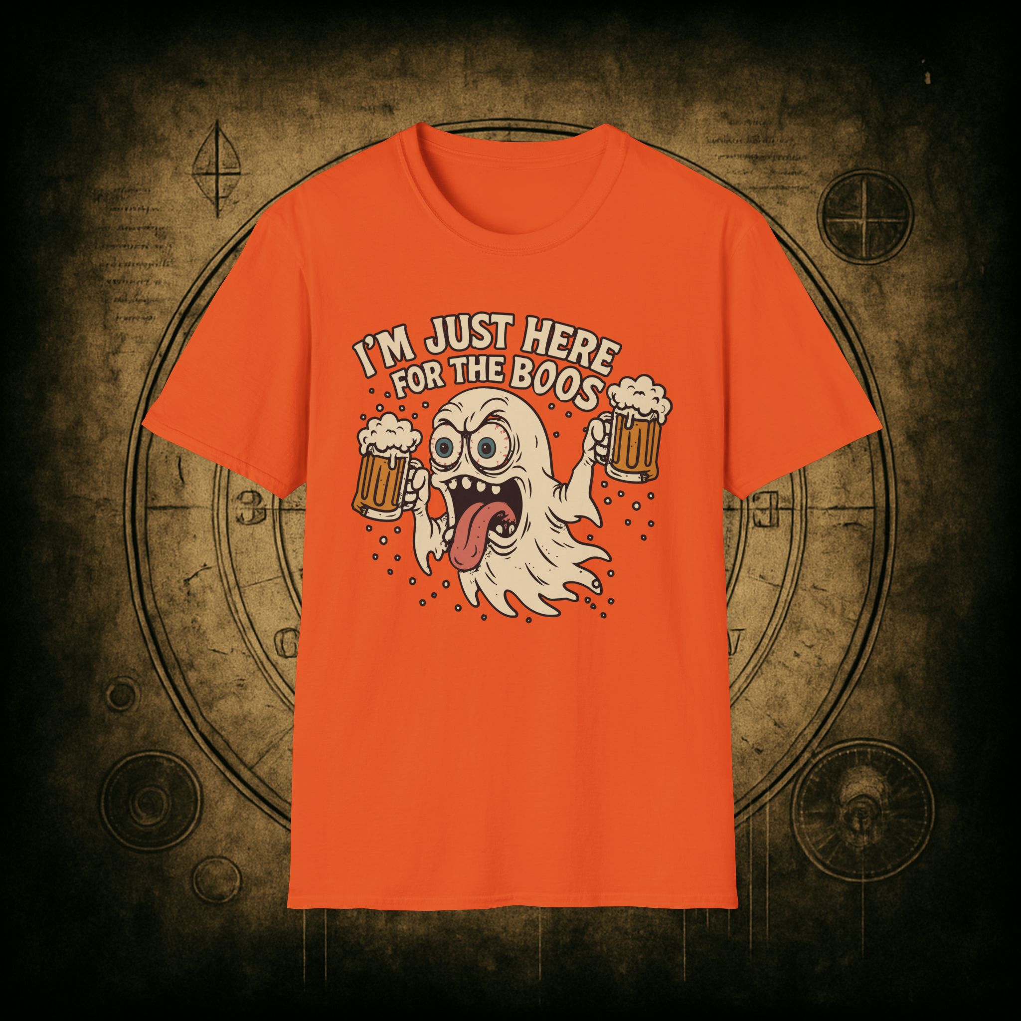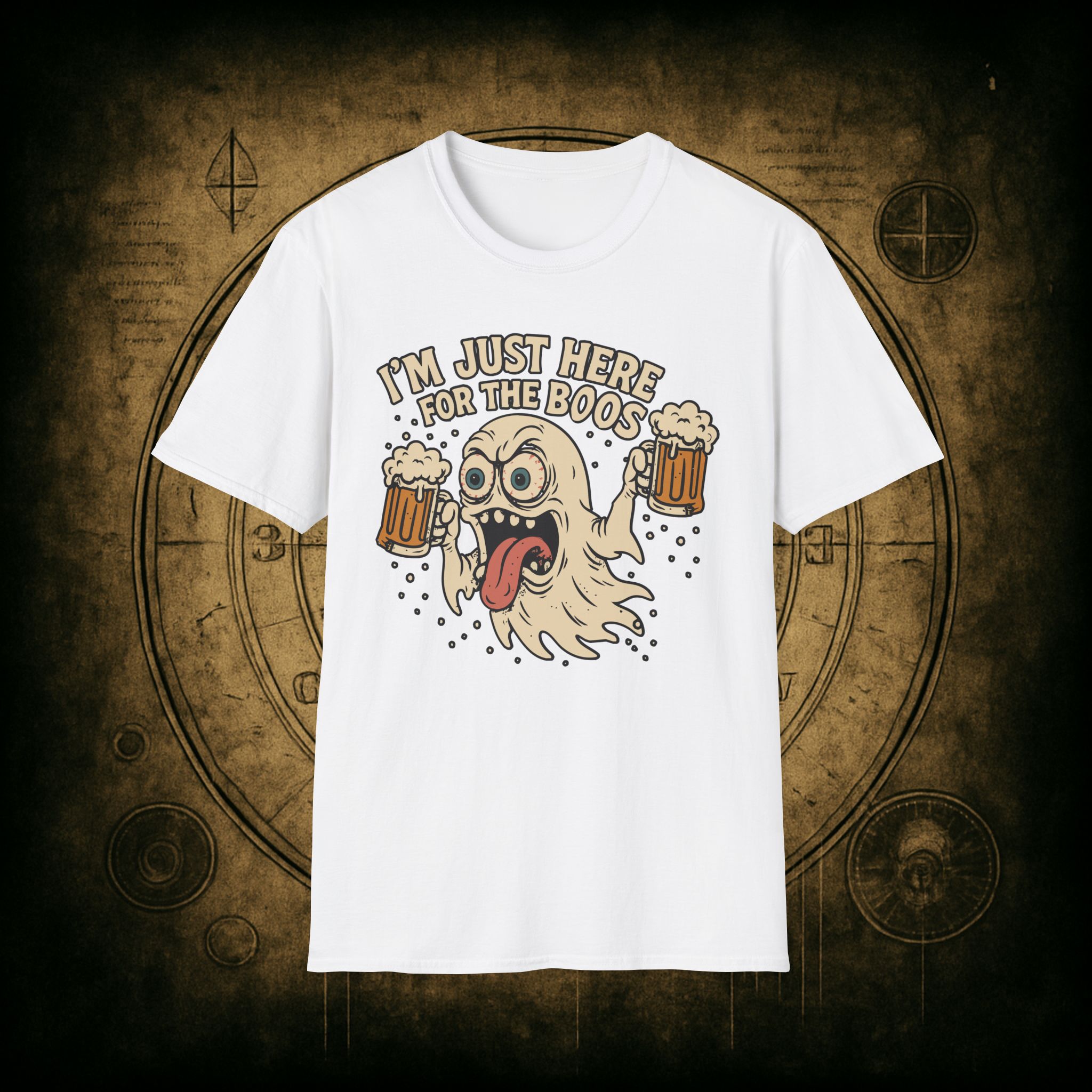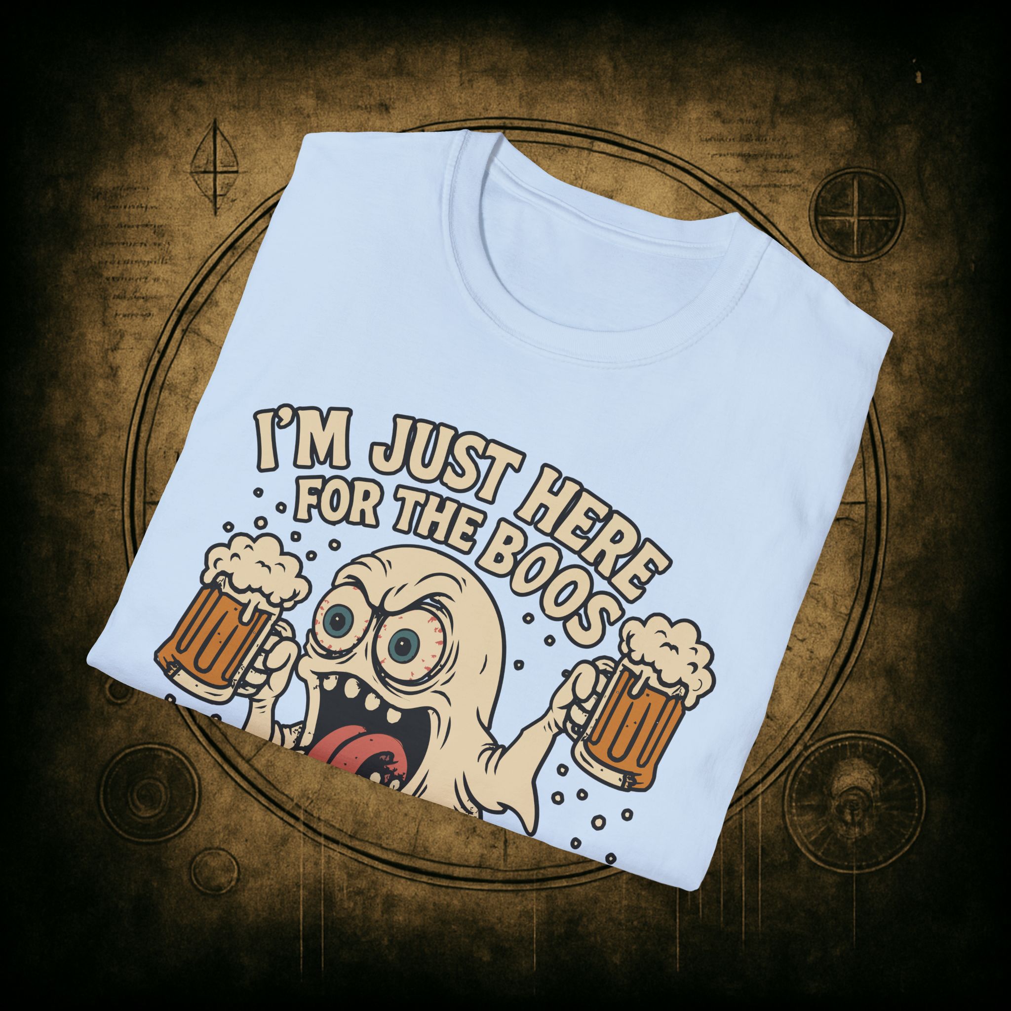 This T-Shirt is perfect for those who love a good pun, featuring a funny and snarky design with an alcoholic ghost saying ‘I’m just Here for the Boos’. It gives off a playful and lighthearted vibe, making it a great conversation starter. Ideal for ghosts who enjoy humor and relaxed style, this T-Shirt is perfect for Halloween, parties, or casual outings.