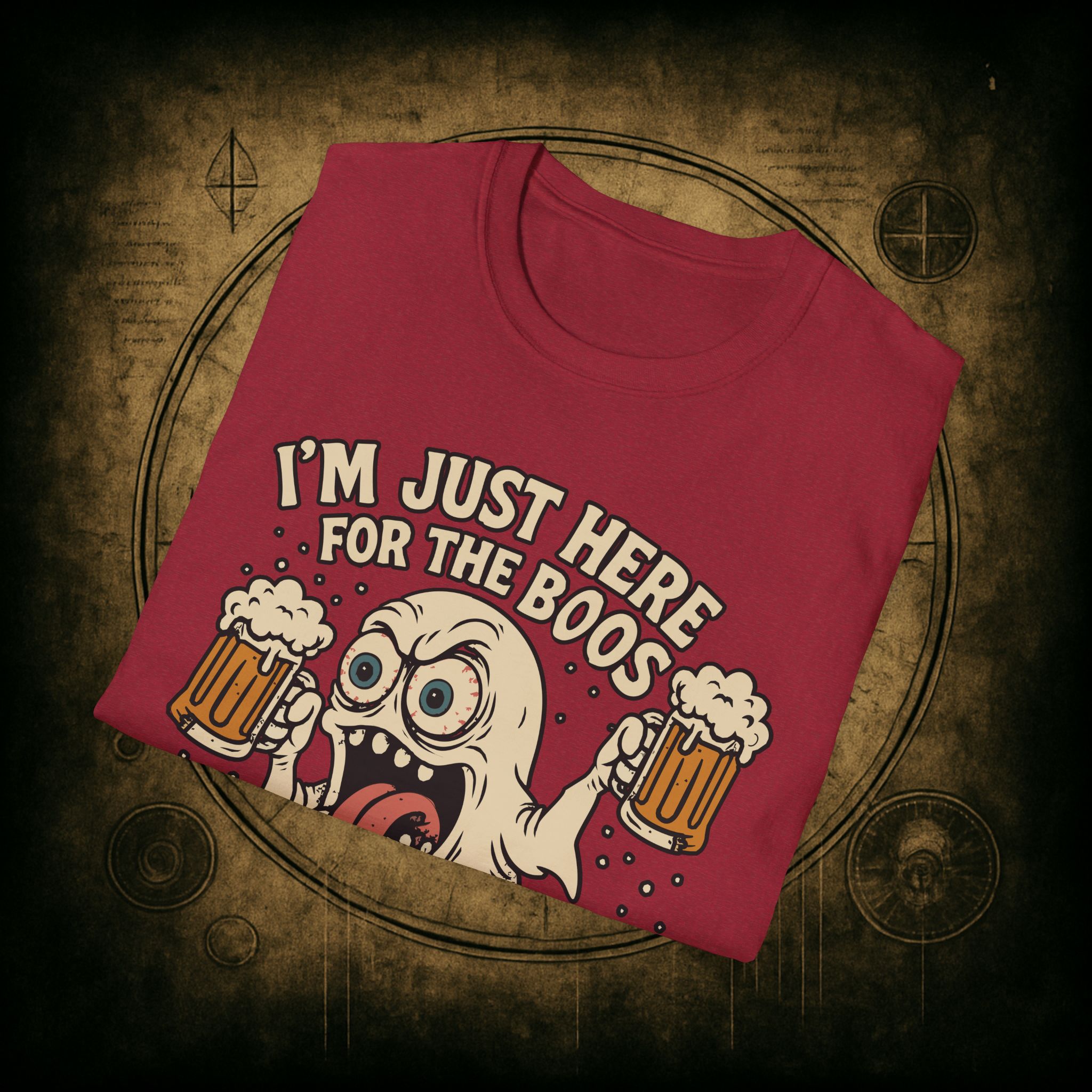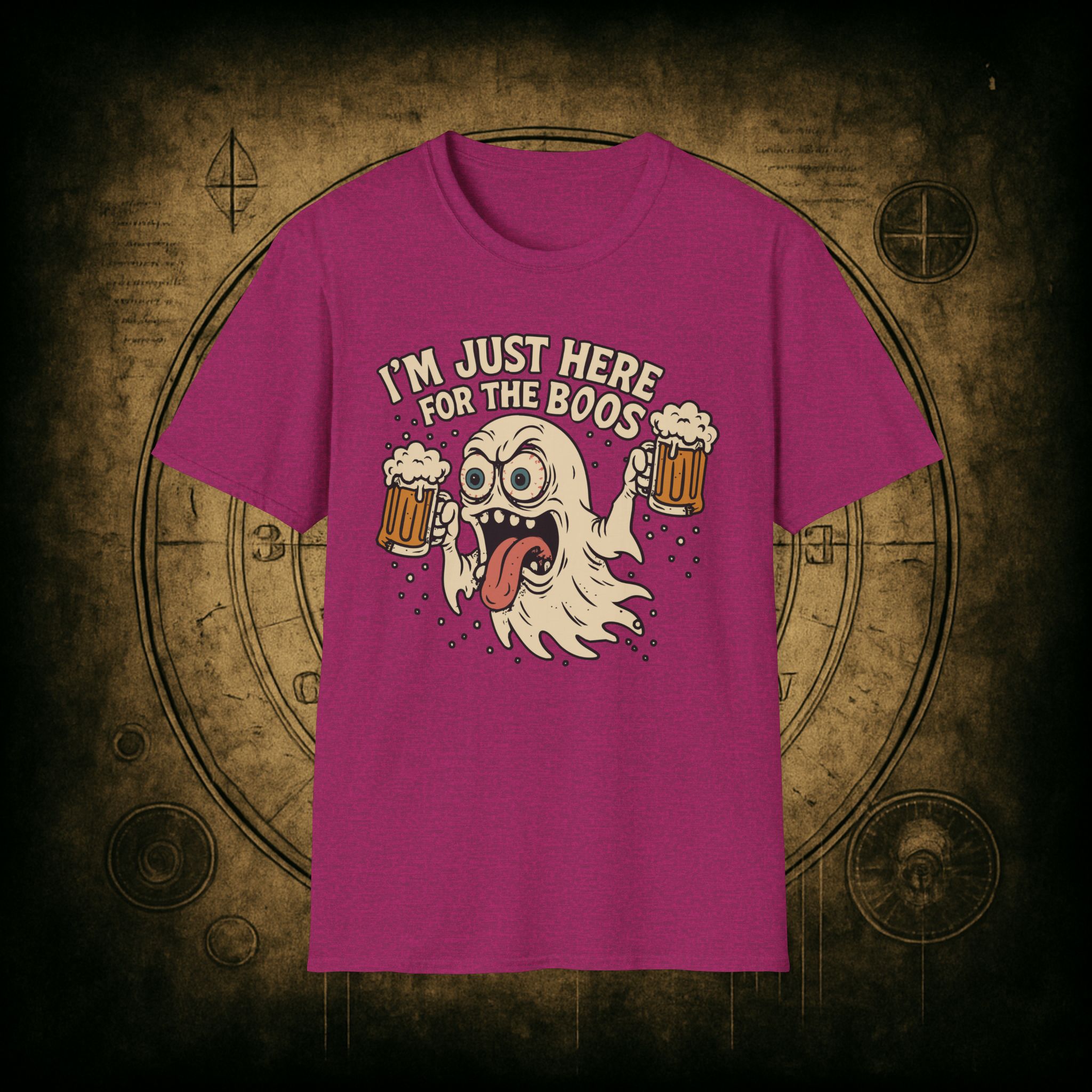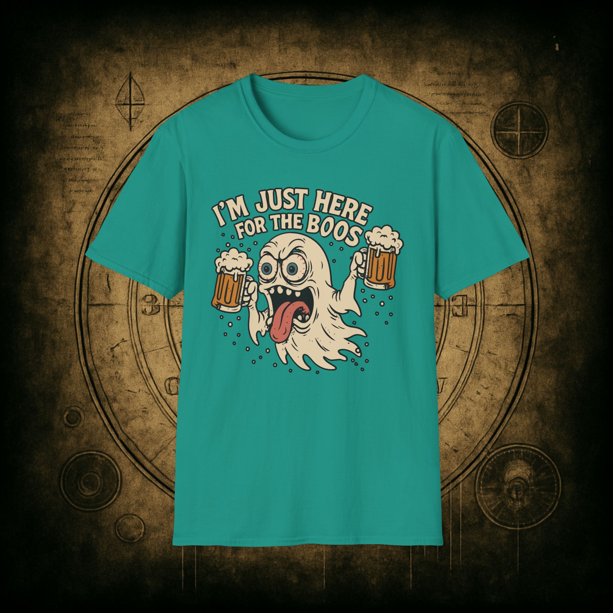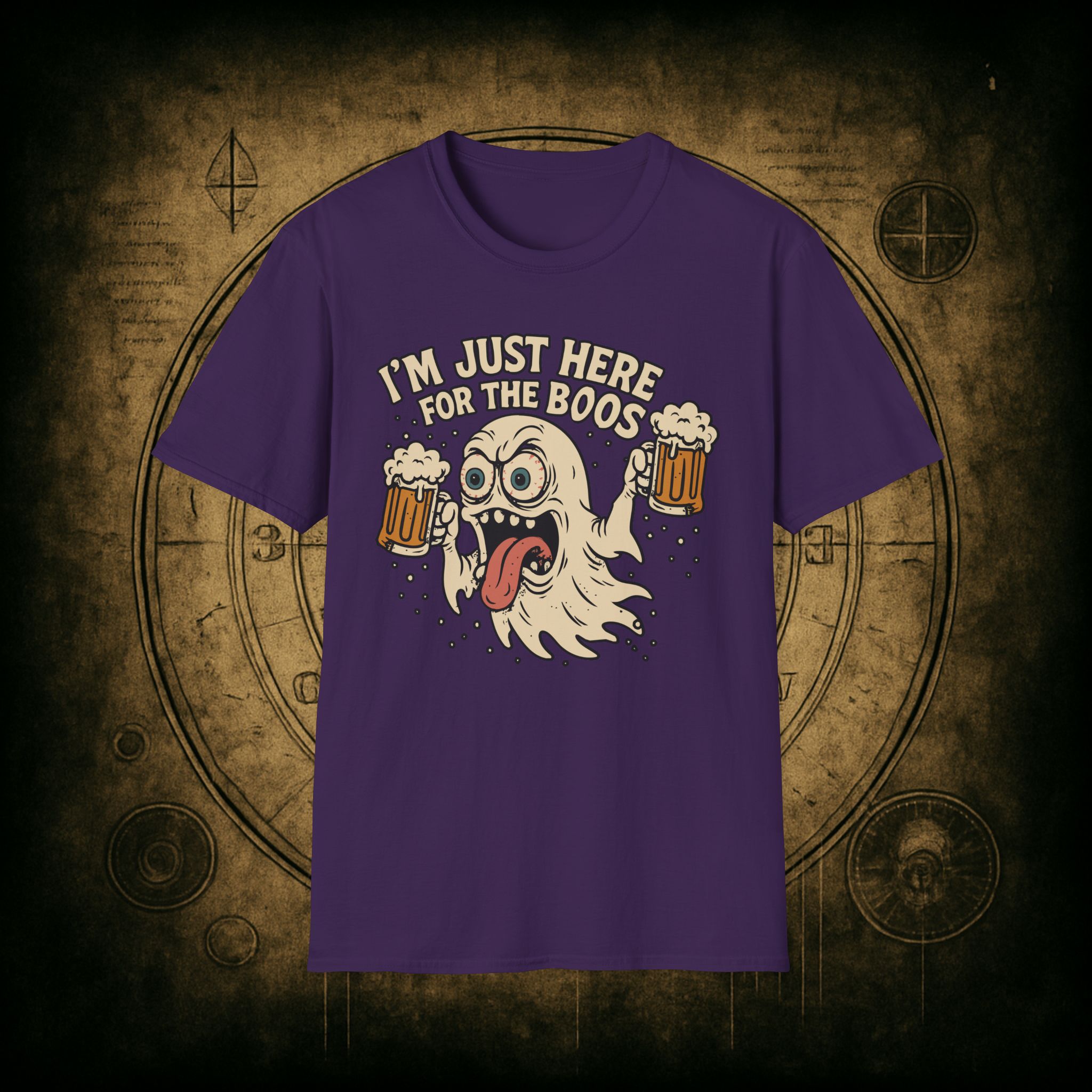 This T-Shirt is perfect for those who love a good pun, featuring a funny and snarky design with an alcoholic ghost saying ‘I’m just Here for the Boos’. It gives off a playful and lighthearted vibe, making it a great conversation starter. Ideal for ghosts who enjoy humor and relaxed style, this T-Shirt is perfect for Halloween, parties, or casual outings.
