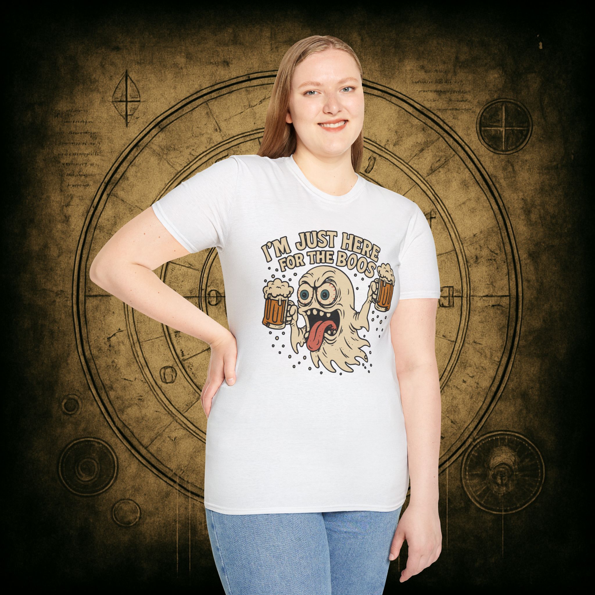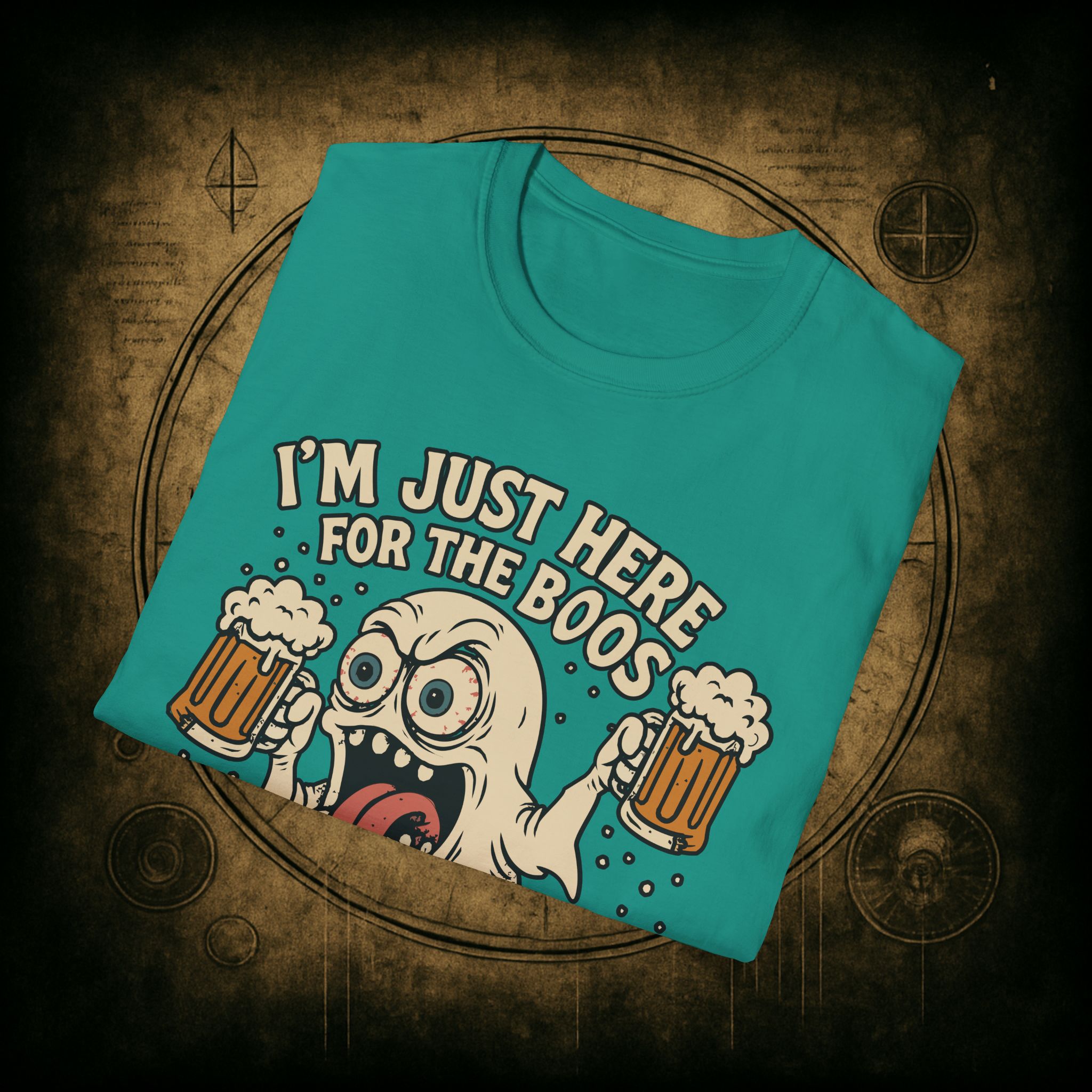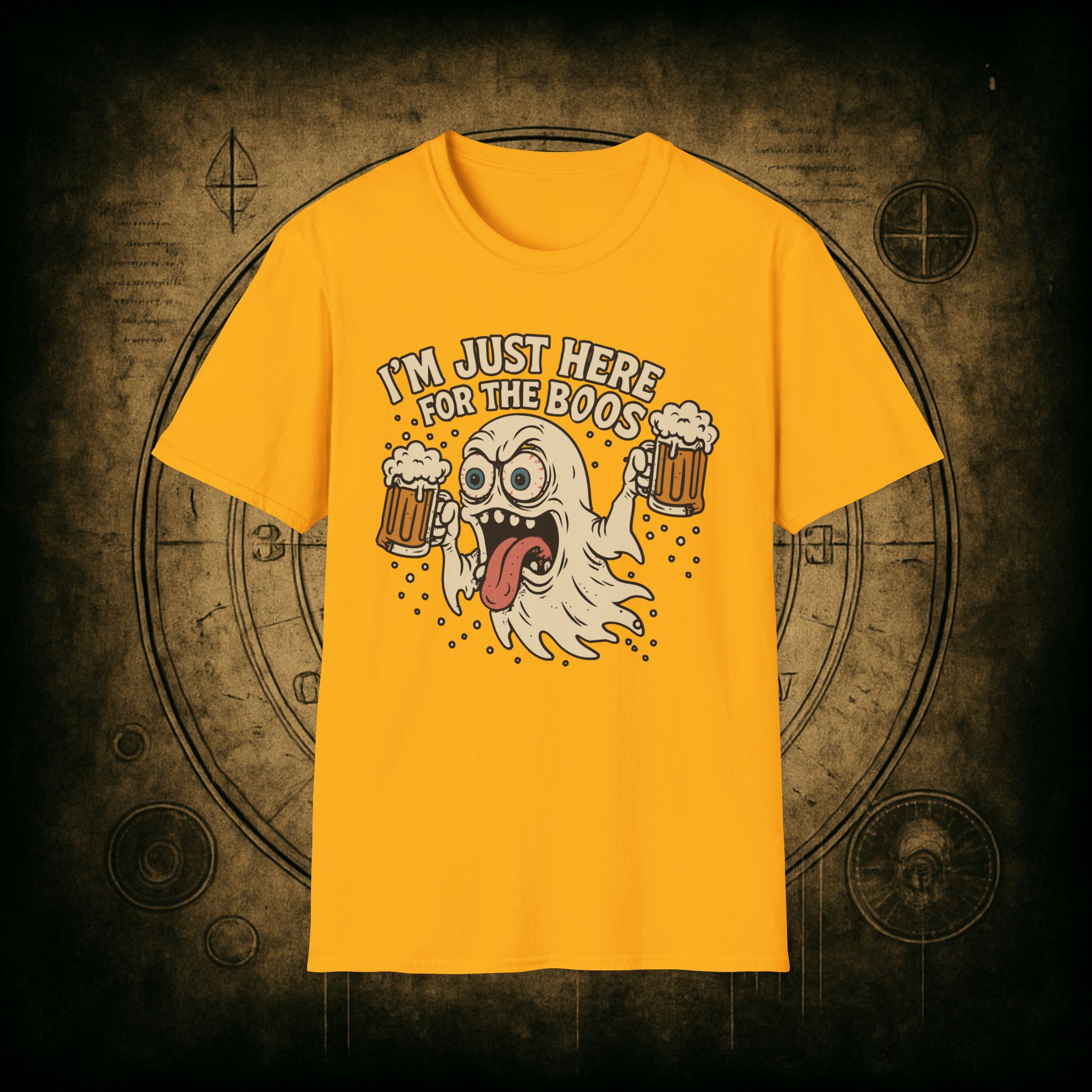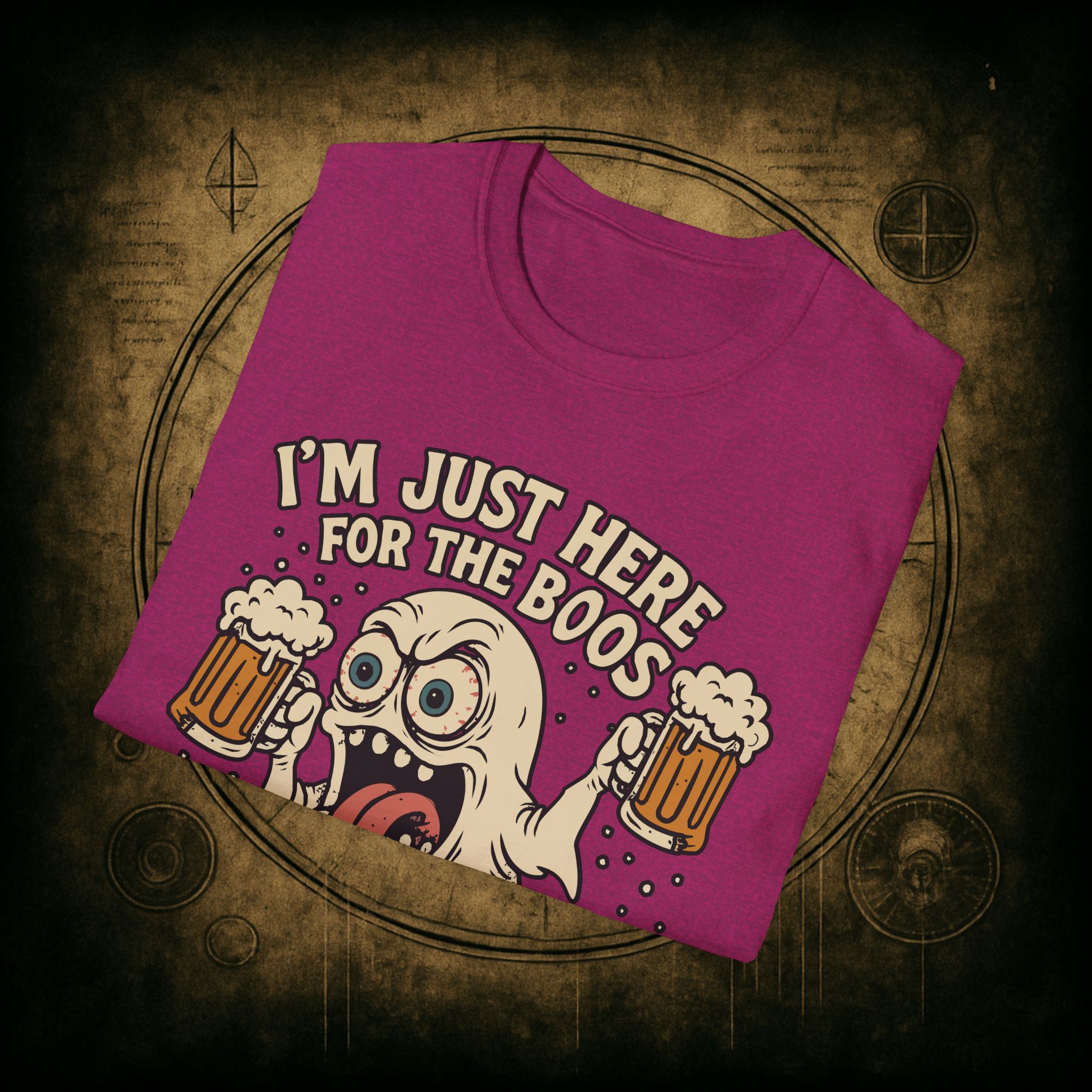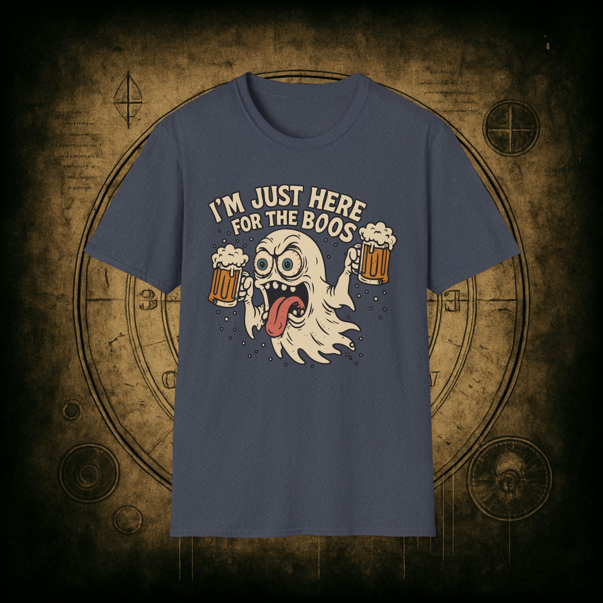 This T-Shirt is perfect for those who love a good pun, featuring a funny and snarky design with an alcoholic ghost saying ‘I’m just Here for the Boos’. It gives off a playful and lighthearted vibe, making it a great conversation starter. Ideal for ghosts who enjoy humor and relaxed style, this T-Shirt is perfect for Halloween, parties, or casual outings.