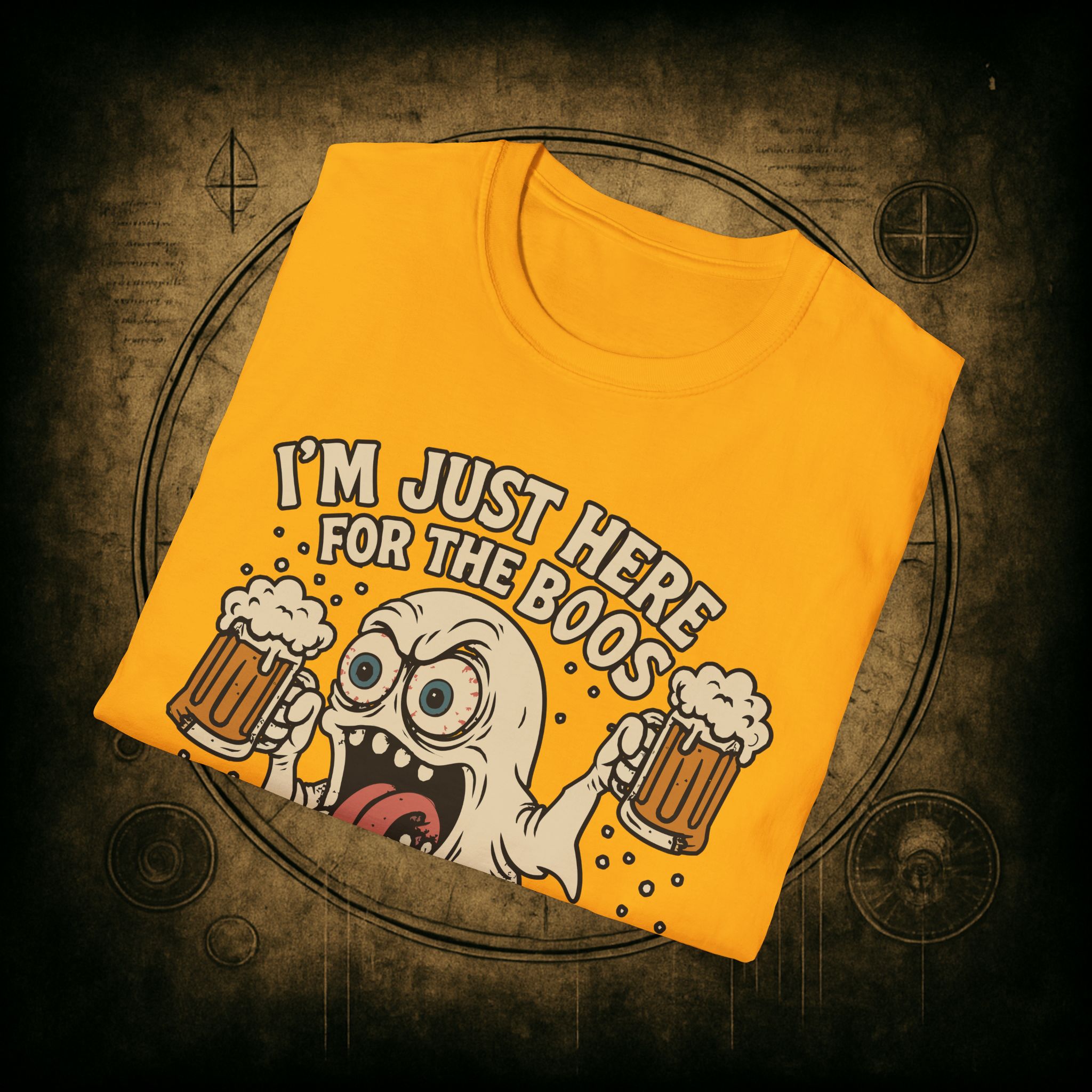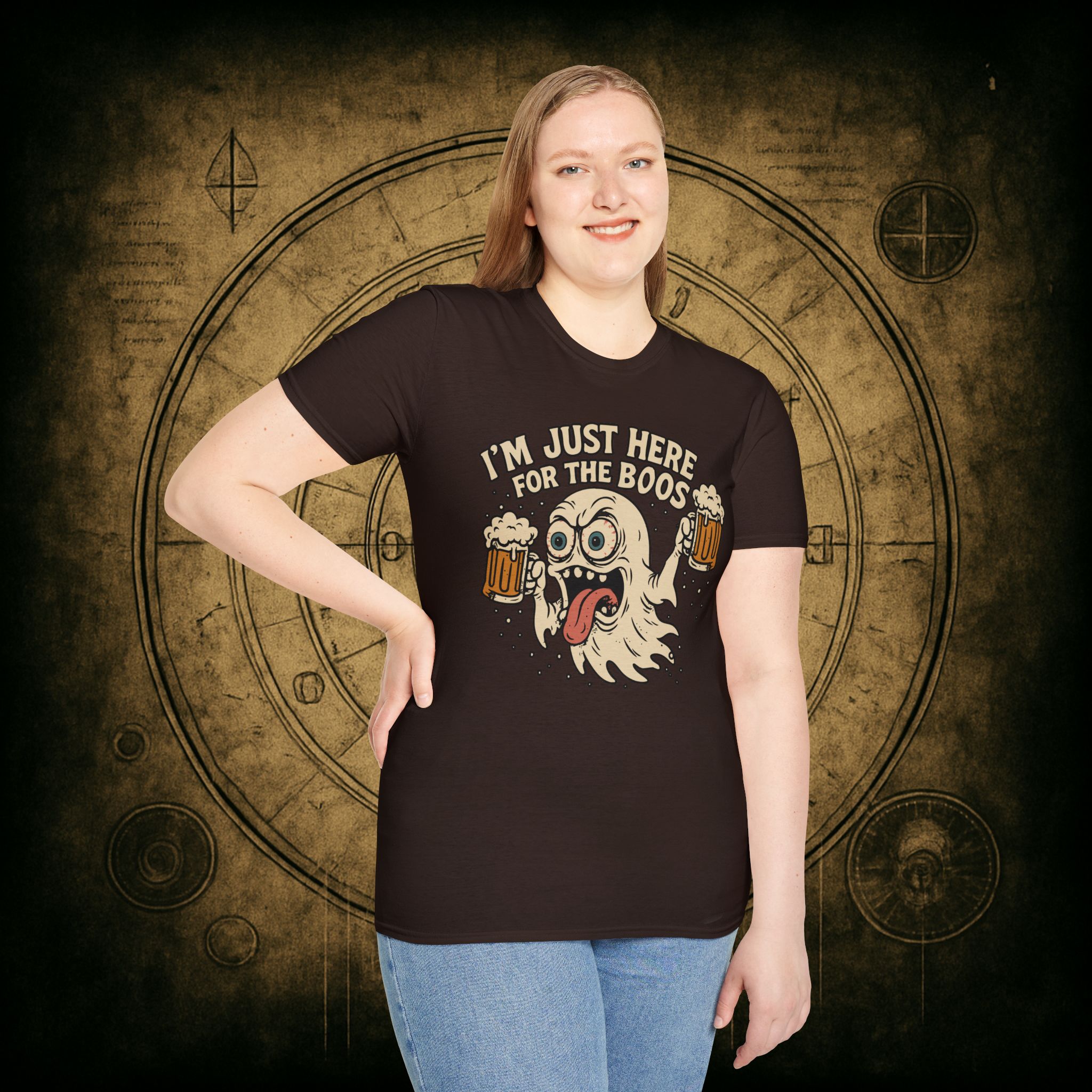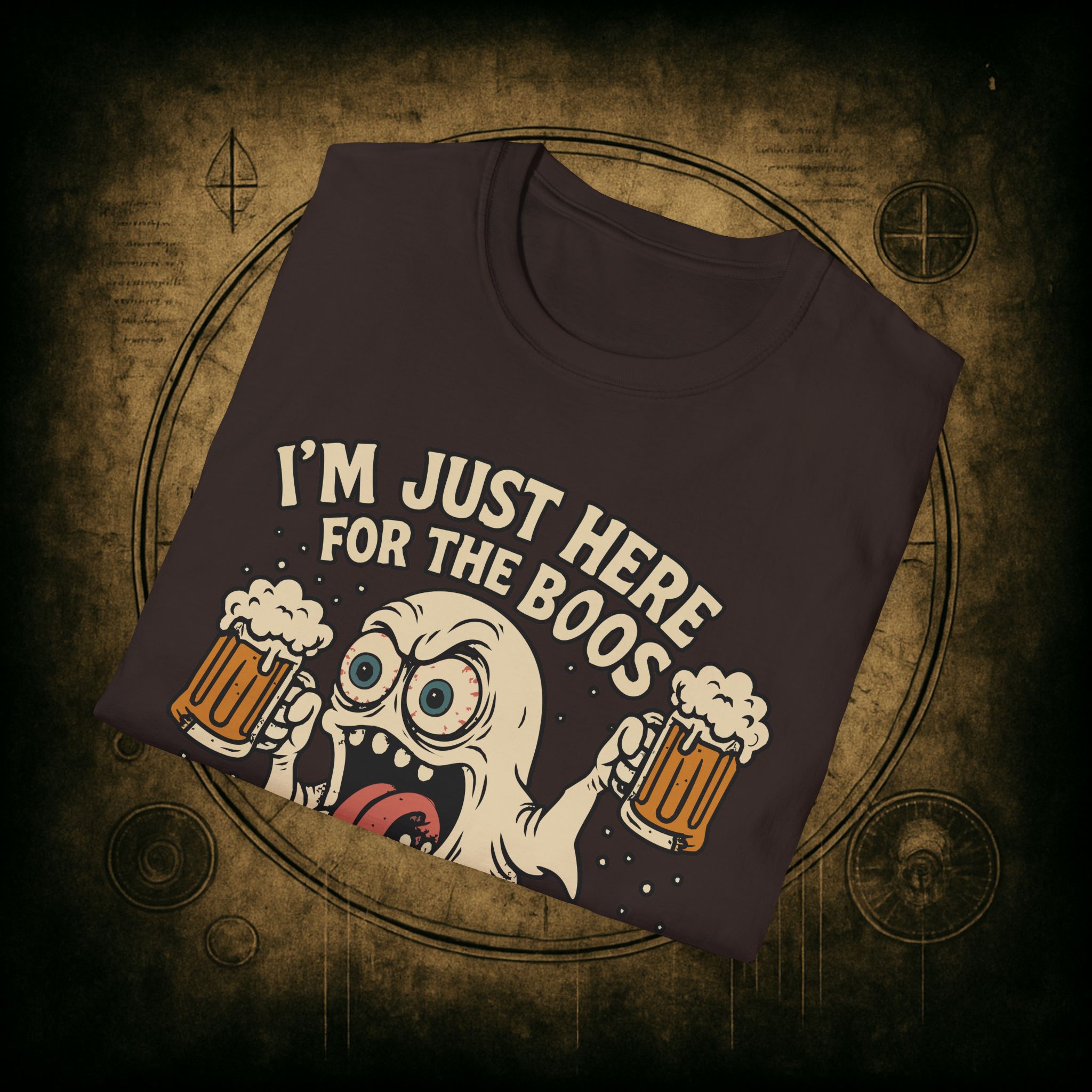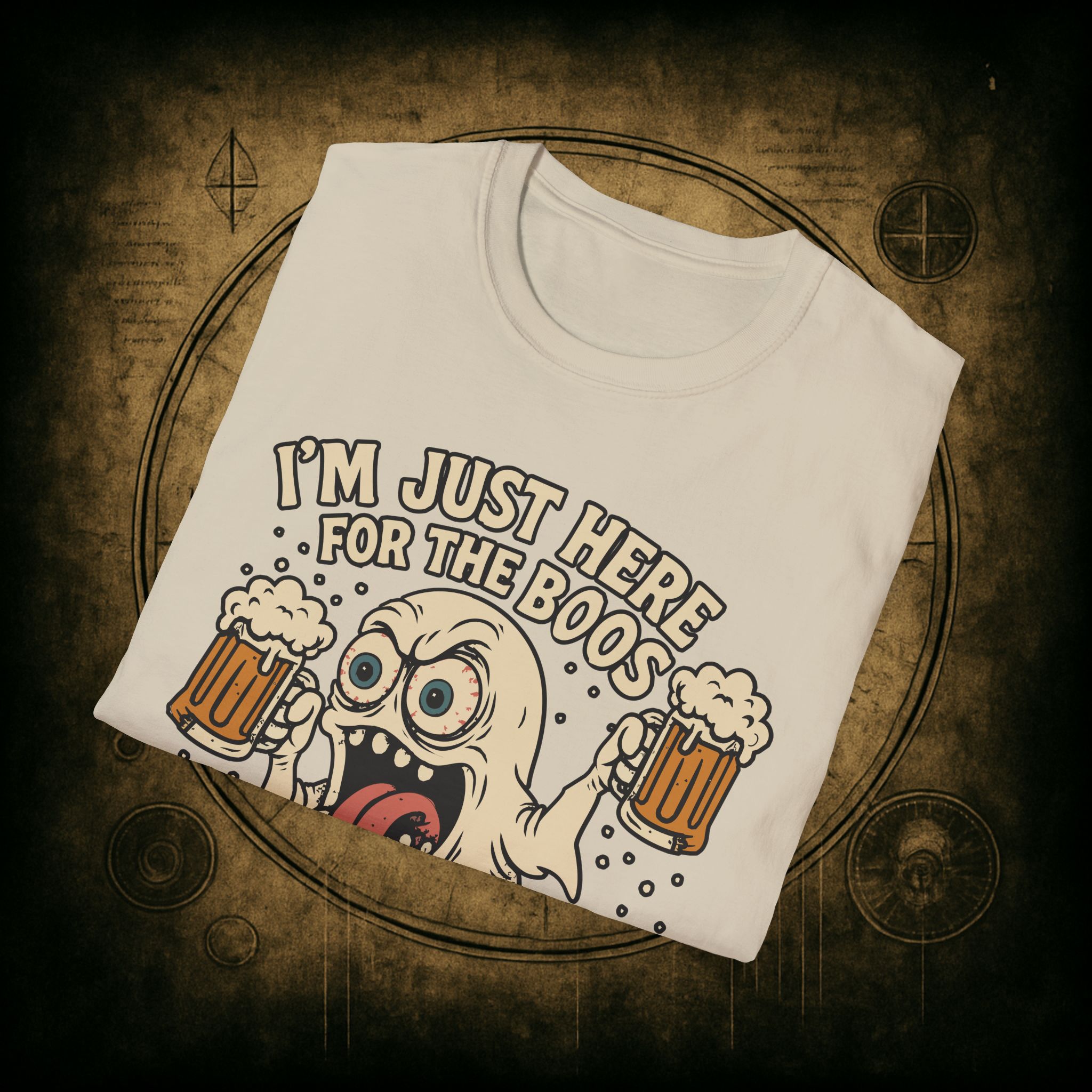 This T-Shirt is perfect for those who love a good pun, featuring a funny and snarky design with an alcoholic ghost saying ‘I’m just Here for the Boos’. It gives off a playful and lighthearted vibe, making it a great conversation starter. Ideal for ghosts who enjoy humor and relaxed style, this T-Shirt is perfect for Halloween, parties, or casual outings.